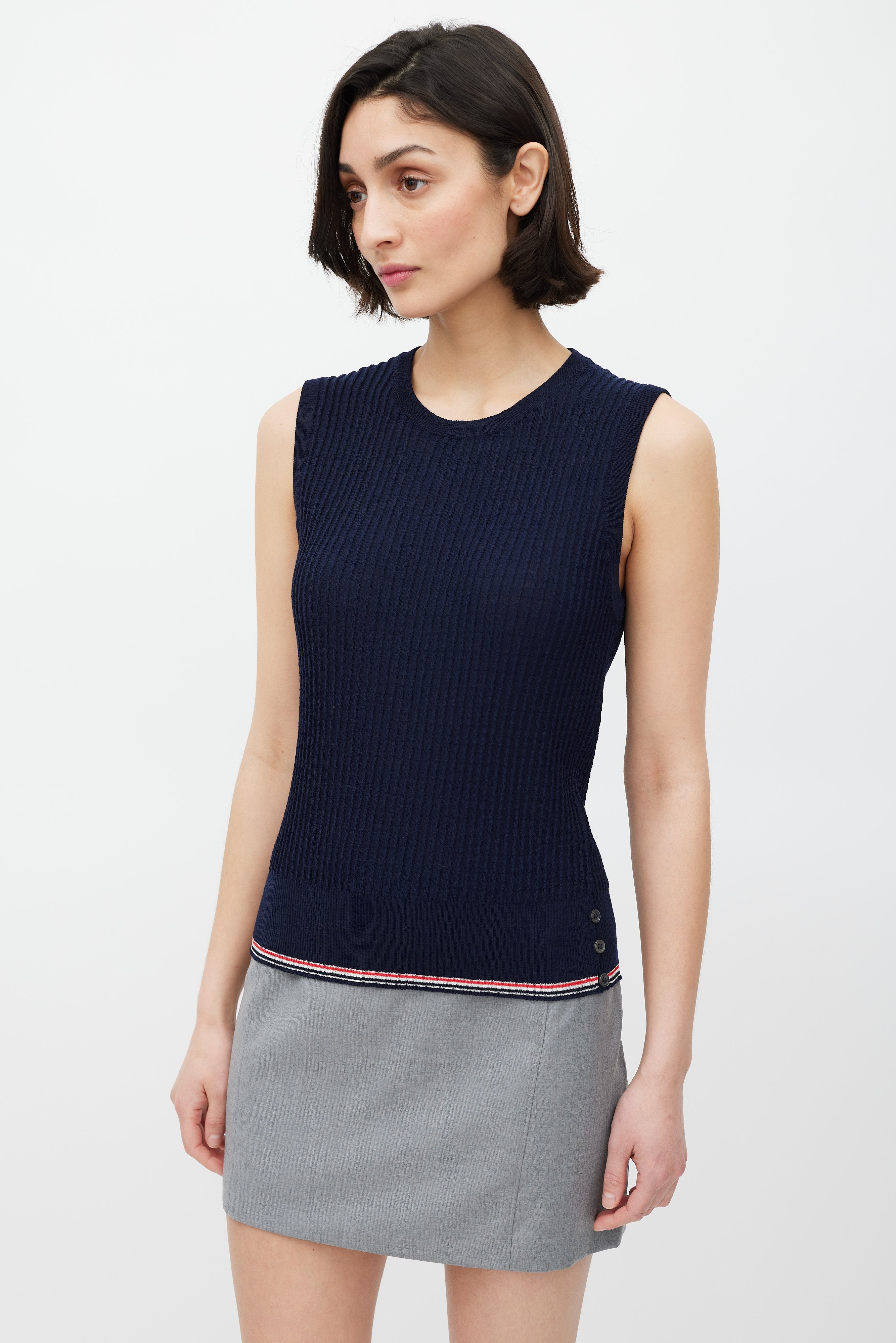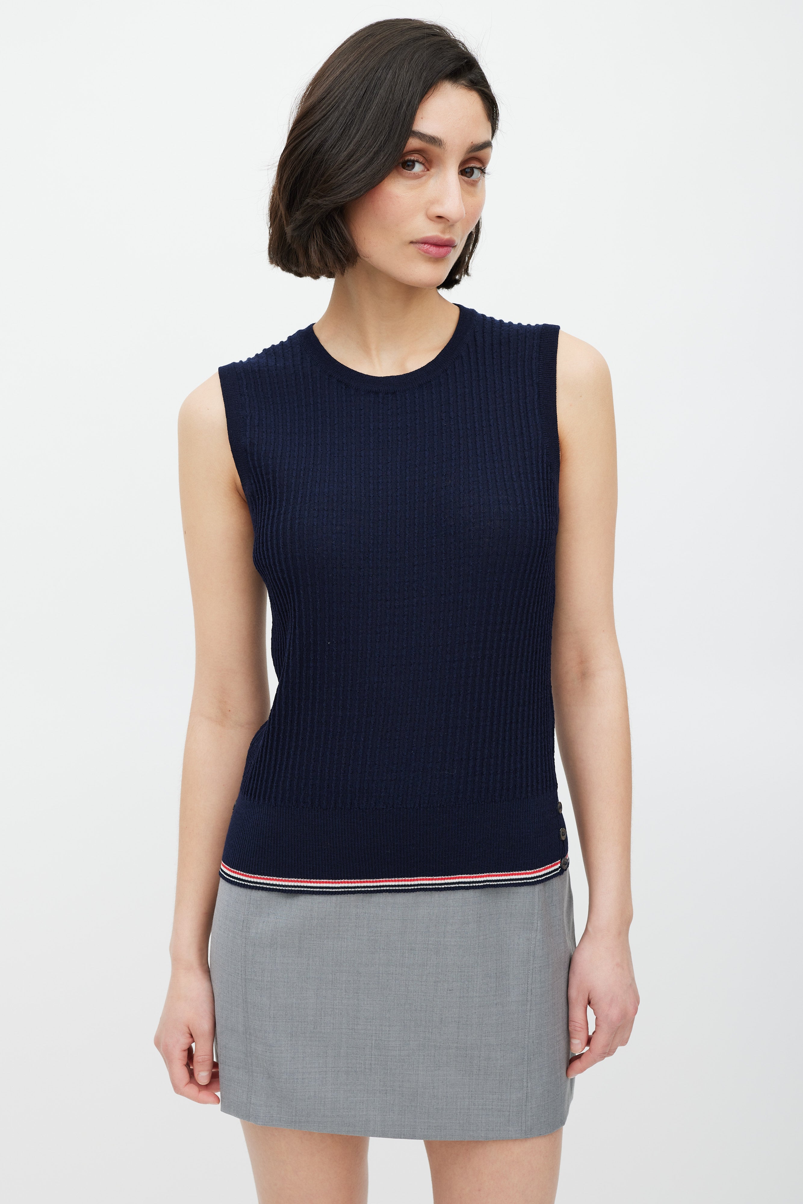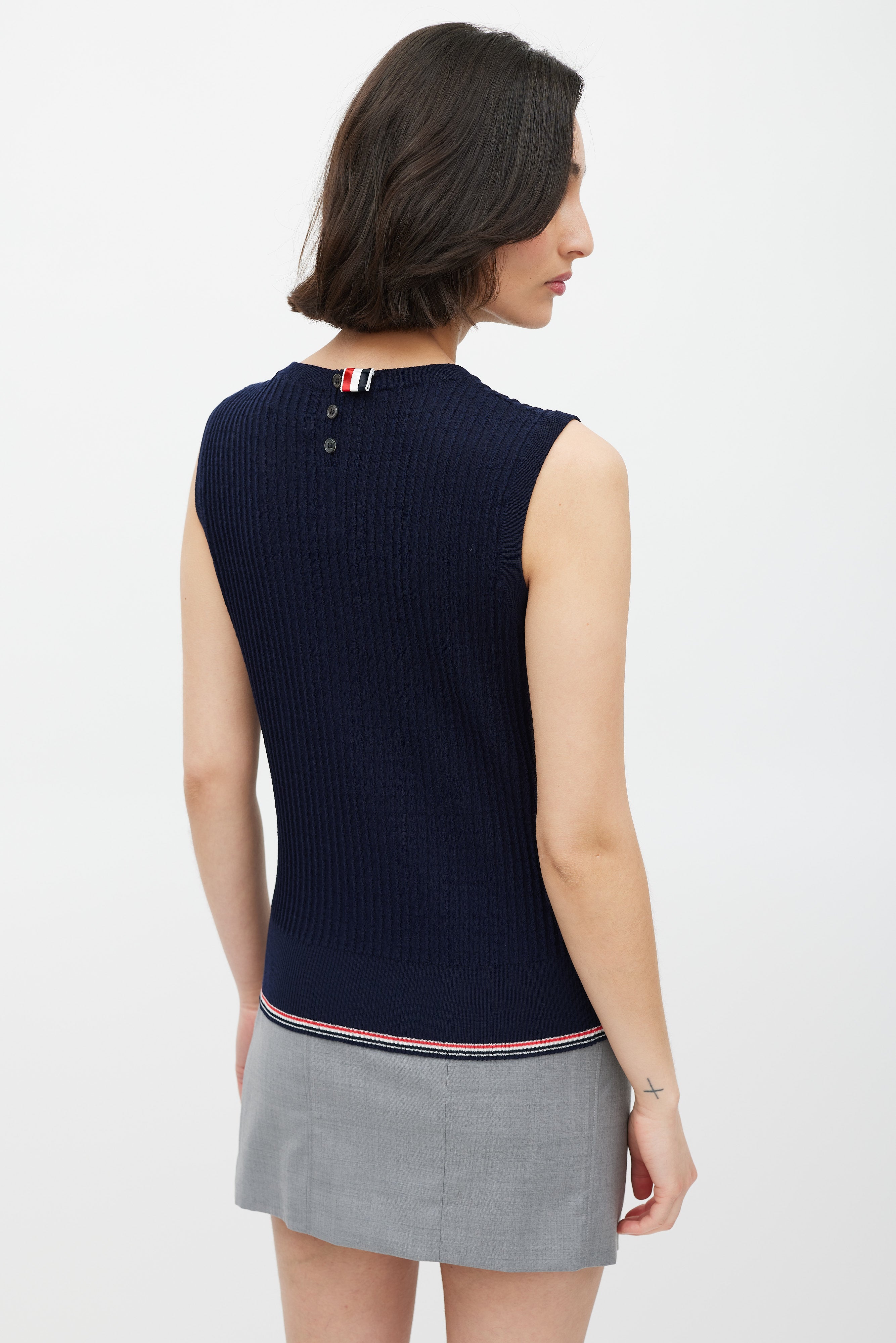 Pre-owned Thom Browne navy ribbed knit sweater vest featuring a rounded neckline, wide waistband with black, red, and white striped trim, button up detailing at side hem and back neck, and signature striped ribbon tab at back neck.