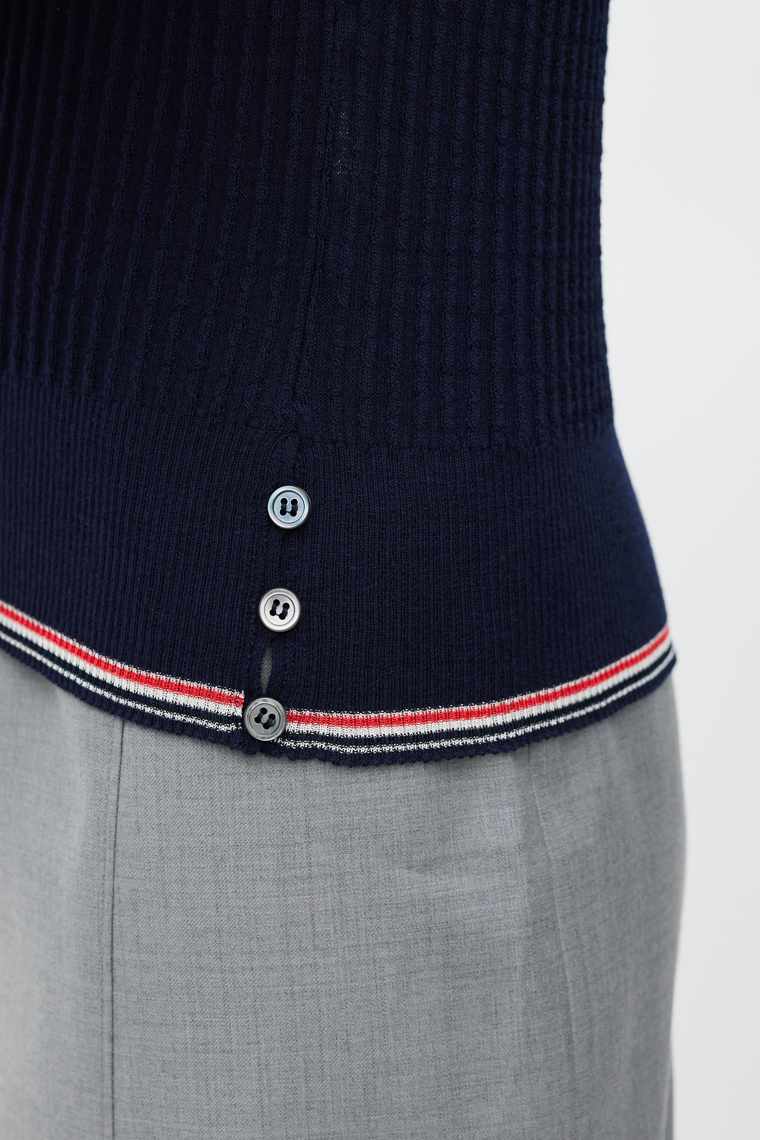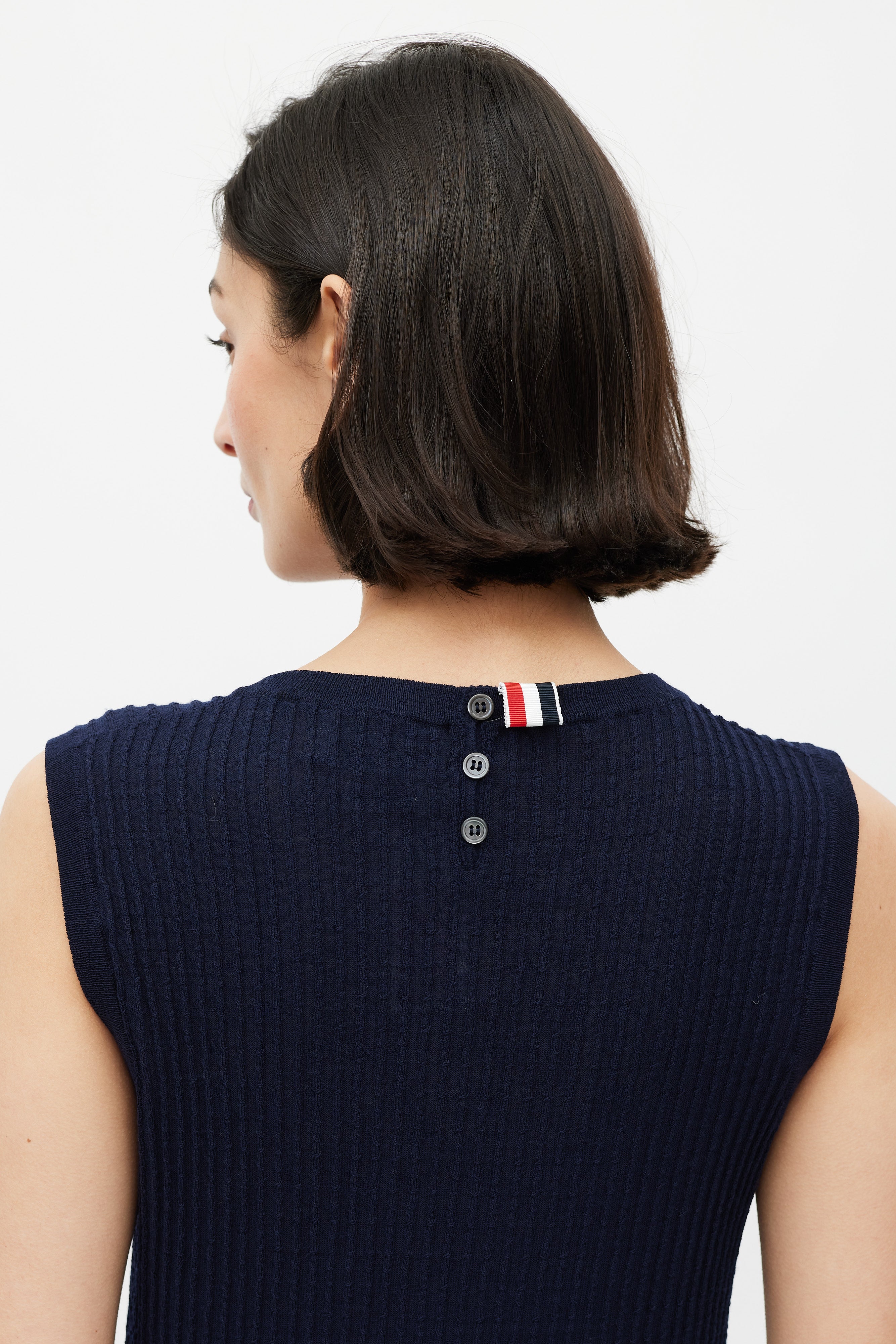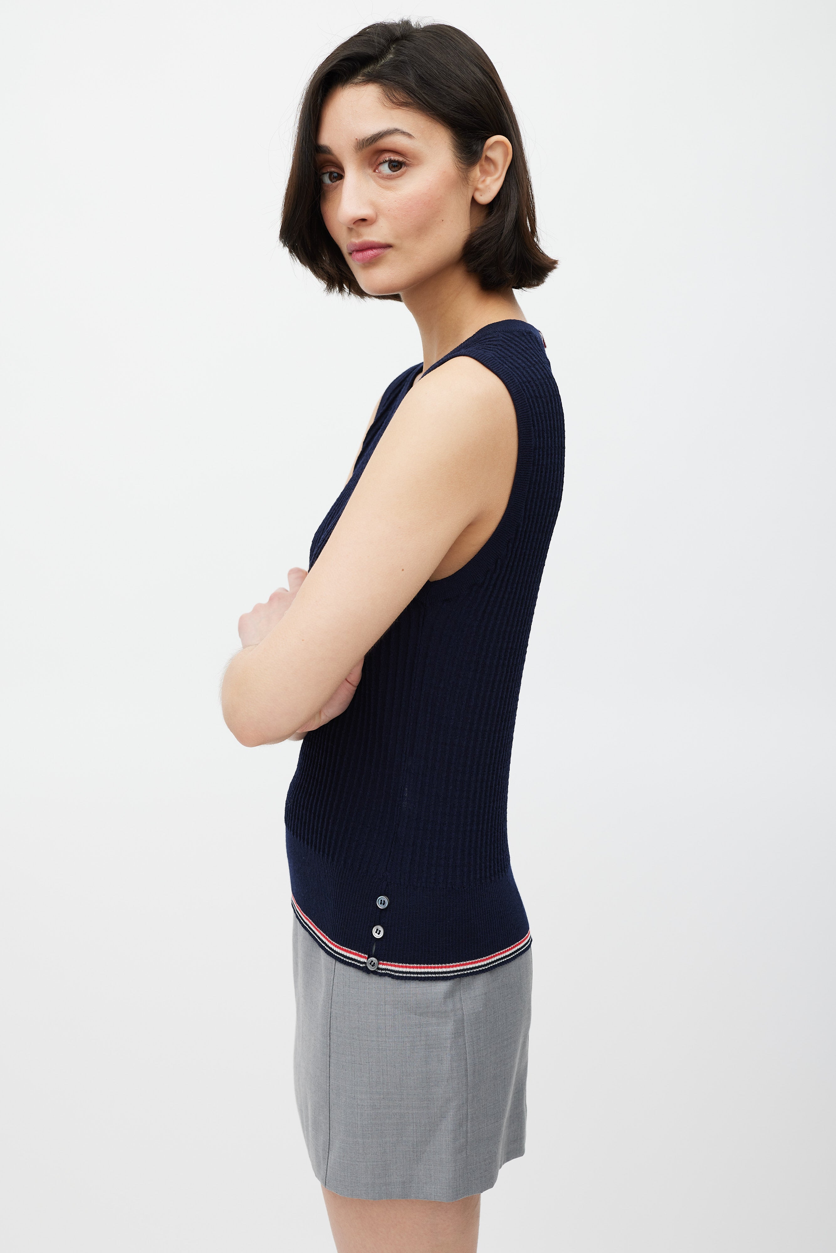 Pre-owned Thom Browne navy ribbed knit sweater vest featuring a rounded neckline, wide waistband with black, red, and white striped trim, button up detailing at side hem and back neck, and signature striped ribbon tab at back neck.