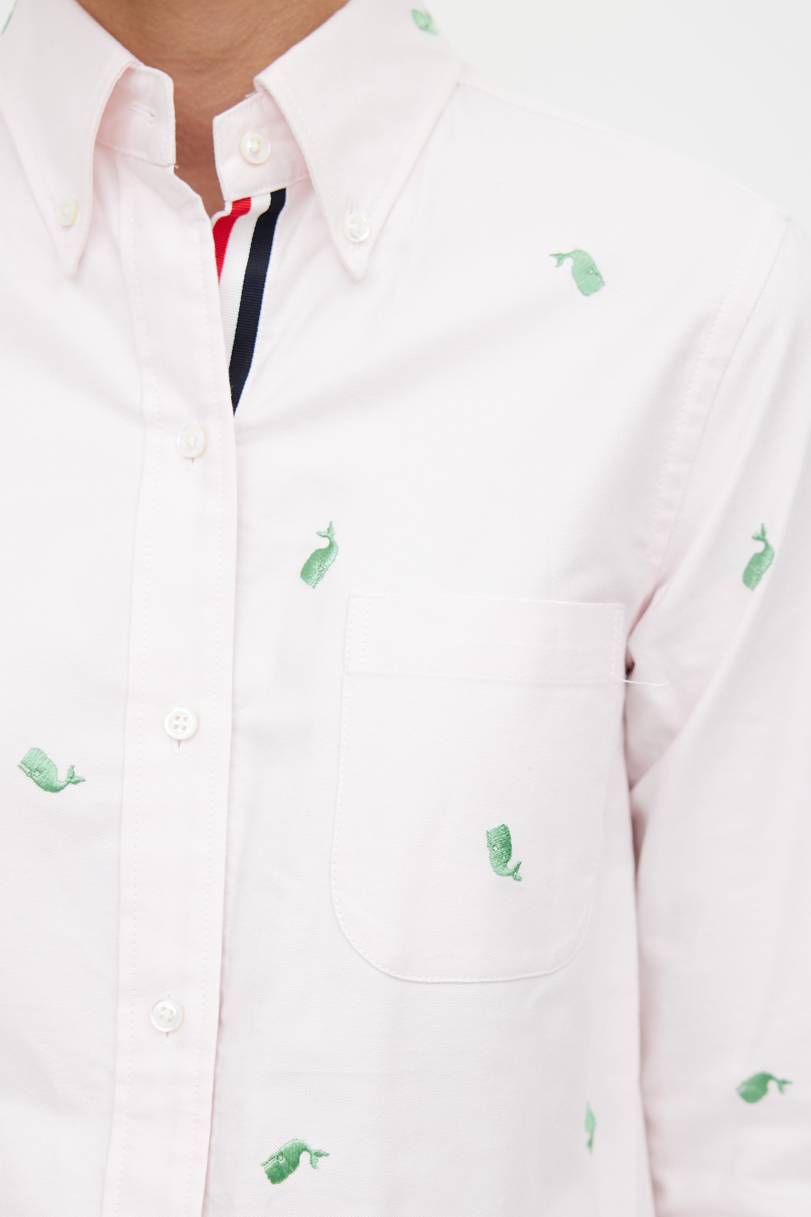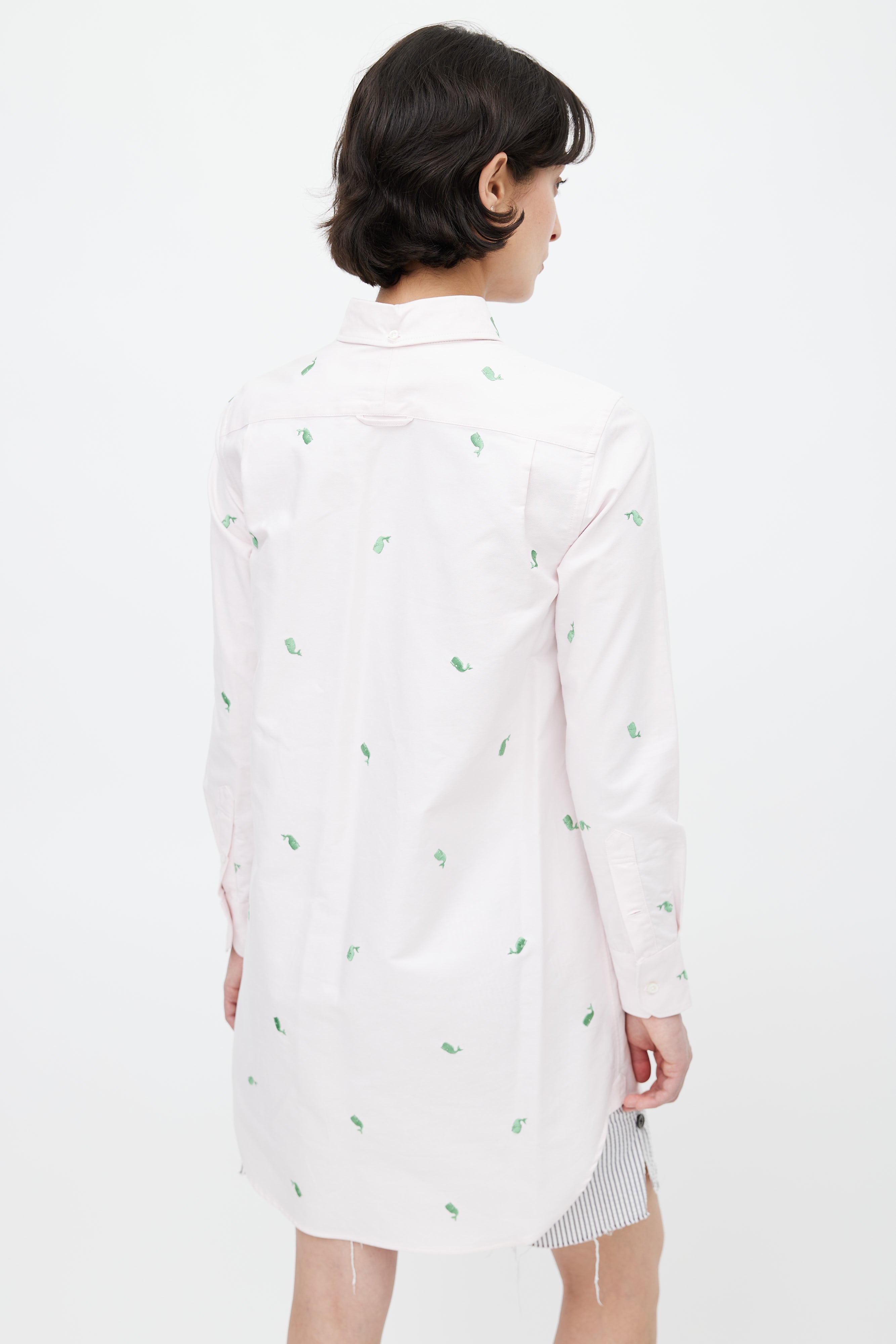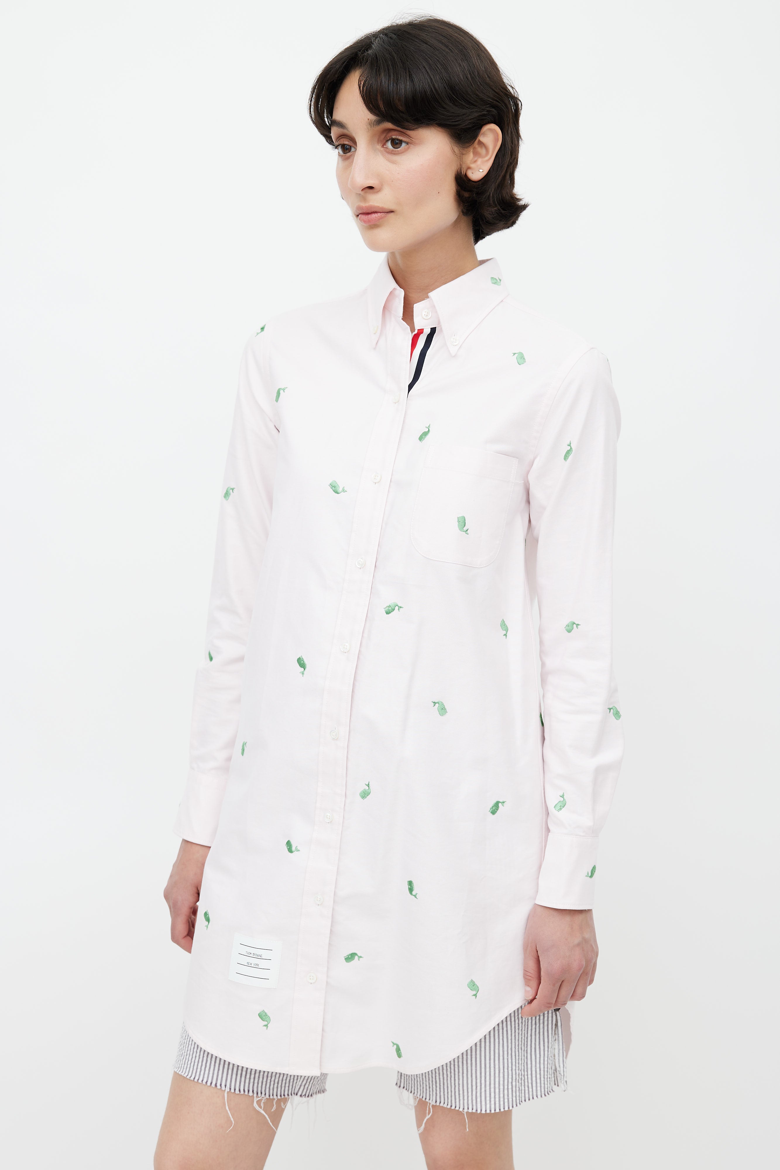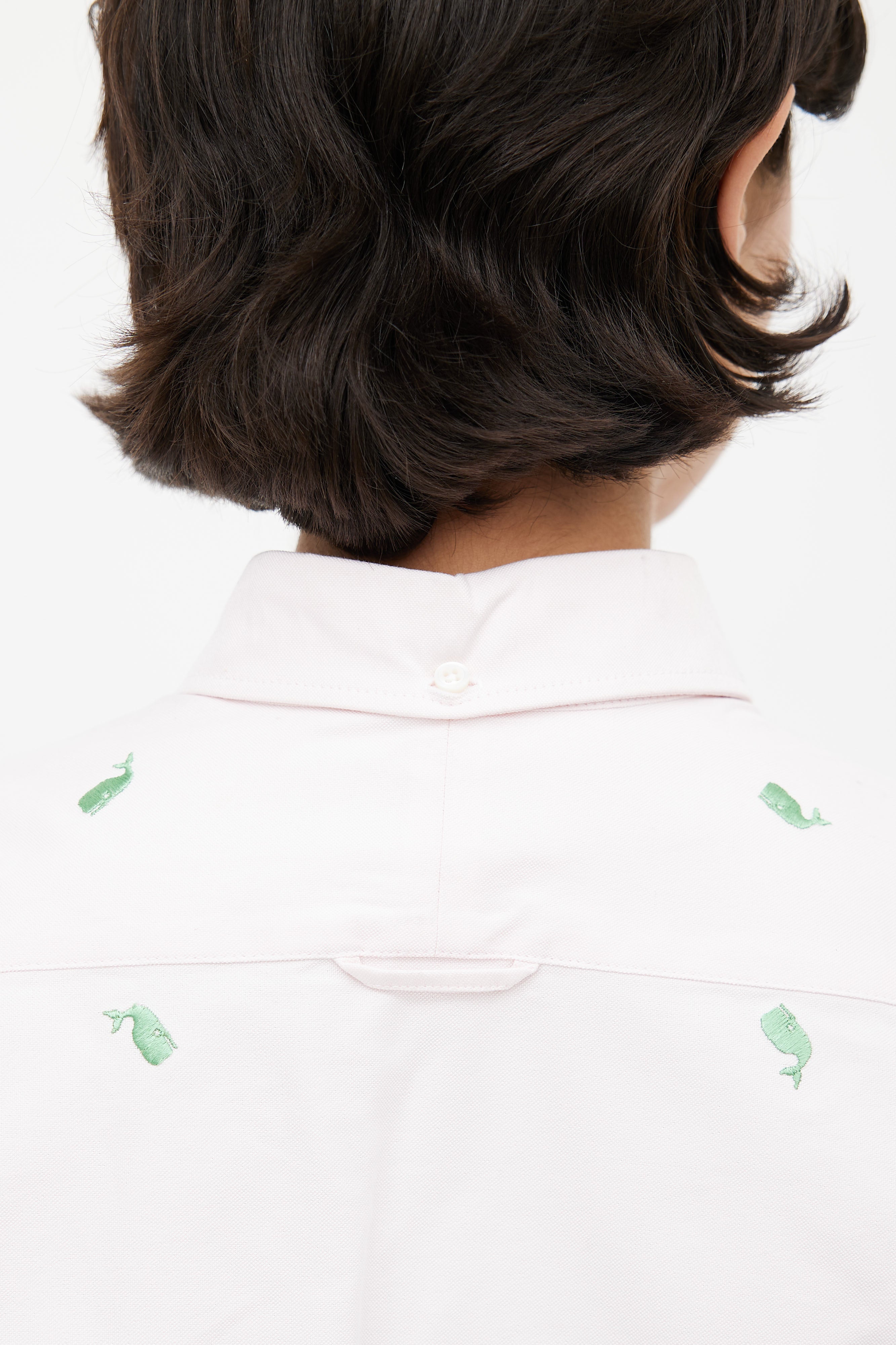 Pre-owned Thom Browne pink shirt featuring green whale embroidery, button up front, patch pocket at chest, signature grosgrain at button placket, classic collar, buttoned cuffs, and white label tag at hem.