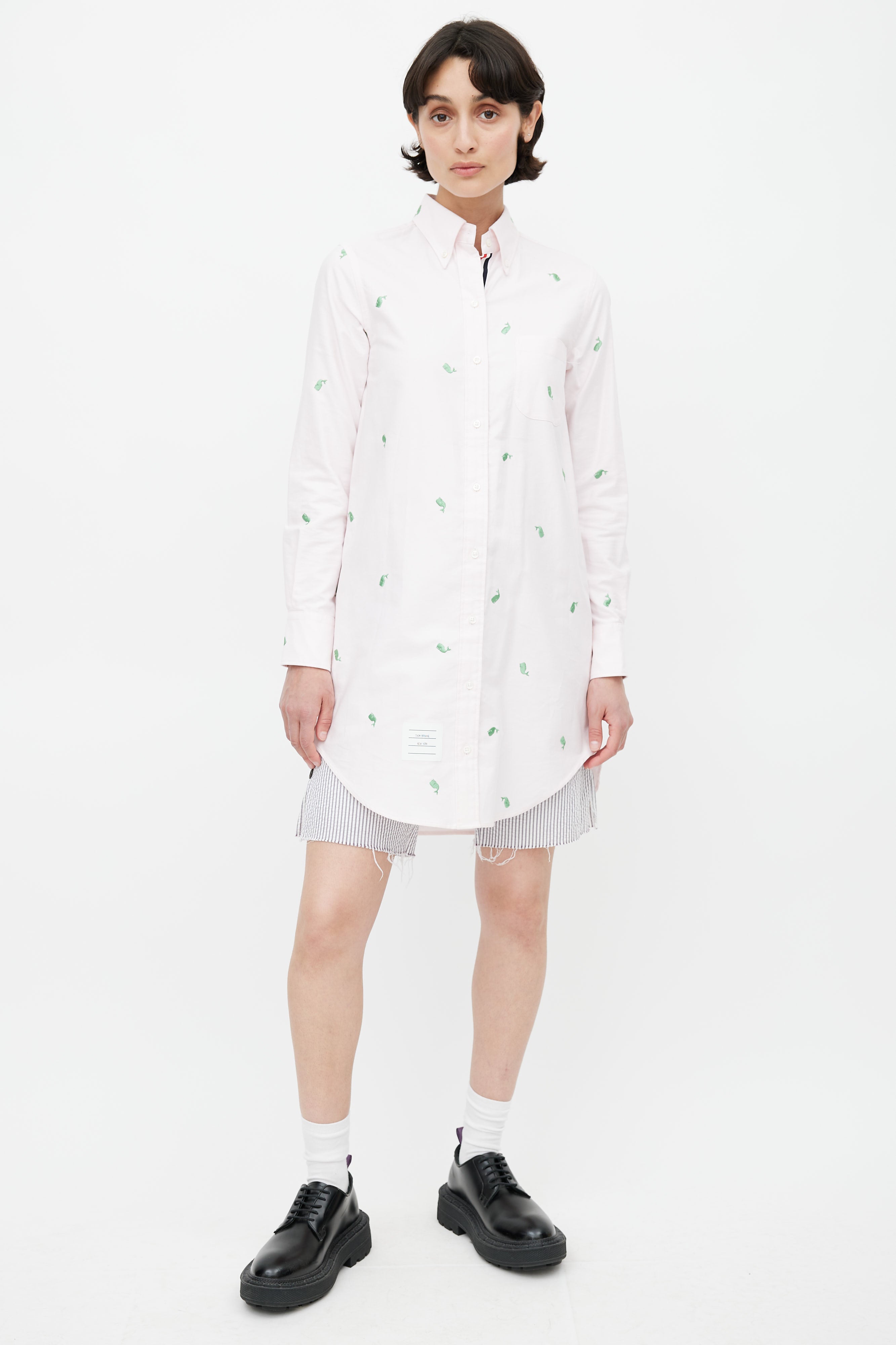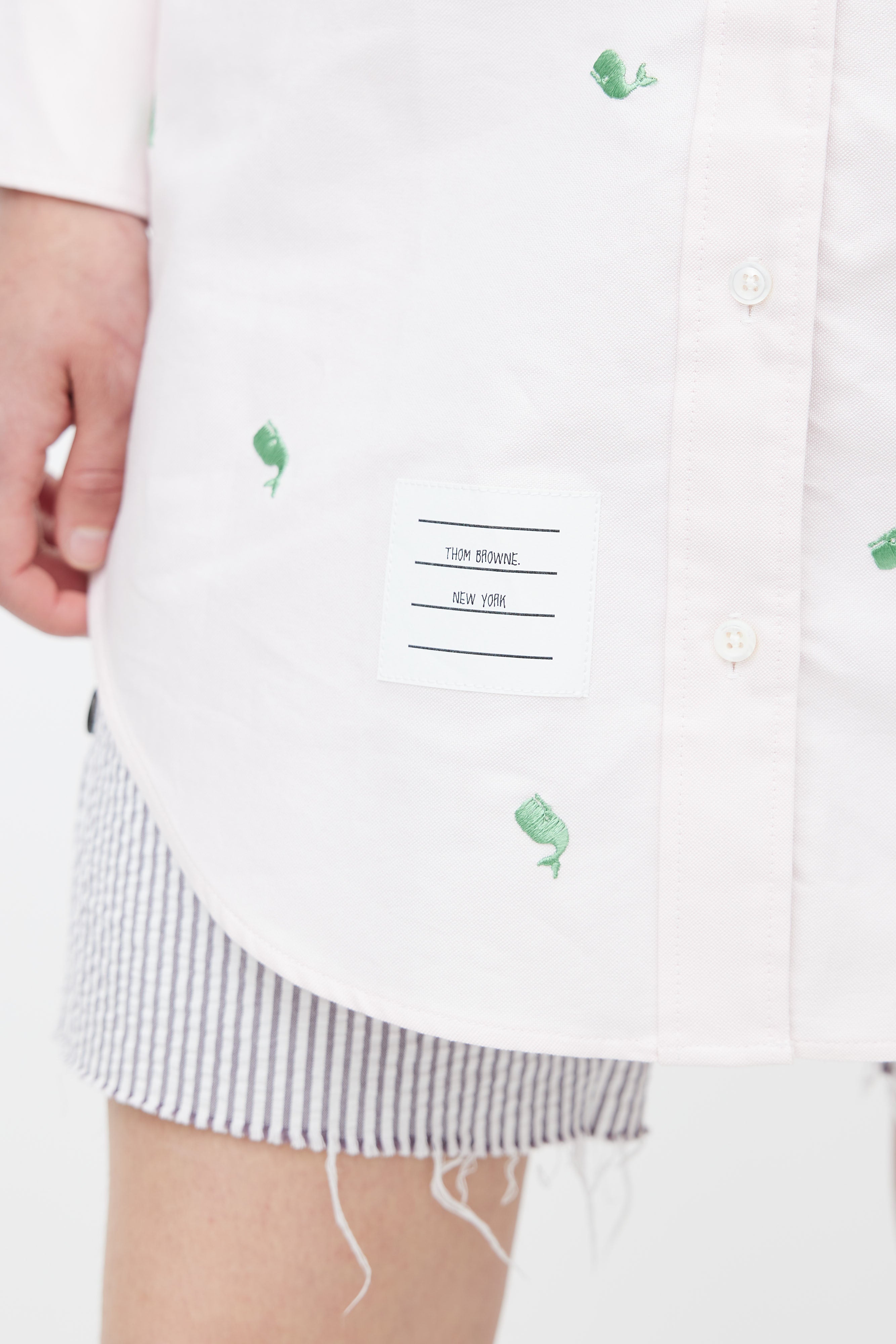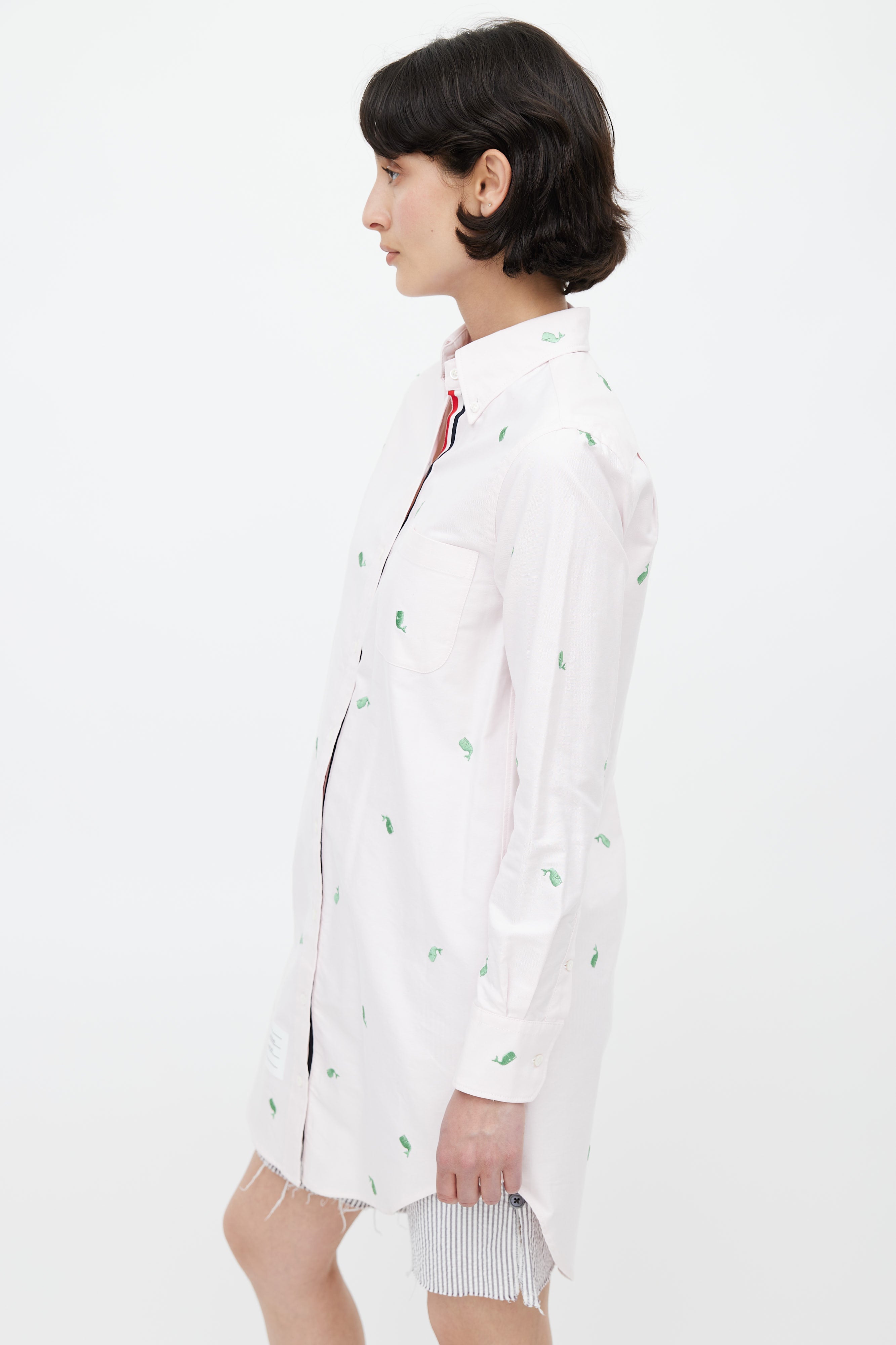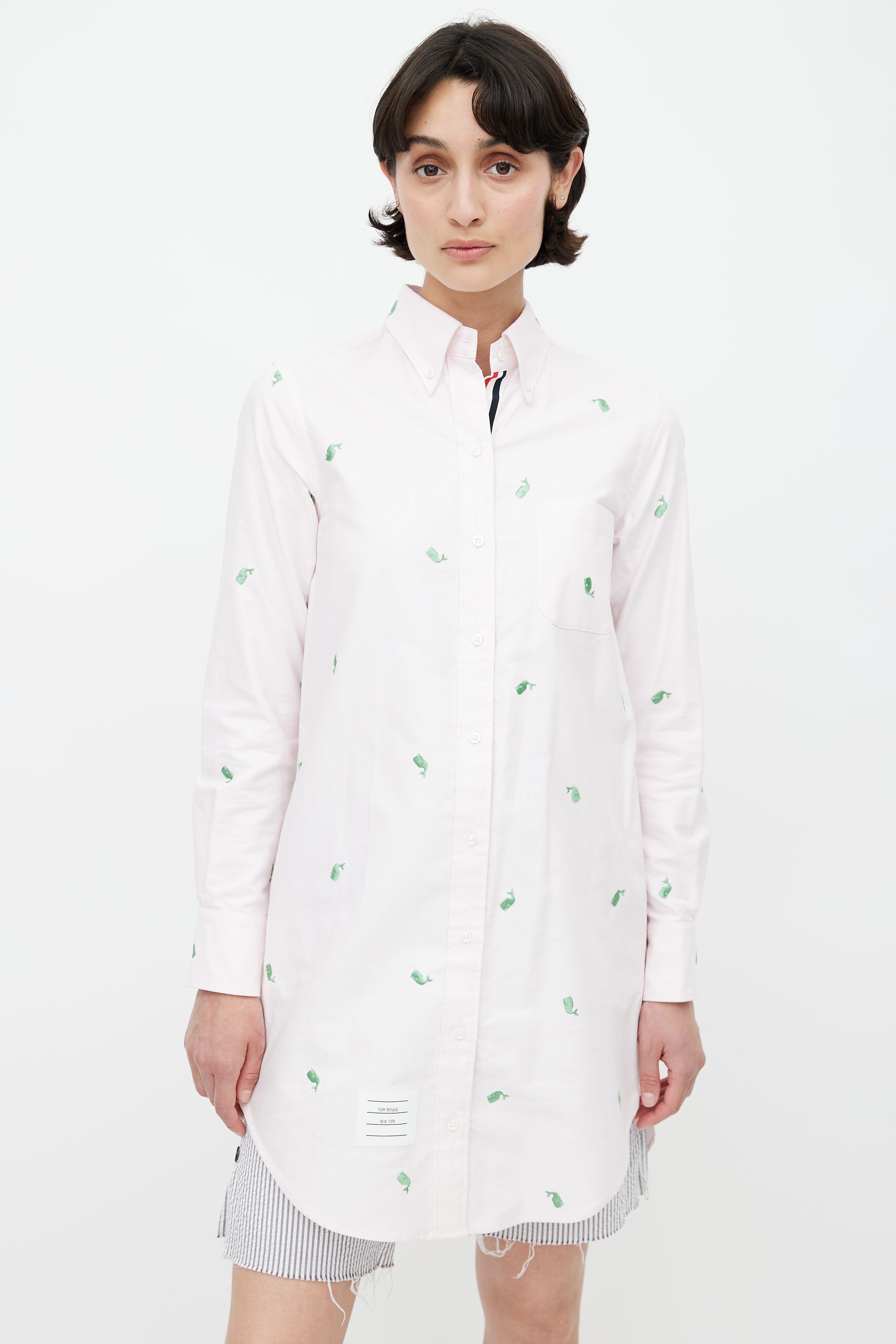 Pre-owned Thom Browne pink shirt featuring green whale embroidery, button up front, patch pocket at chest, signature grosgrain at button placket, classic collar, buttoned cuffs, and white label tag at hem.
