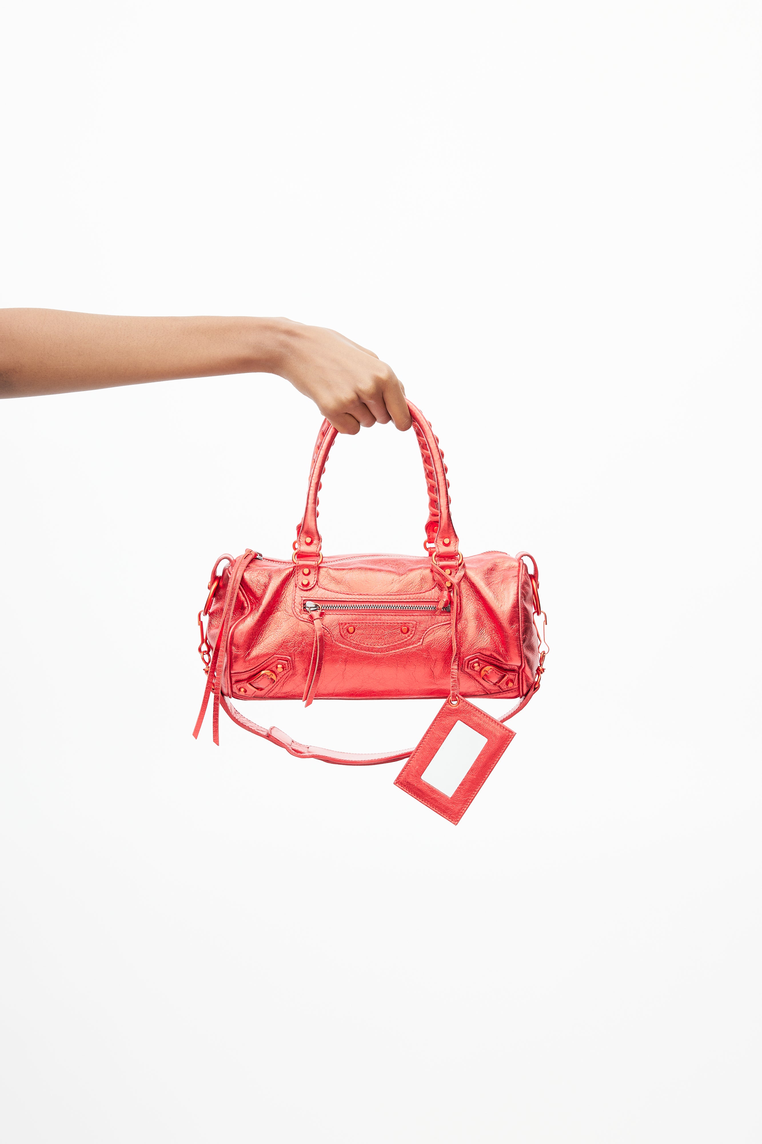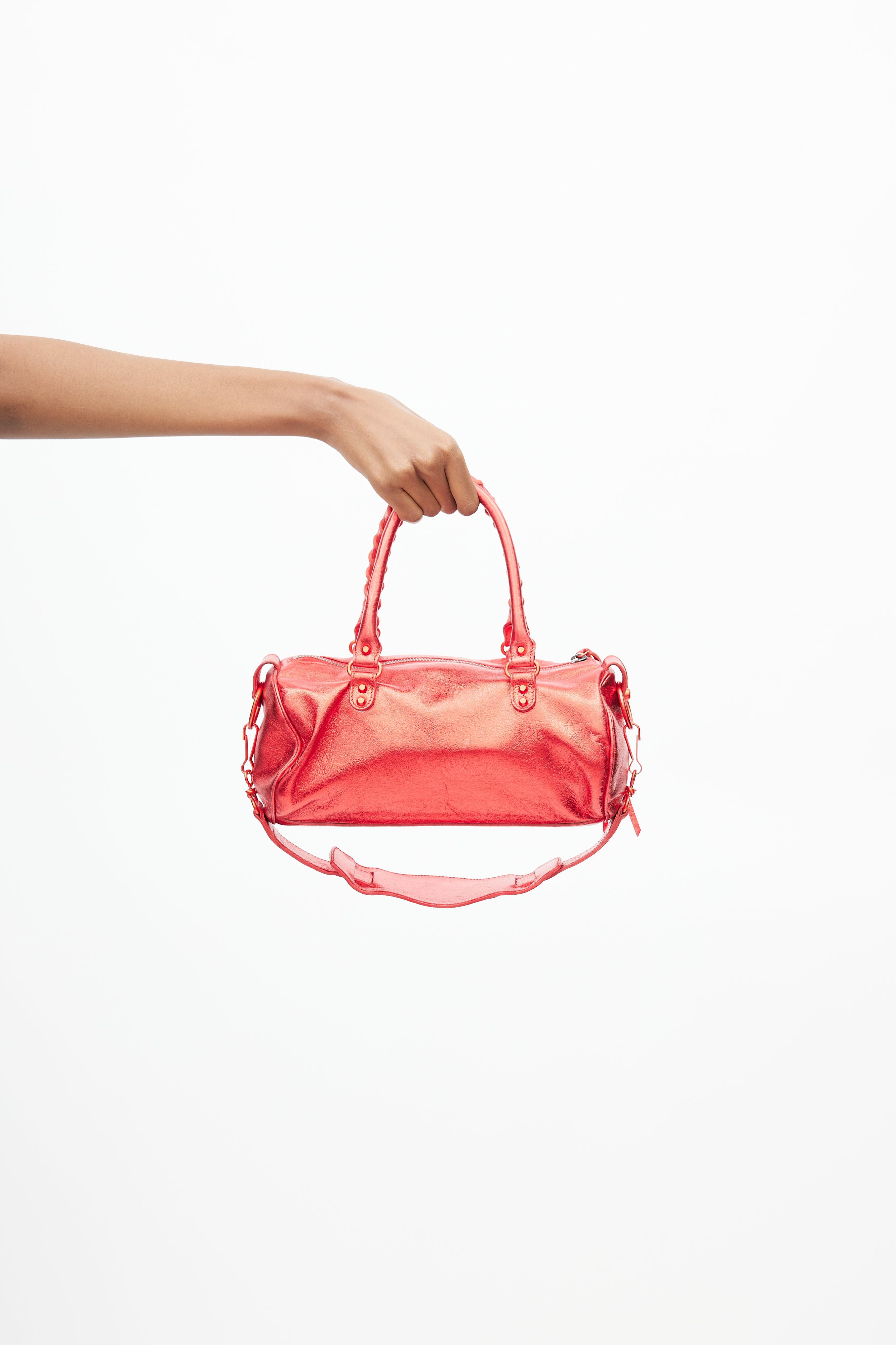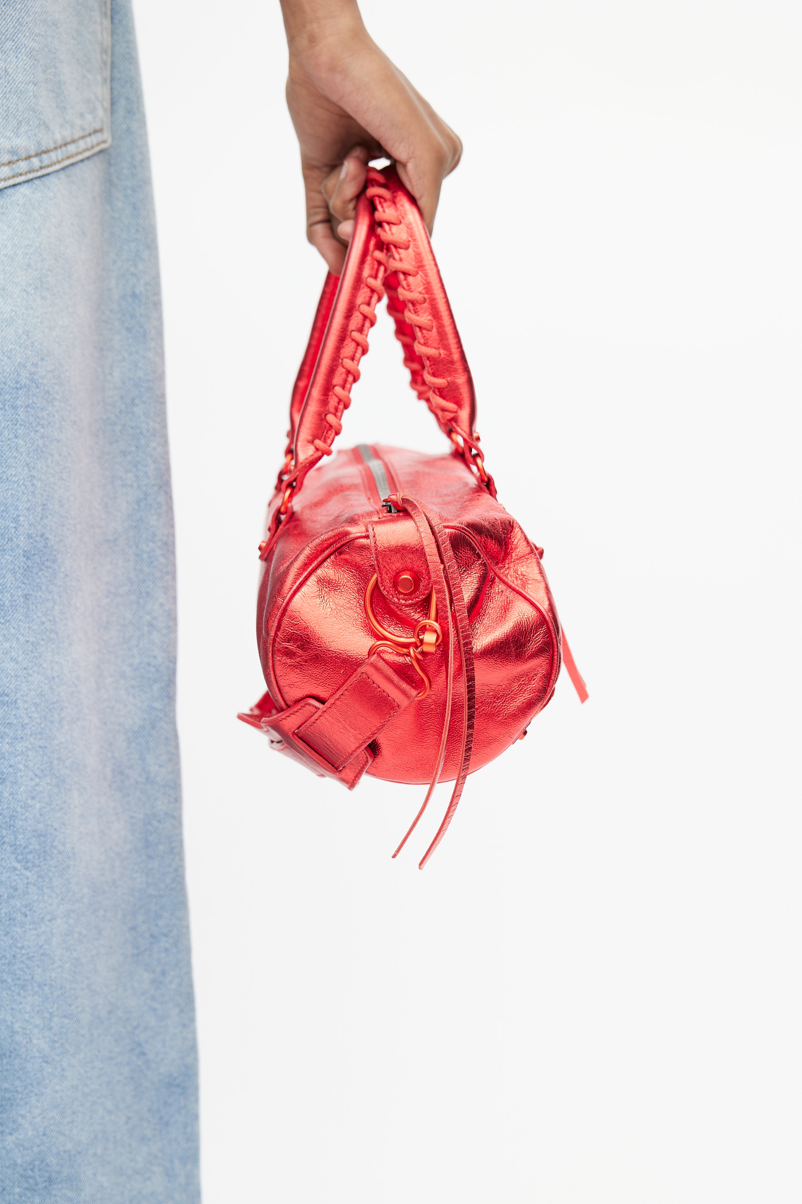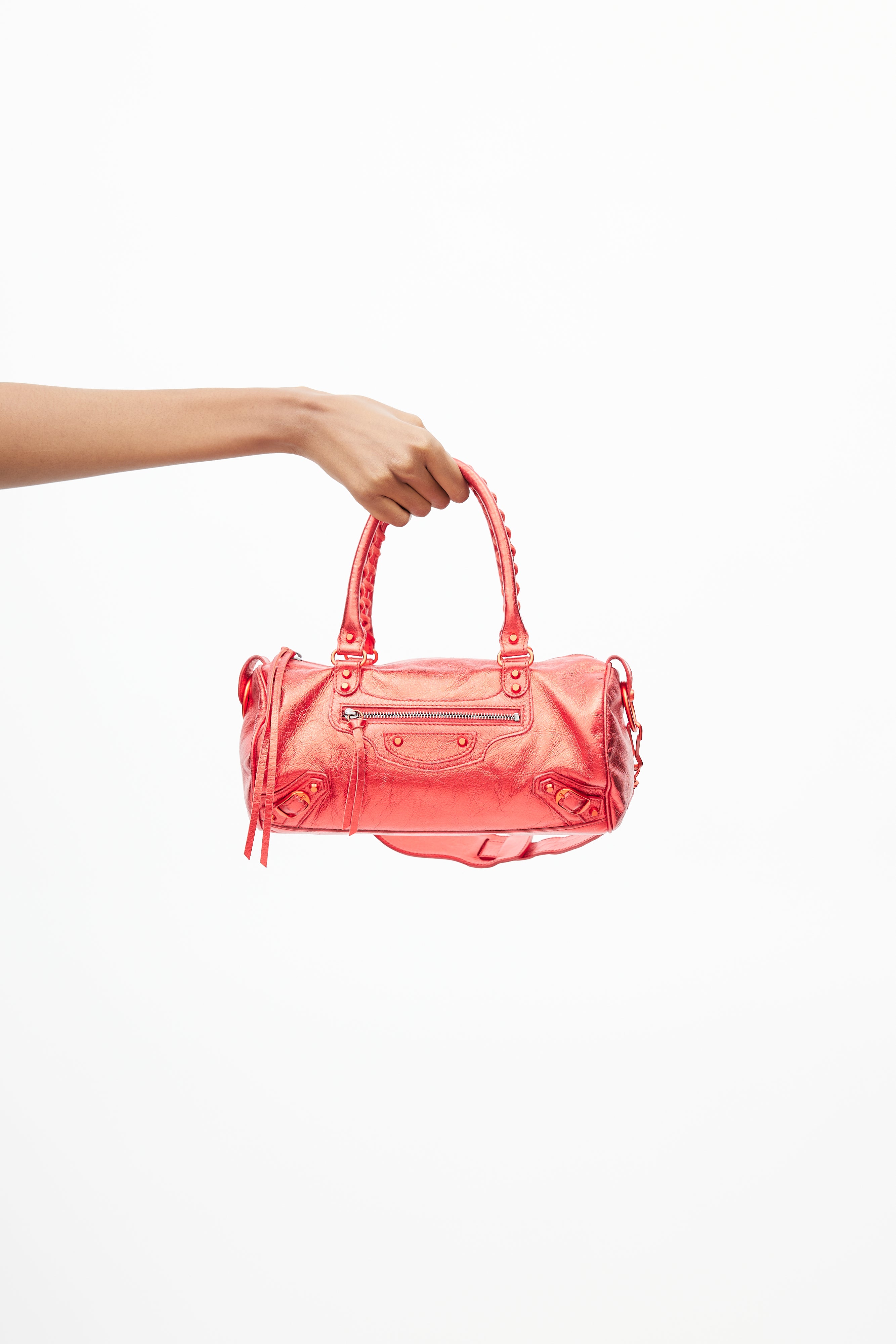 Pre-owned Balenciaga red Twiggy shoulder bag featuring tonal signature City hardware, barrel shape, zip pocket at front, braided top handles, detachable pocket mirror, zip closure at top, detachable shoulder strap, lined main compartment, and zip pocket inside.