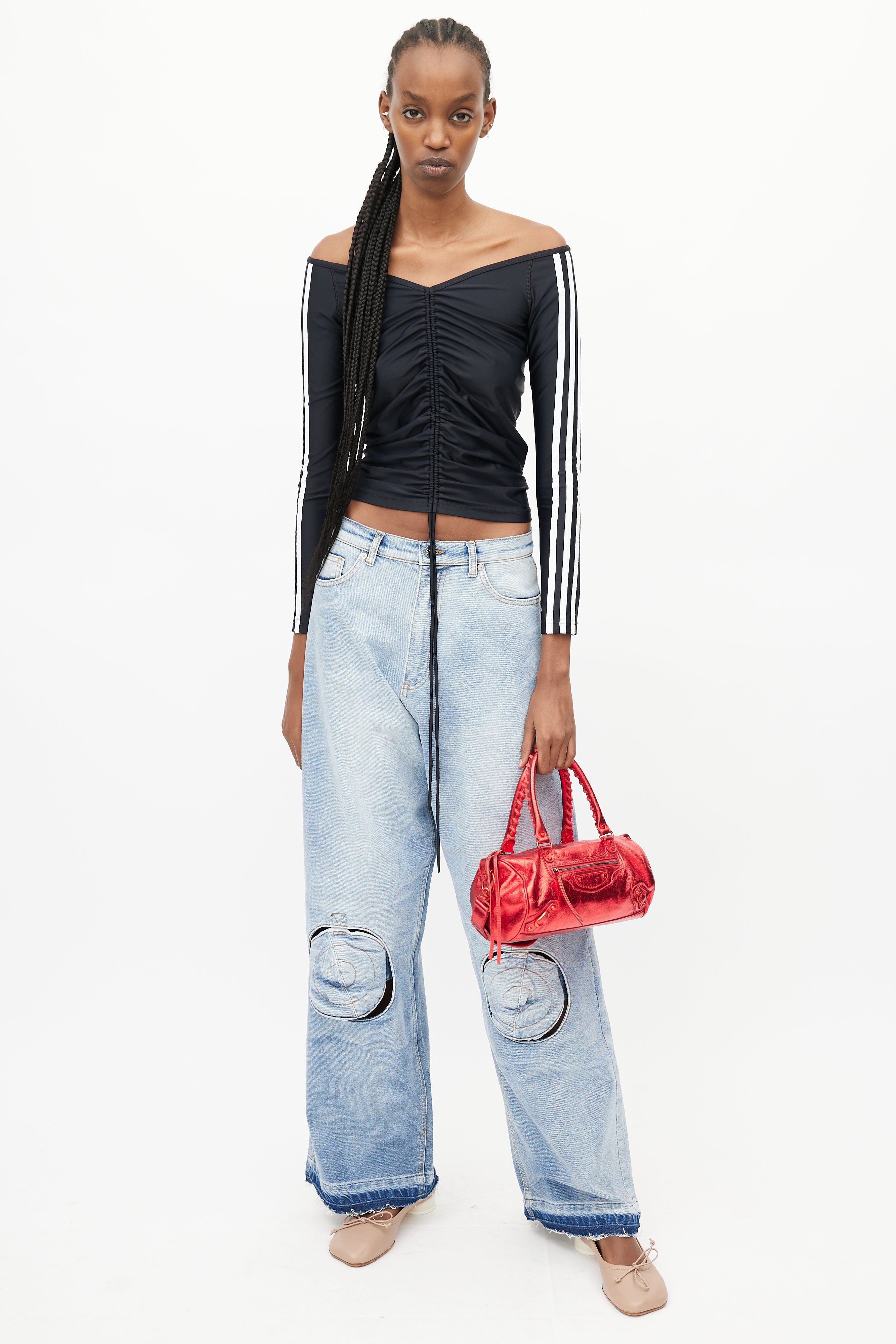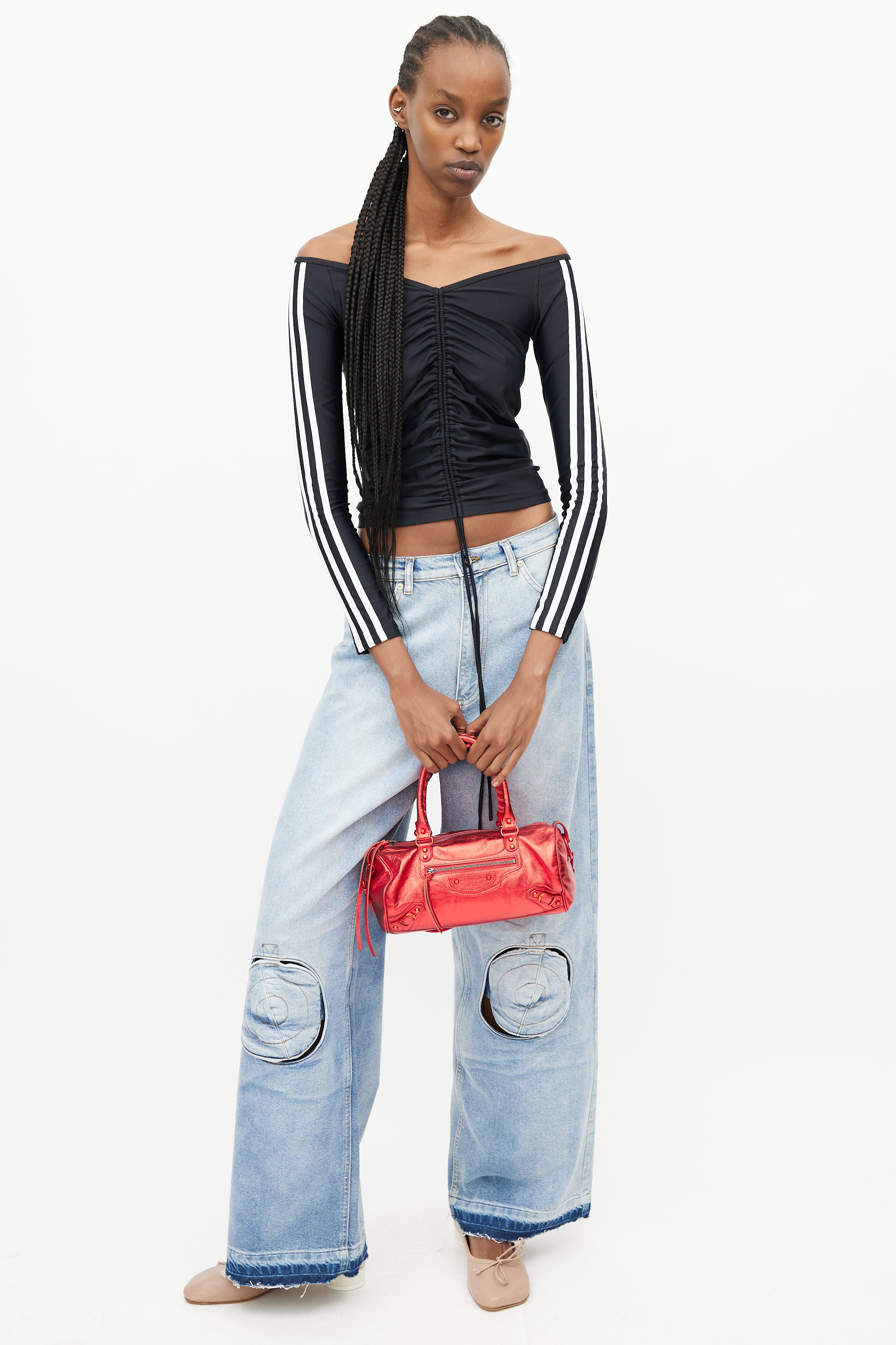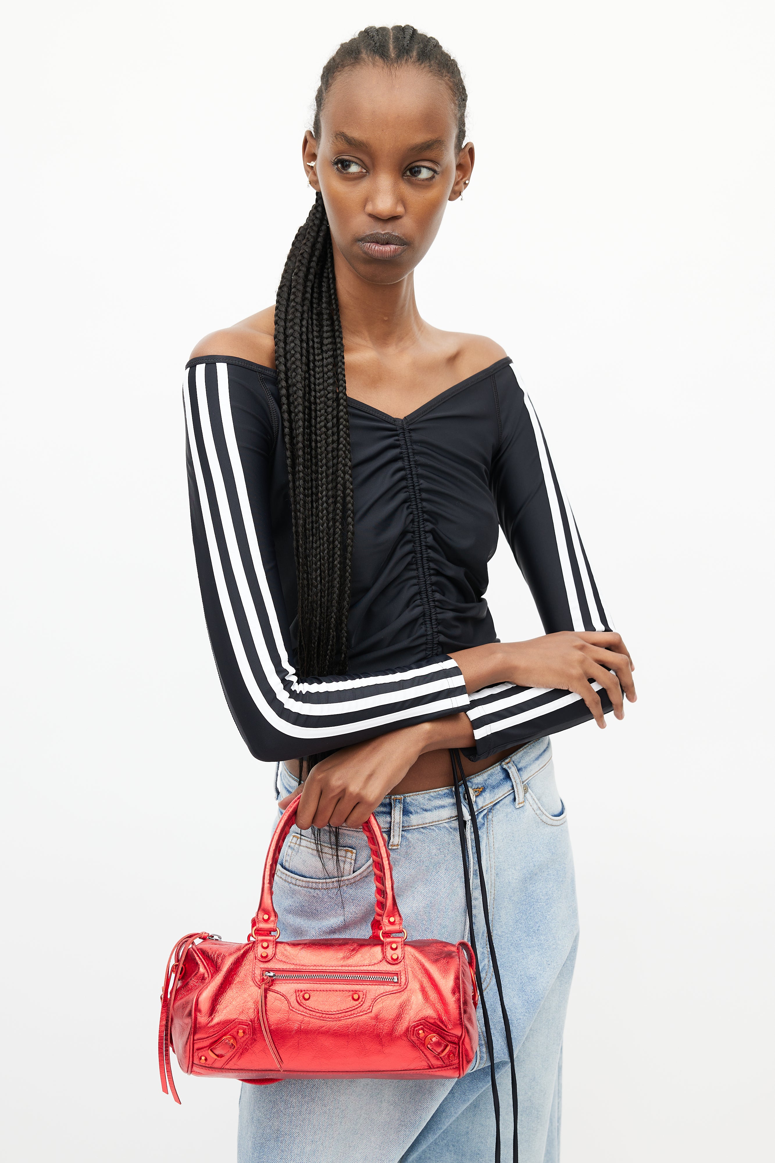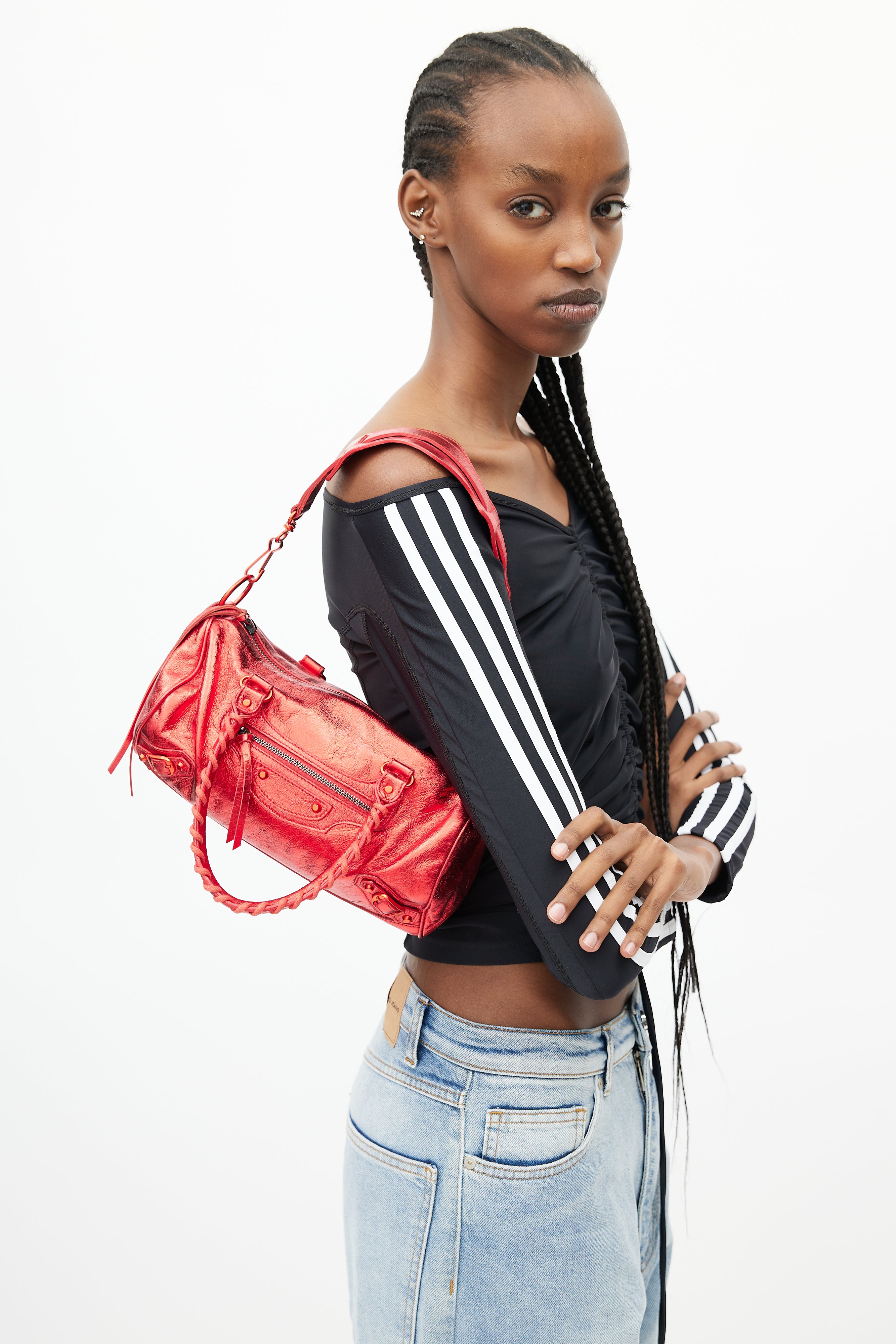 Pre-owned Balenciaga red Twiggy shoulder bag featuring tonal signature City hardware, barrel shape, zip pocket at front, braided top handles, detachable pocket mirror, zip closure at top, detachable shoulder strap, lined main compartment, and zip pocket inside.