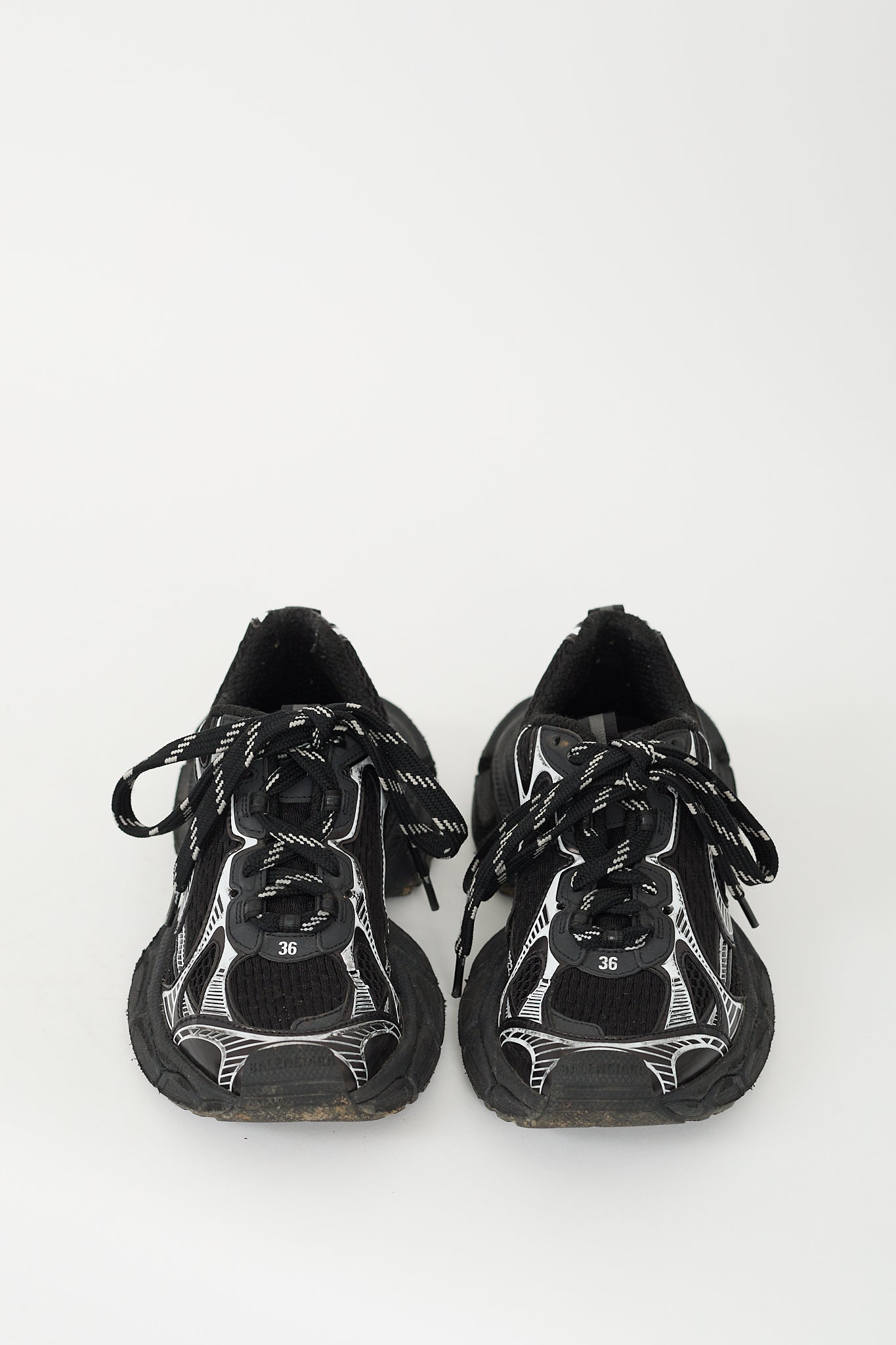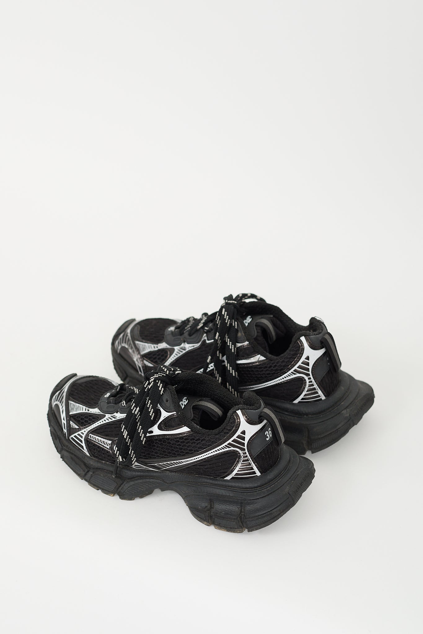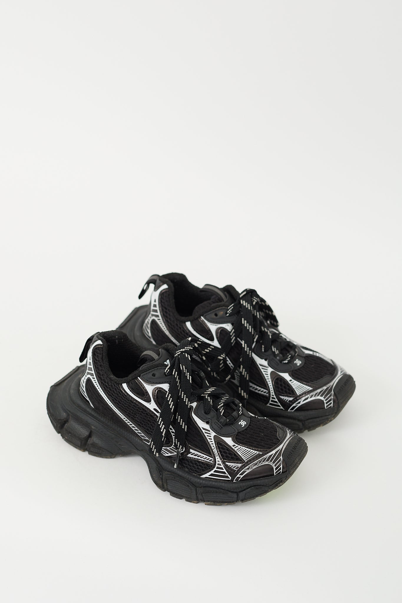 Pre-owned Balenciaga black and white 3XL sneakers featuring a rounded toe, mesh upper, cutout rubber panelling throughout, lace up vamp, rubber logo tab at tongue, debossed "36" at vamp and counter, pull tab at tongue and counter, and chunky treaded rubber sole with embossed logo at toe and heel.