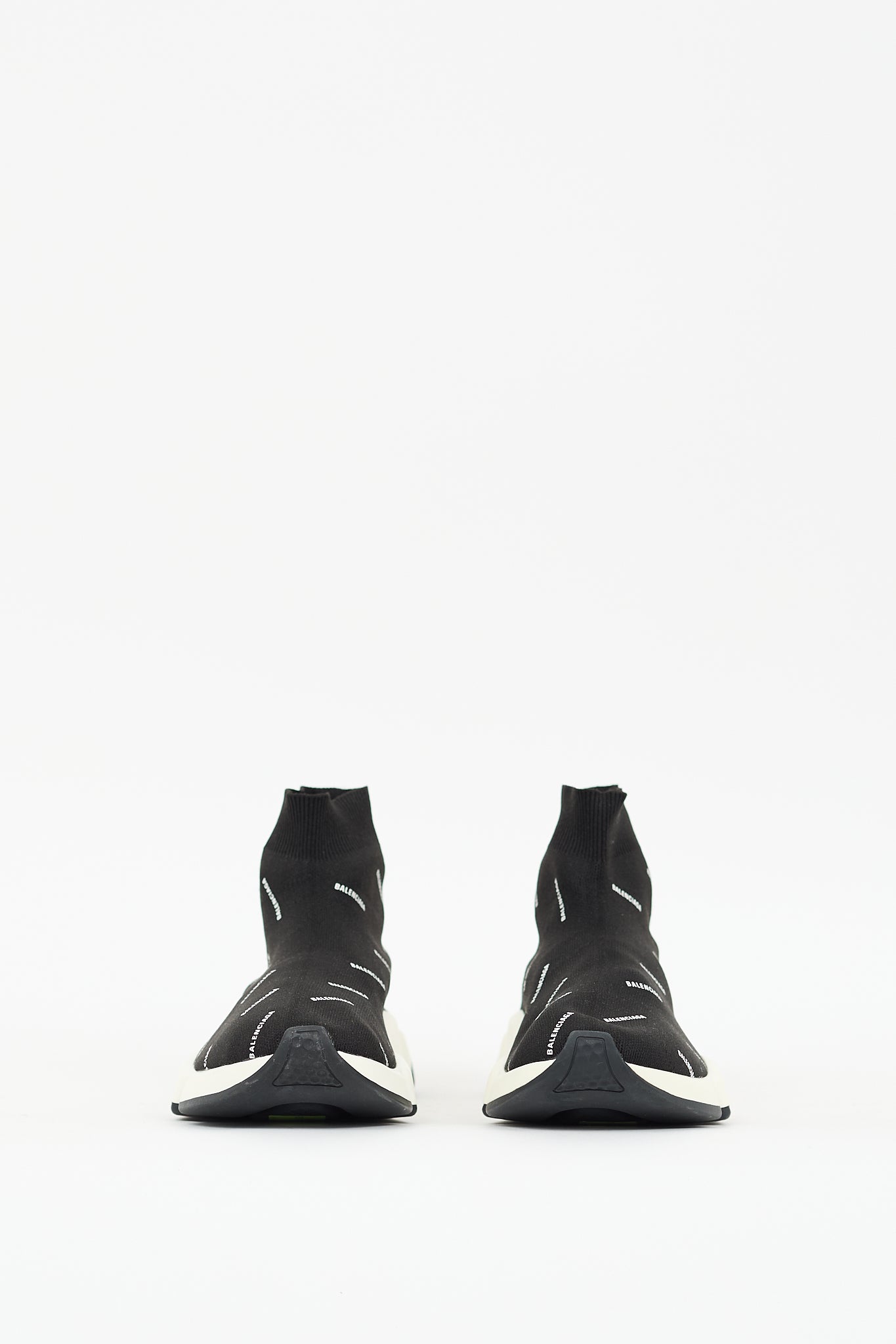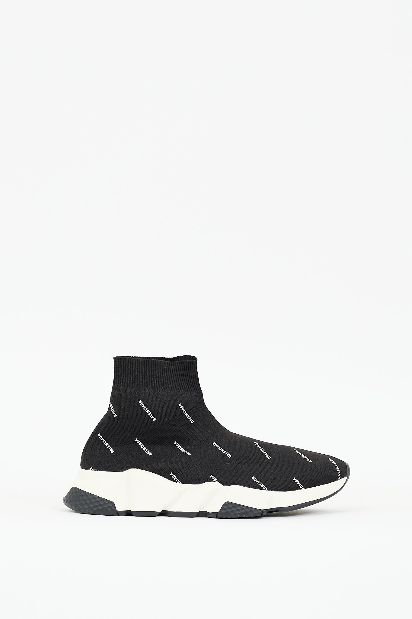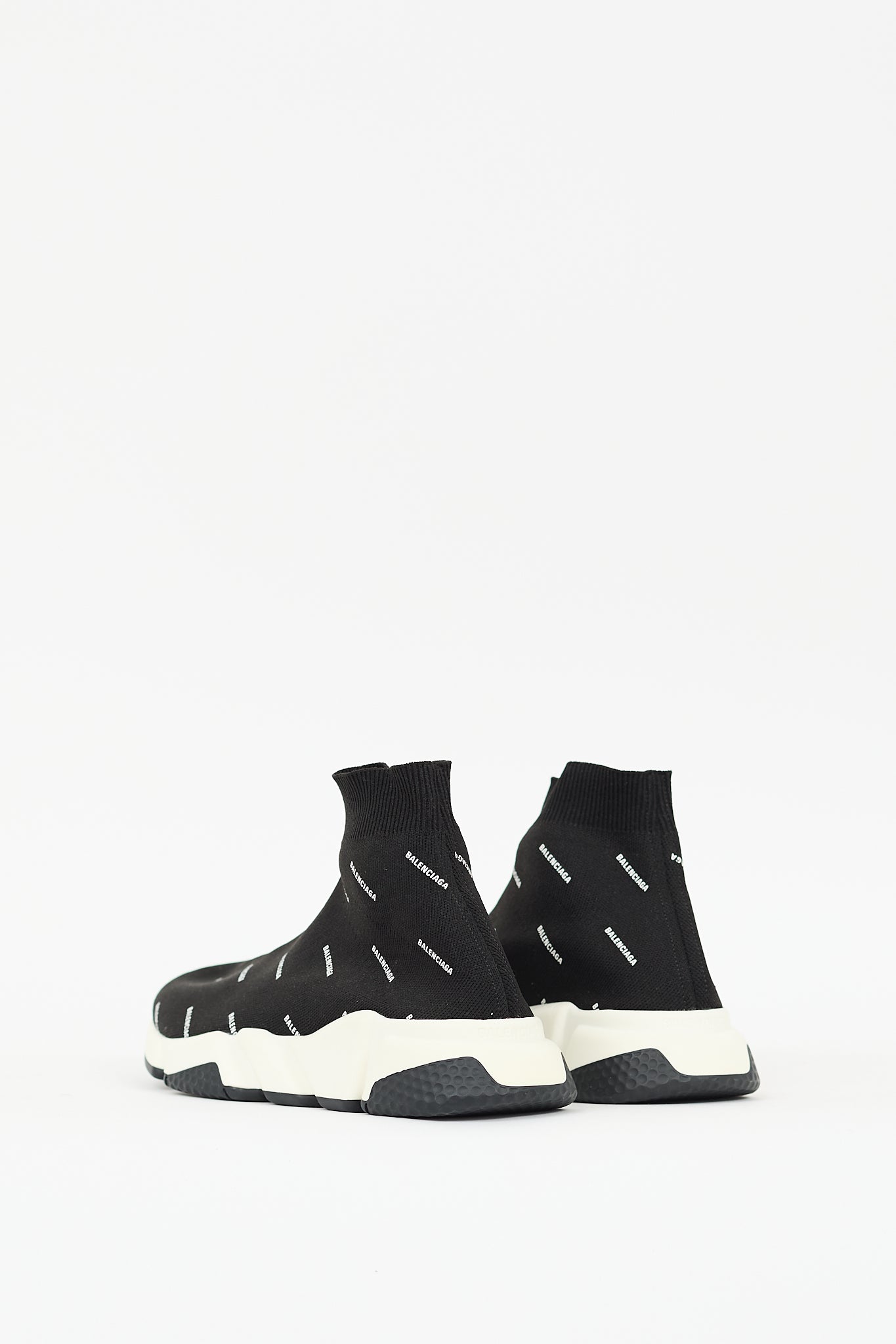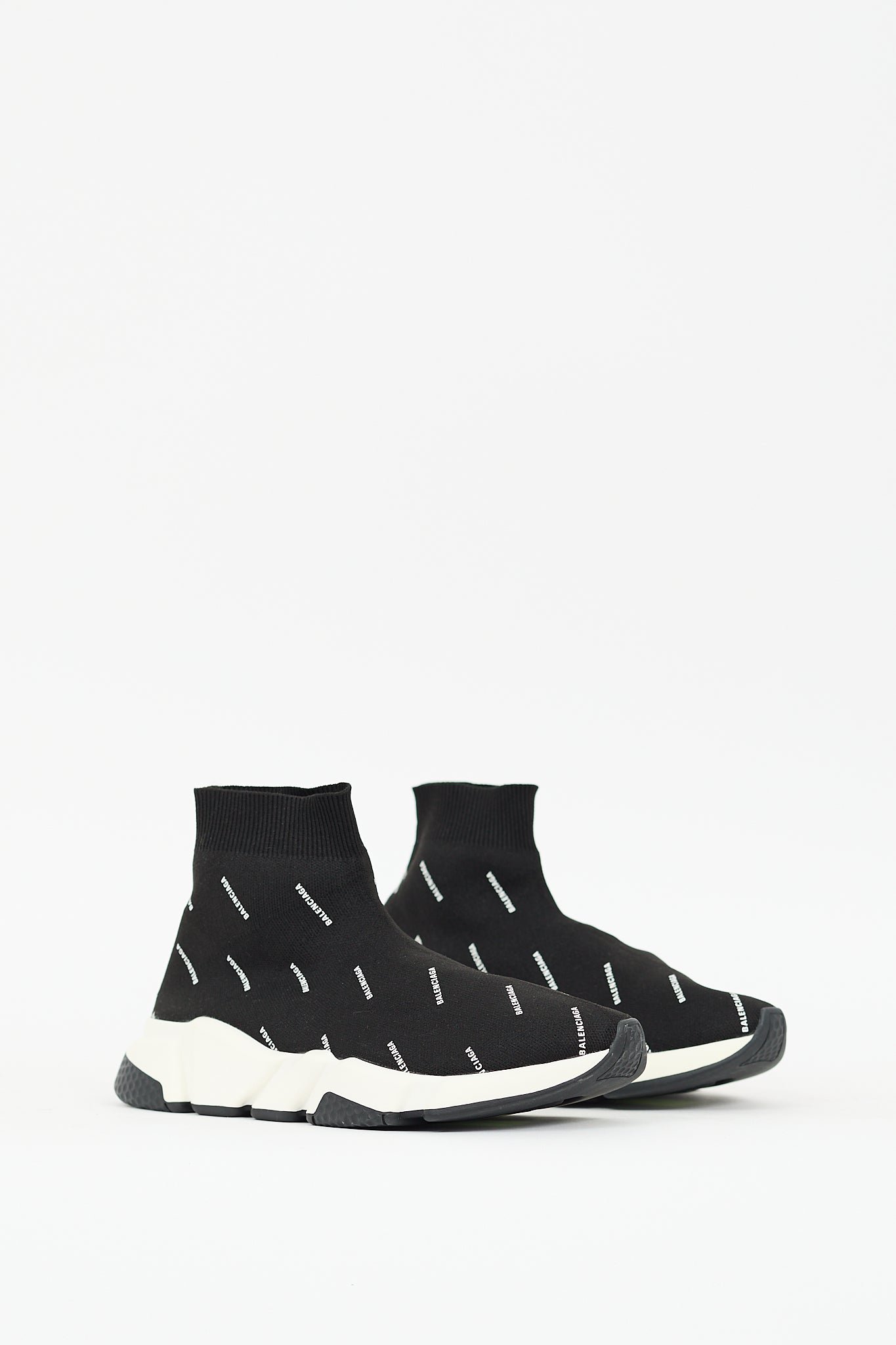 Pre-owned Balenciaga black and white Speed Knit sneakers featuring rounded toe, all over logo intarsia, black and white rubber midsole with debossed logo at heel, and elasticized entry.