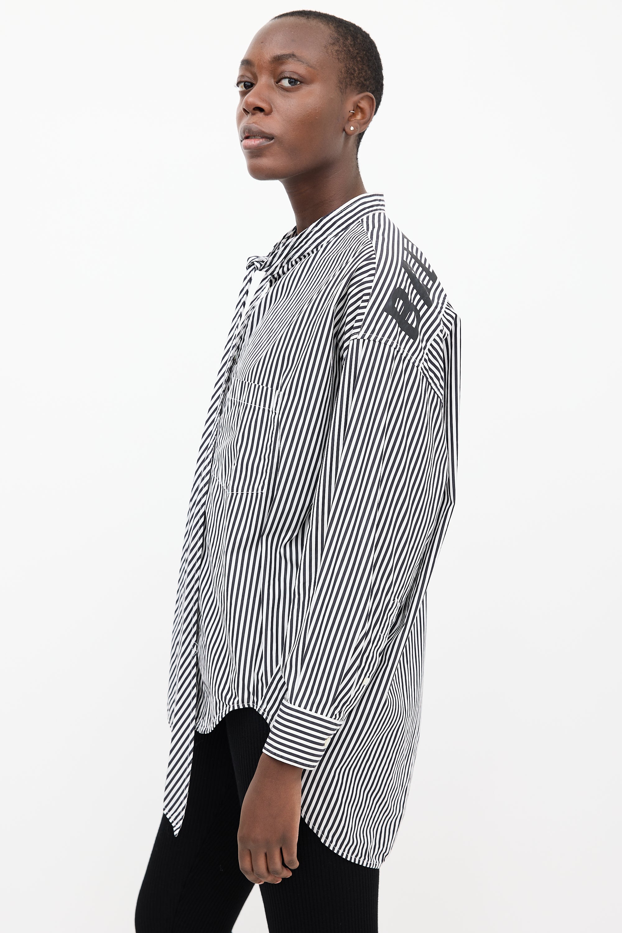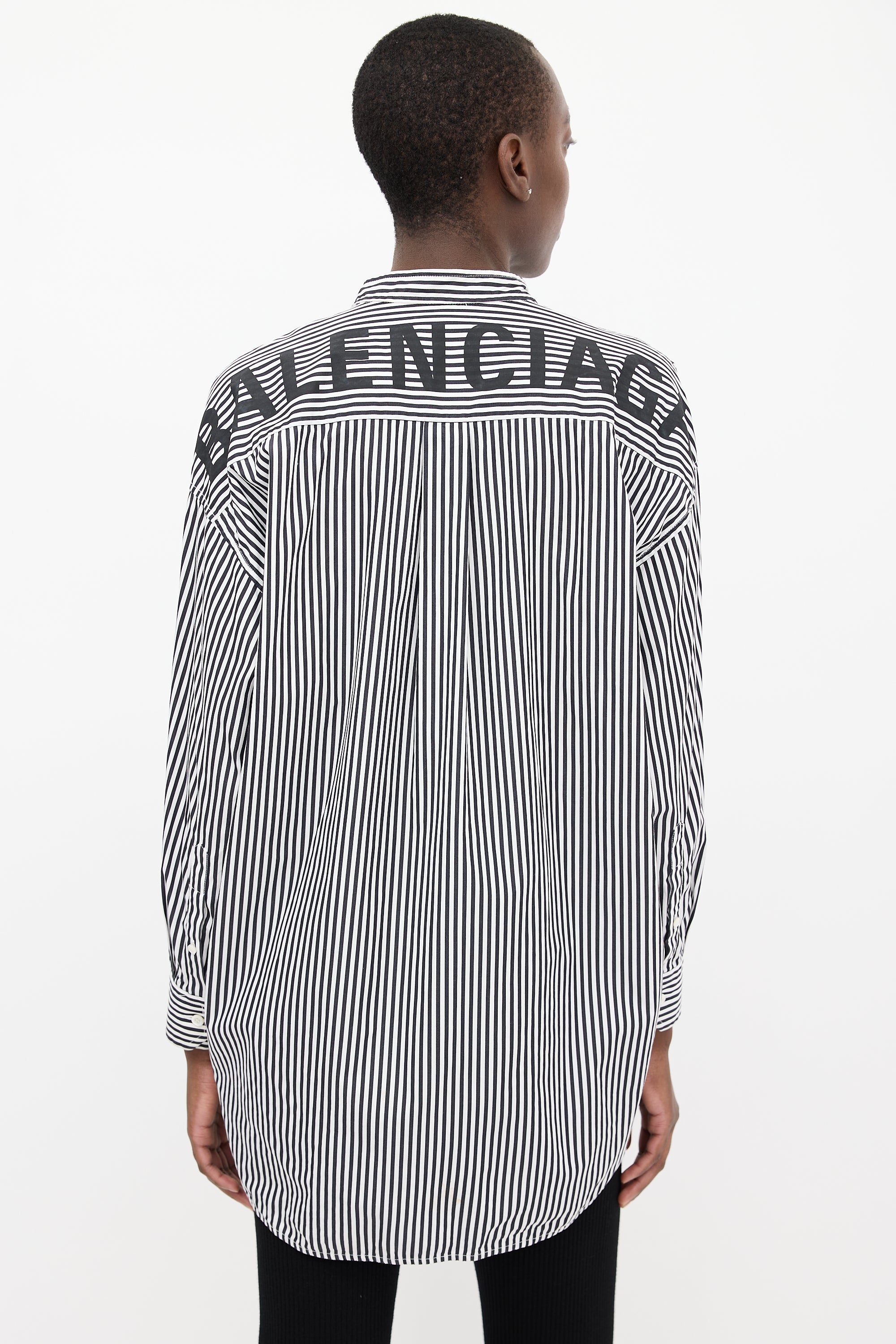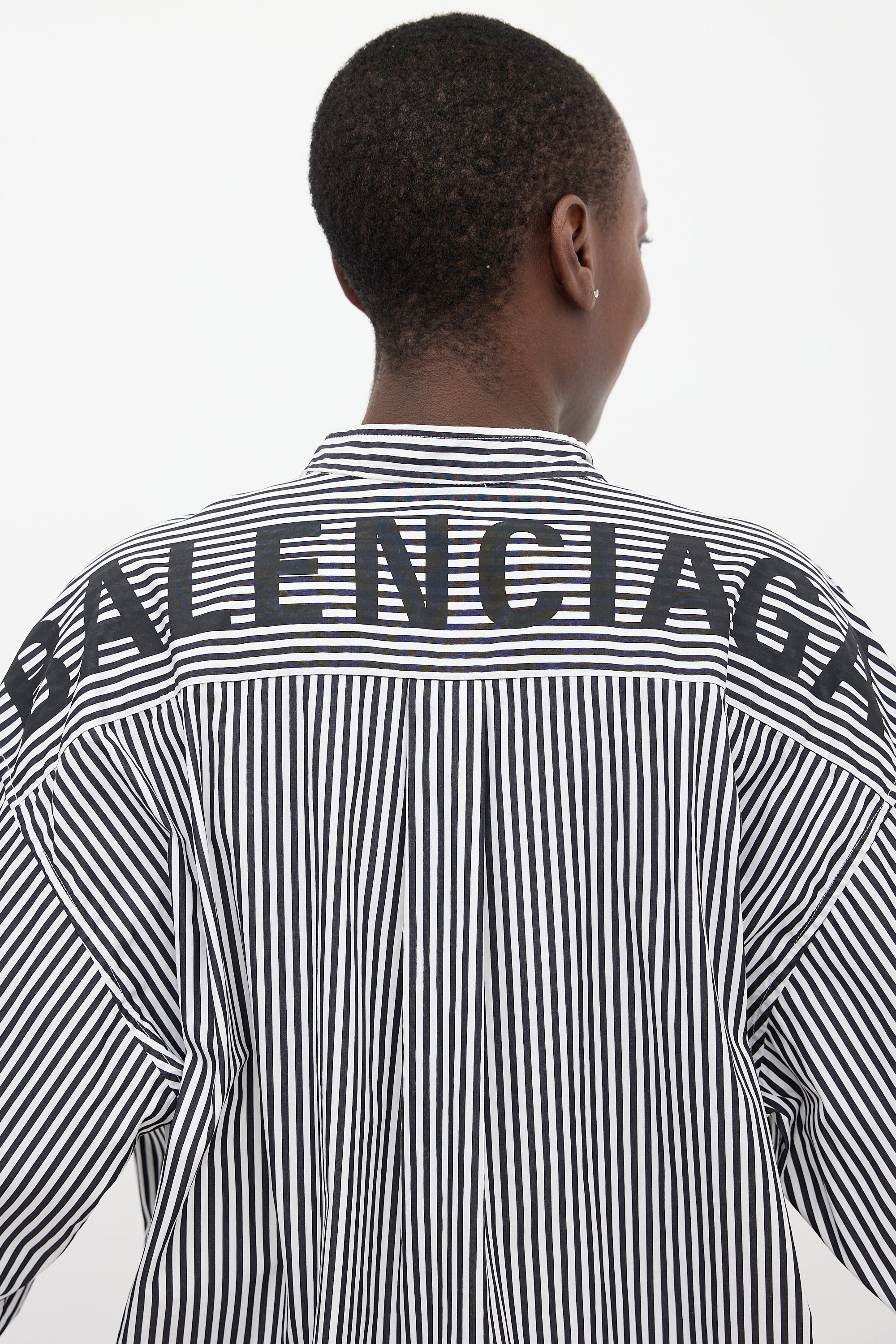 Pre-owned Balenciaga black and white striped shirt featuring a stand collar, tie neck, button up front, patch pocket at left chest, printed logo across upper back, side vents, curved hem, and buttoned cuffs.