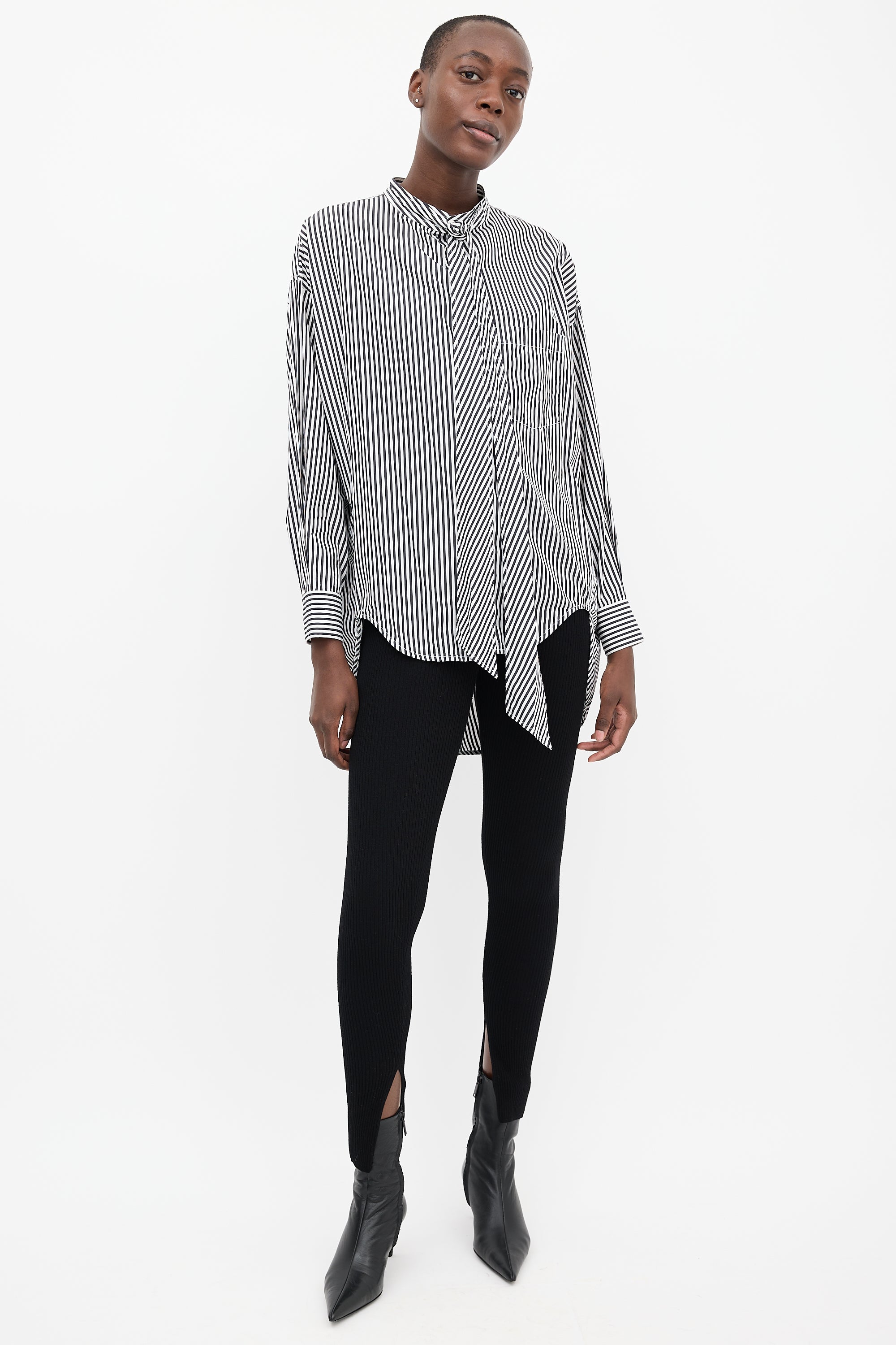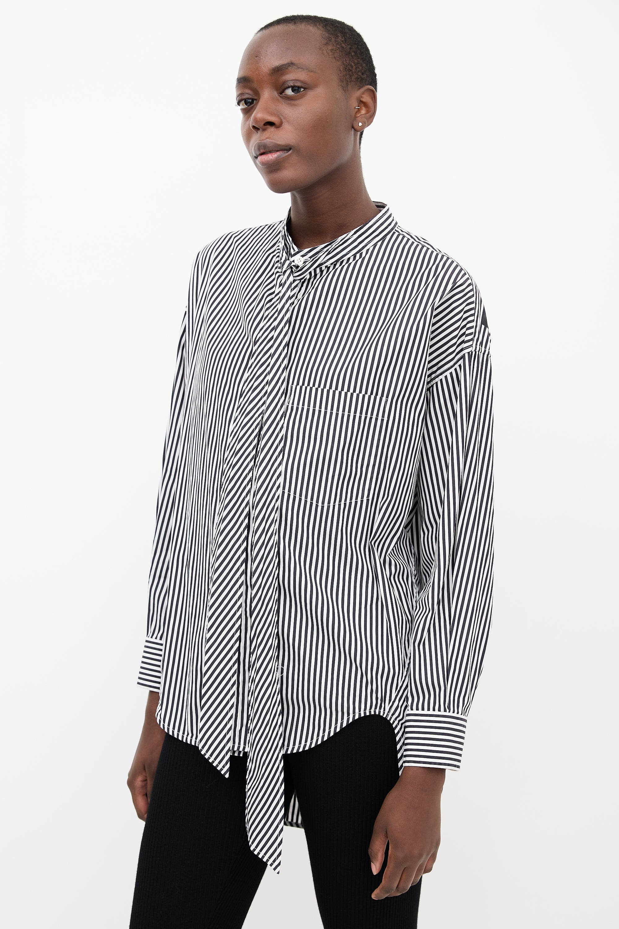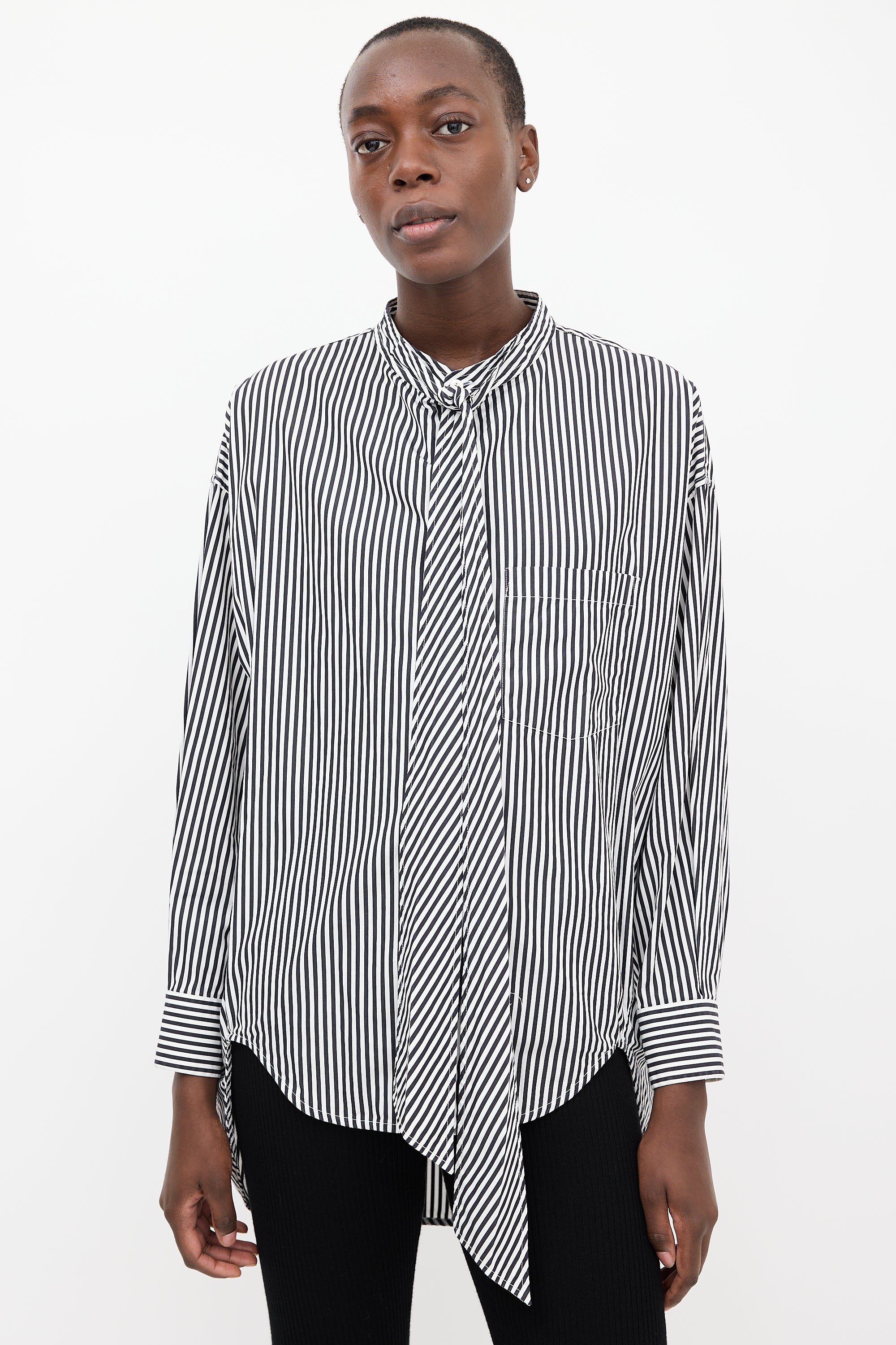 Pre-owned Balenciaga black and white striped shirt featuring a stand collar, tie neck, button up front, patch pocket at left chest, printed logo across upper back, side vents, curved hem, and buttoned cuffs.