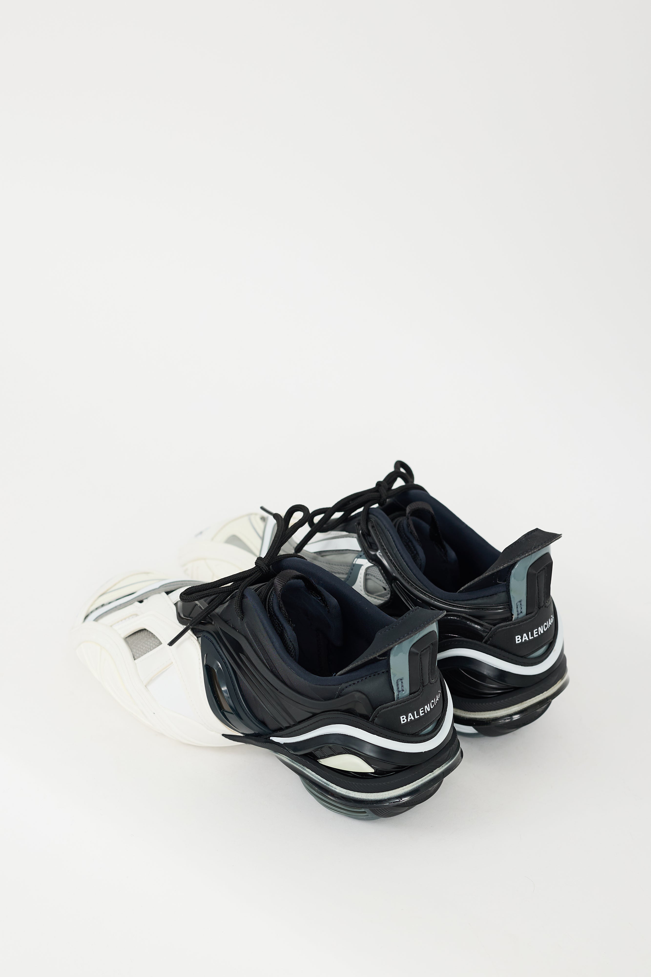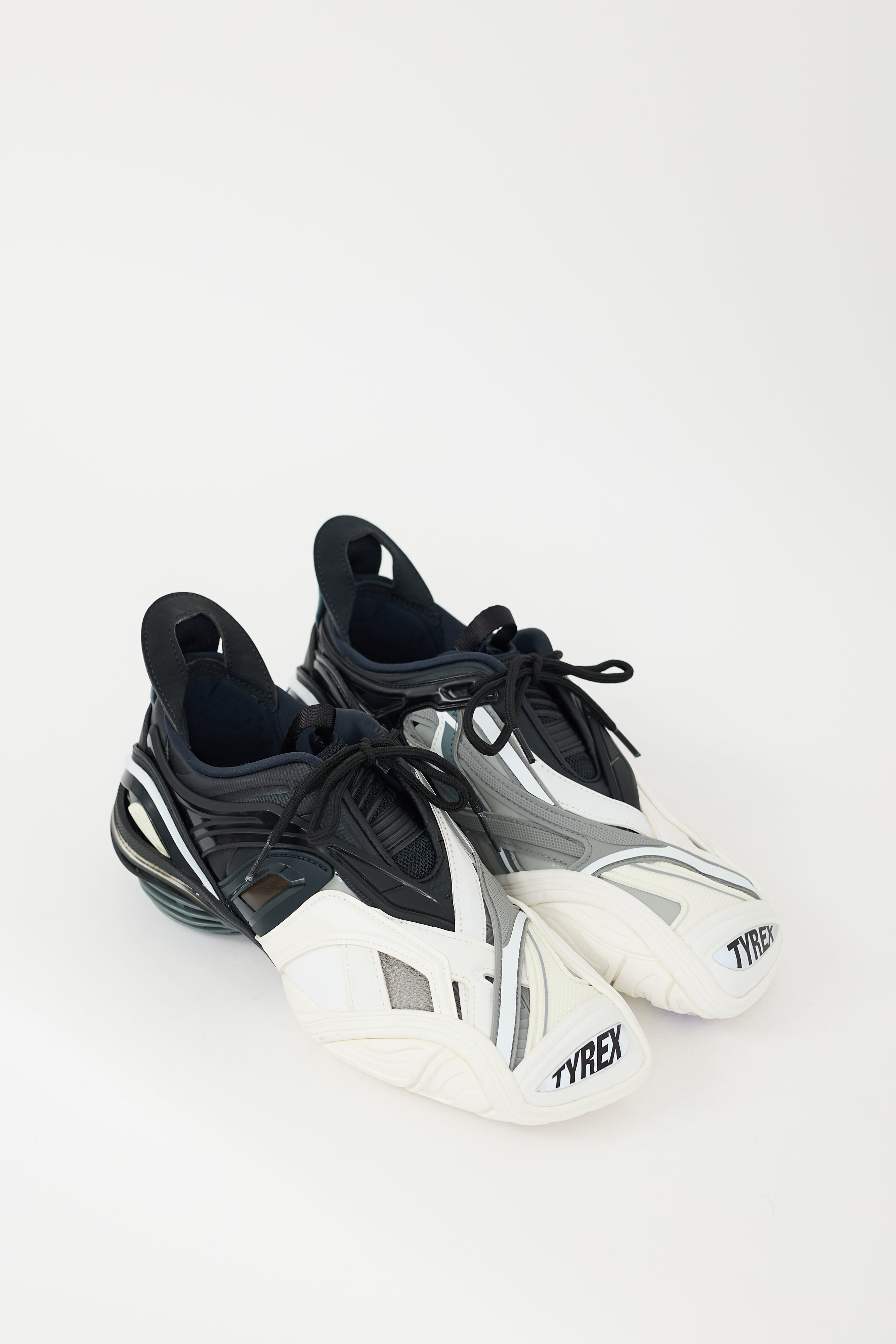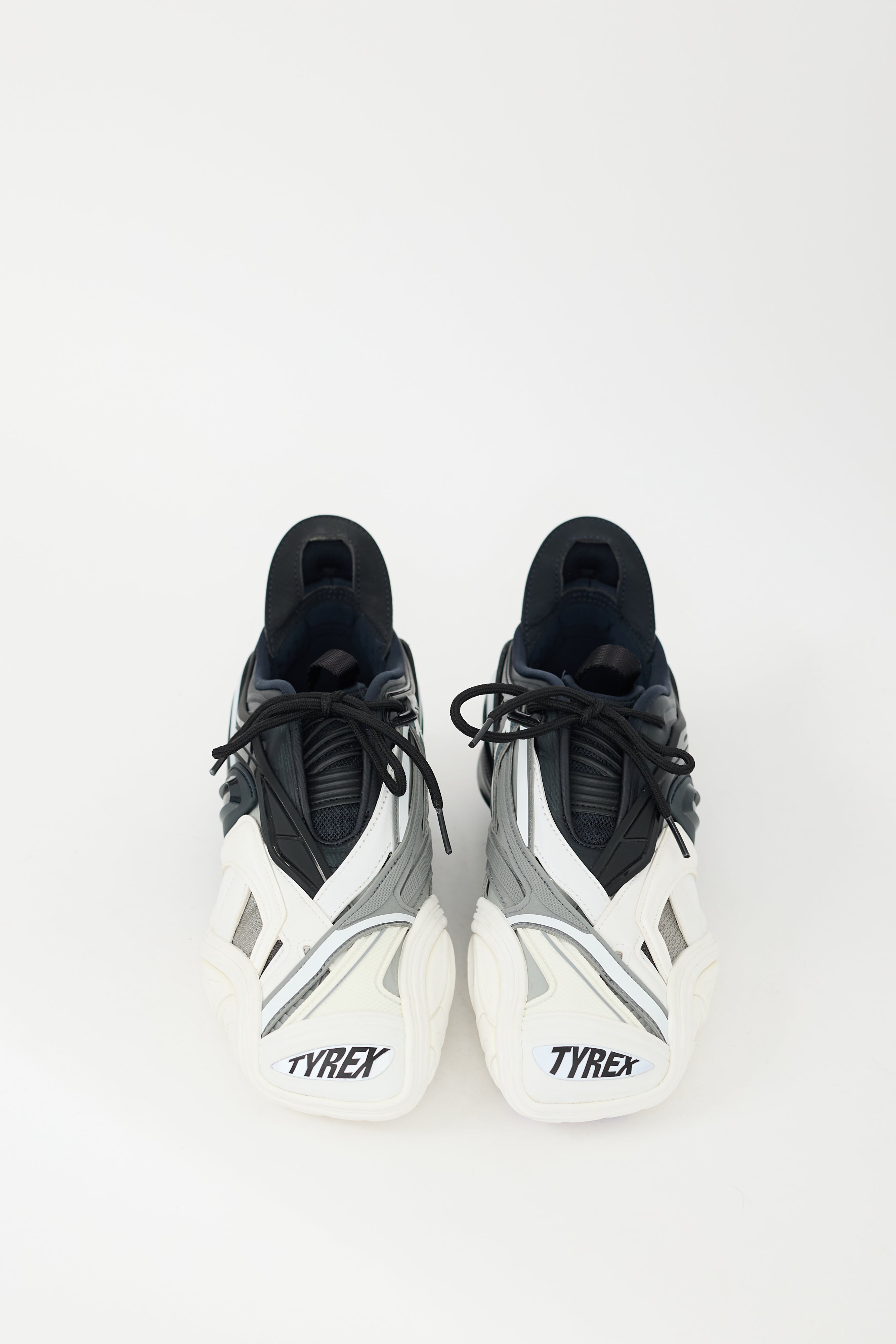 Pre-owned Balenciaga black, white, and grey Tyrex sneakers featuring an angular square toe, multi textile upper, rubber panelling detail throughout, self tie detail at throat, pull tabs at tongue and counter, split outsole, and debossed "Tyrex" at toe. Comes with original dust bag.