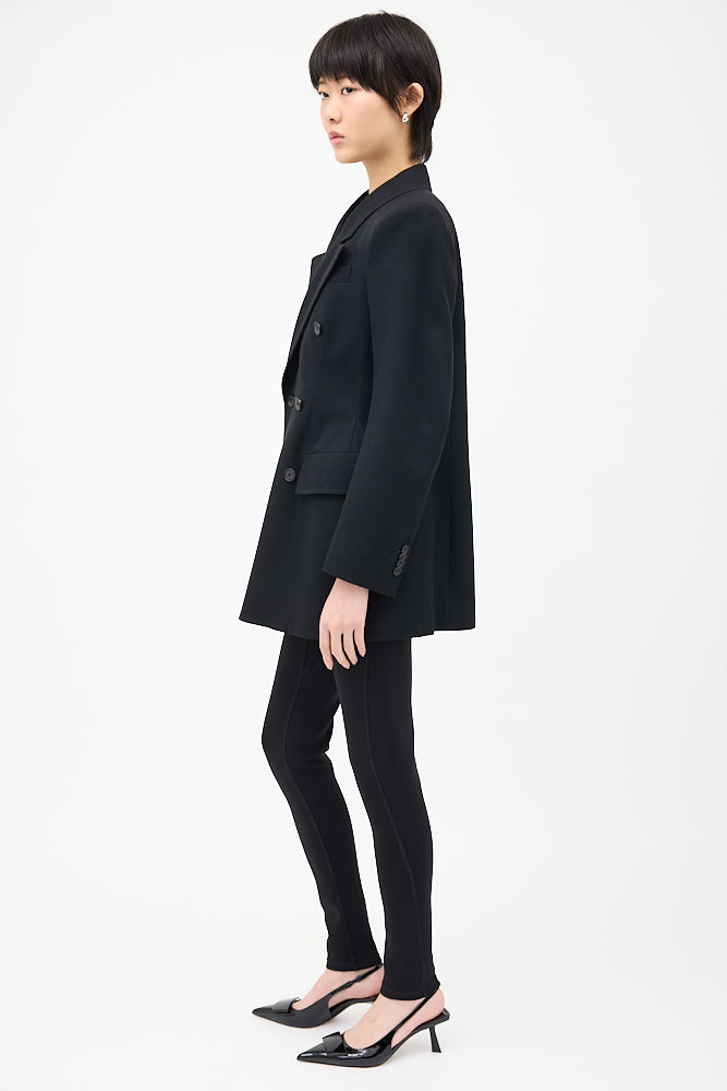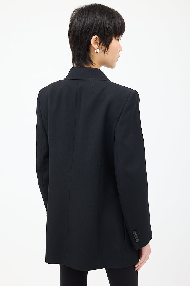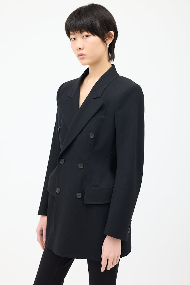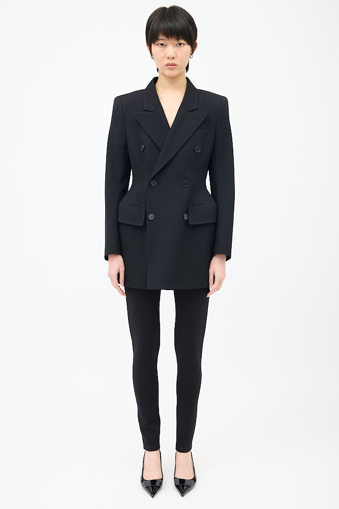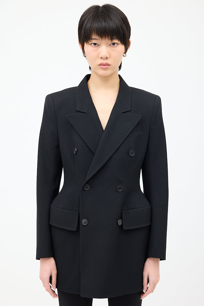 Pre-owned Balenciaga black wool Hourglass blazer featuring a peak lapel, double breasted button up front closure, welt pocket at left chest, two flap pockets at front hip, contoured silhouette, padded shoulders, and long sleeves with buttoned cuffs. Lined.