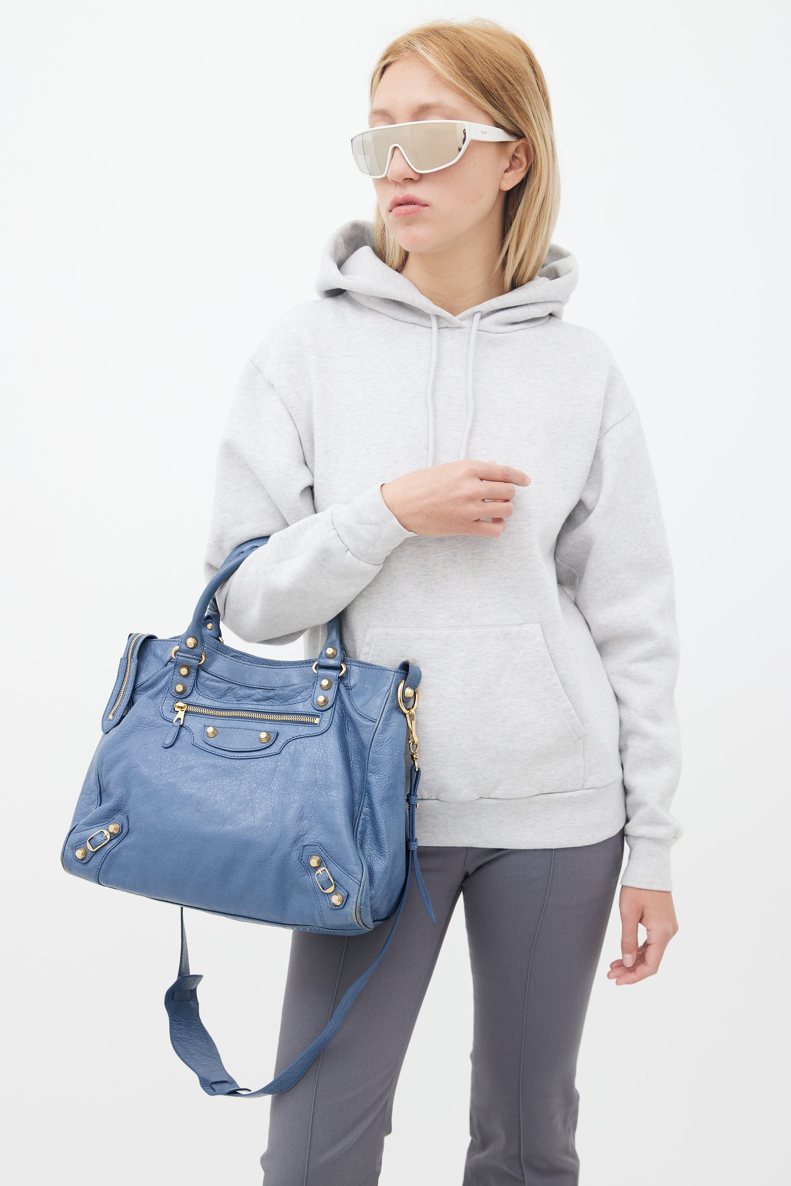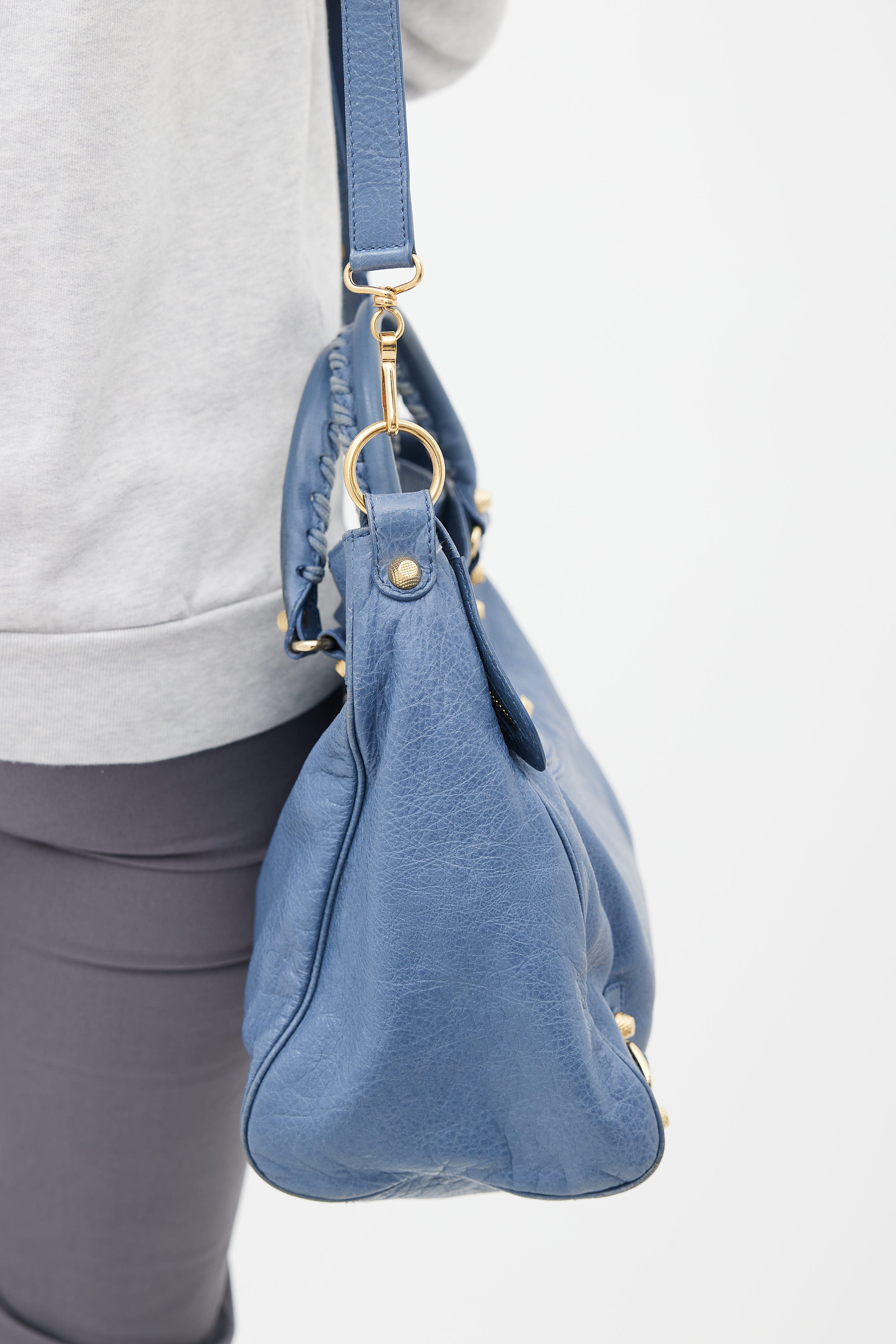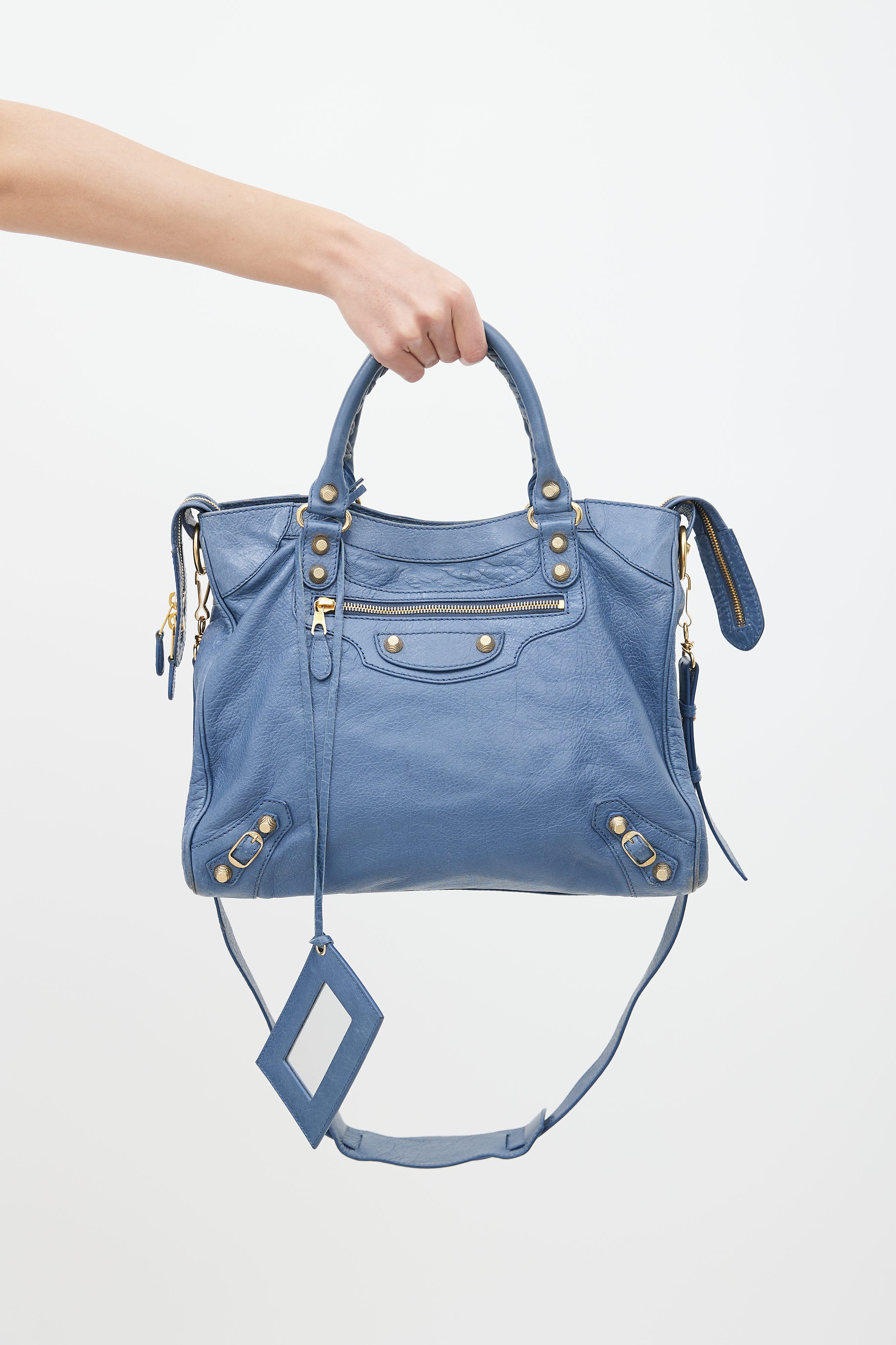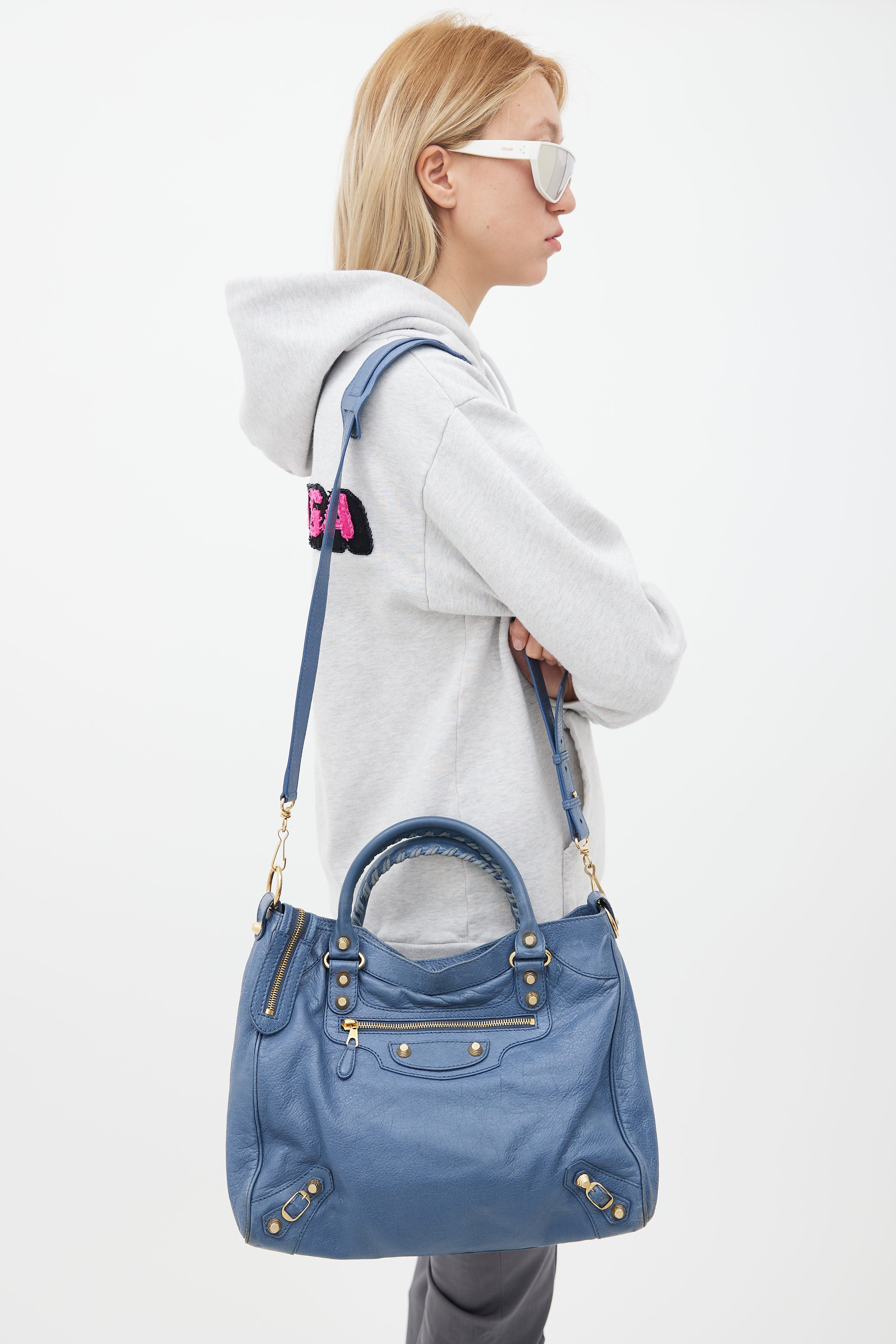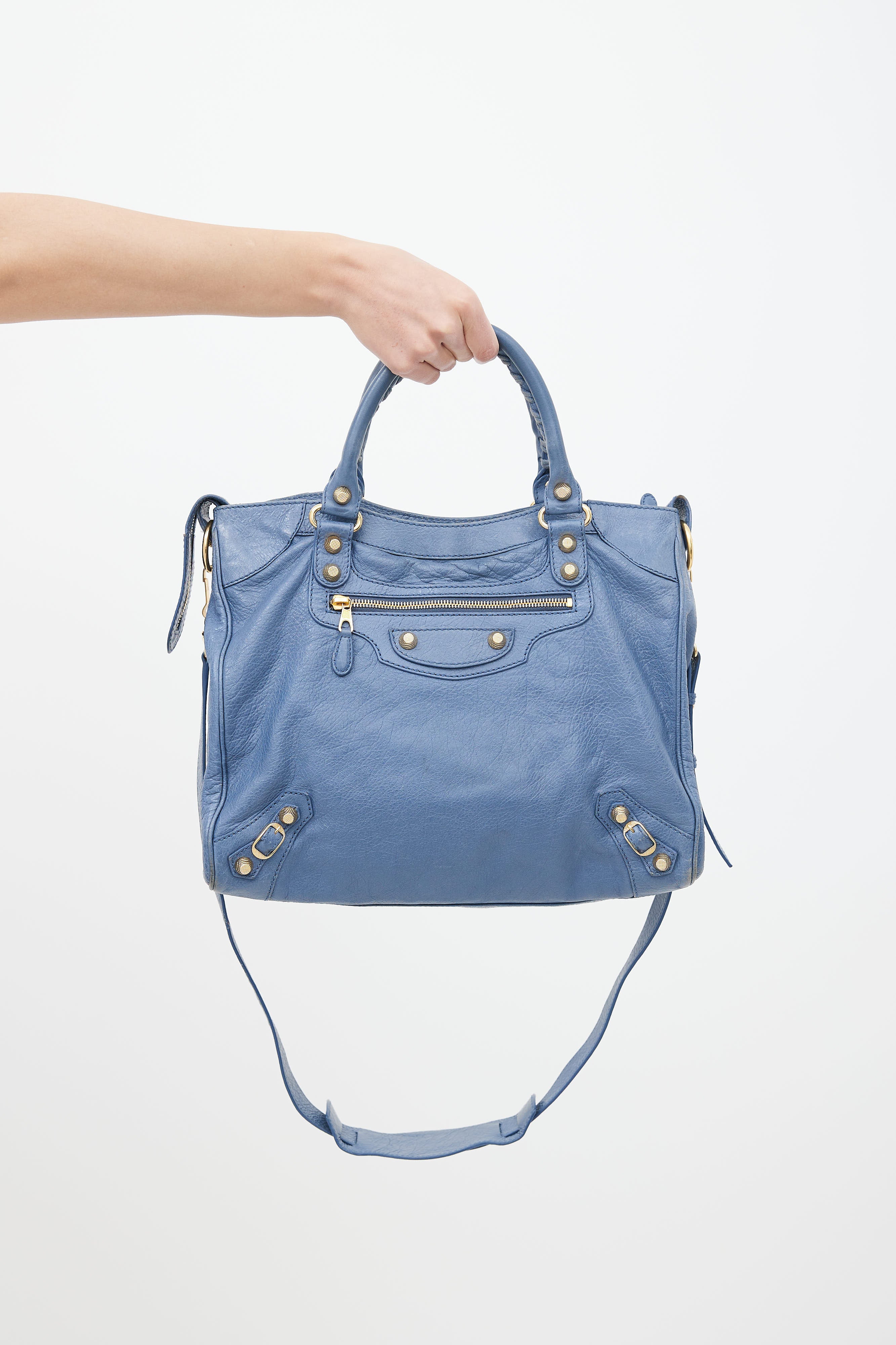 Pre-owned Balenciaga City bag in blue featuring dual rolled top handle with braided trim, top zip closure, zip pocket at face, gold-tone stud hardware detailing throughout, detachable shoulder strap, leather framed mirror attachment, single main compartment, and interior phone pockets and zip pocket.