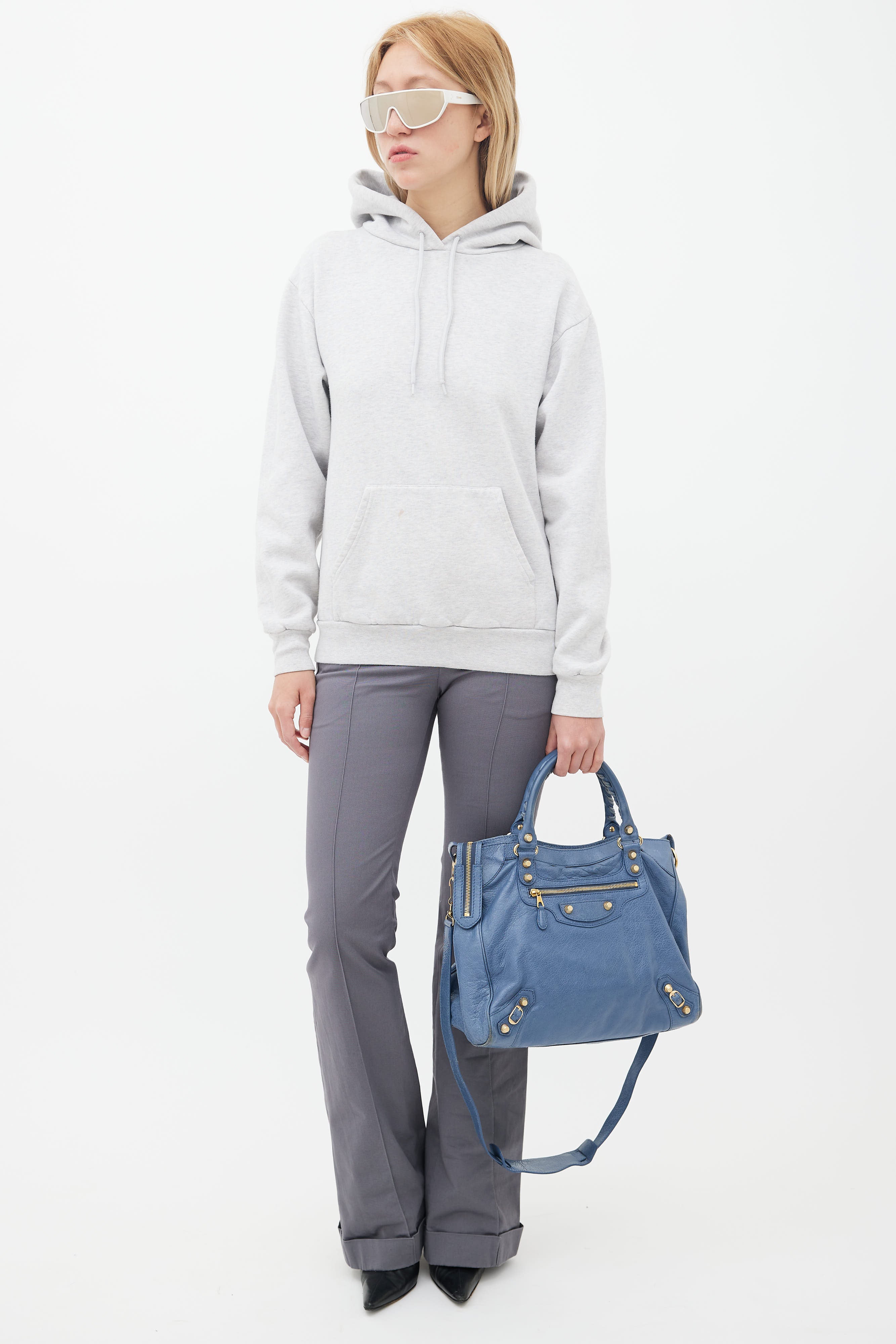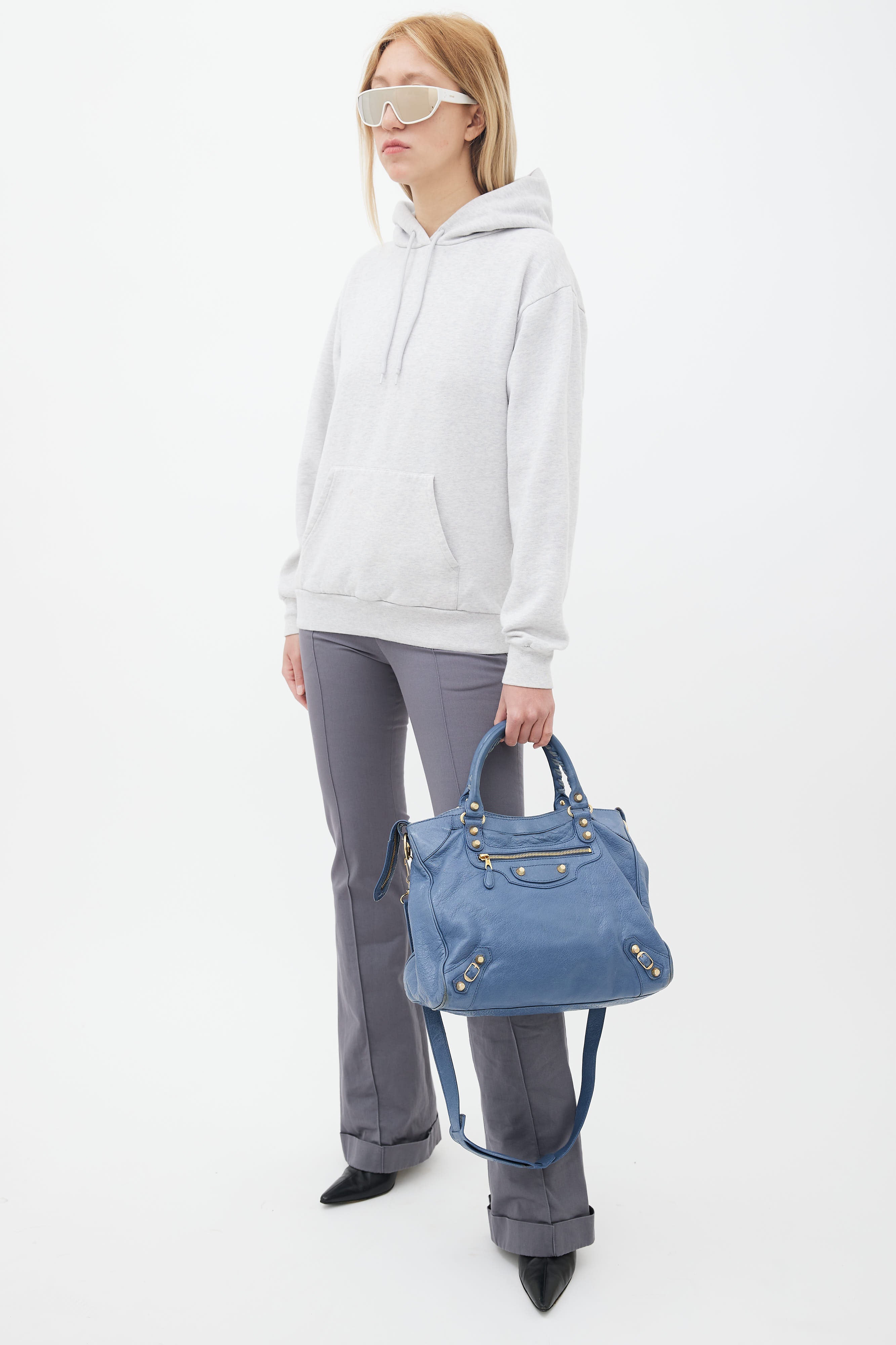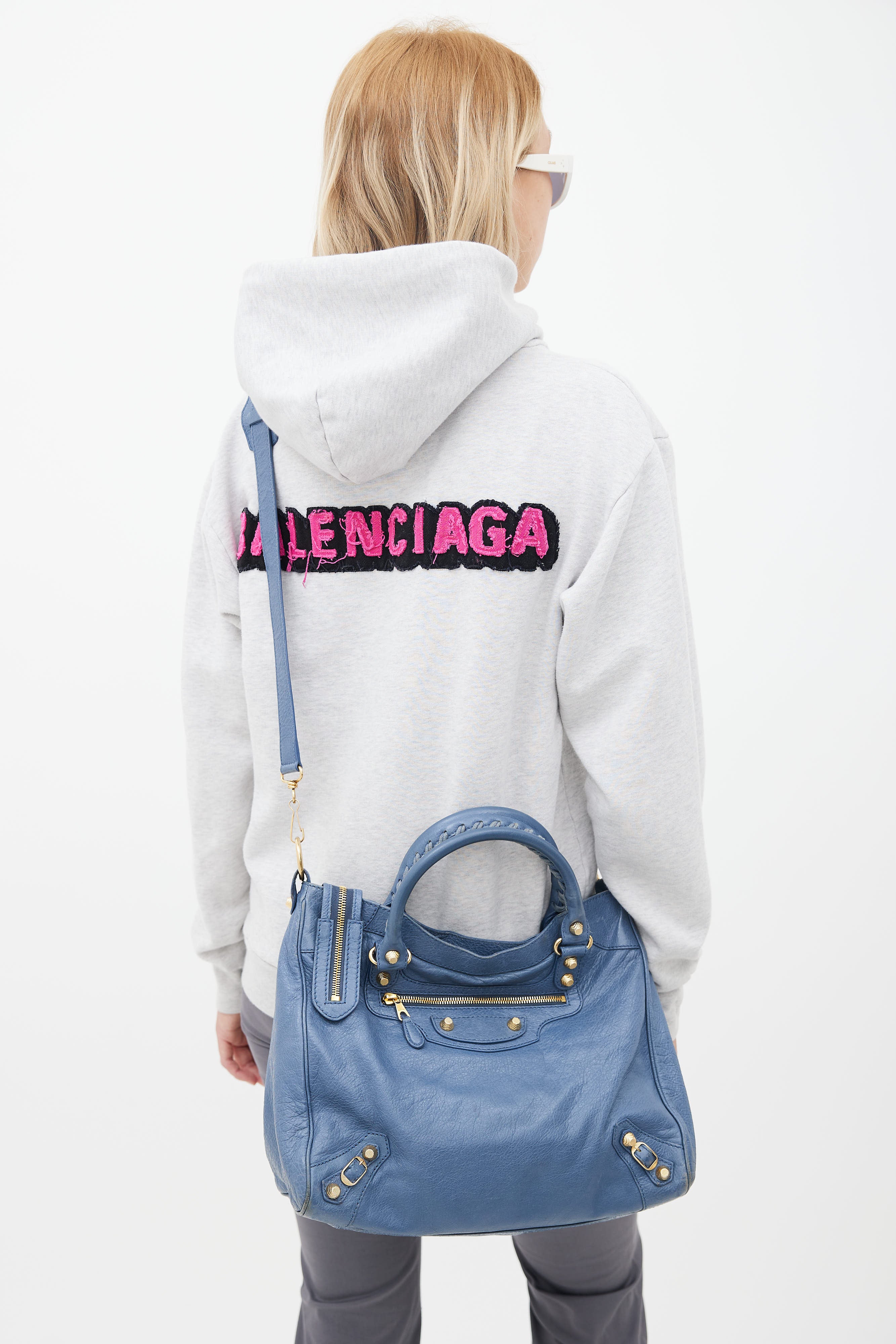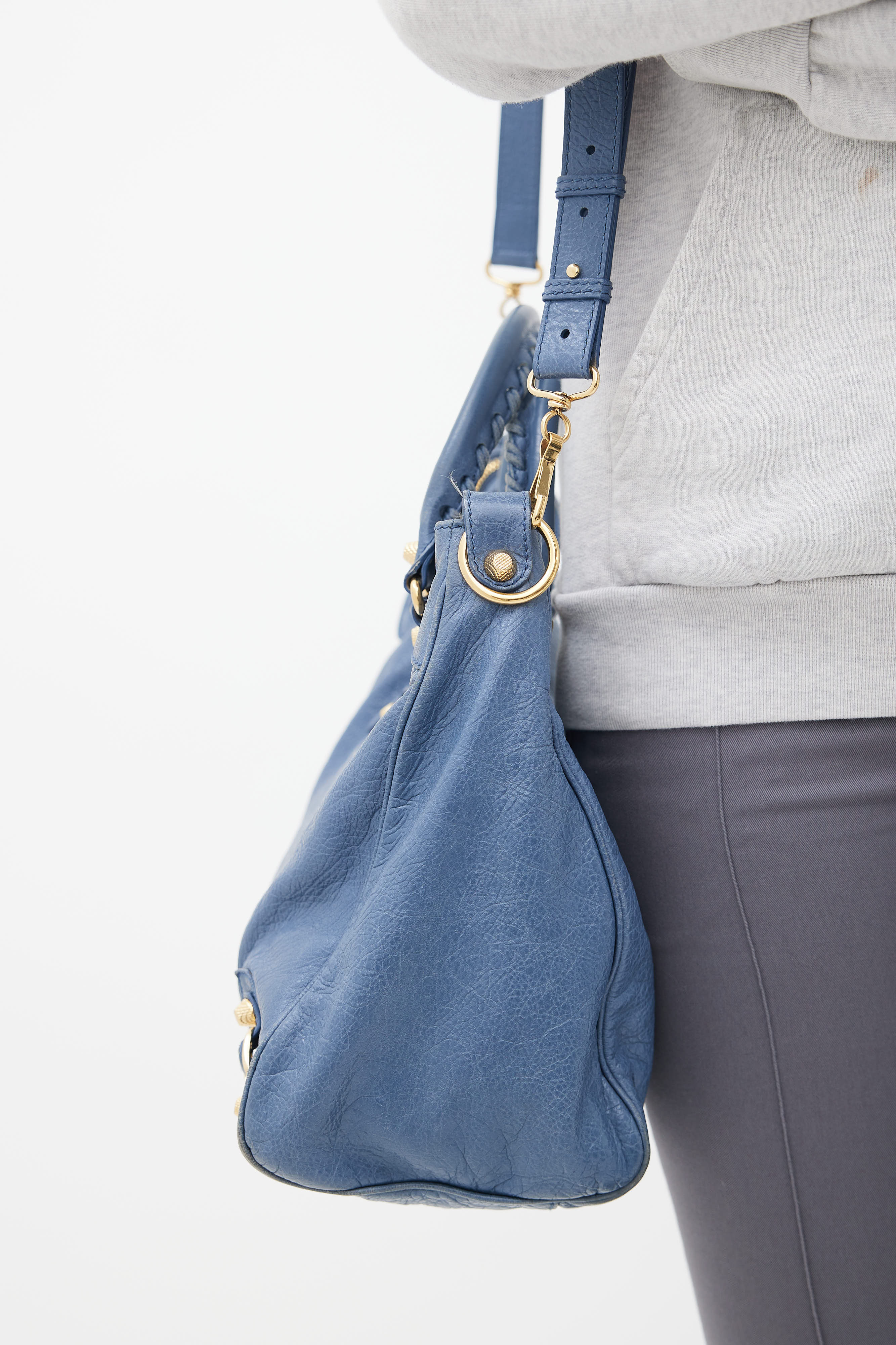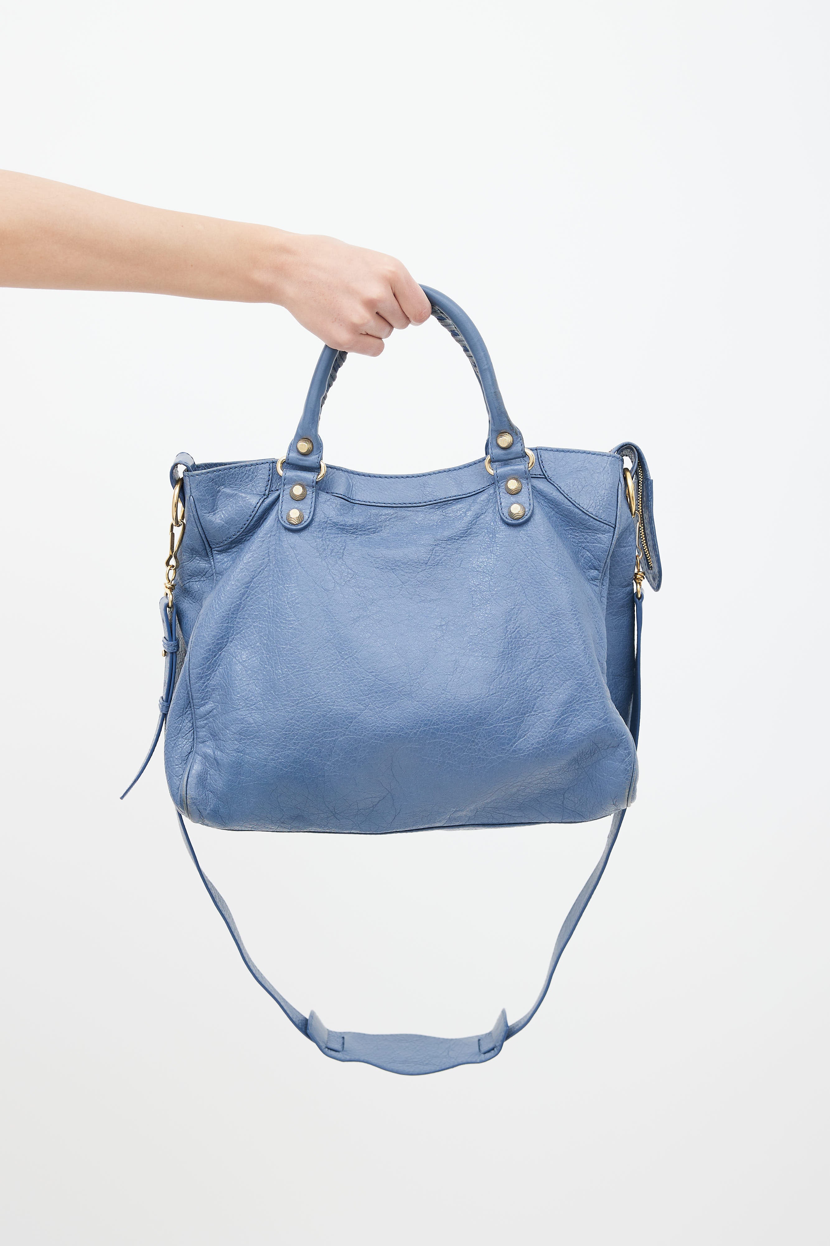 Pre-owned Balenciaga City bag in blue featuring dual rolled top handle with braided trim, top zip closure, zip pocket at face, gold-tone stud hardware detailing throughout, detachable shoulder strap, leather framed mirror attachment, single main compartment, and interior phone pockets and zip pocket.