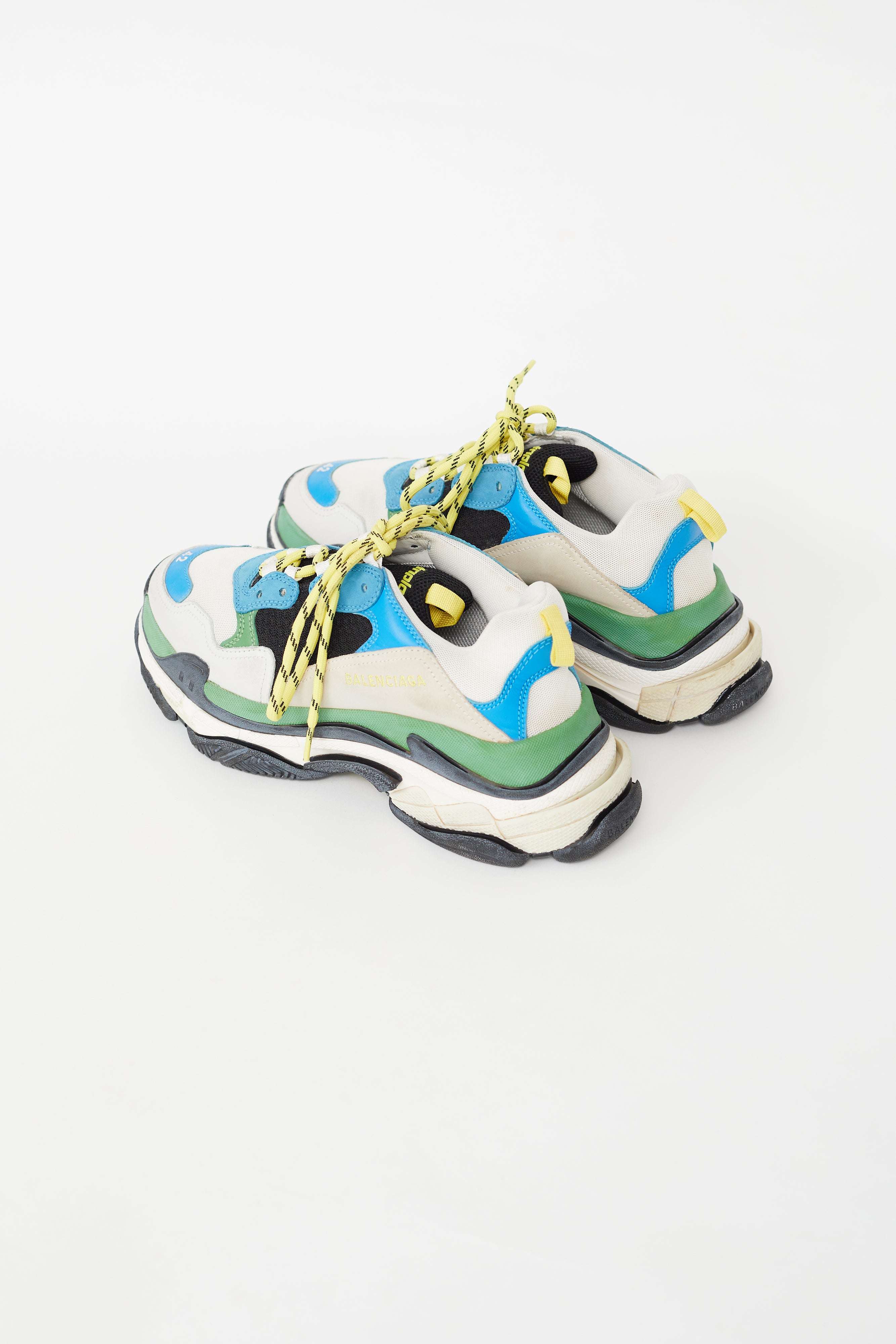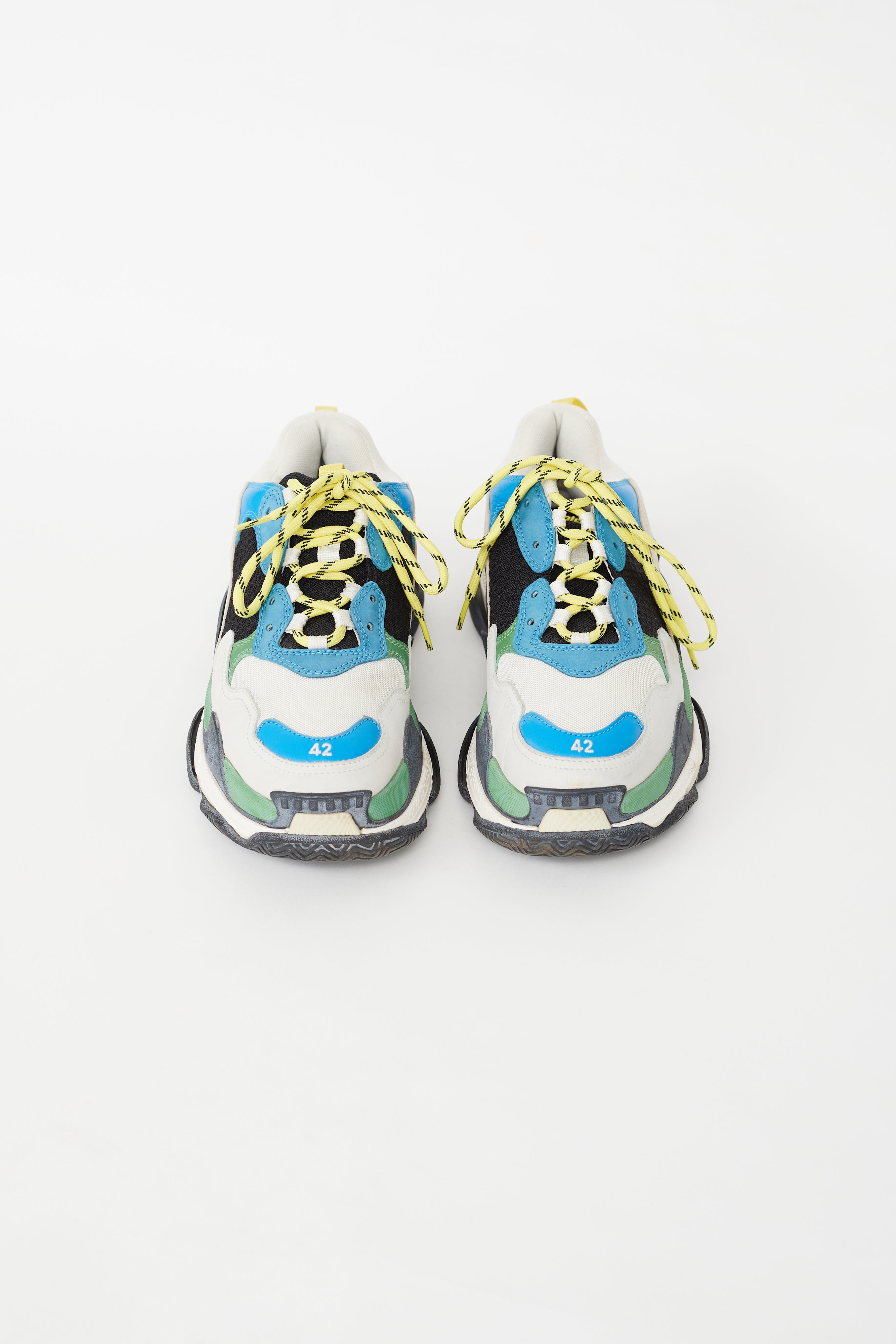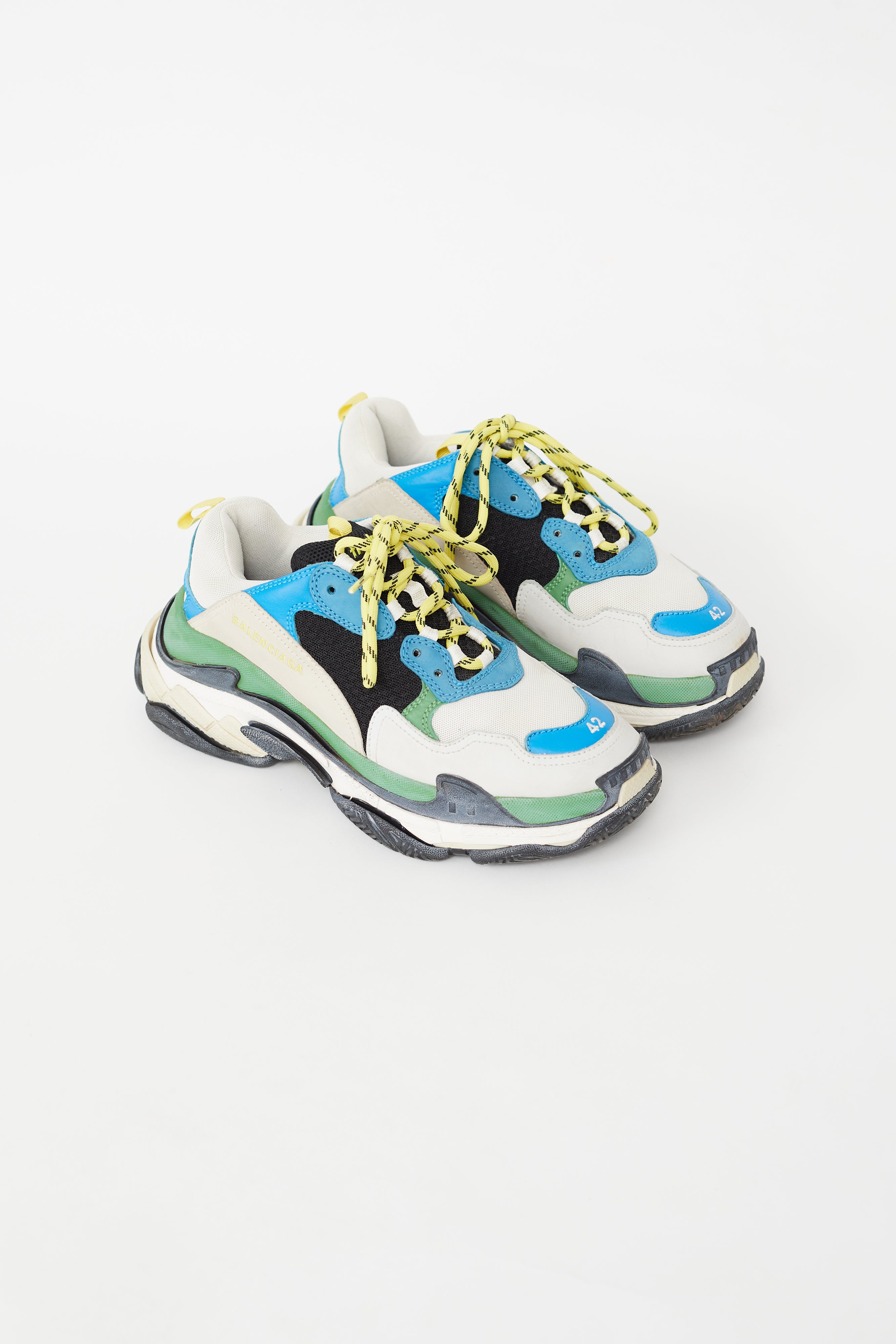Pre-owned Balenciaga multicolour Triple S sneaker featuring a rounded toe, leather and mesh paneling at upper, yellow cord lace up vamp, pull tab at heel and tongue, multicolour chunky midsole and an embroidered "42" at toe.