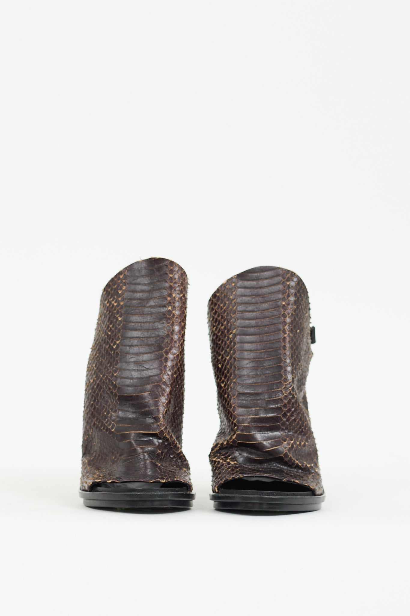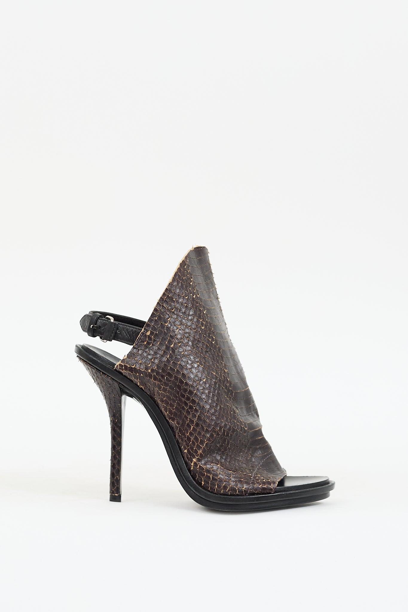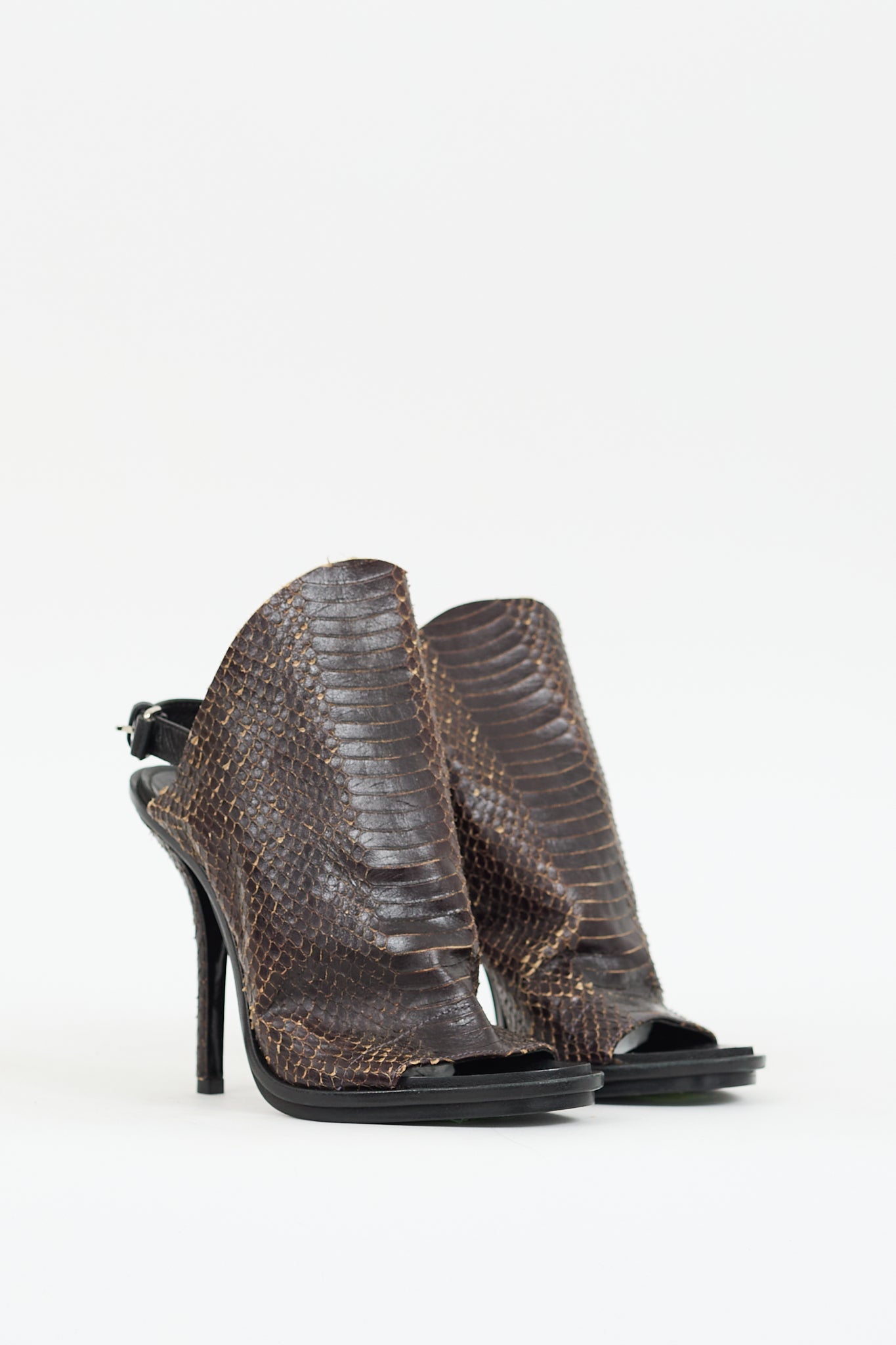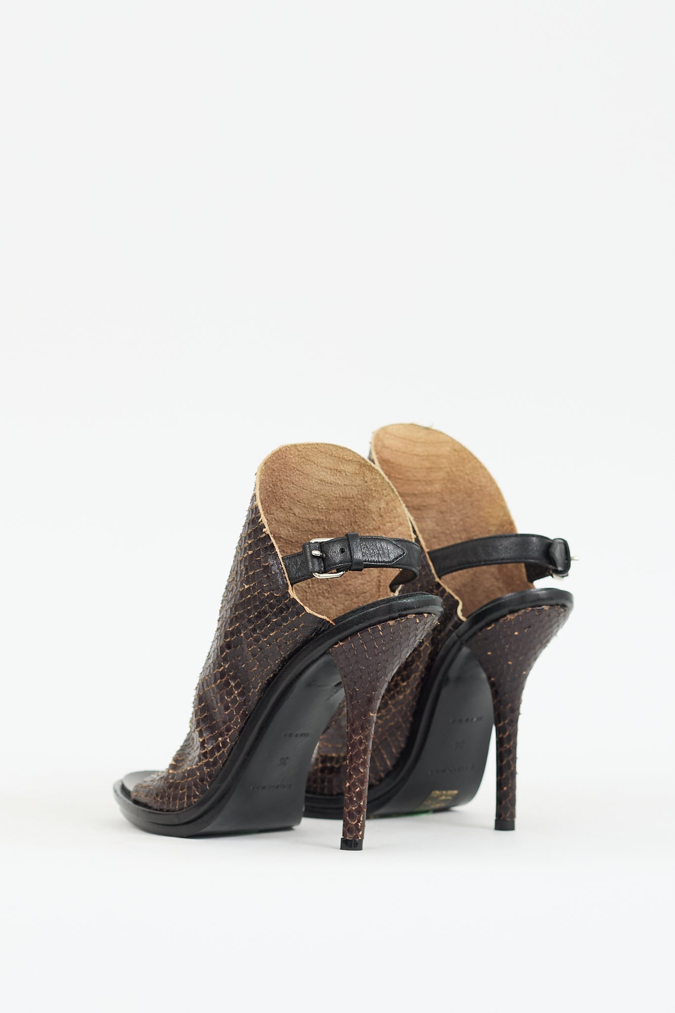 Pre-owned Balenciaga brown heels featuring a rounded peep toe, snakeskin glove upper, adjustable slingback strap, covered continental heel, and leather insole and outsole.