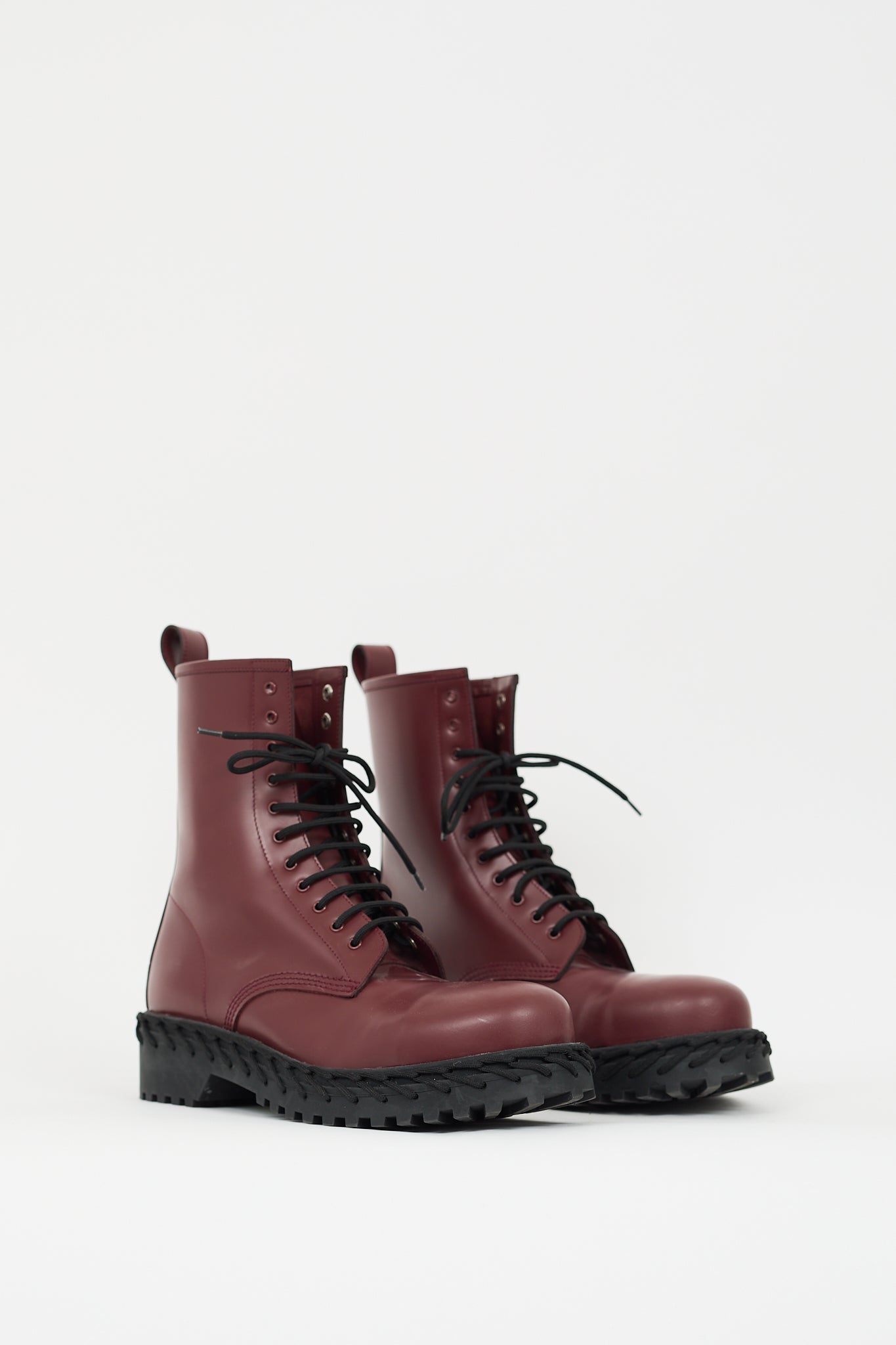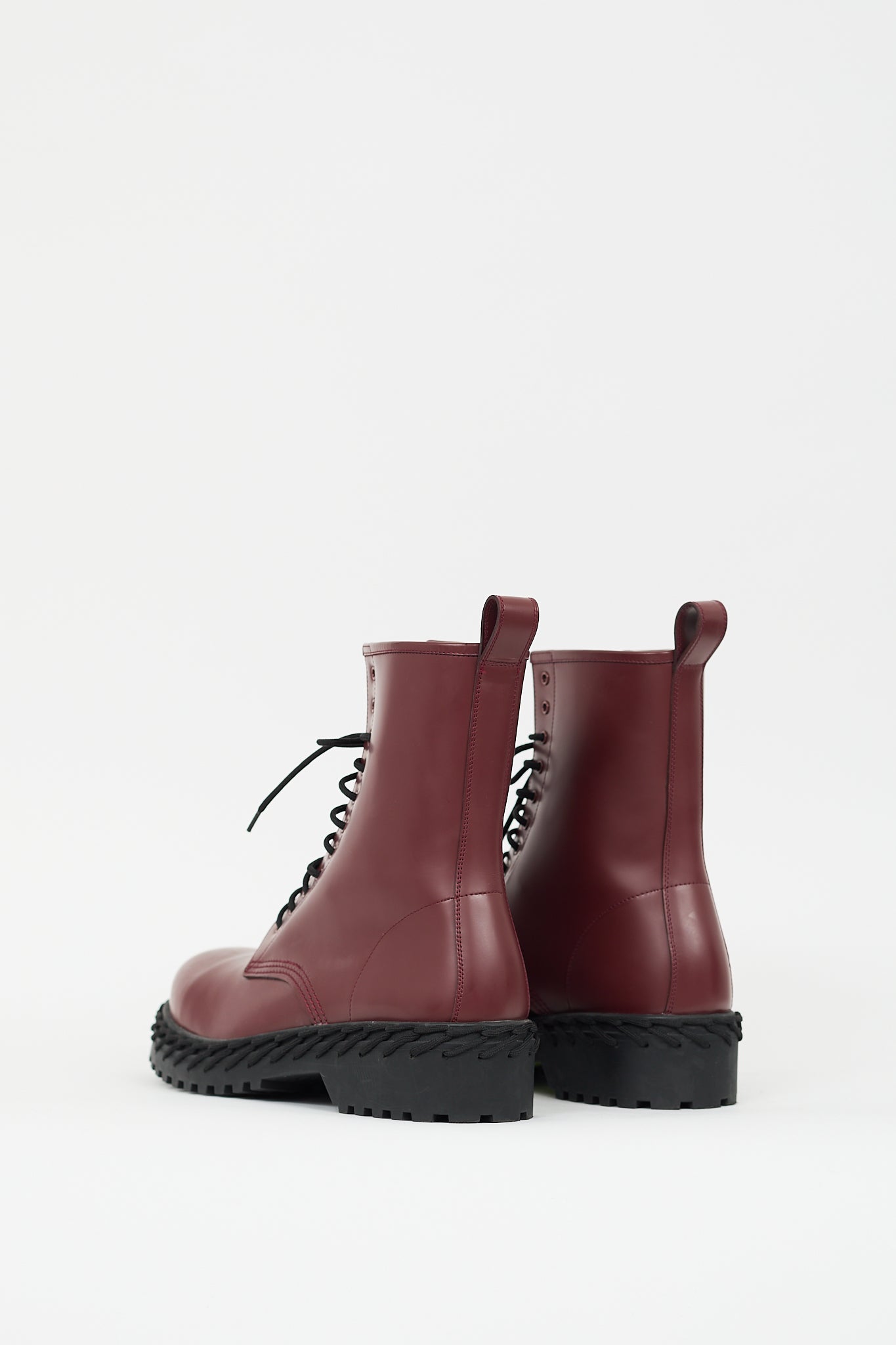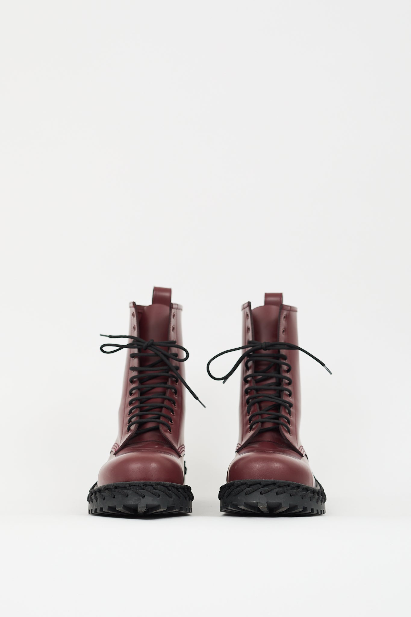 Pre-owned Balenciaga burgundy leather boots featuring rounded toe, lace up front, pull tab at back, lug sole, and woven cord at midsole.