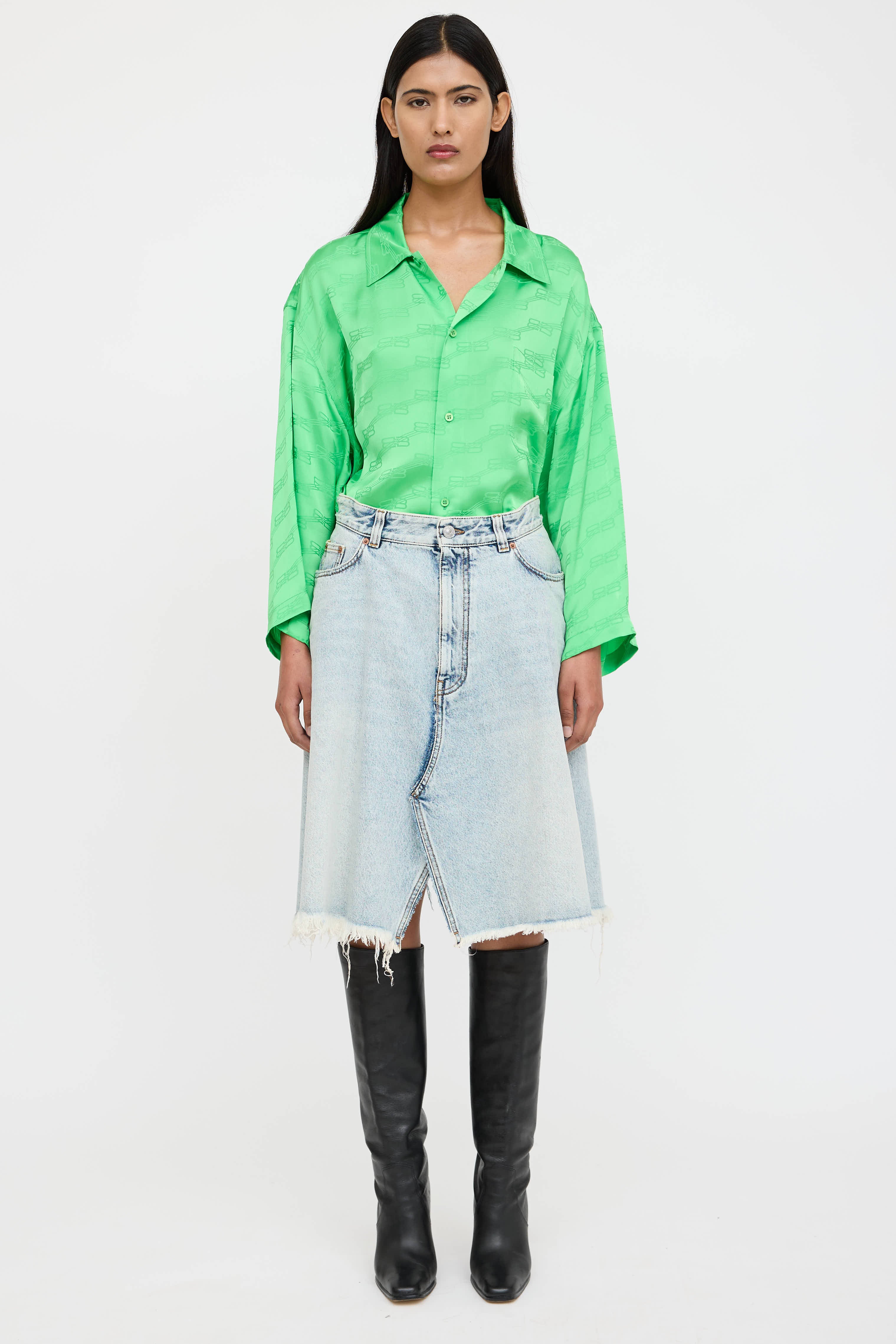 Balenciaga light wash denim skirt featuring five pocket styling, logo patch at waist, slit at front, fringe hem, distressed detailing throughout, and zip fly with button closure.