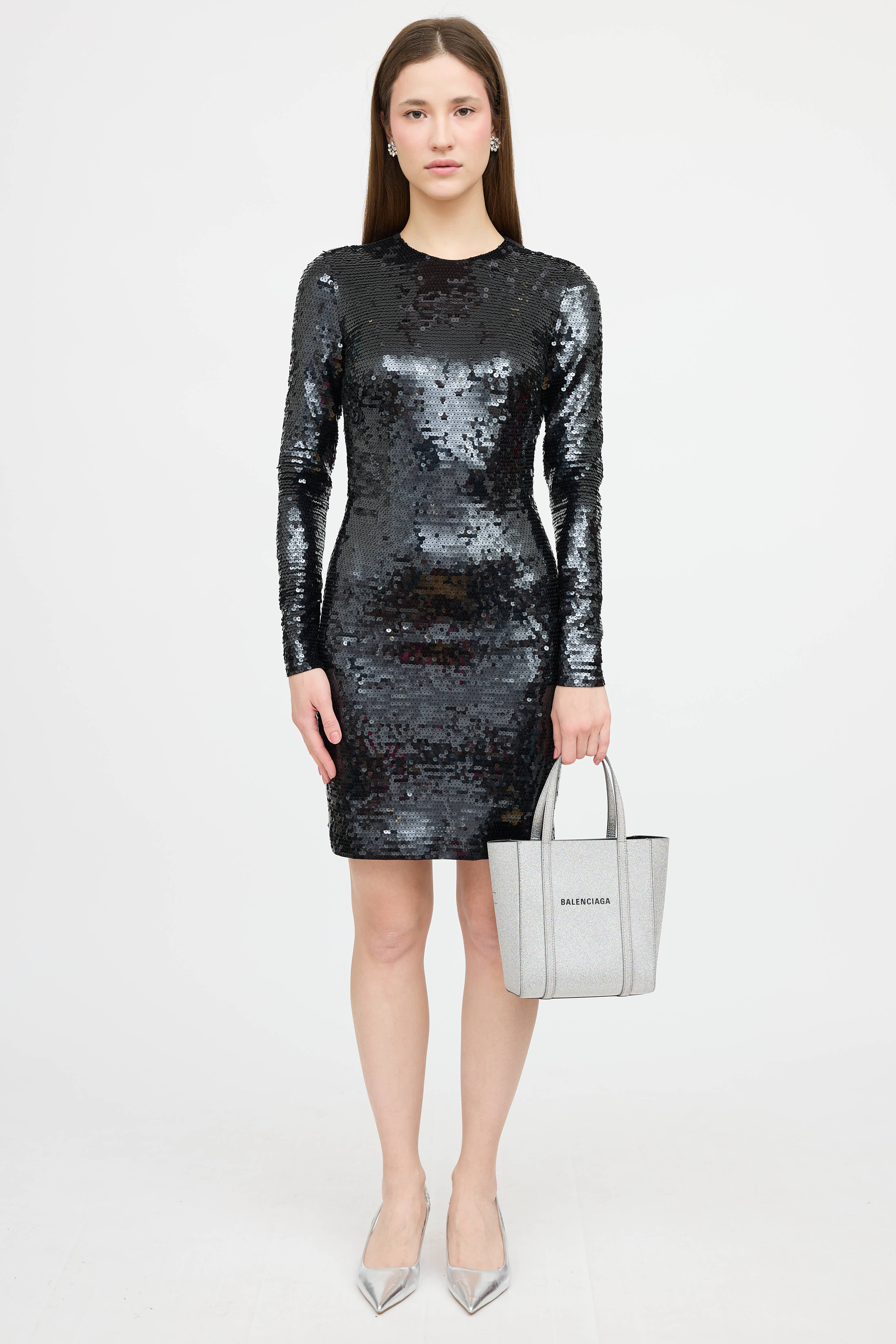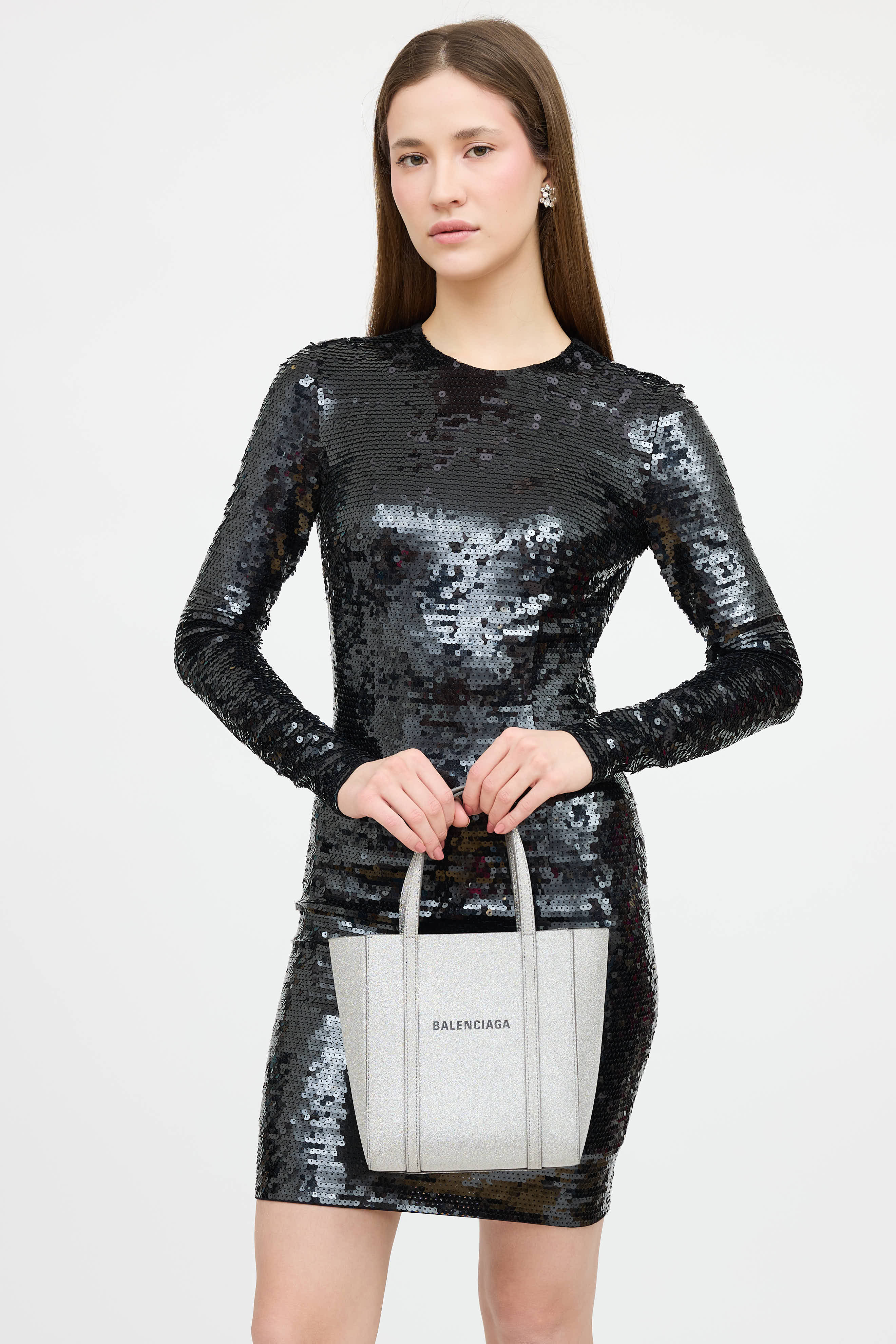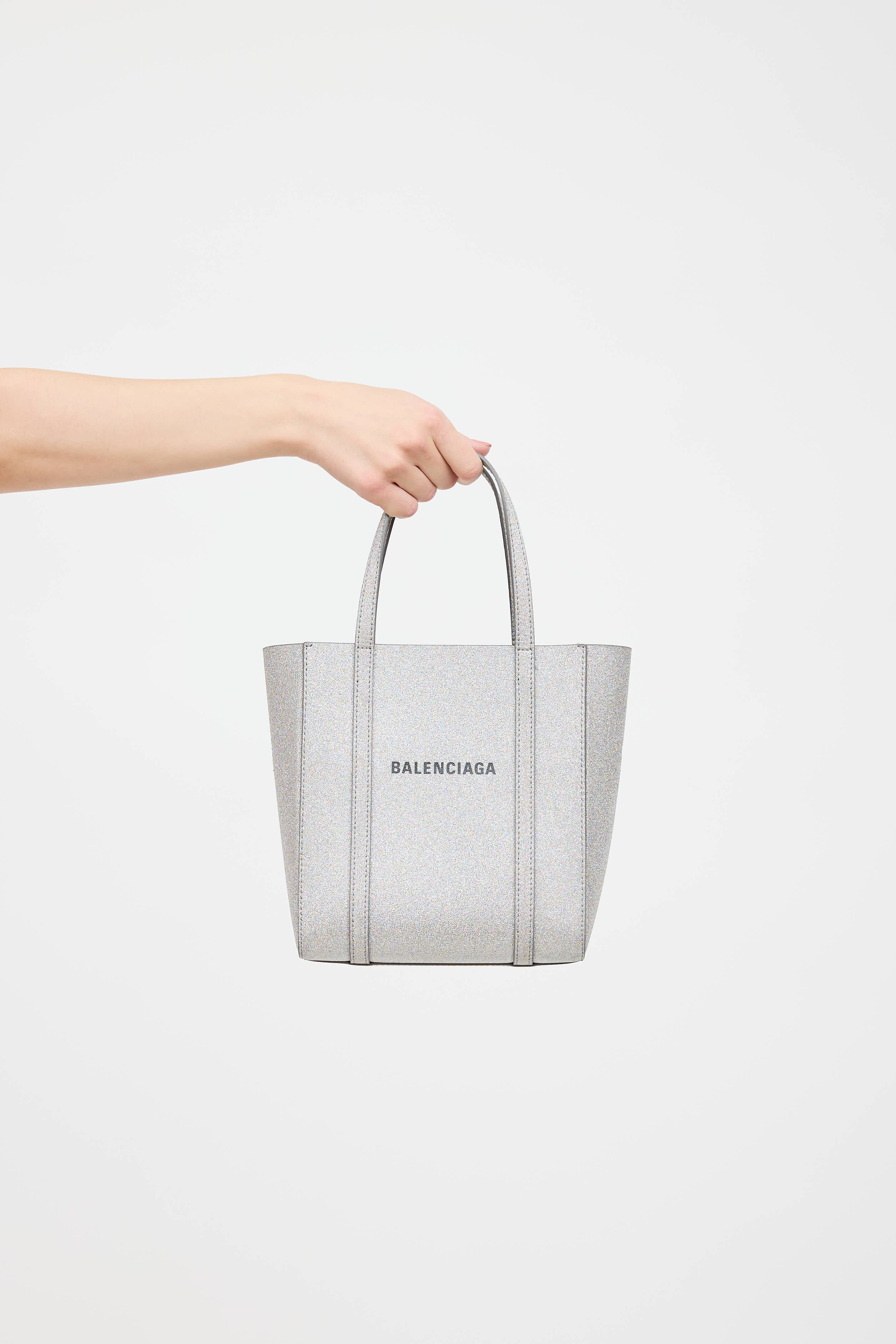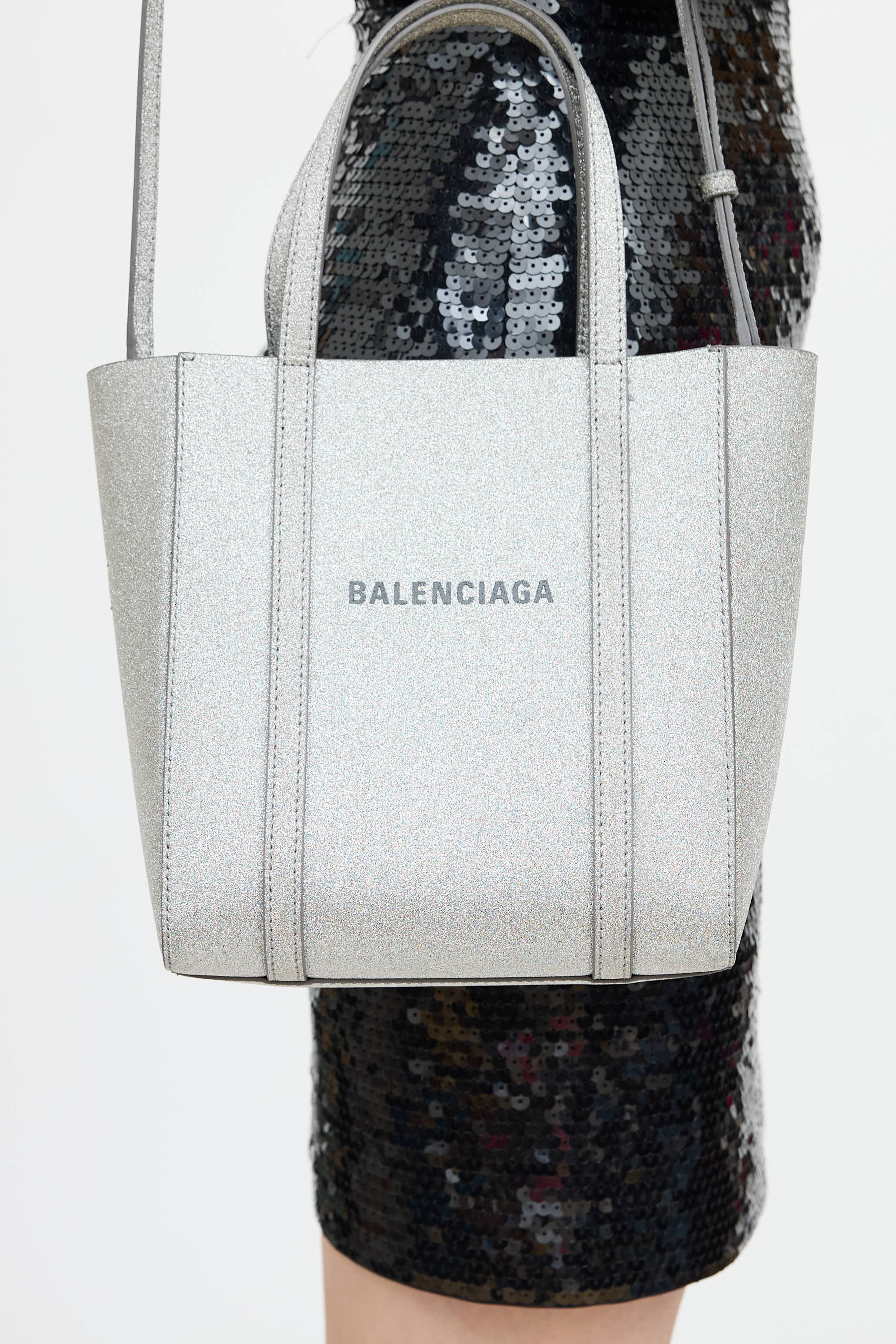 Pre-owned Balenciaga silver Everyday glitter tote featuring a black logo print at front, two top handles, one main compartment with one zip pocket, and removable shoulder strap. Includes original dust bag.