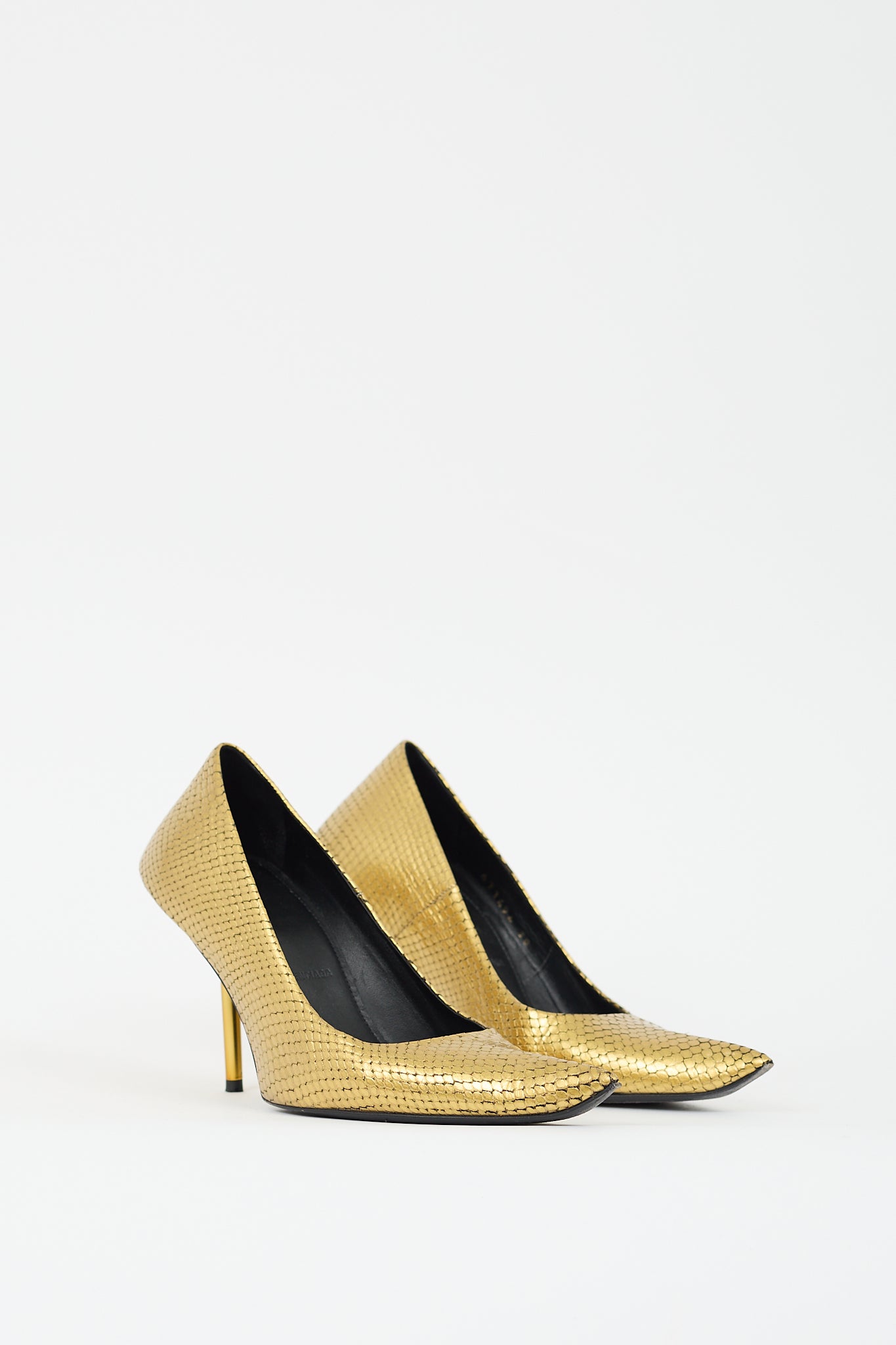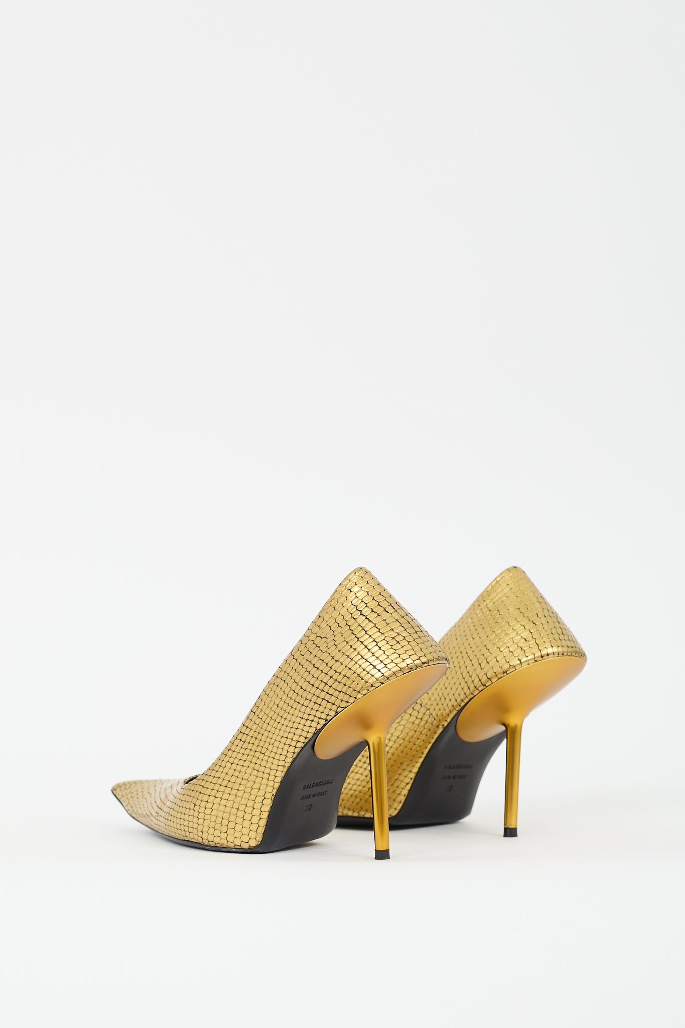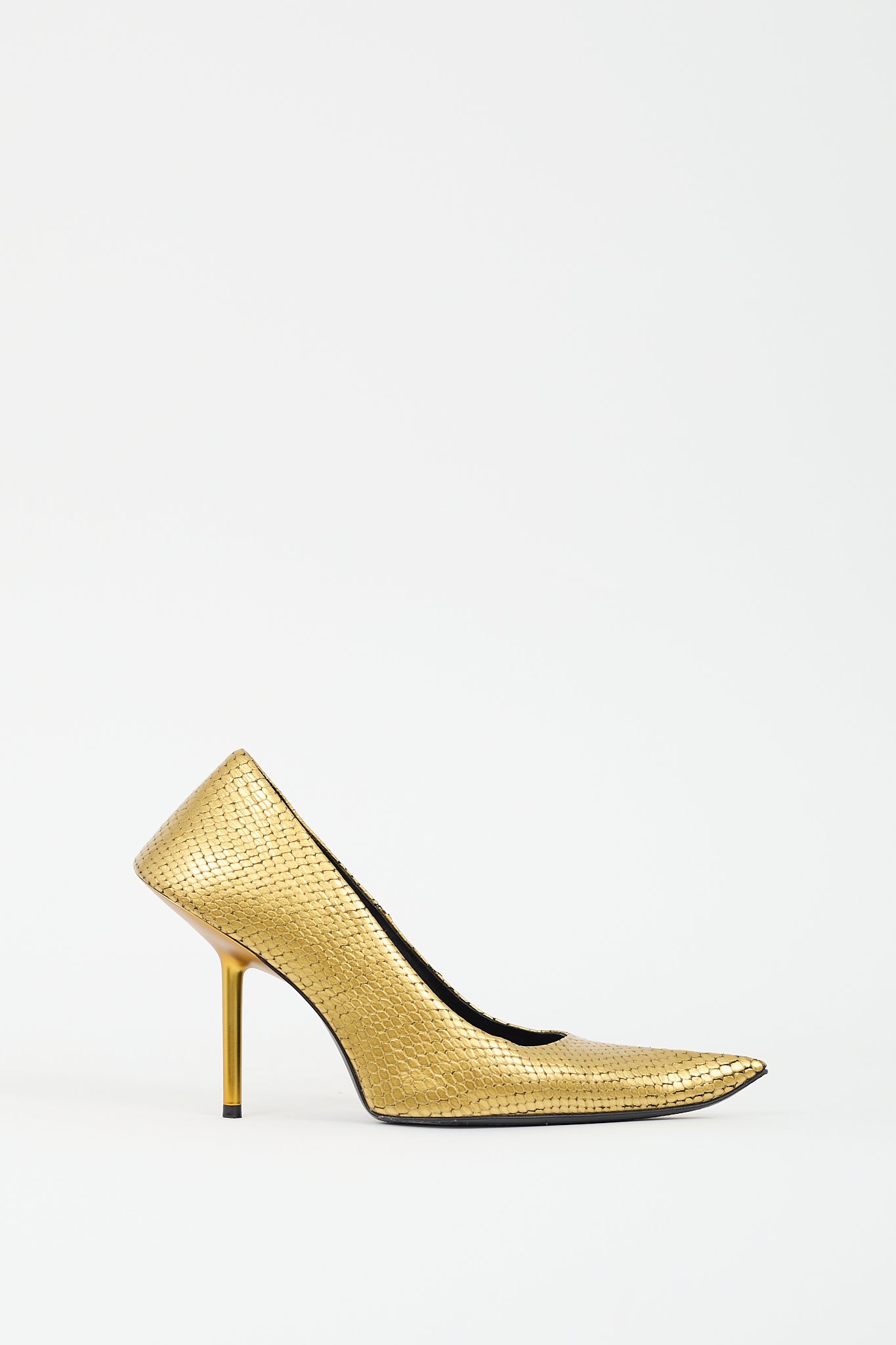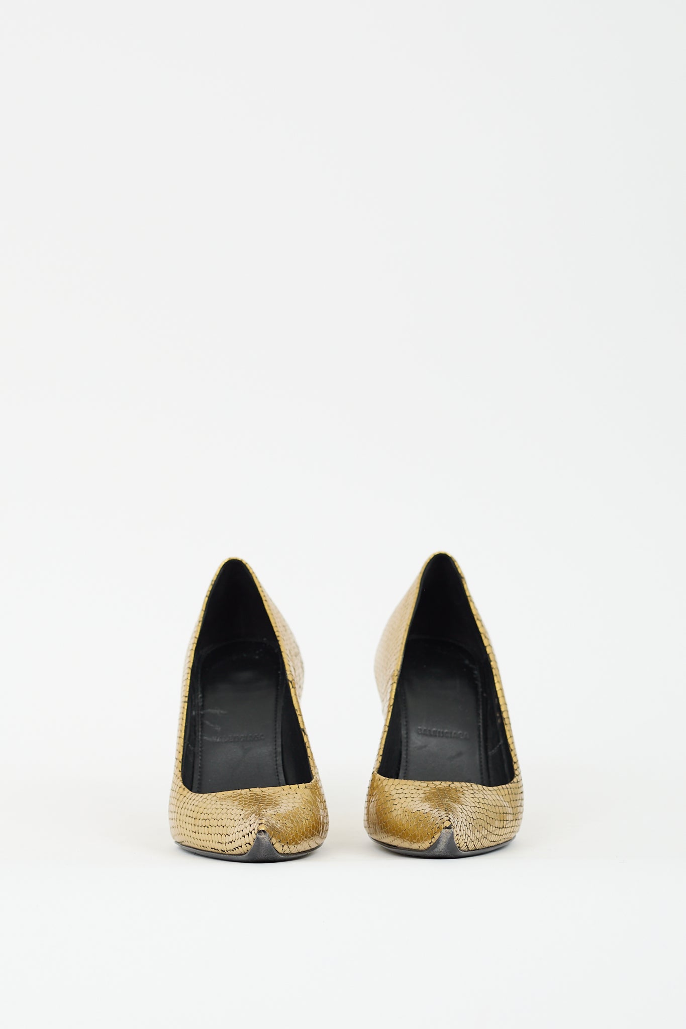 Pre-owned Balenciaga gold tone Essex pumps featuring a pointed toe, sculptural design with exaggerated counter, textured metallic leather upper, and metal pin heel. Comes with original box and dust bags.
