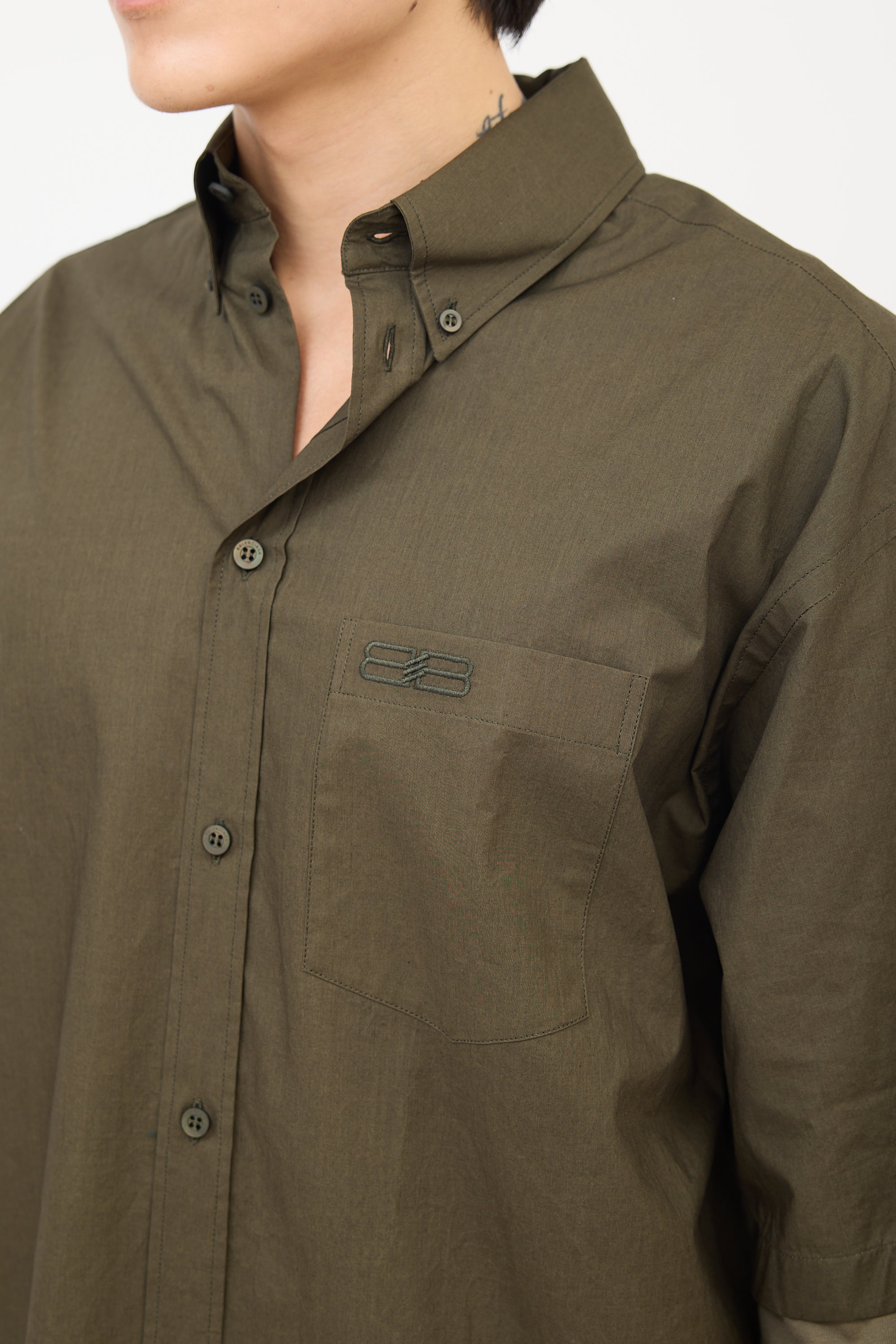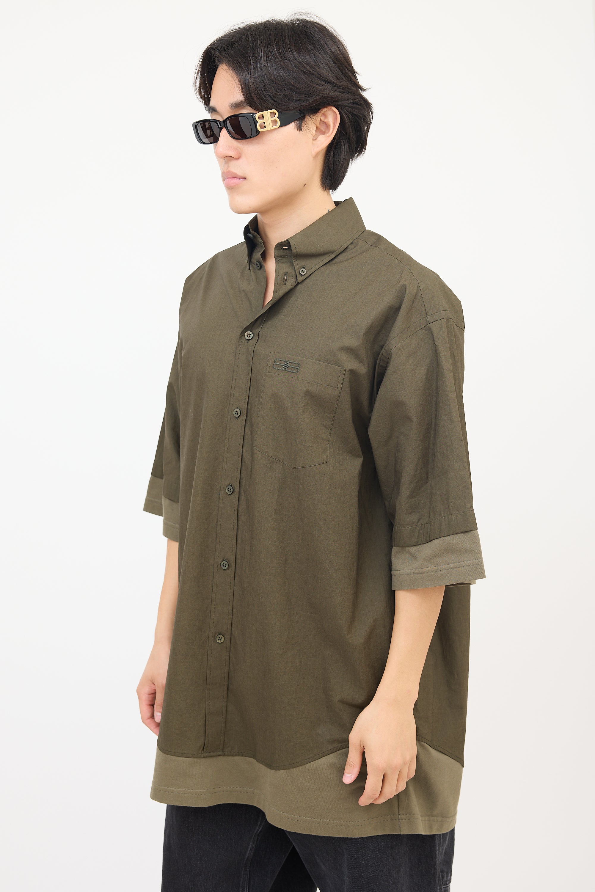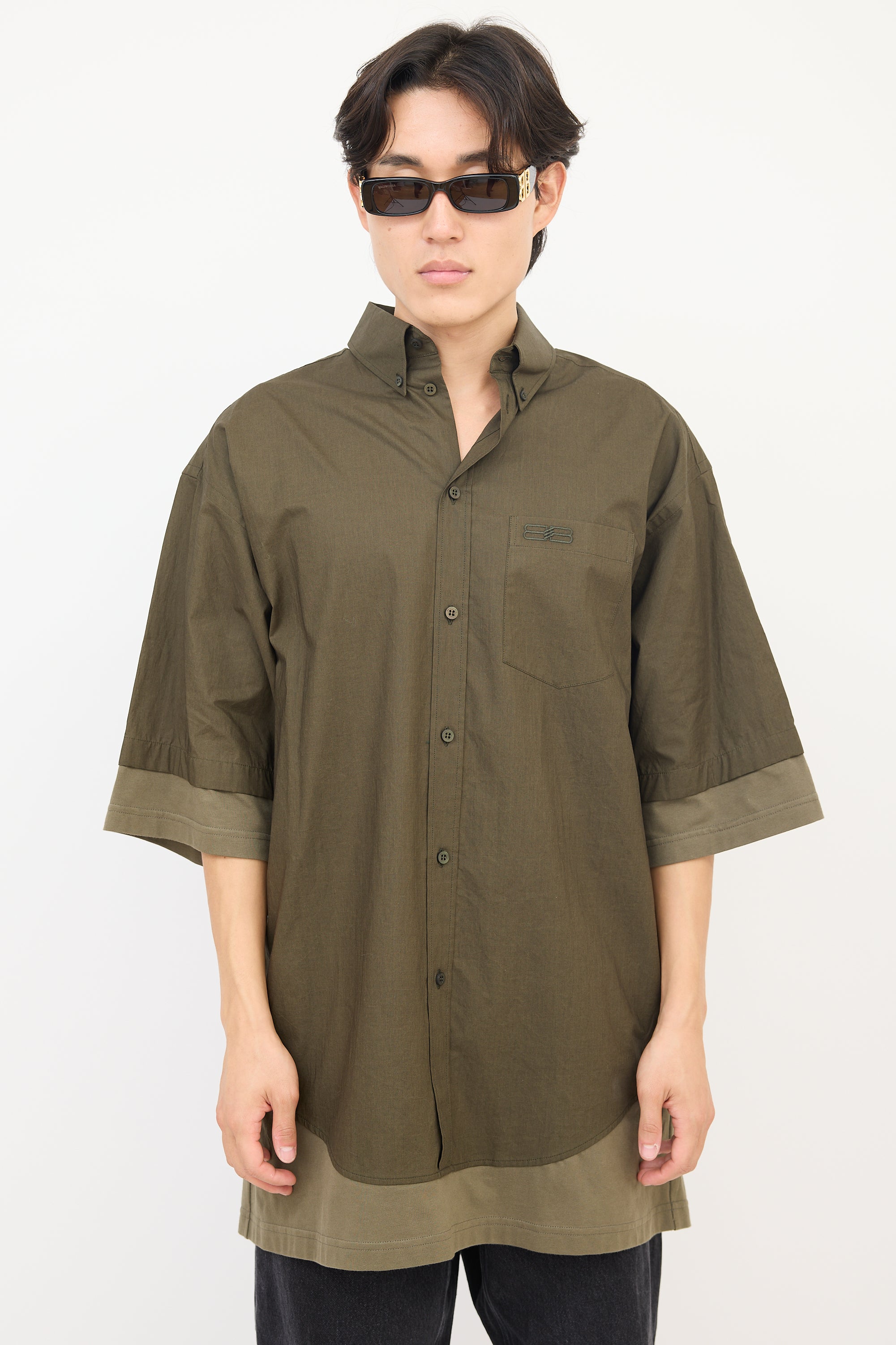 Pre-owned Balenciaga green cotton long shirt featuring a buttoned collar, button up front, single patch pocket with embroidered BB logo at left chest, pleated back yoke, short sleeves, and faux layer design at hem and cuffs.
