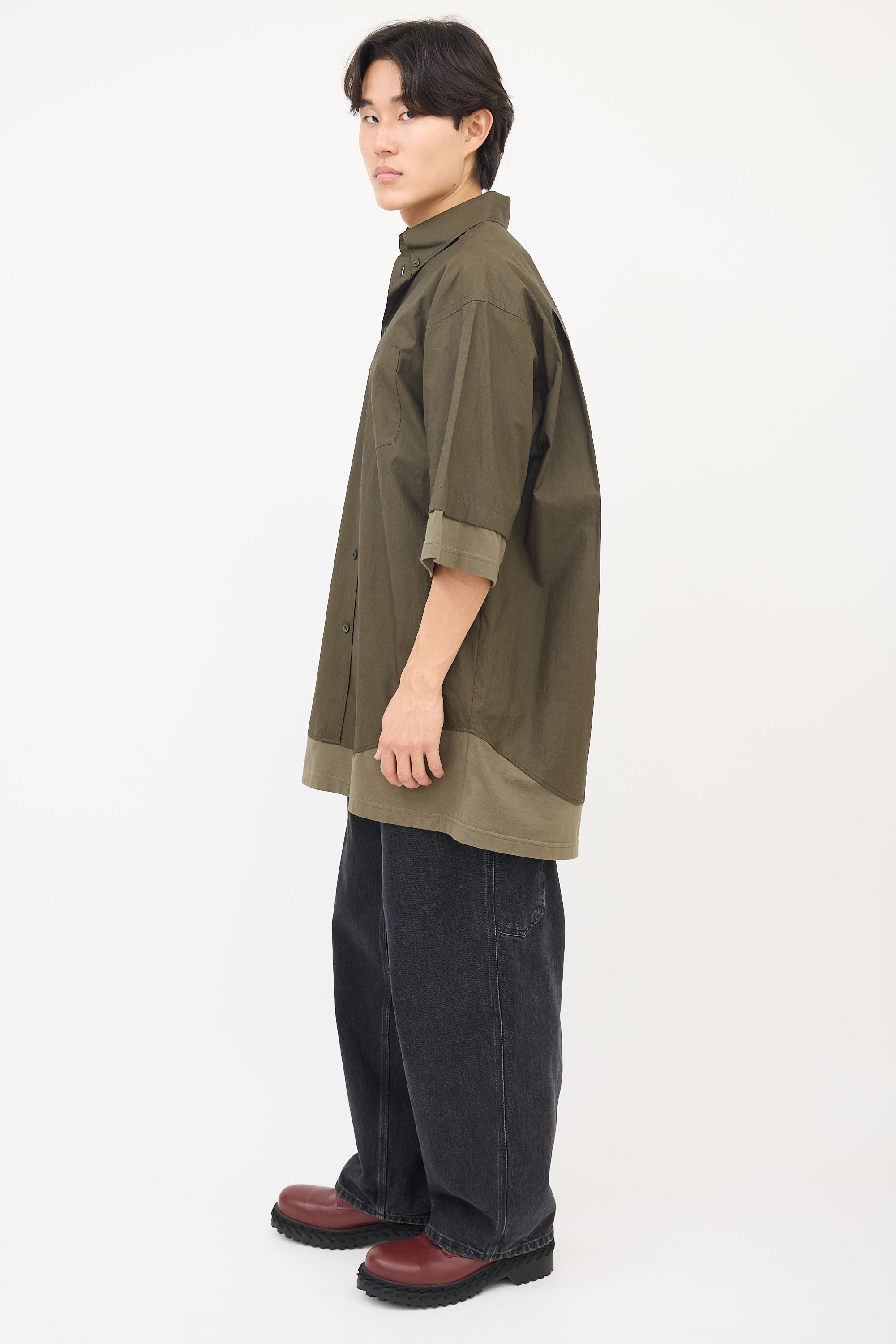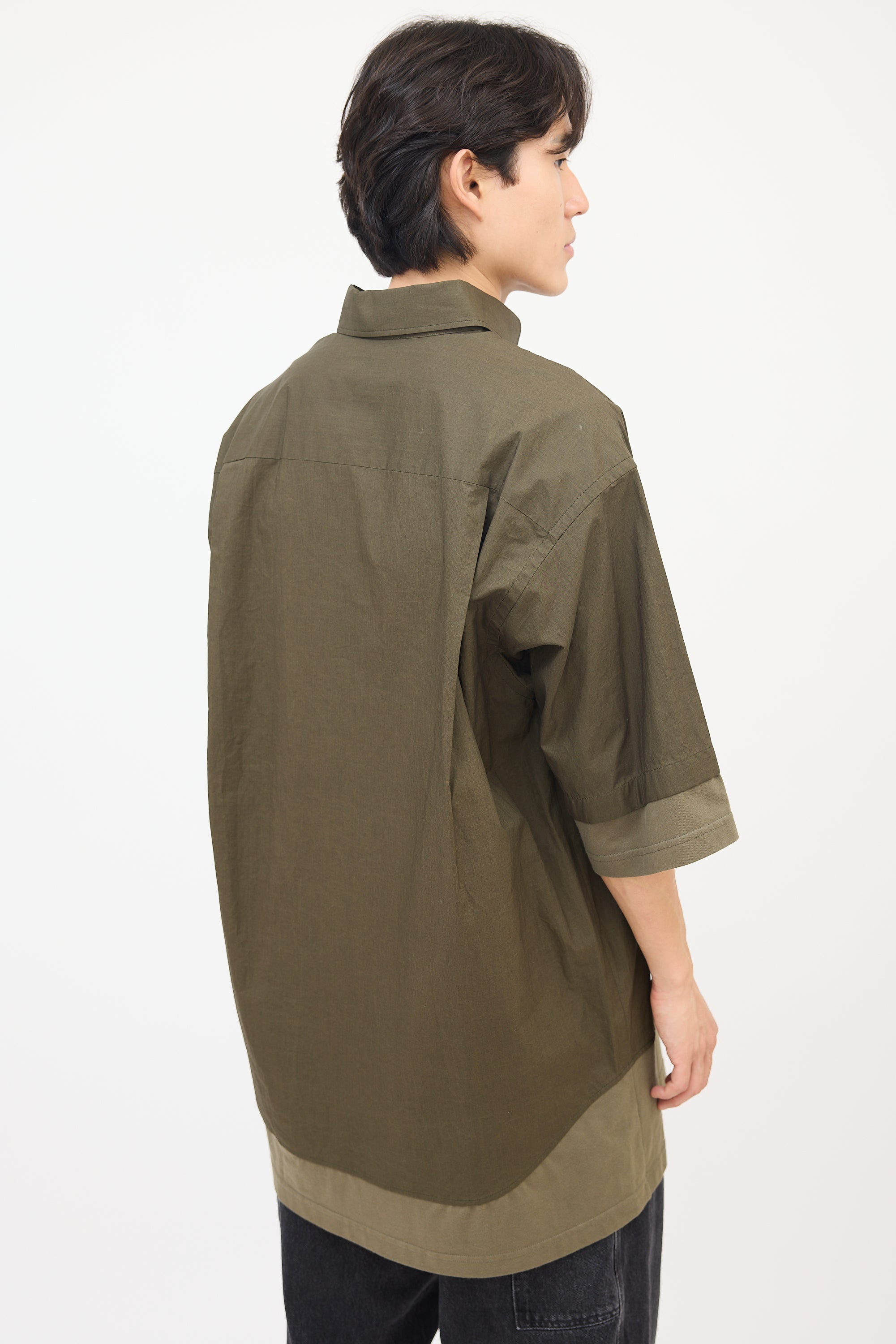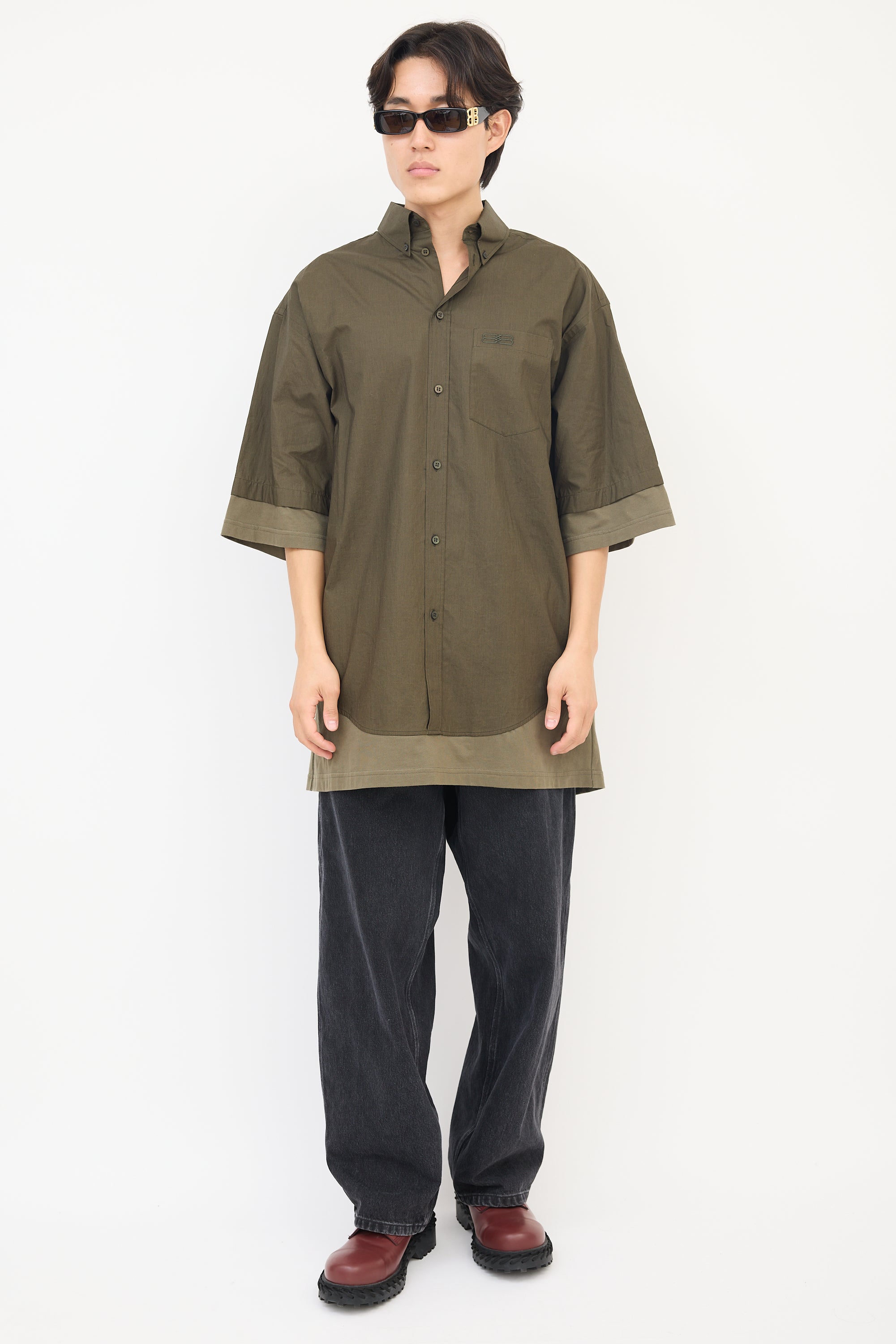 Pre-owned Balenciaga green cotton long shirt featuring a buttoned collar, button up front, single patch pocket with embroidered BB logo at left chest, pleated back yoke, short sleeves, and faux layer design at hem and cuffs.