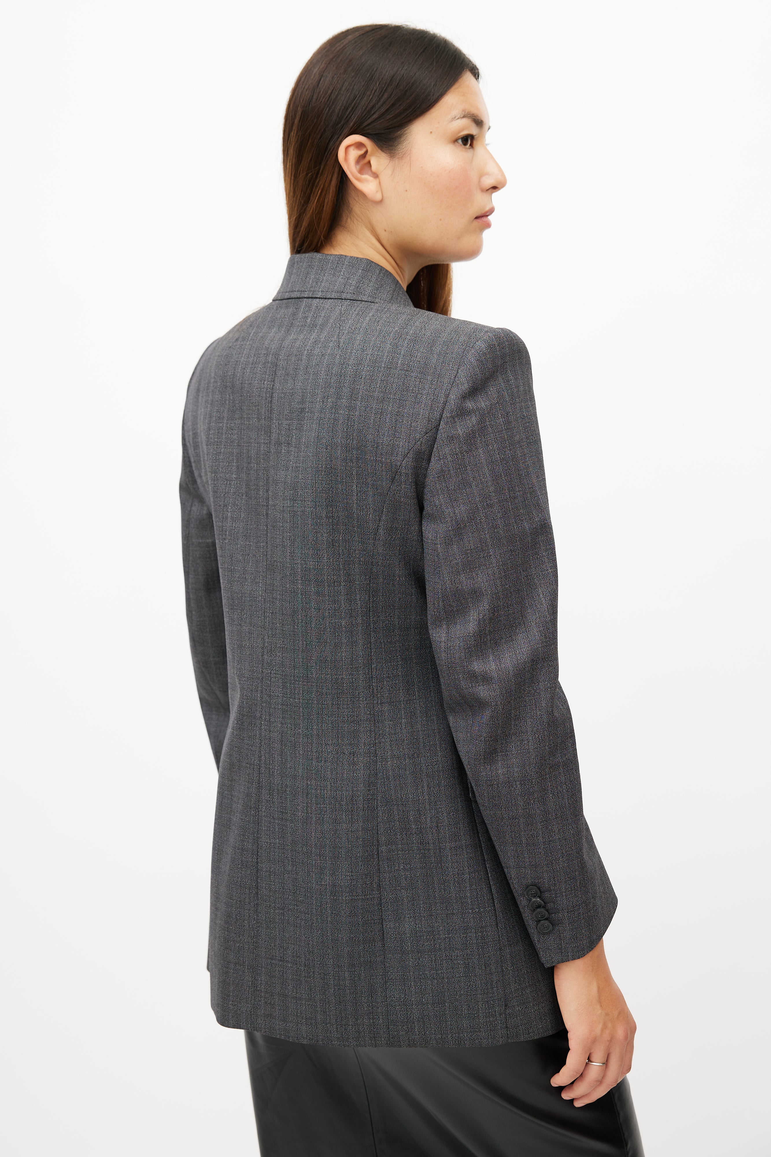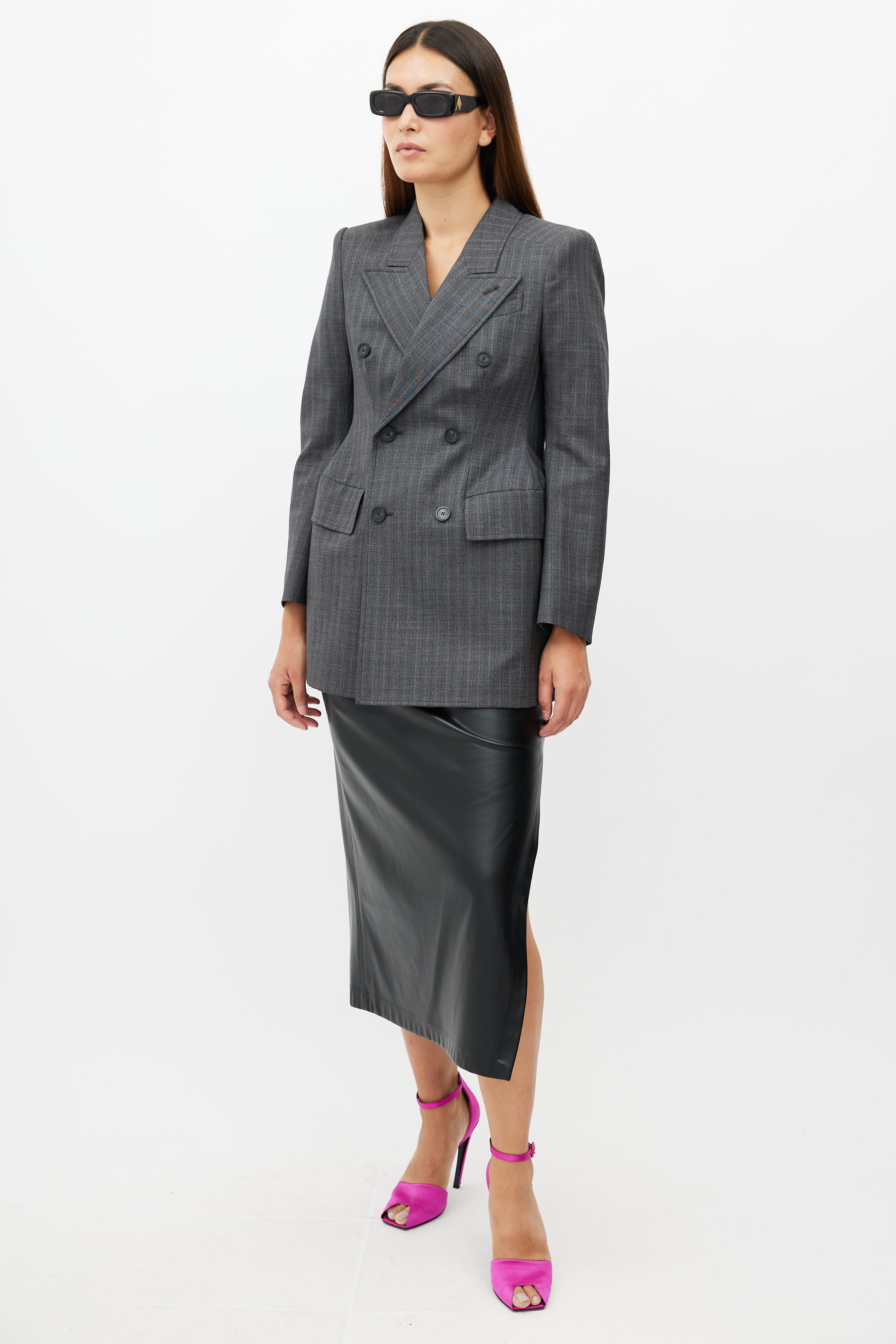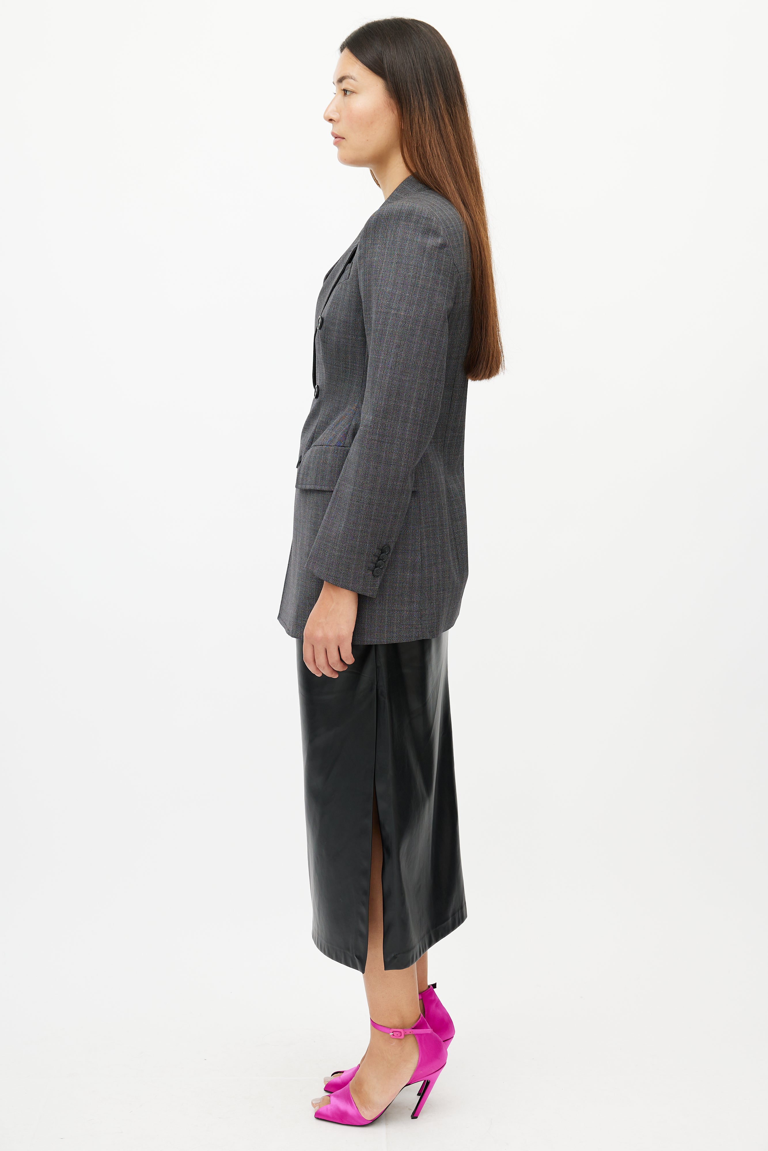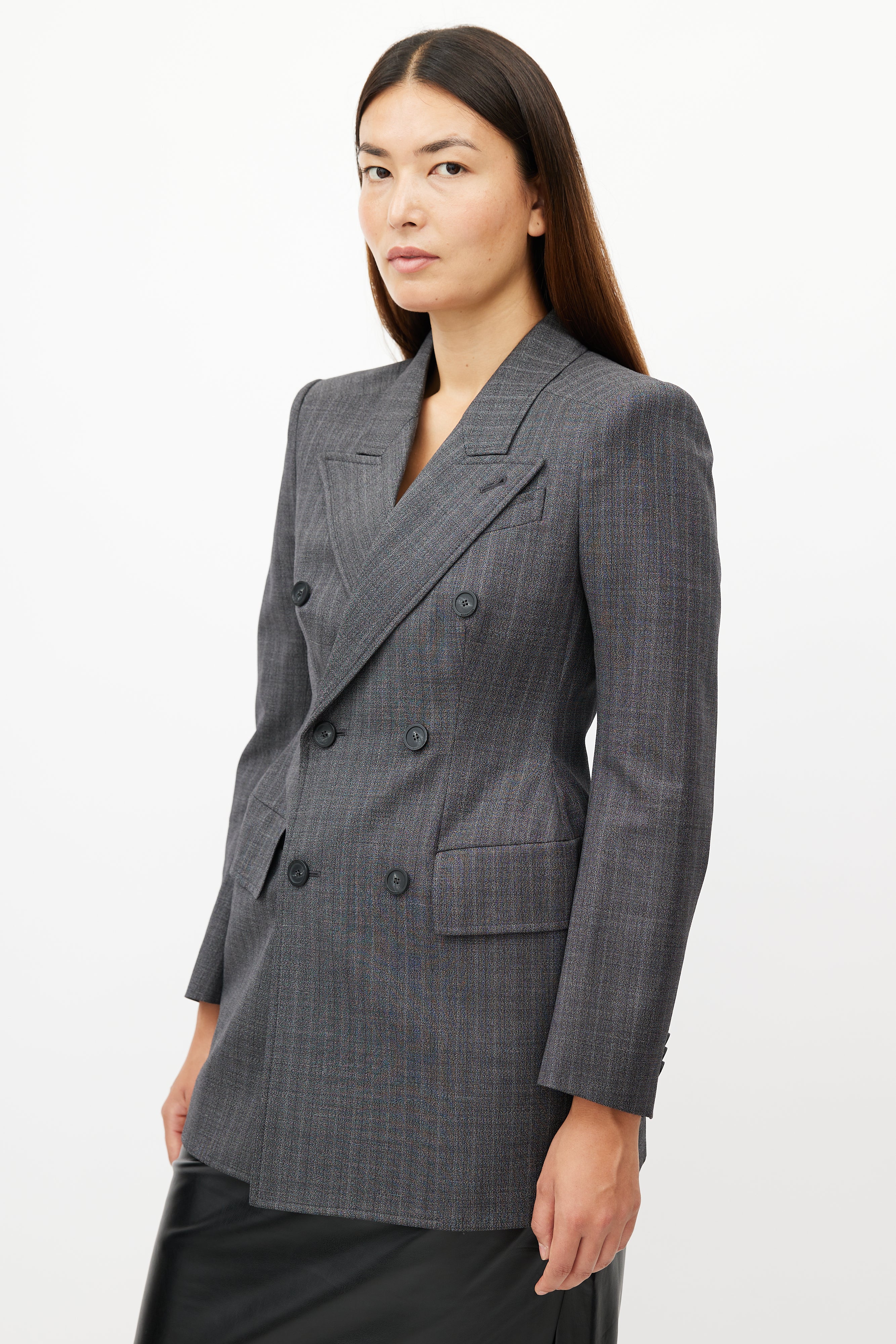 Pre-owned Balenciaga grey wool blazer featuring Prince of Wales check pattern throughout, peak lapel, hourglass silhouette, long sleeves with buttoned cuffs, one welt pocket at chest, two flap pockets at hip, and double breasted button up front. Lined.