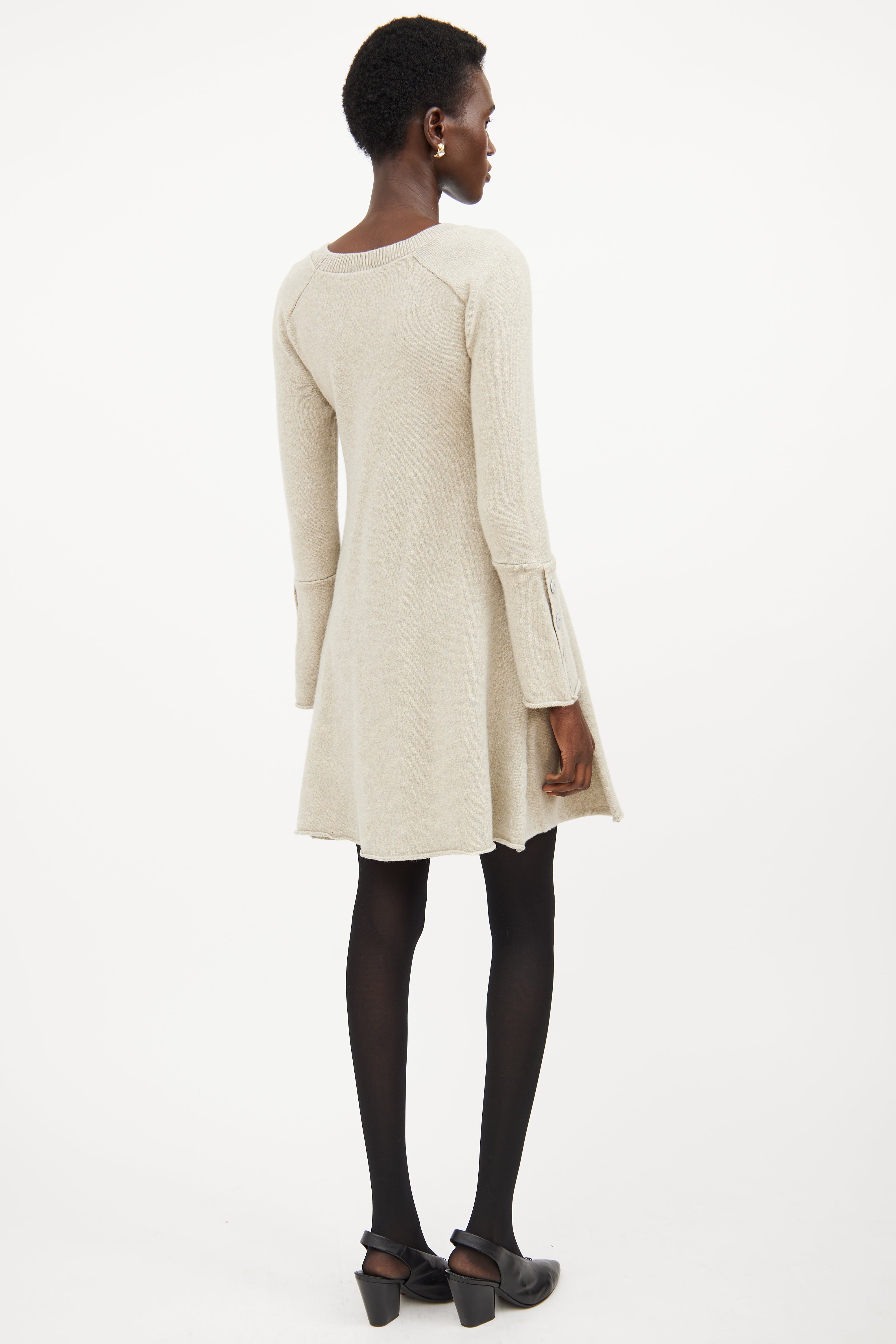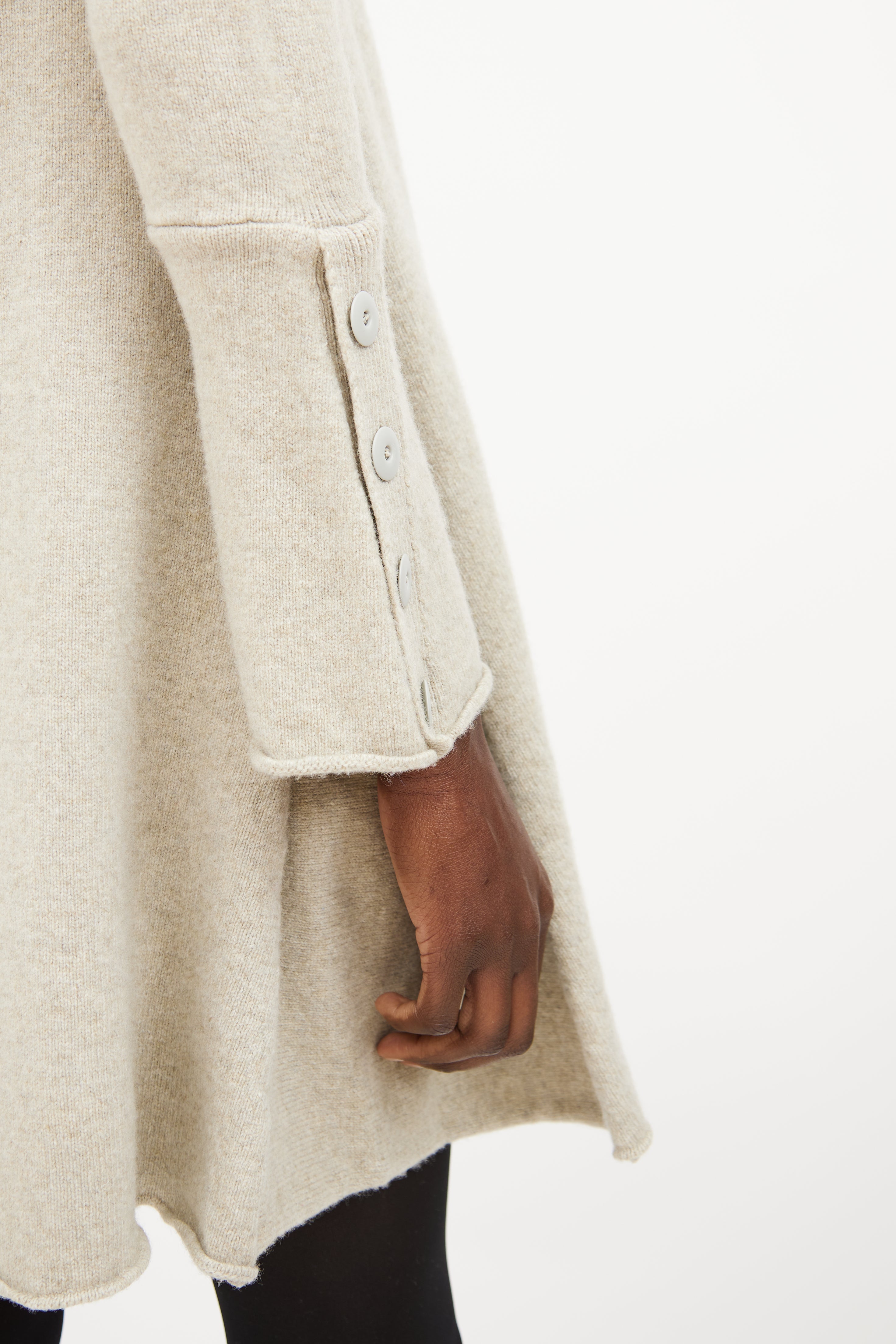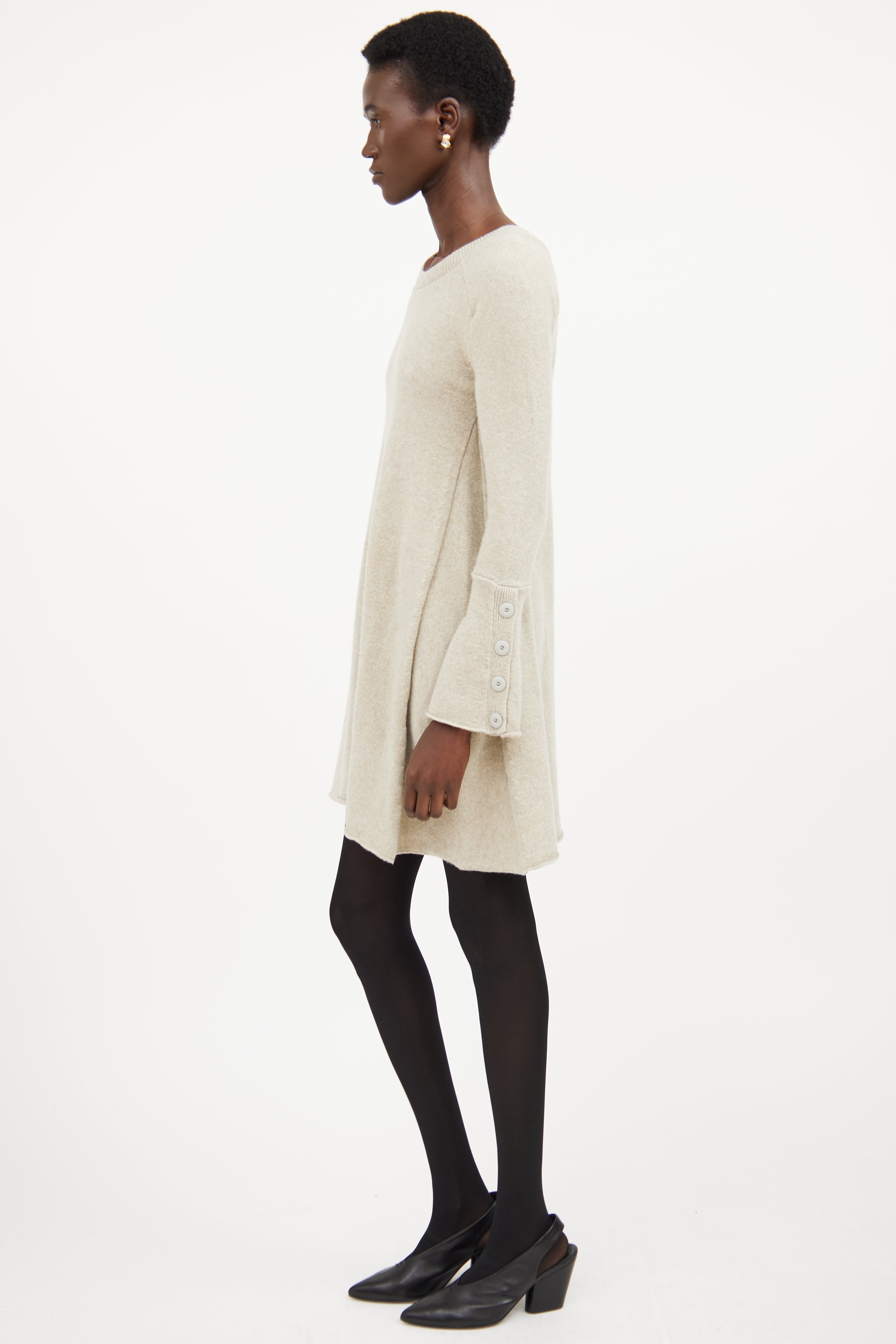 Pre-owned Balenciaga grey wool knit sweater dress featuring a round neckline, long raglan sleeves with flared buttoned cuffs, and panelled seams at sides.