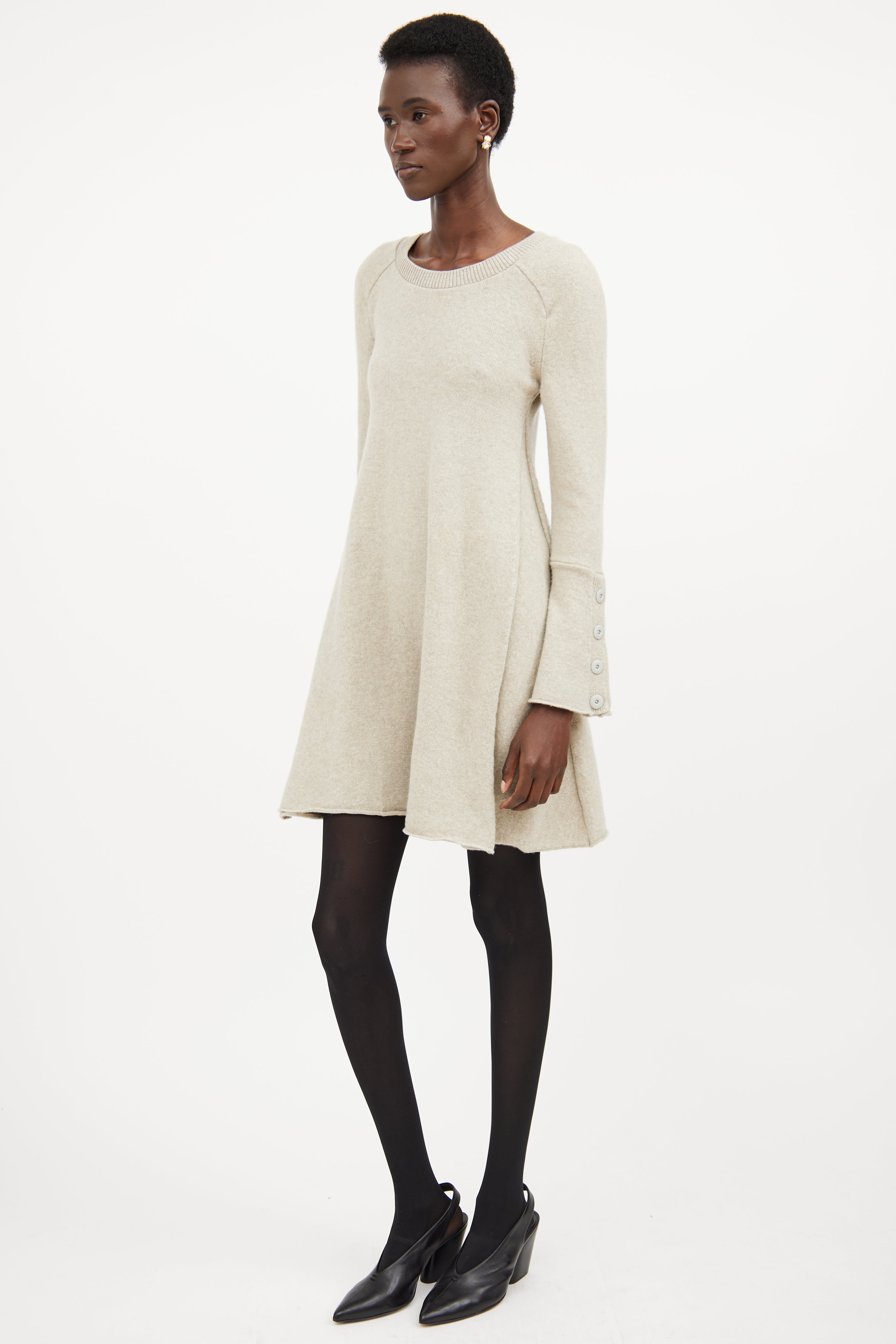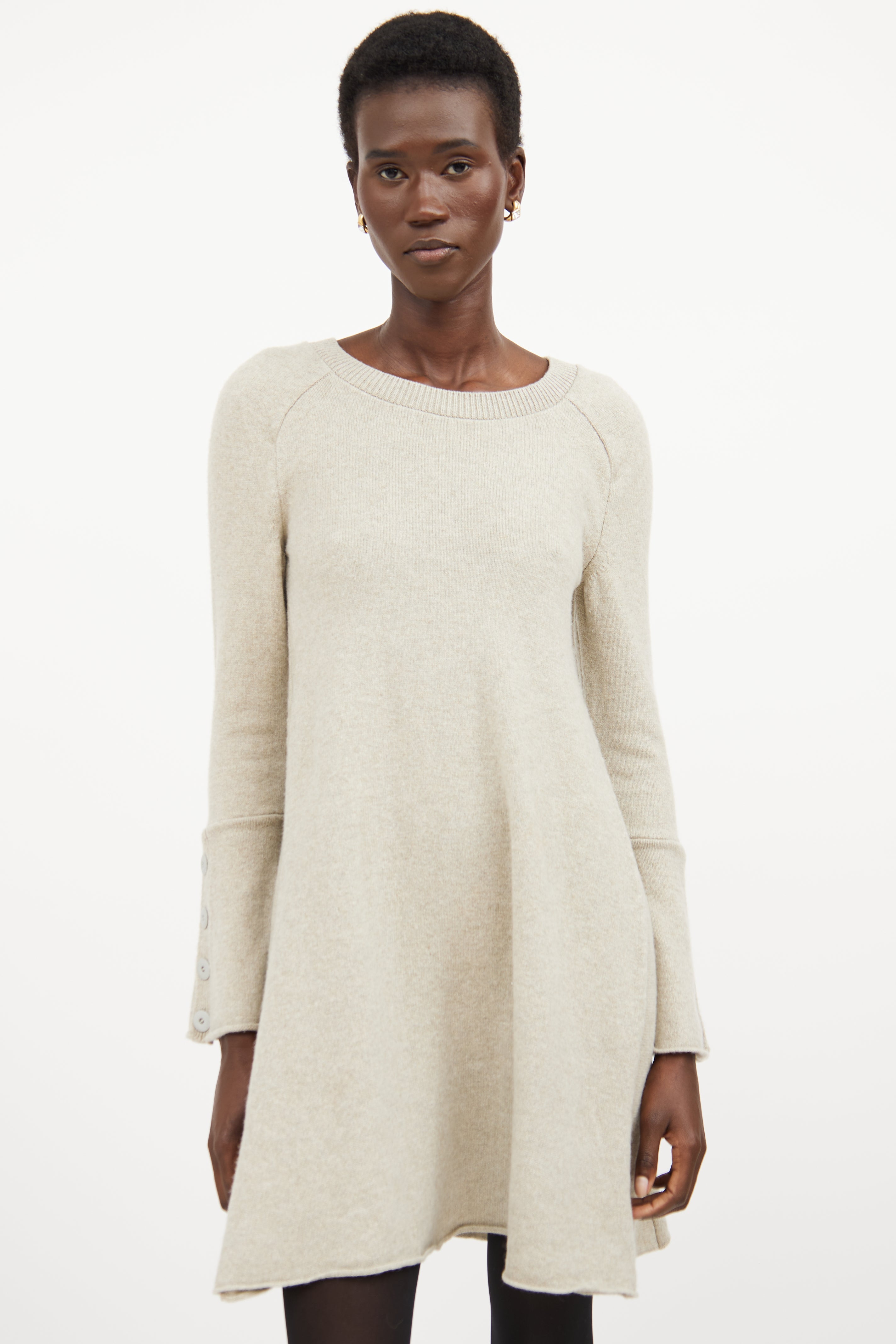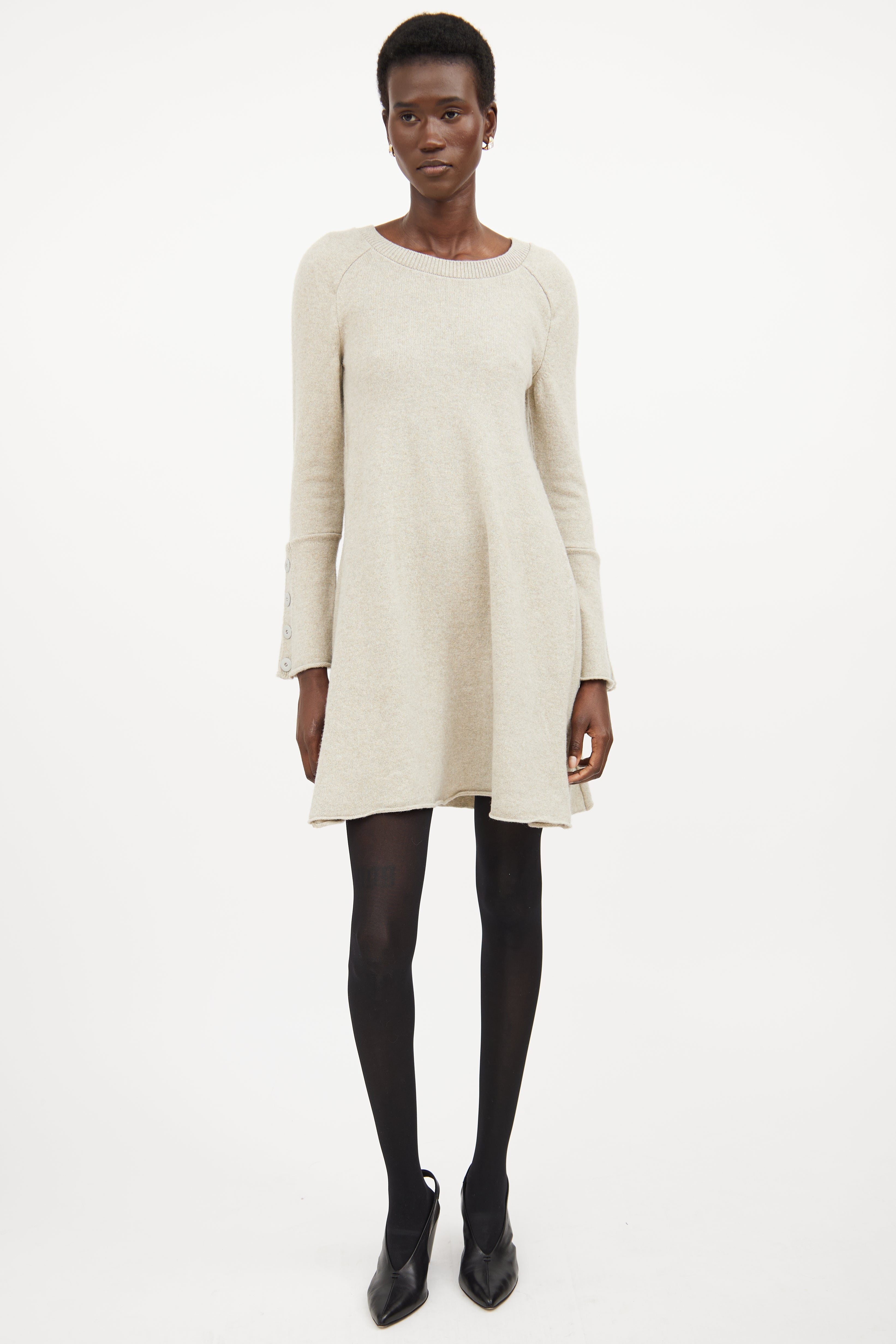 Pre-owned Balenciaga grey wool knit sweater dress featuring a round neckline, long raglan sleeves with flared buttoned cuffs, and panelled seams at sides.