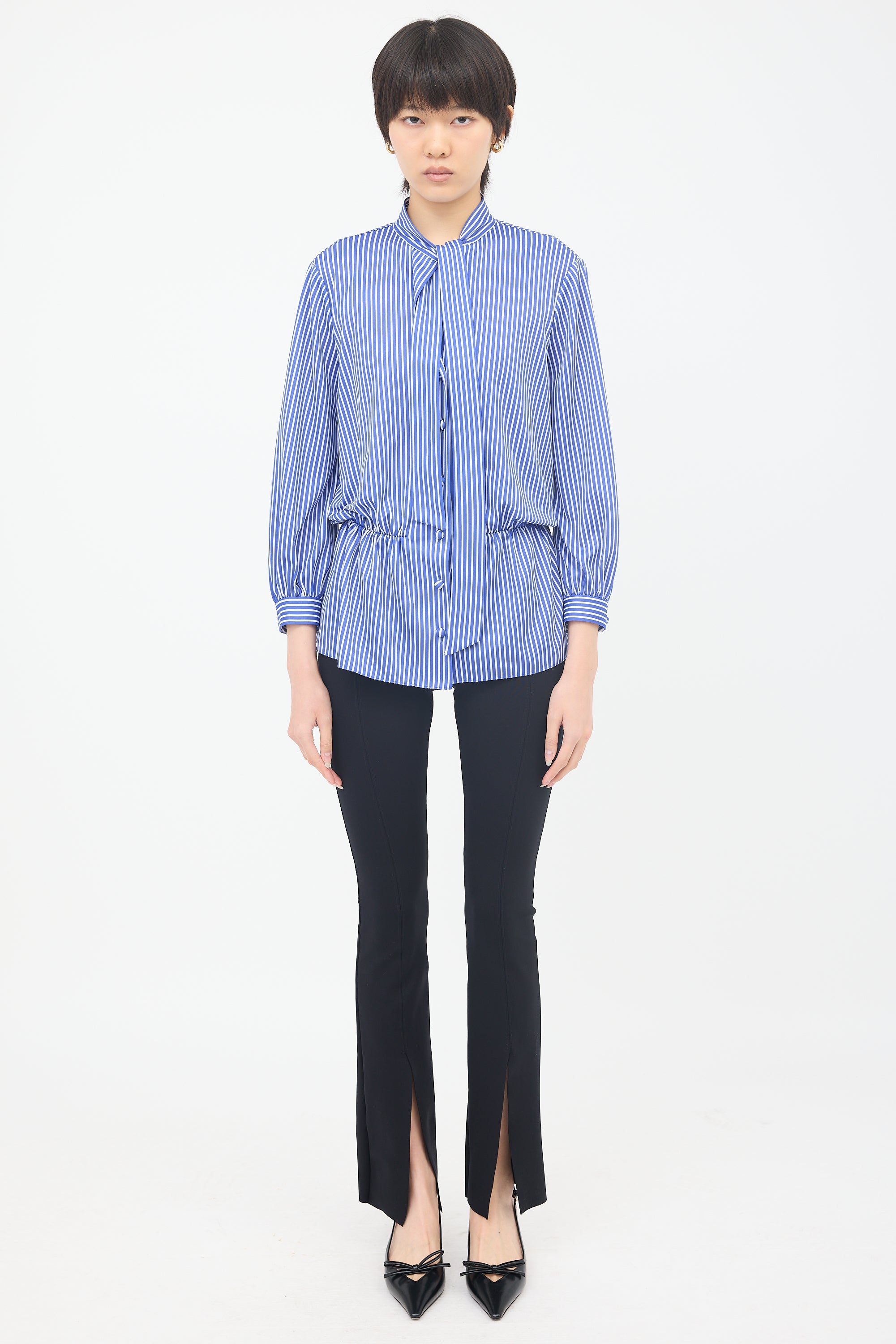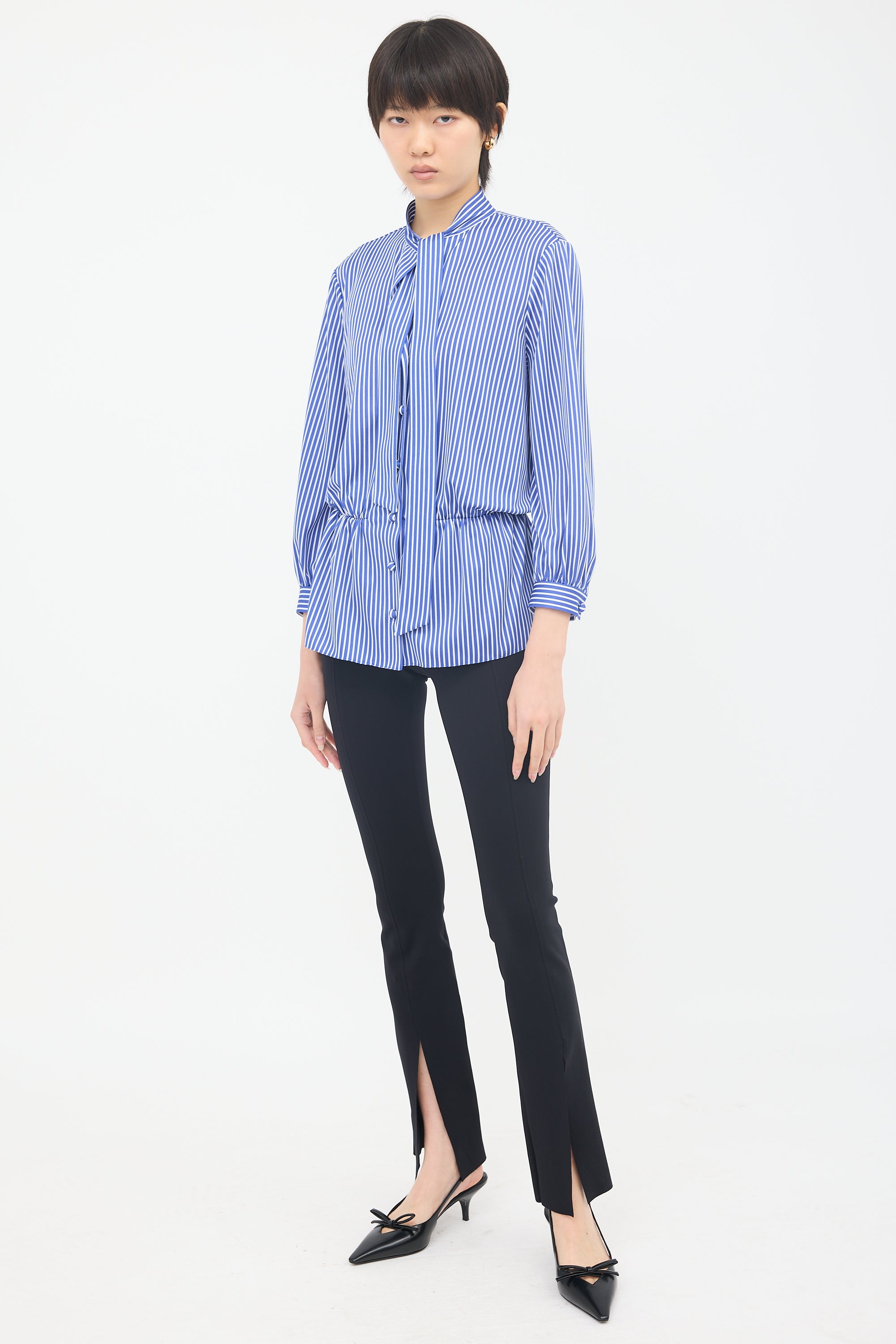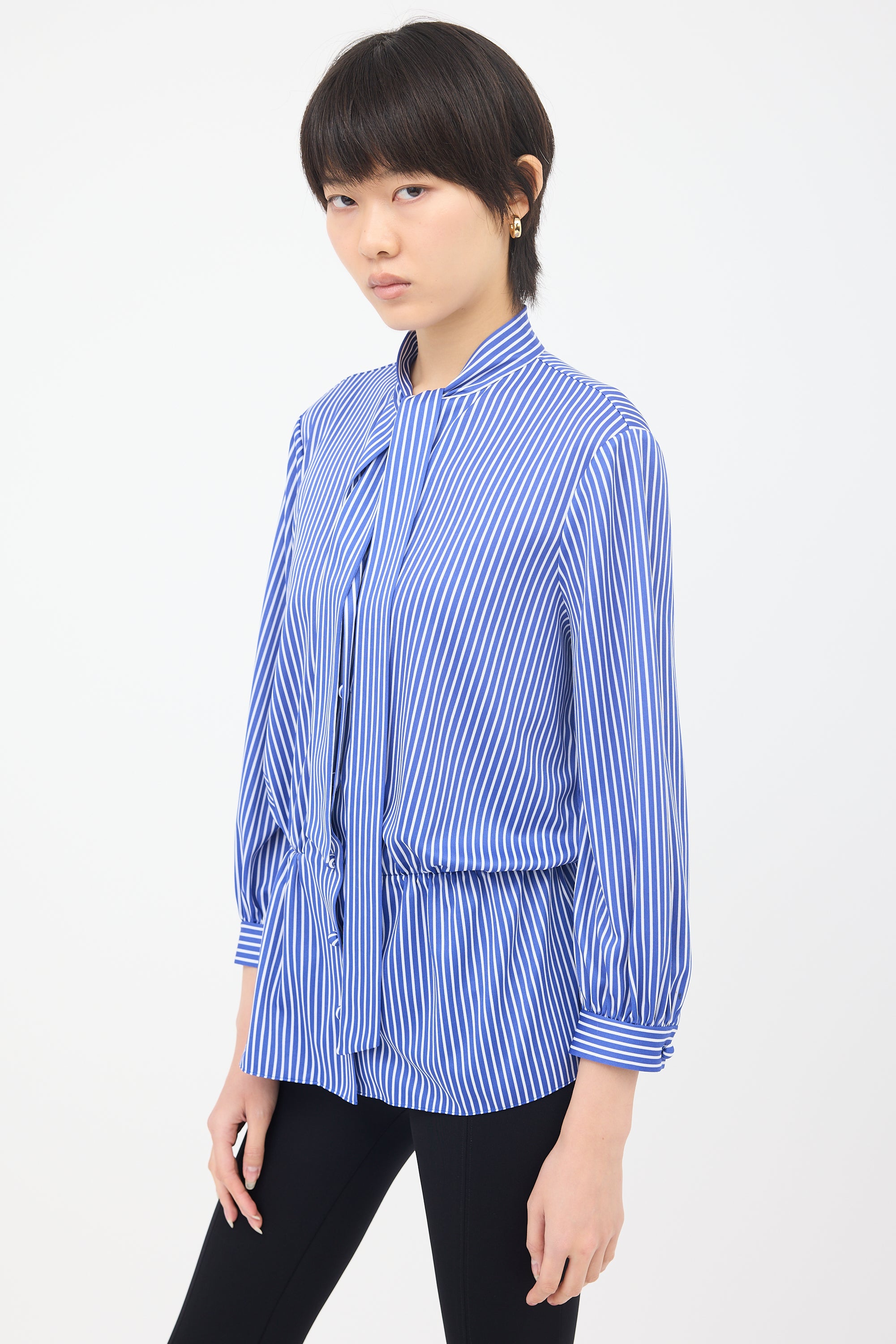 Pre-owned Balenciaga blue knit blouse featuring a white pinstripe pattern, tie collar, button front, and ruched elasticized waist.