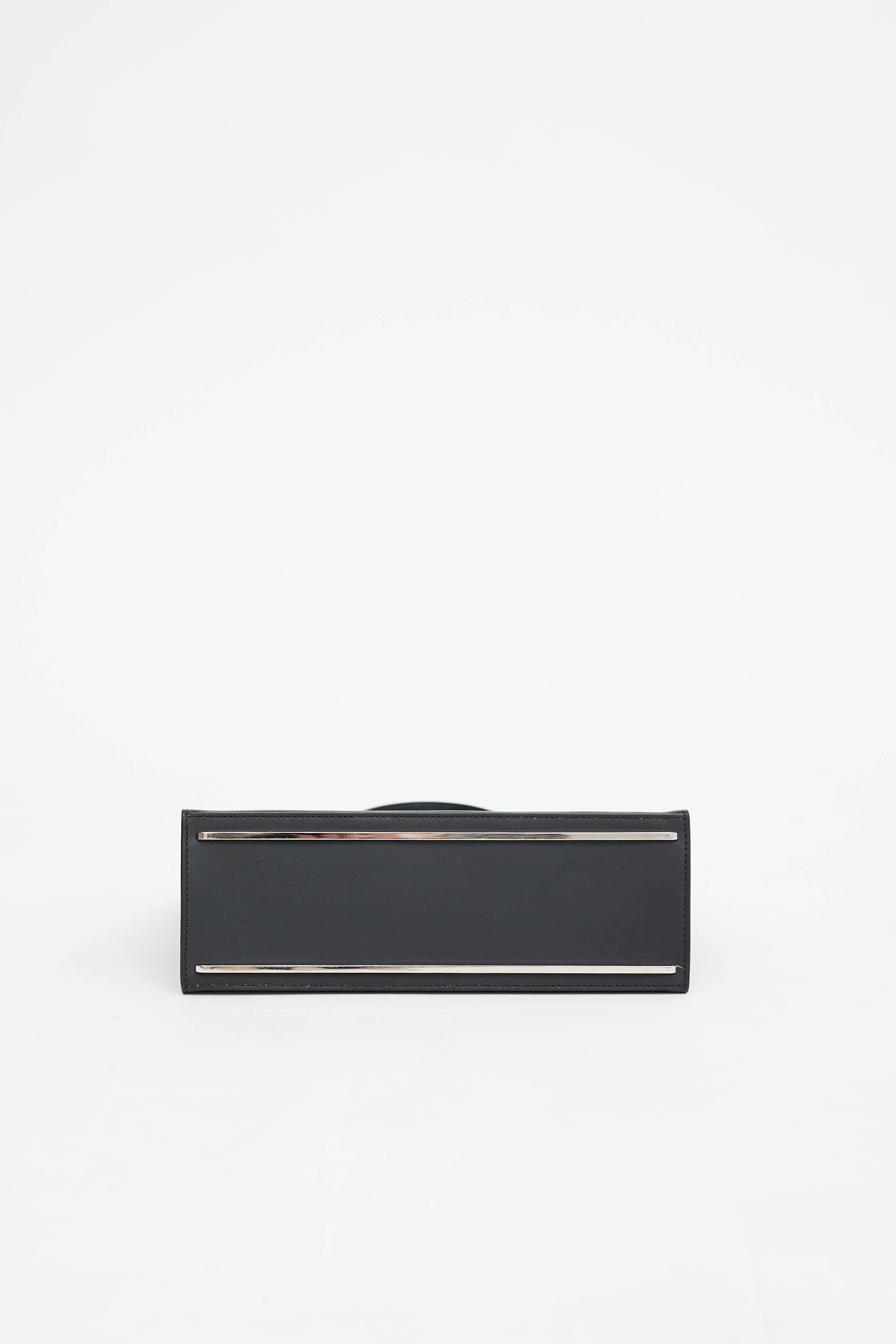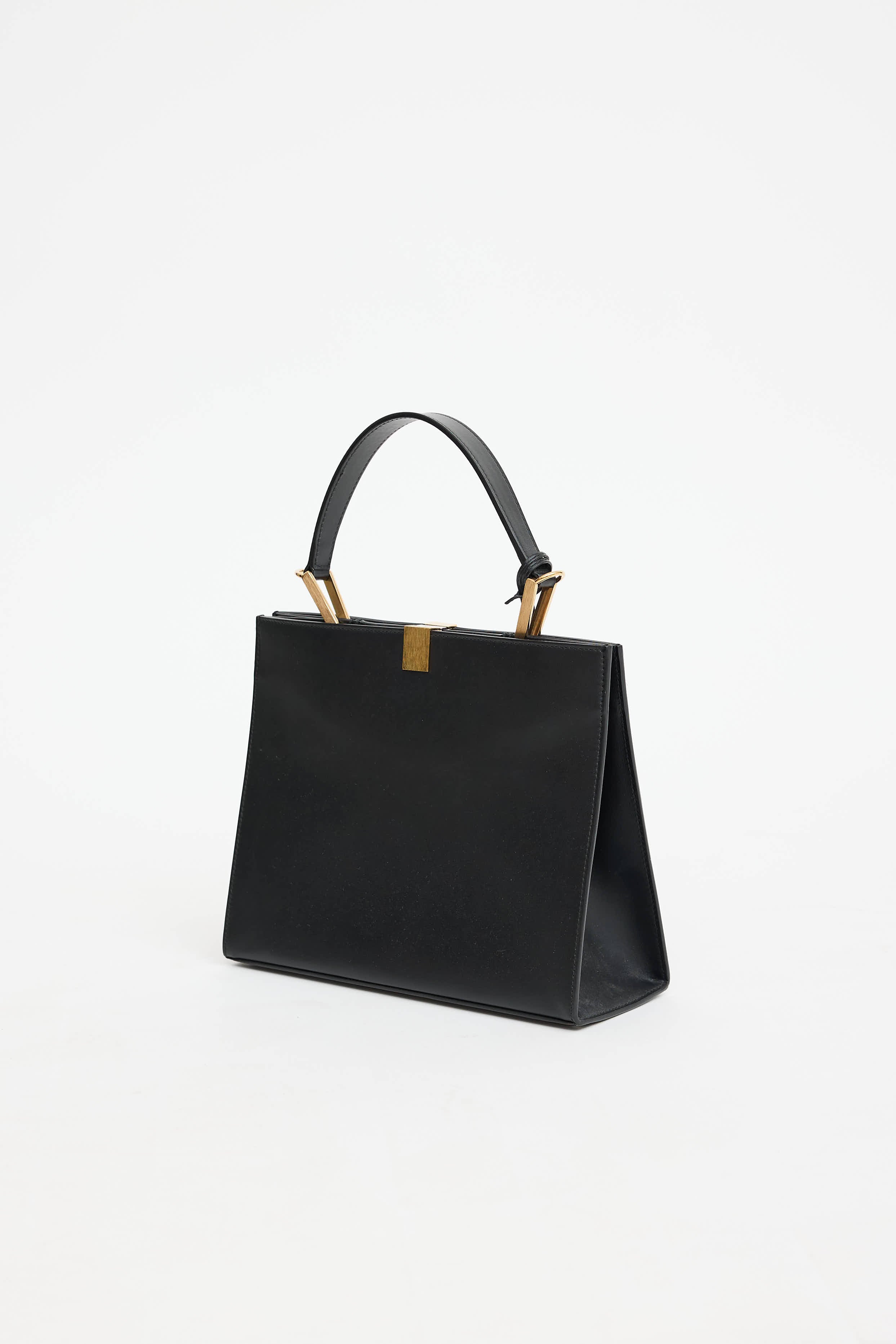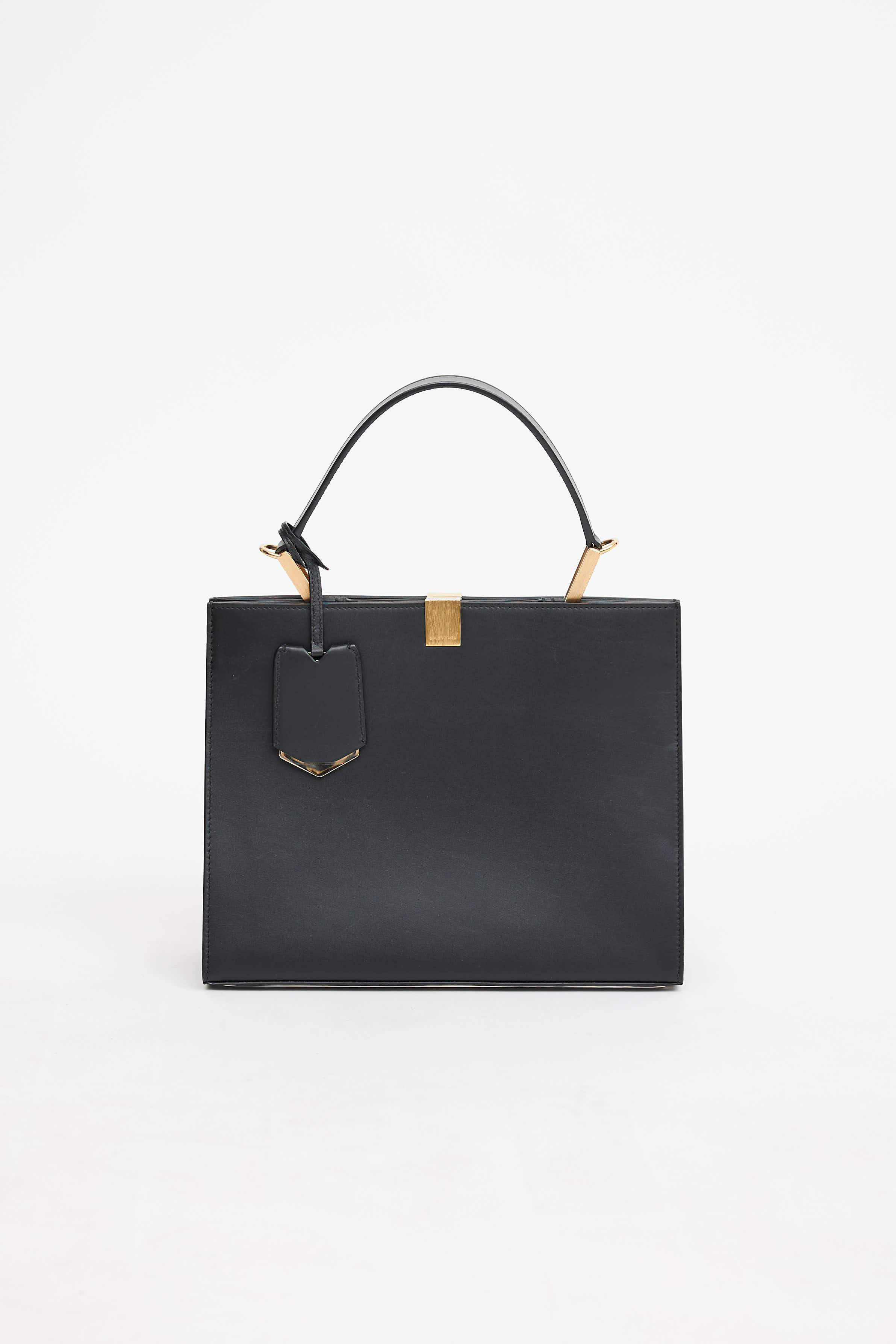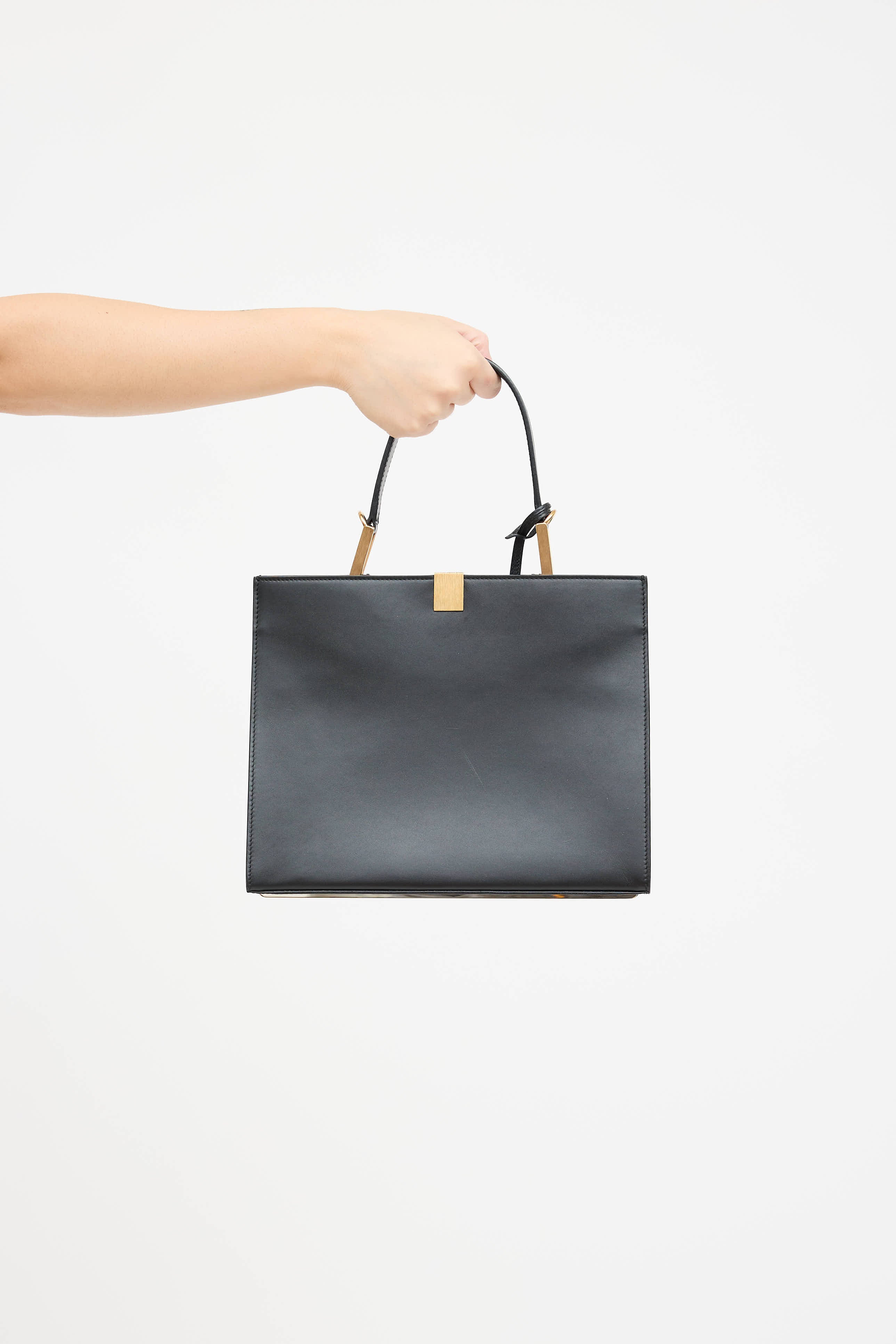 Pre-owned Balenciaga black leather Le Dix Cabas tote bag featuring flat leather top handle, gold tone hardware, removable pochette with engraved logo, two compartments with pushpin closure, and protective metal feet at base. Interiors feature two flat pockets and one zip pocket.