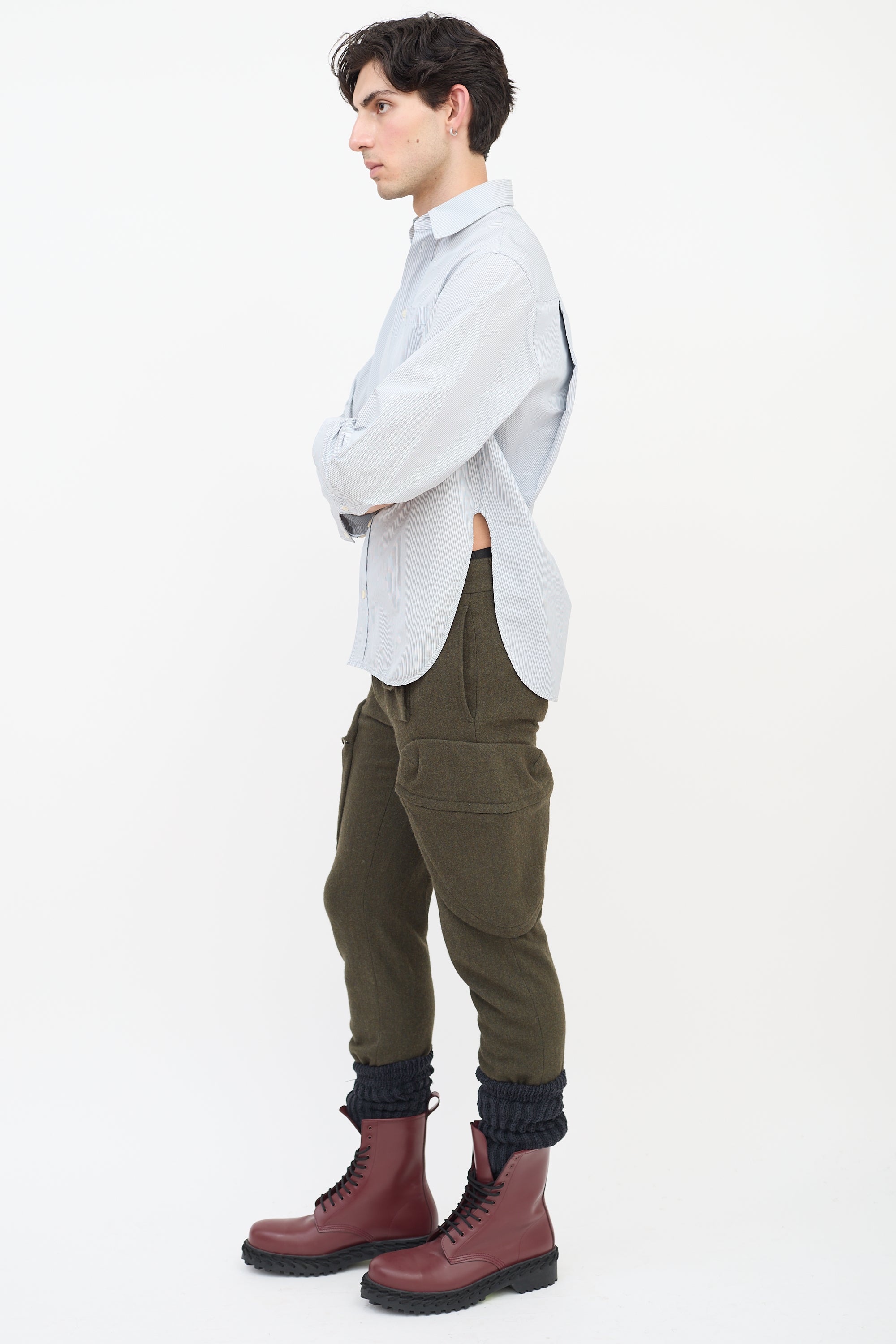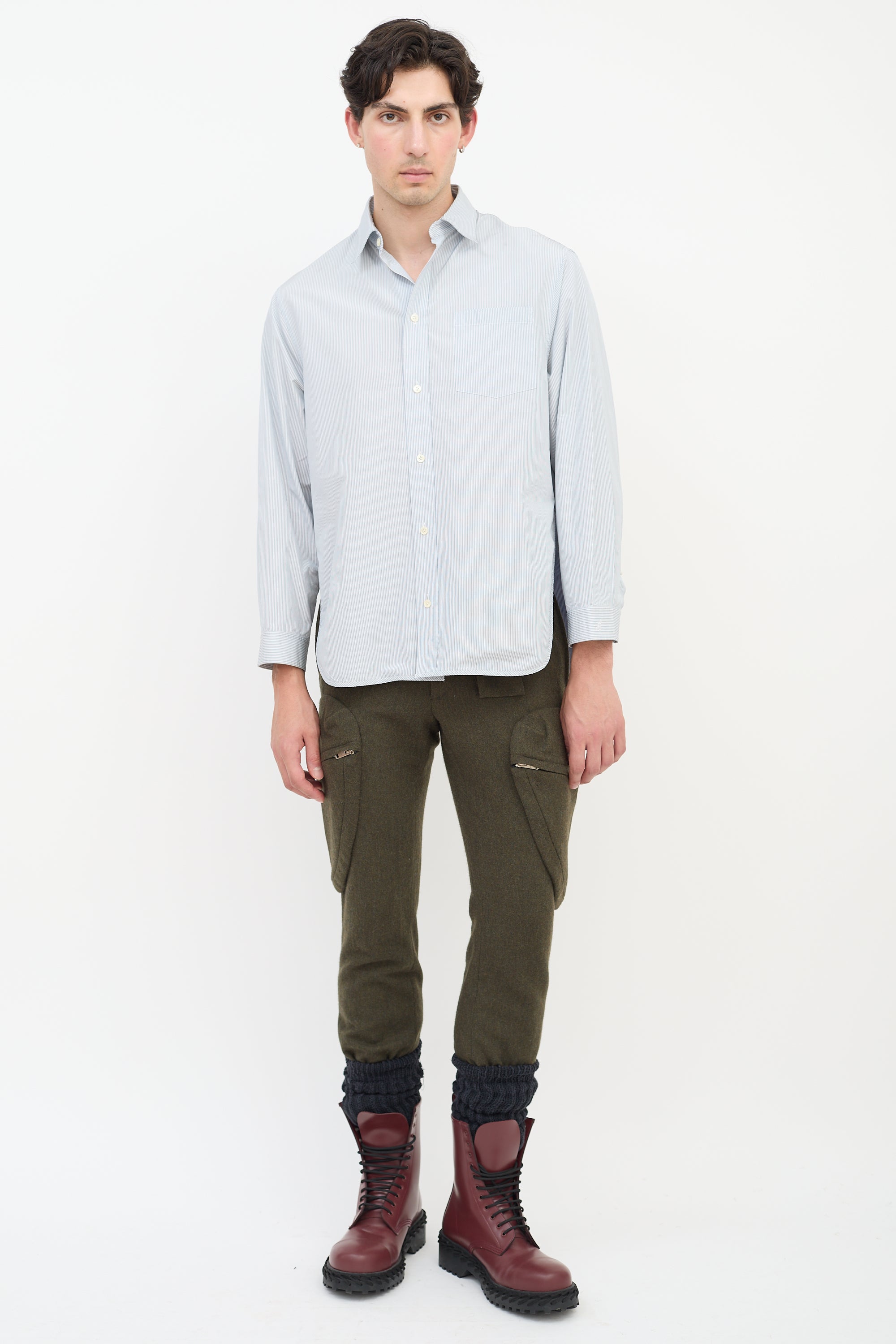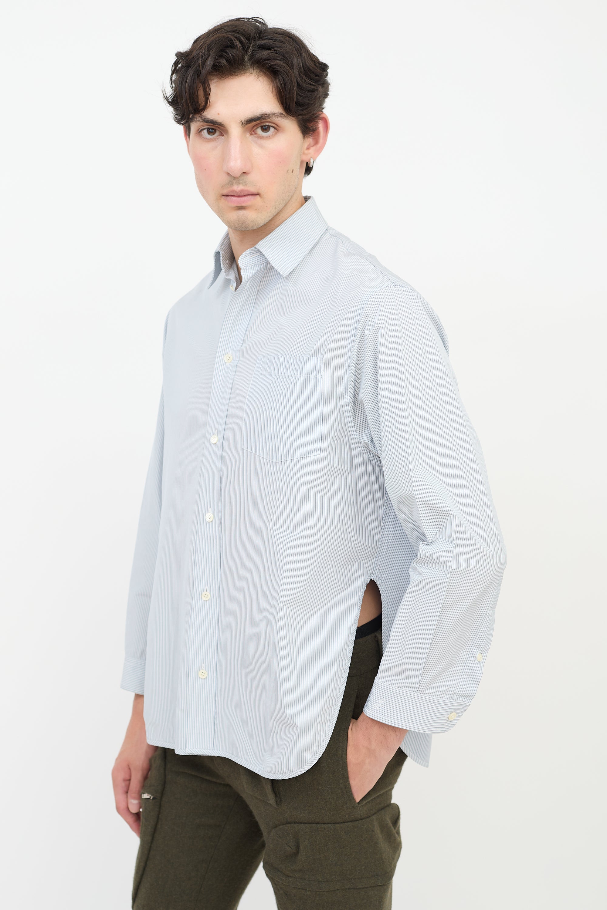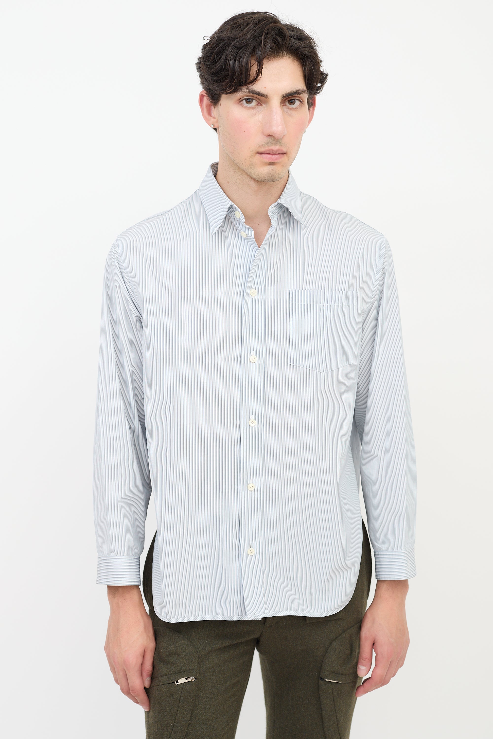 Pre-owned Balenciaga light blue cotton shirt featuring a spread collar, button up front, single patch pocket at left chest, curved shirttail hem, locker loop and pleating at back yoke, long sleeves with pleated and buttoned cuffs, and vertical stripes throughout.
