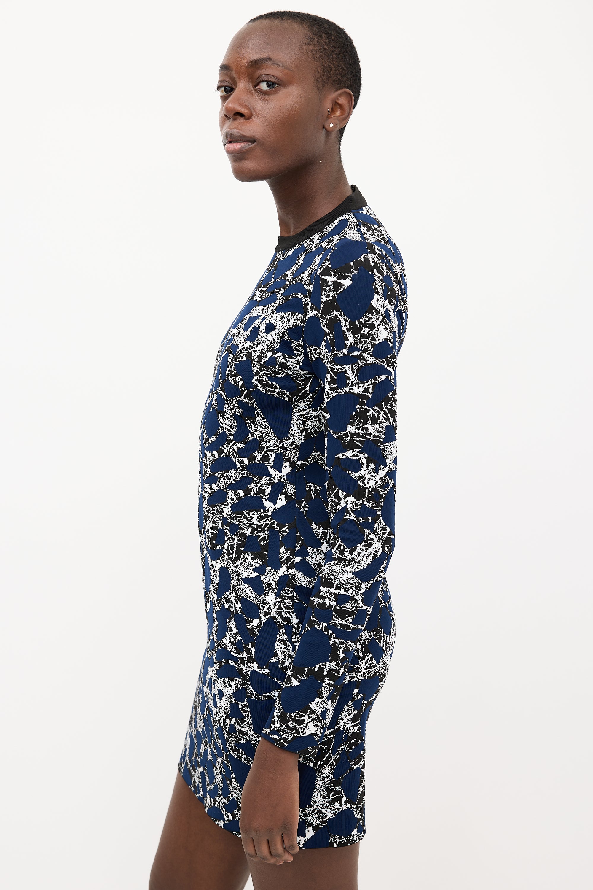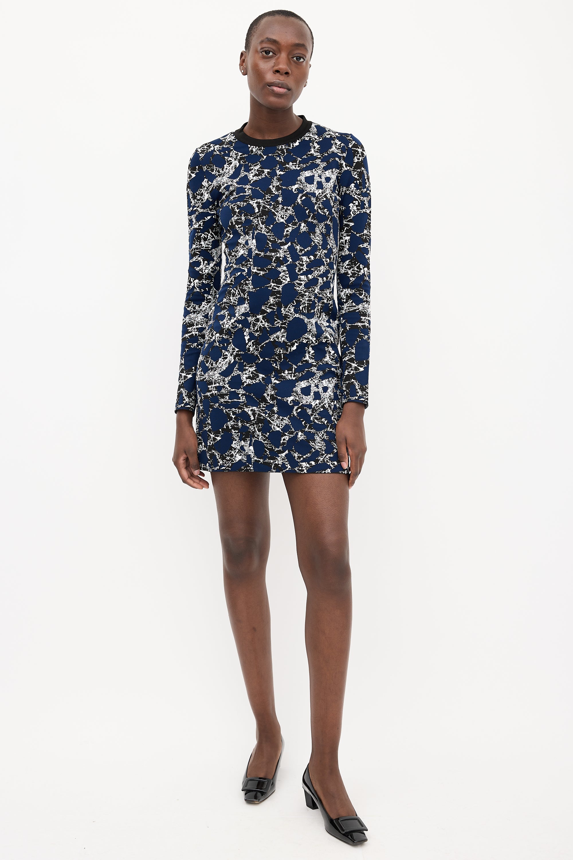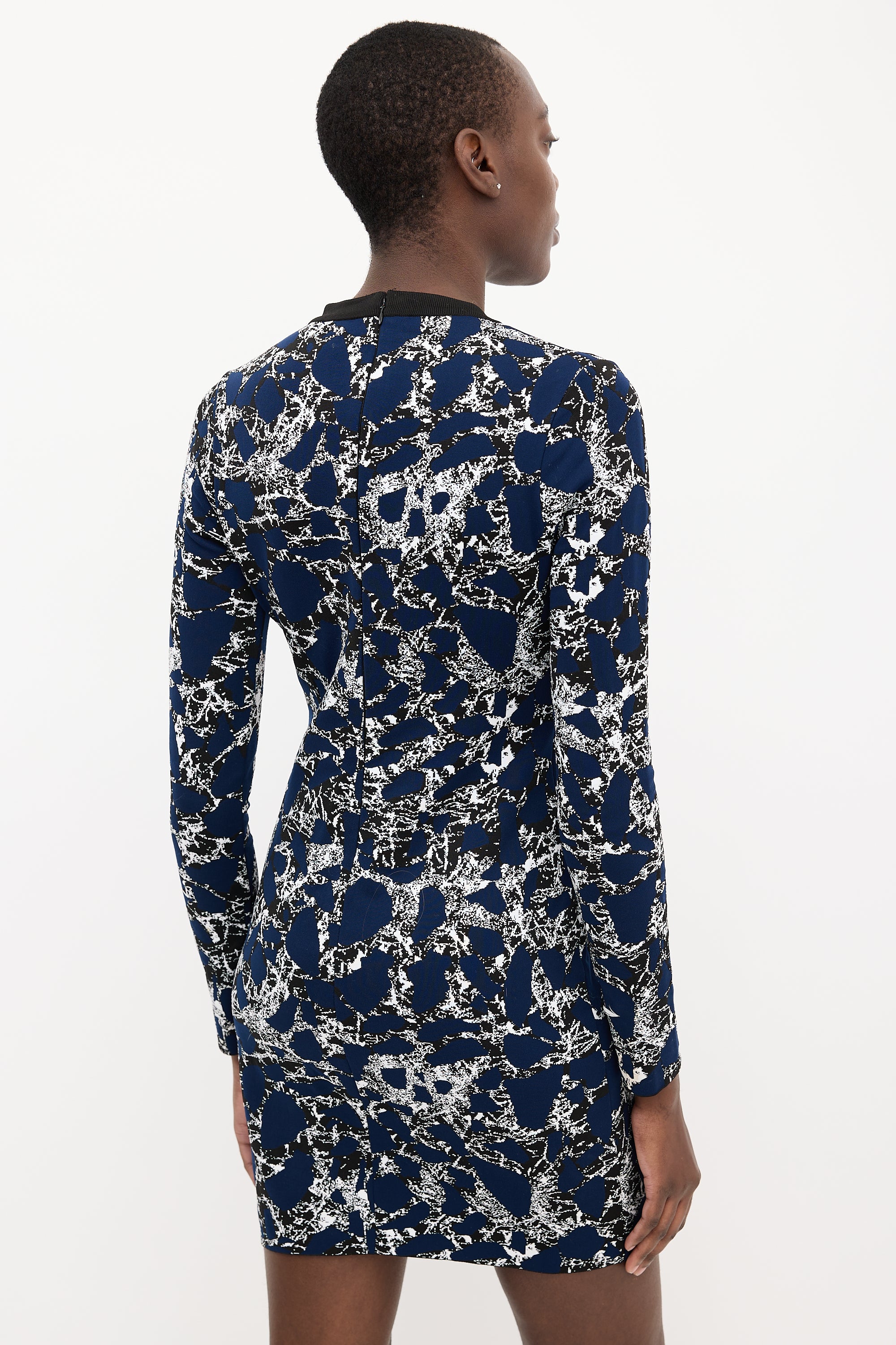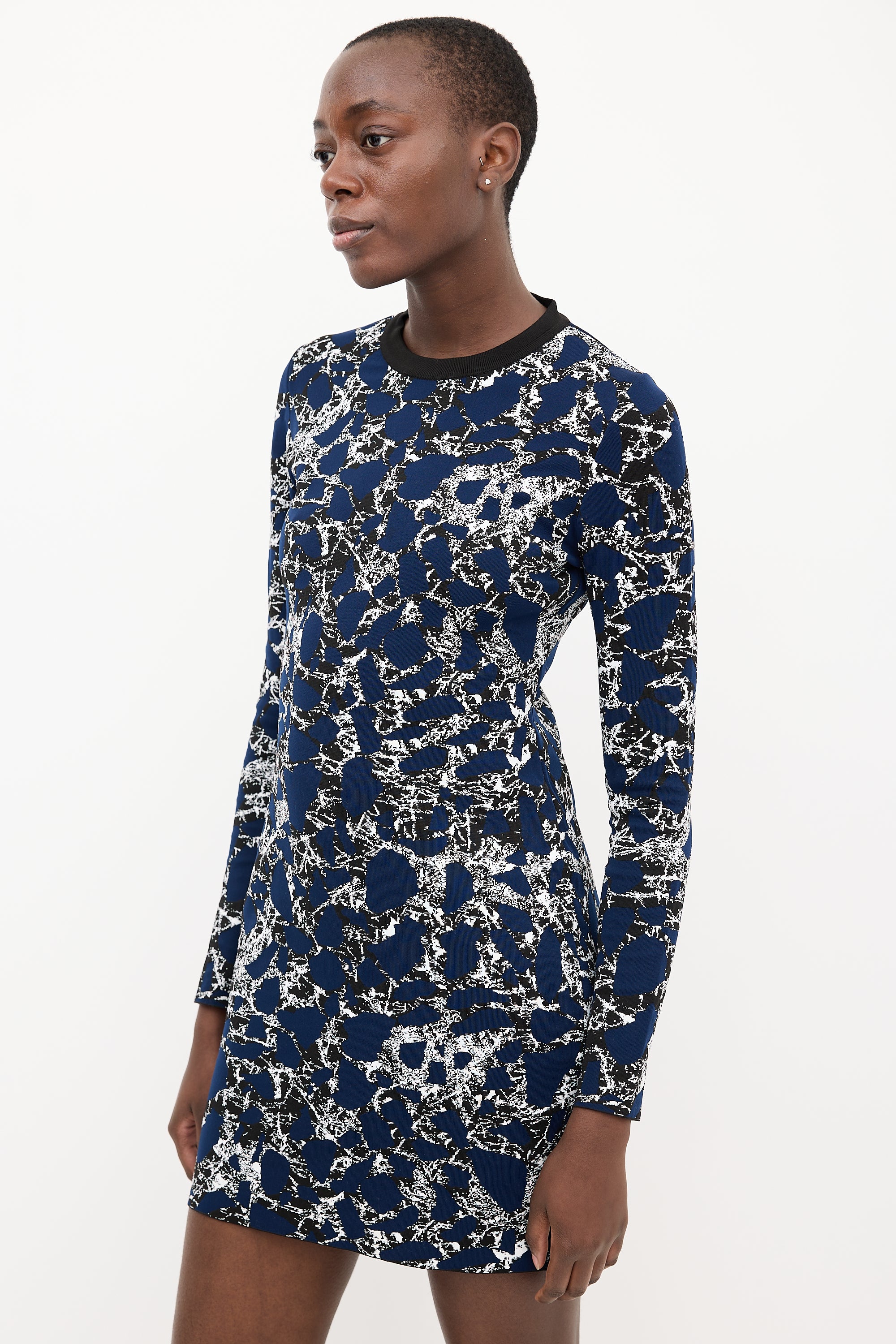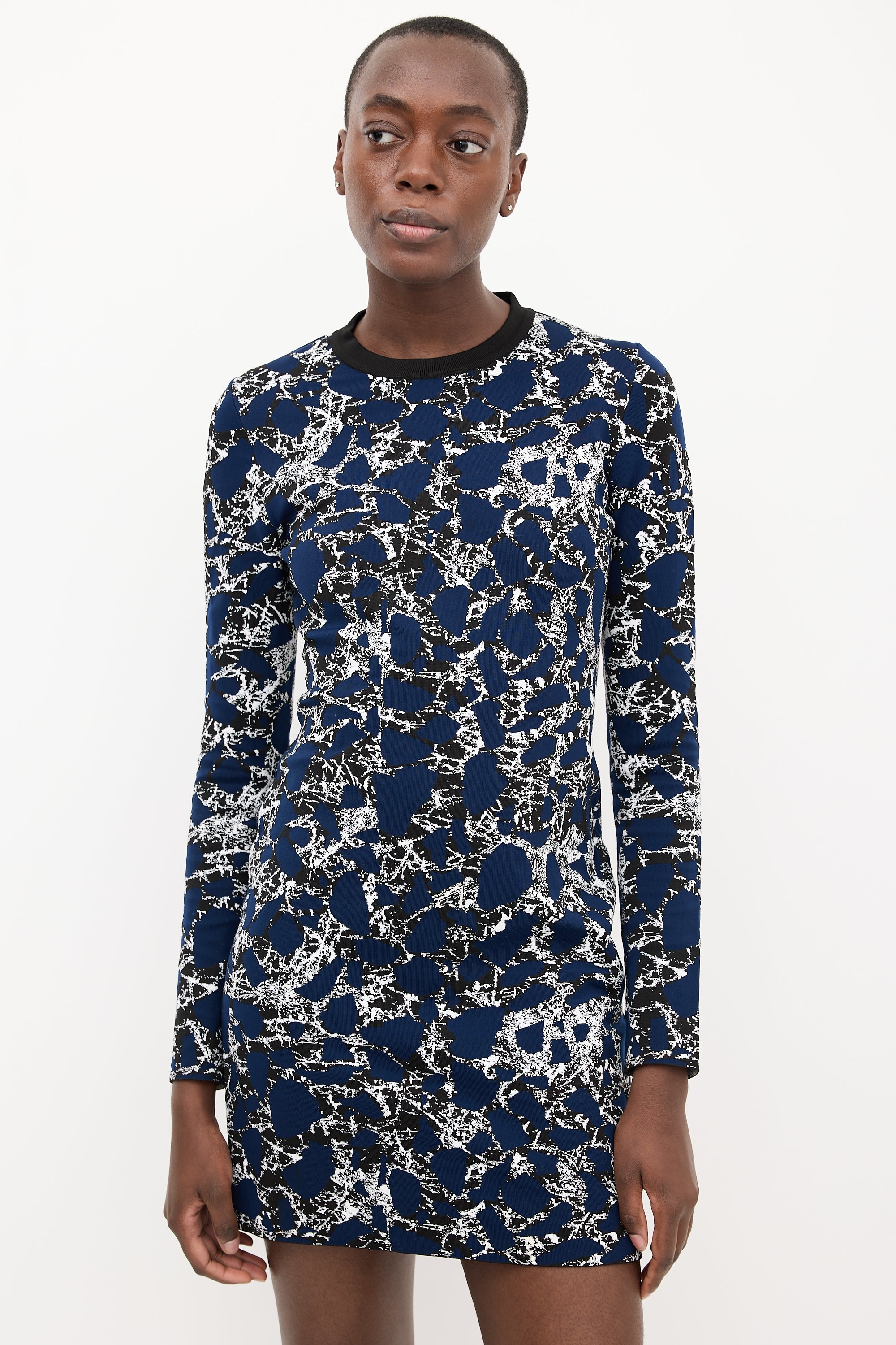 Pre-owned Balenciaga navy, black, and white knit midi dress featuring a round neckline, patterned jacquard, and concealed back zip.