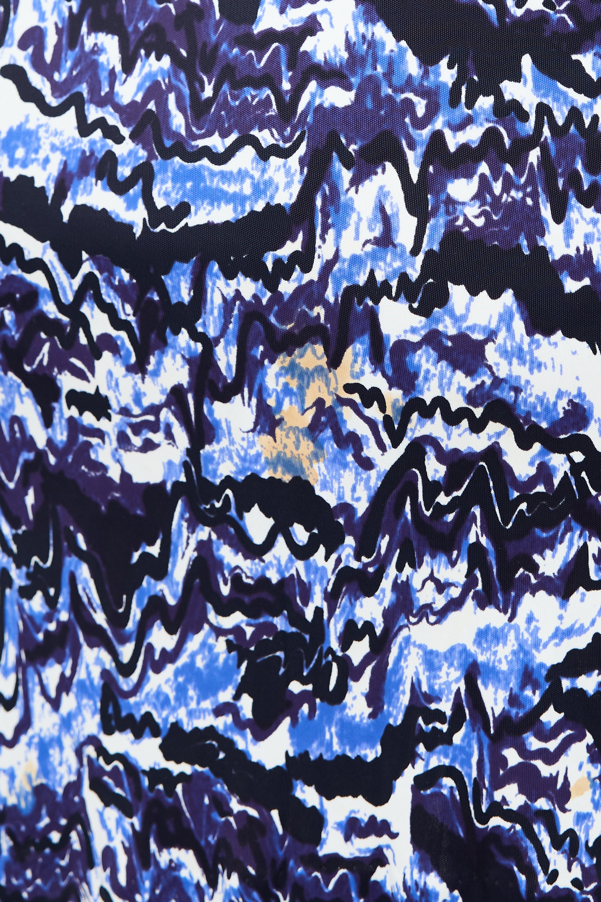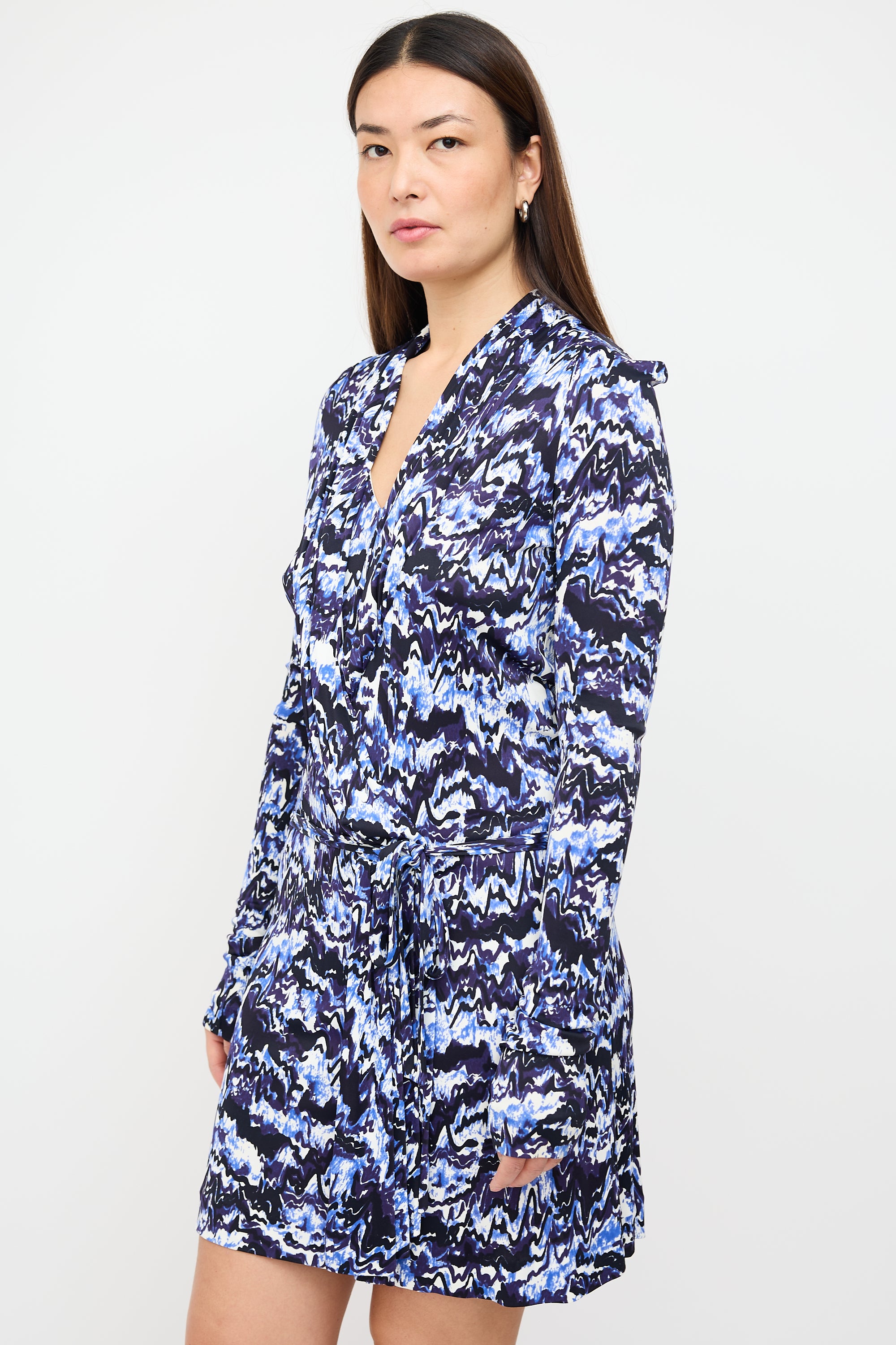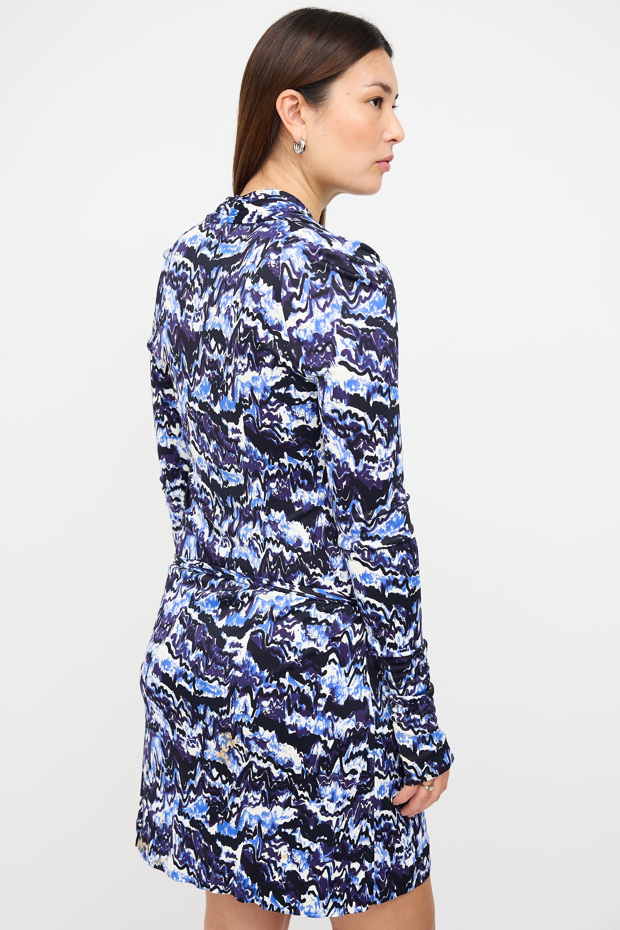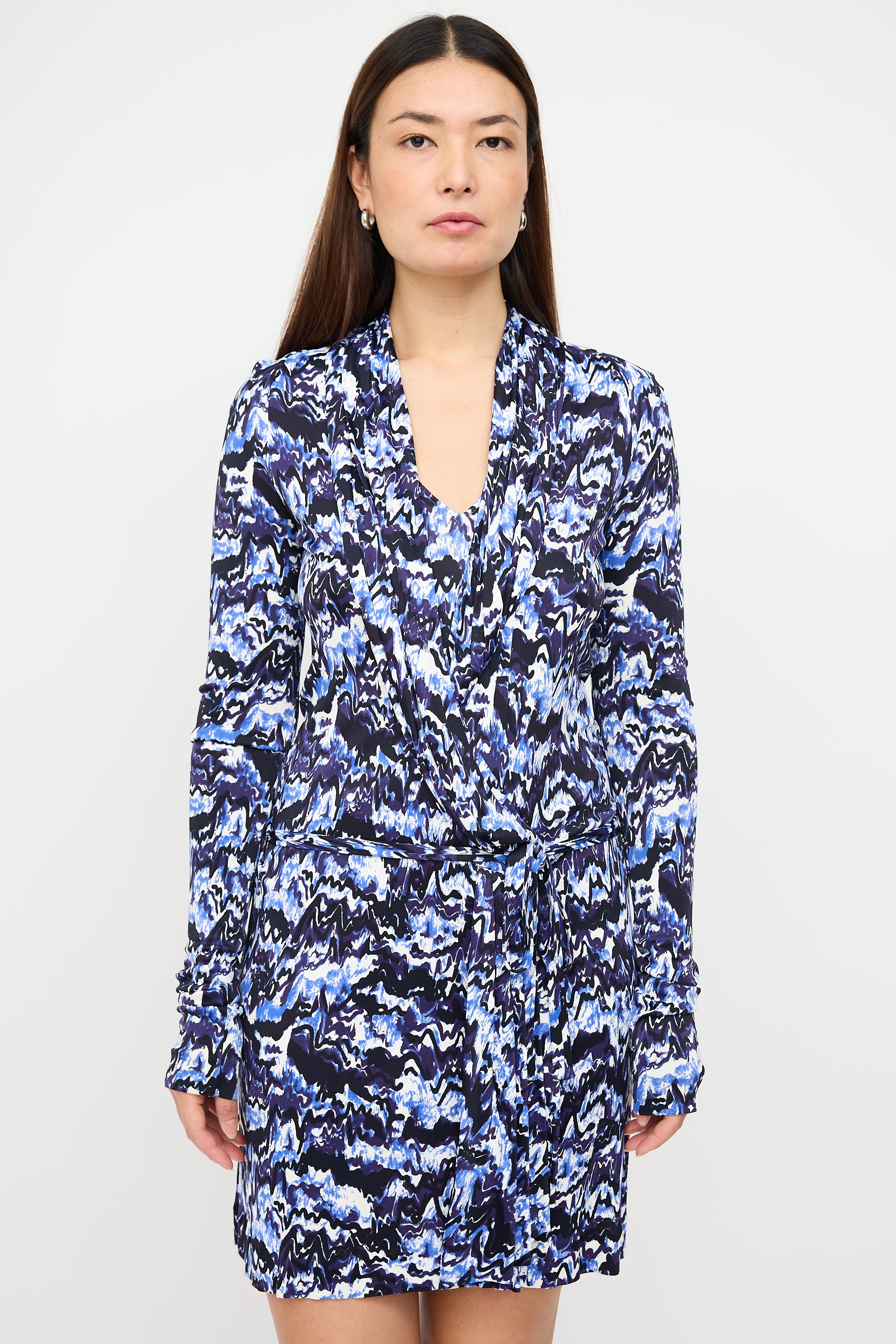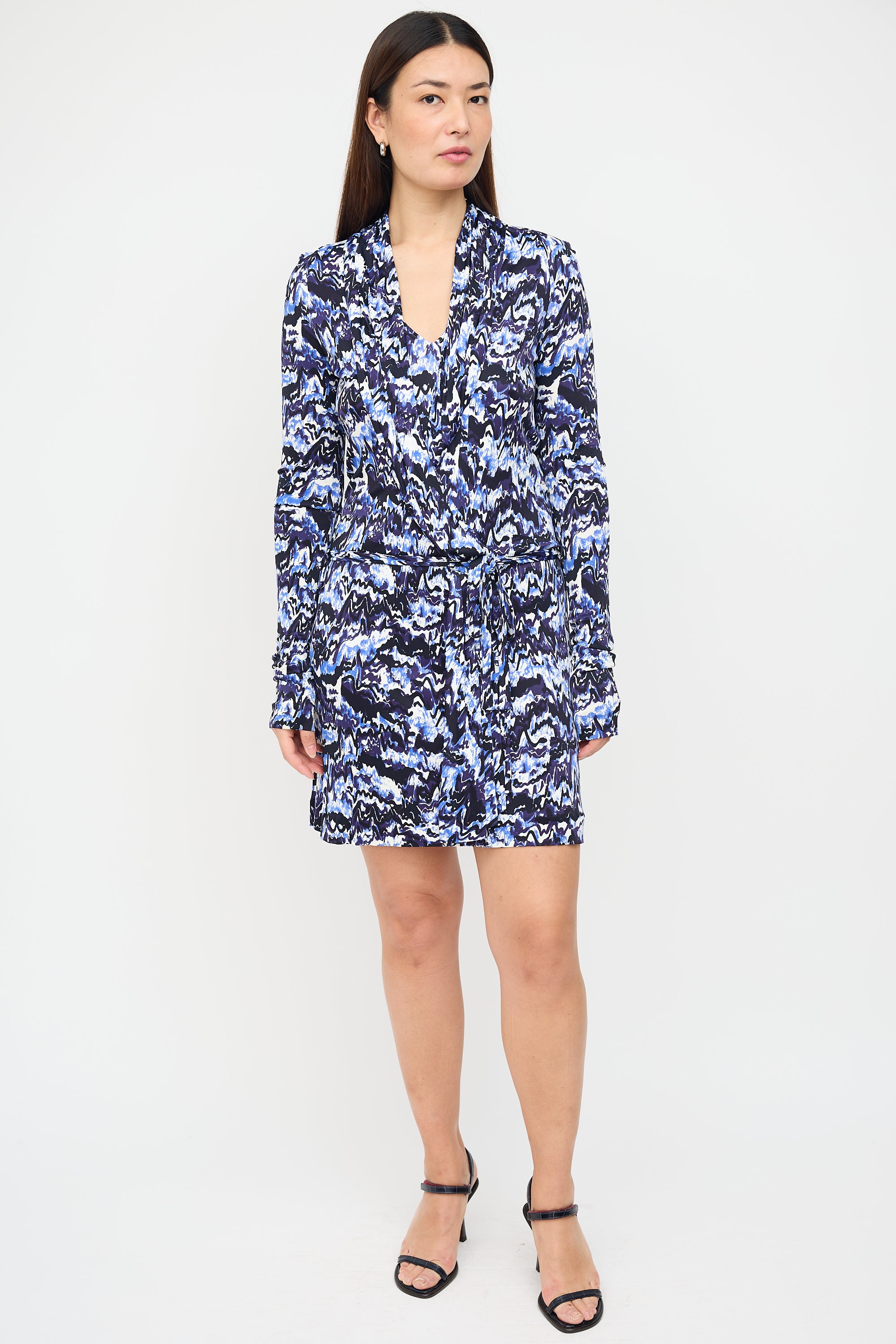 Pre-owned Balenciaga navy, blue, and white mini dress featuring an abstract print throughout, draped surplice neckline, faux wrap front design with pleating, and tie belt.
