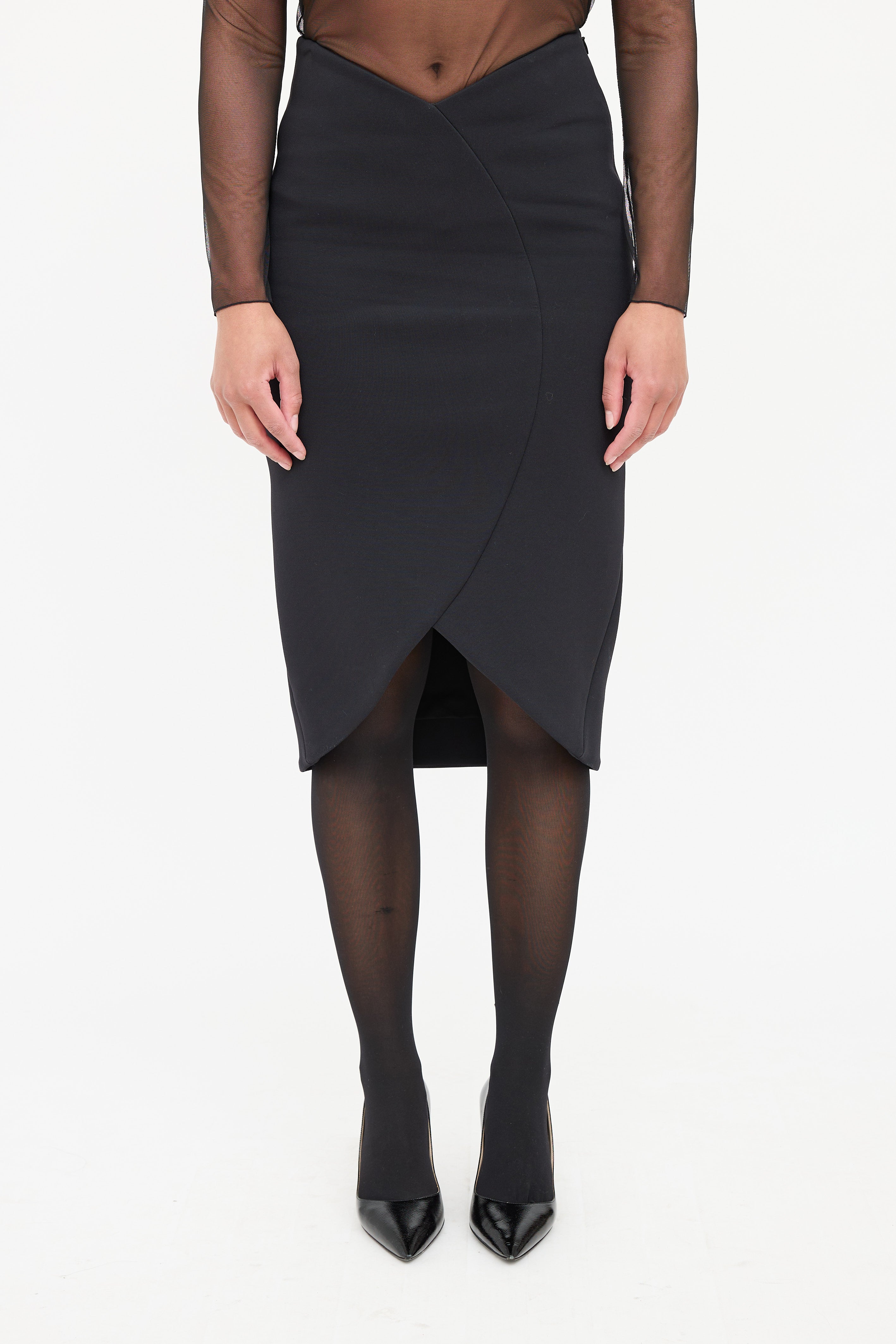 Pre-owned Balenciaga black midi pencil skirt featuring a V waistline, asymmetrical curved hem, and concealed zip closure at side.