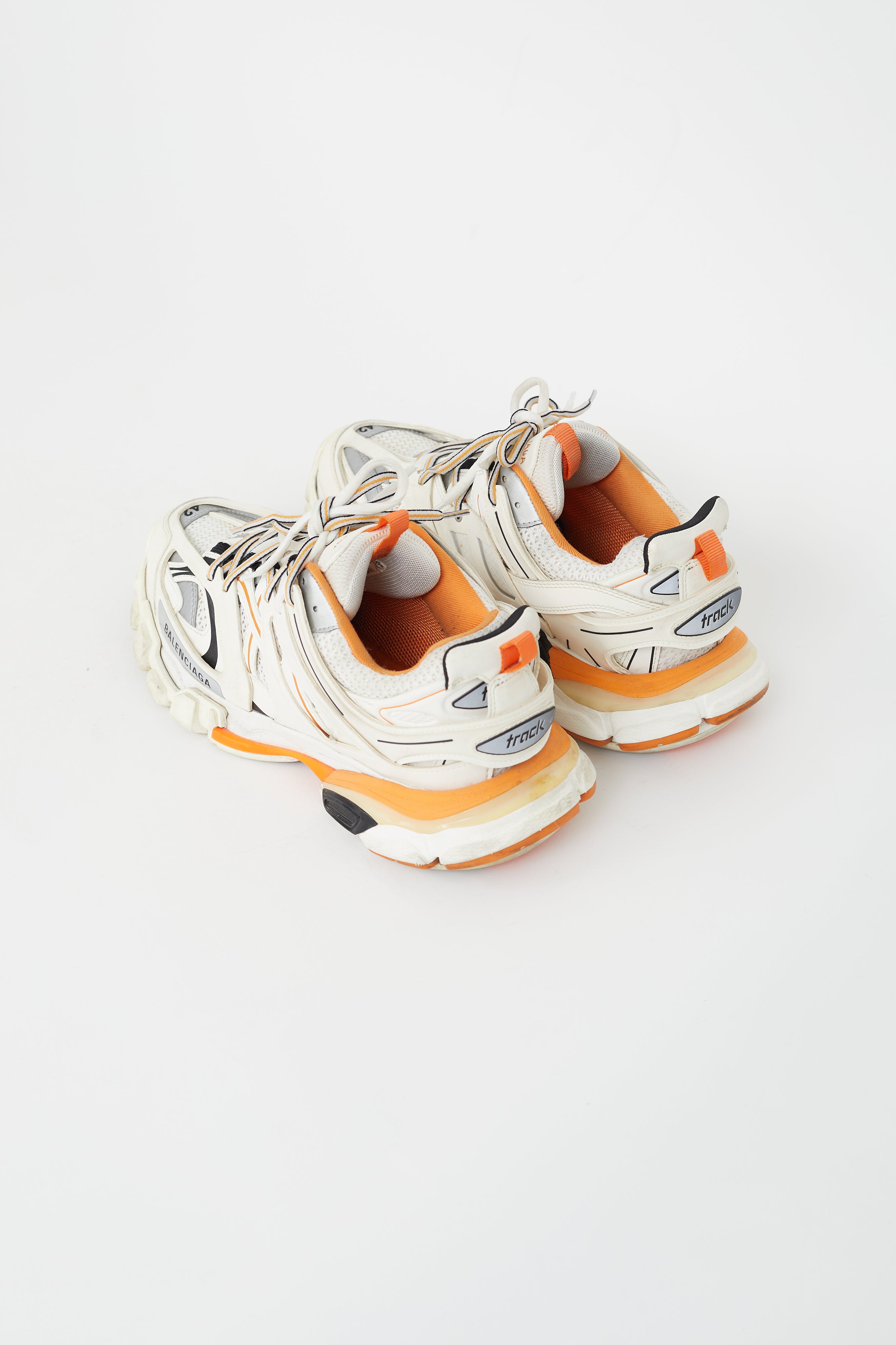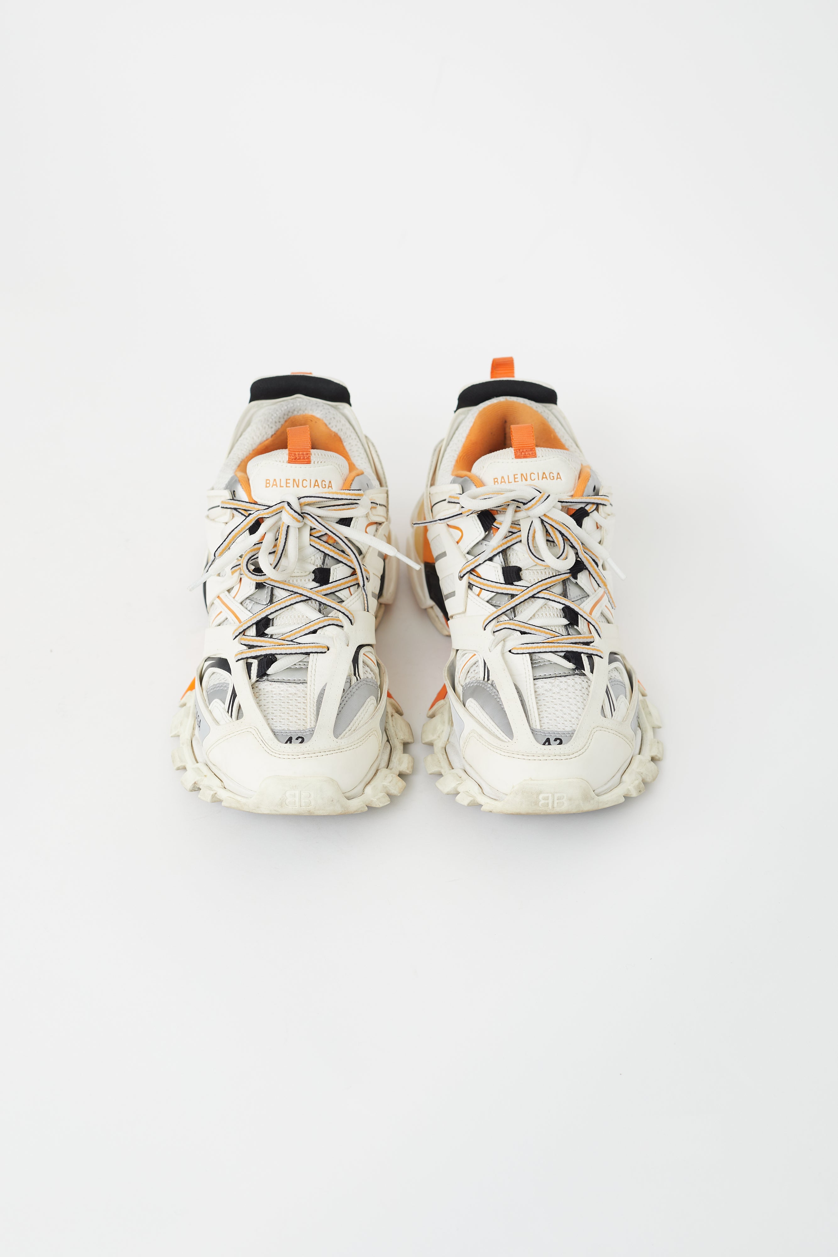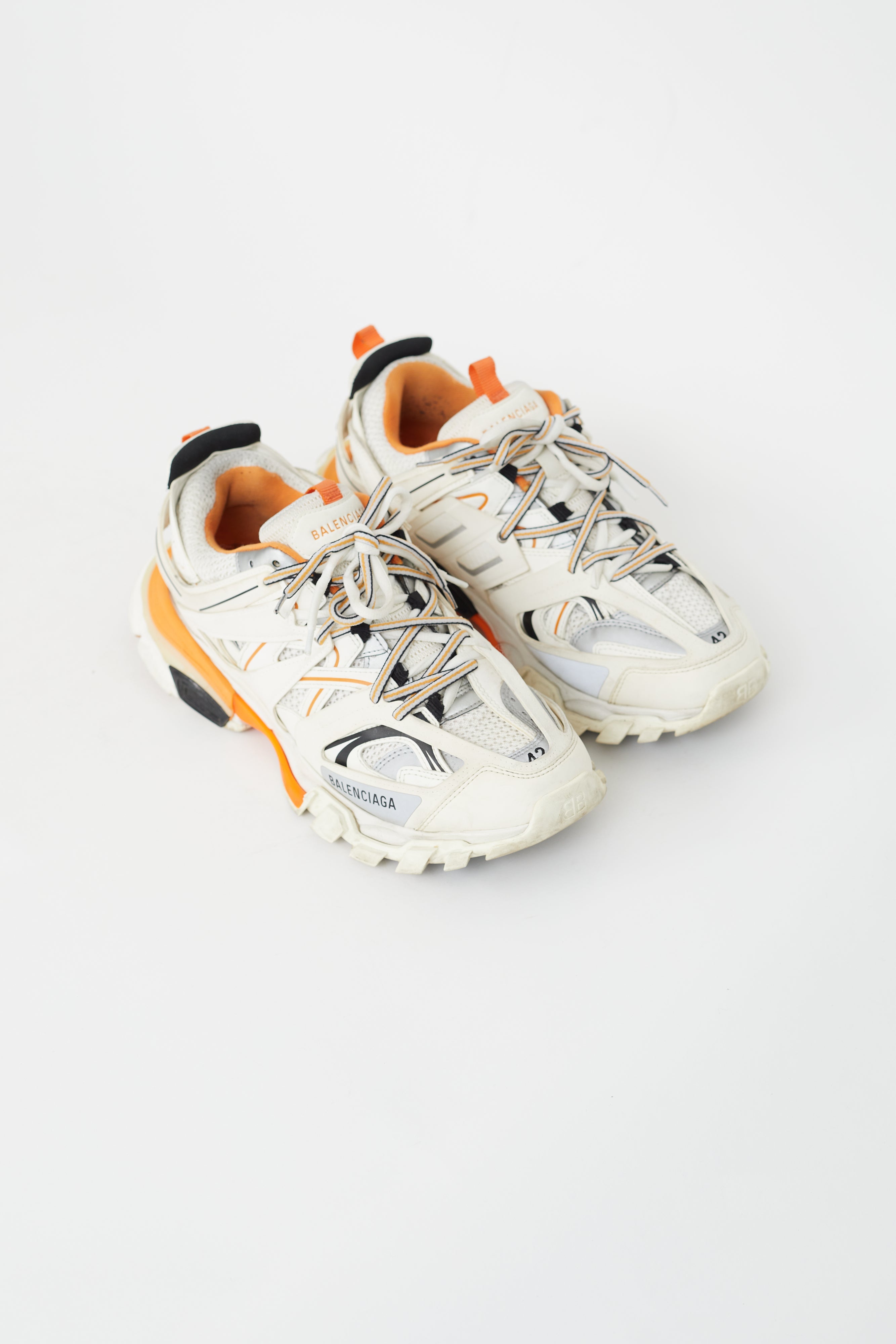 Pre-owned Balenciaga white and orange leather Track sneaker featuring a narrow rounded toe, double lace up vamp with two different coloured laces, padded, mesh and leather upper, padded tongue and collar and a chunky sole.