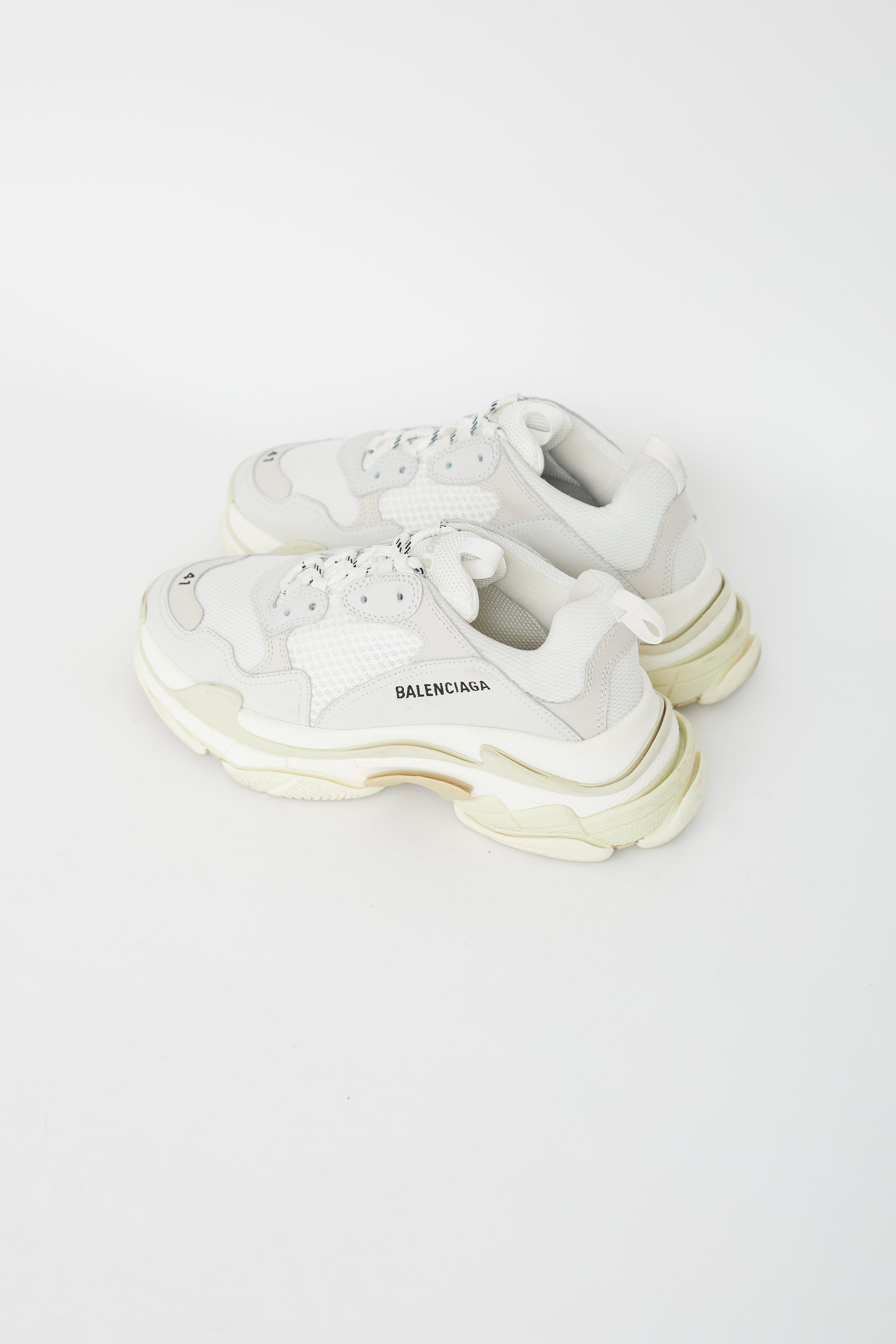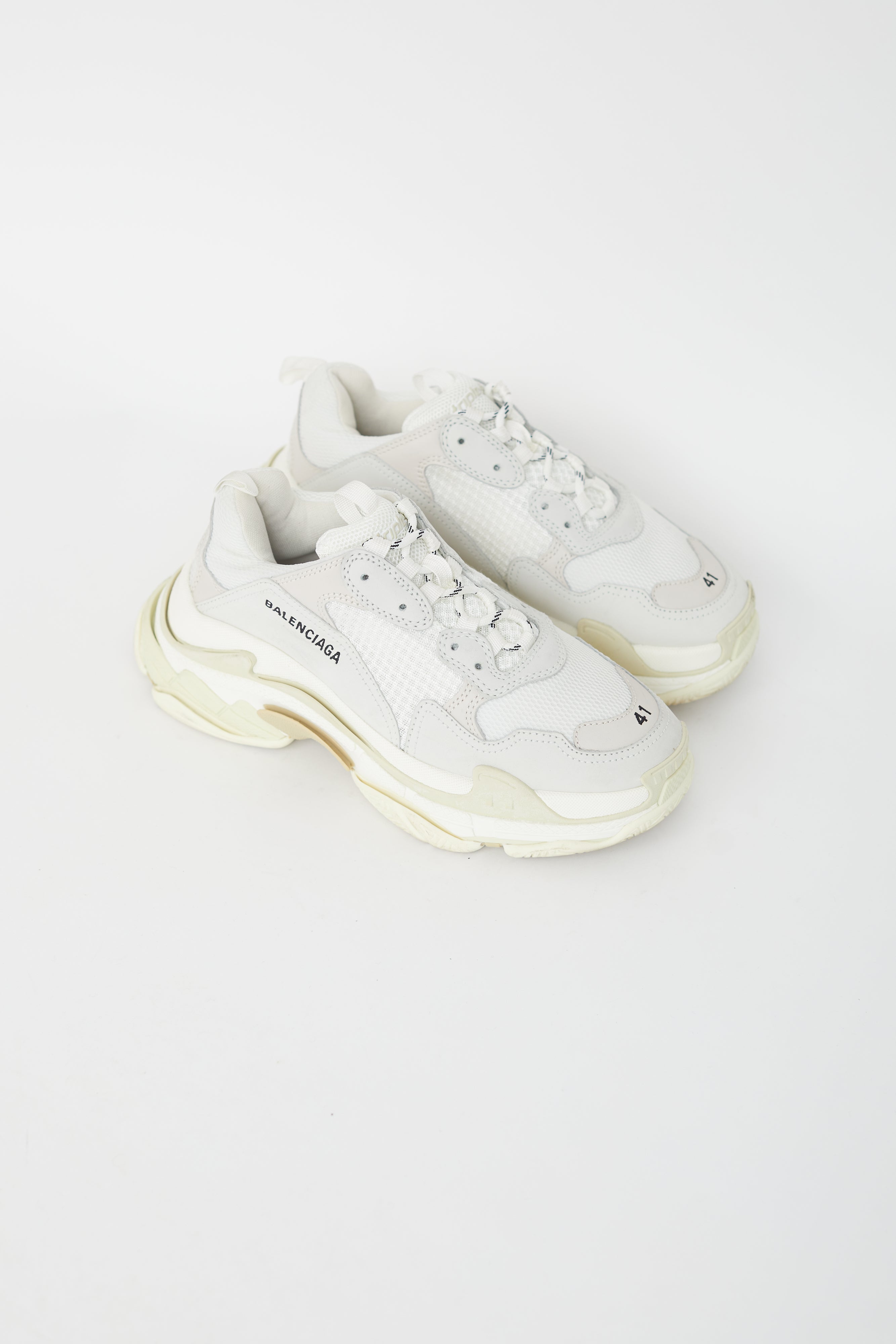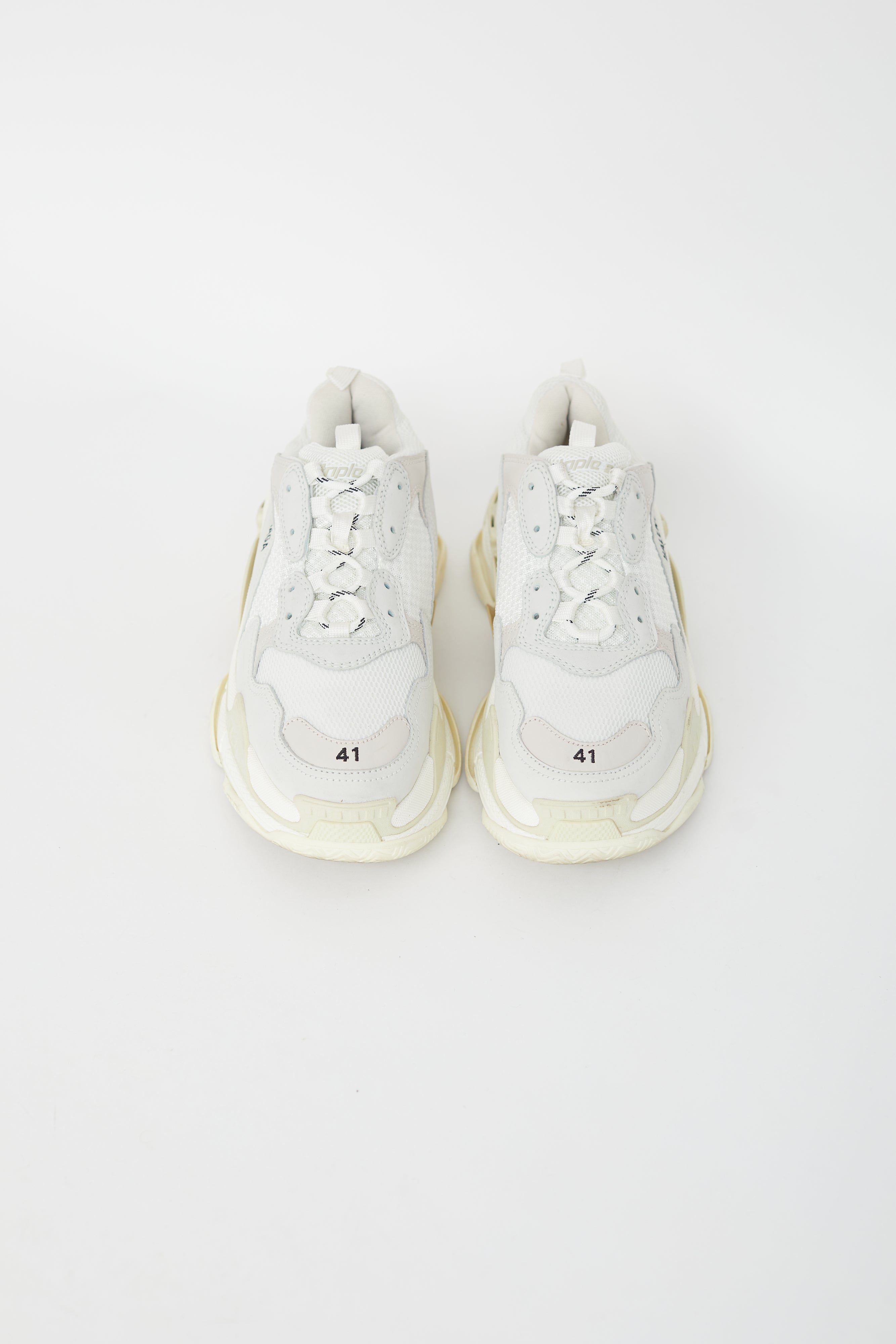 Pre-owned Balenciaga white Triple S sneaker featuring a rounded toe, leather and mesh panelling at upper, pull tab at heel and tongue, chunky midsole, embroidered "41" at toe, and lace up closure.