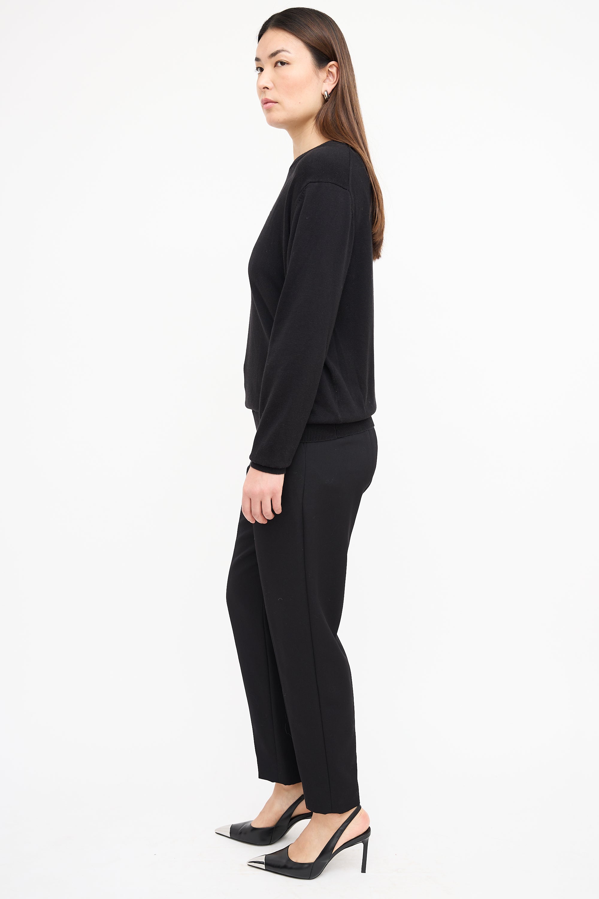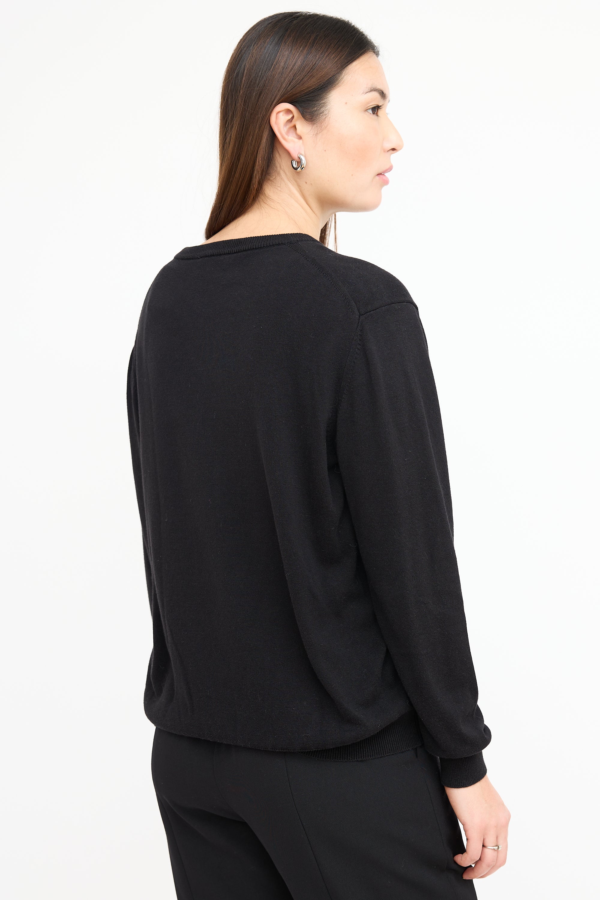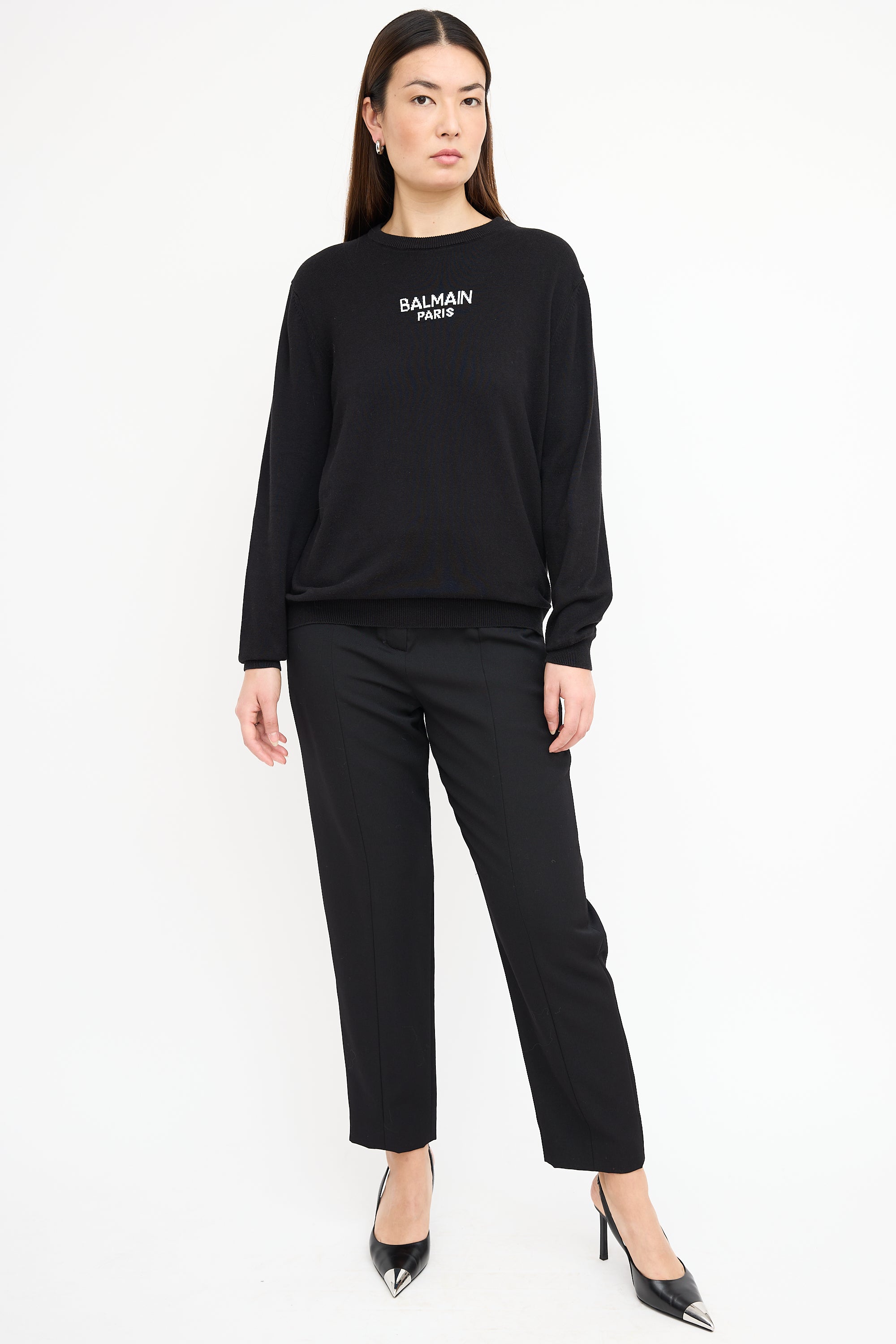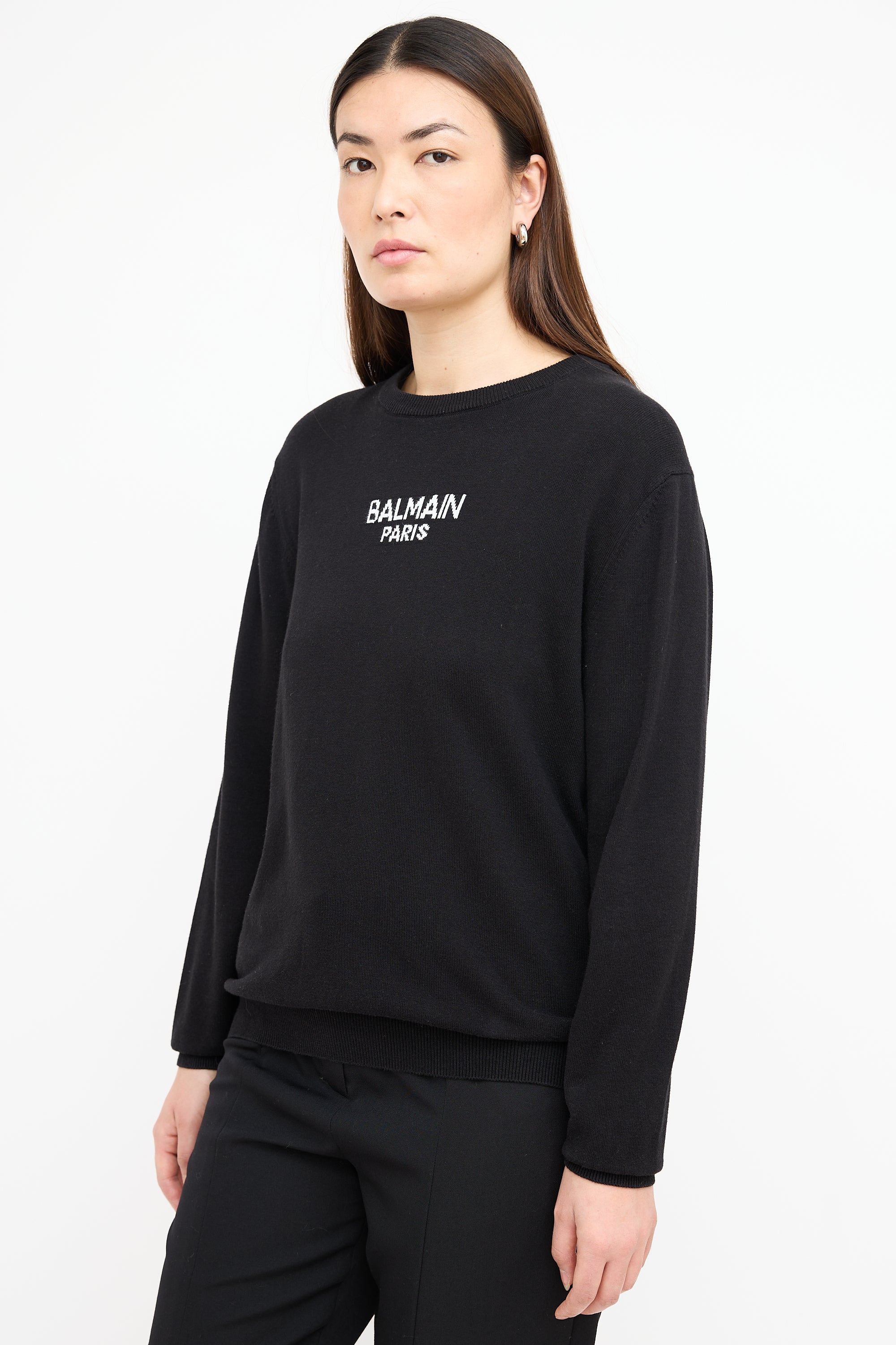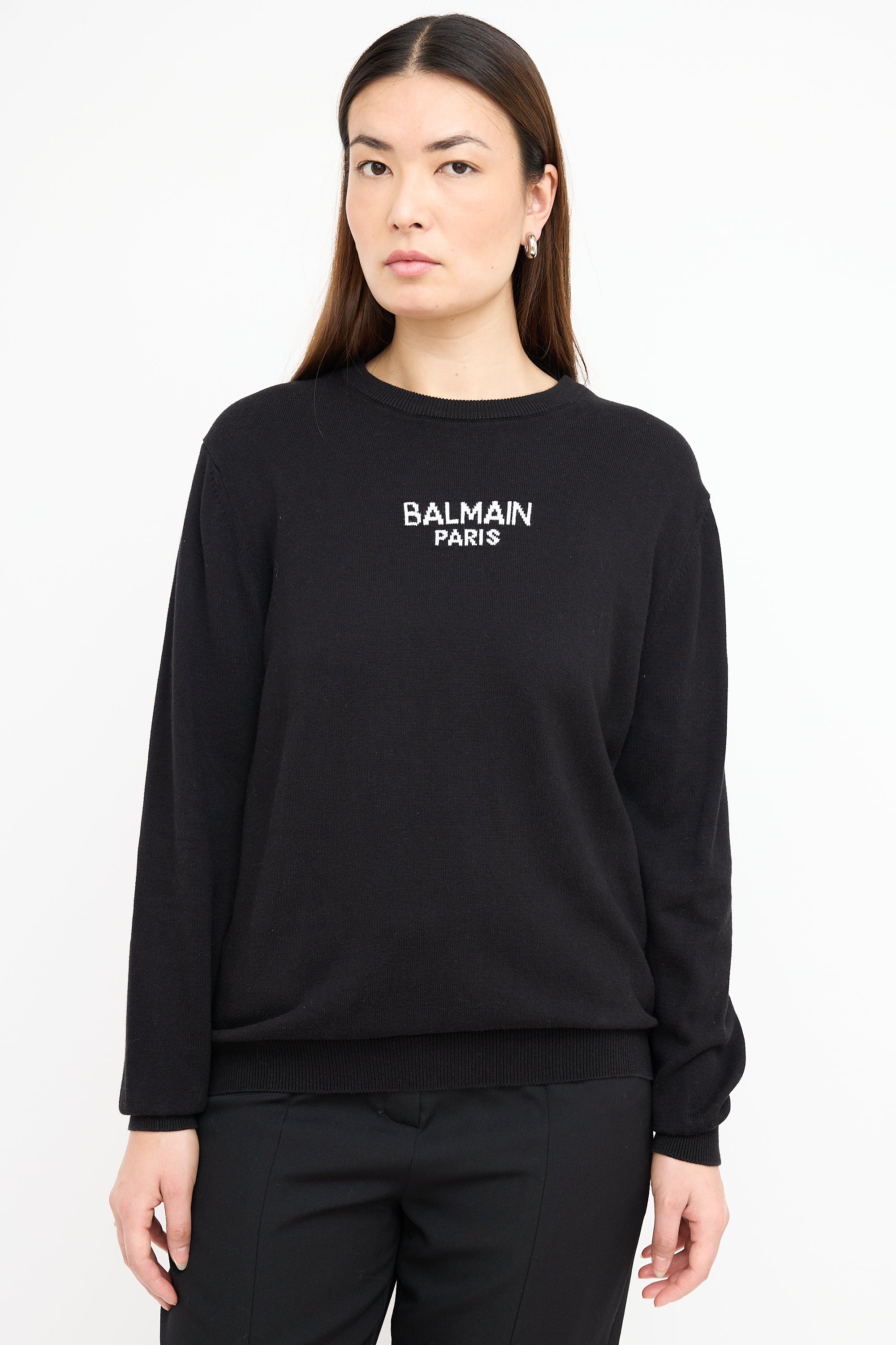Pre-owned Balmain black knit sweater featuring a crew neck, white intarsia logo at chest, and ribbed collar, hem, and cuffs.