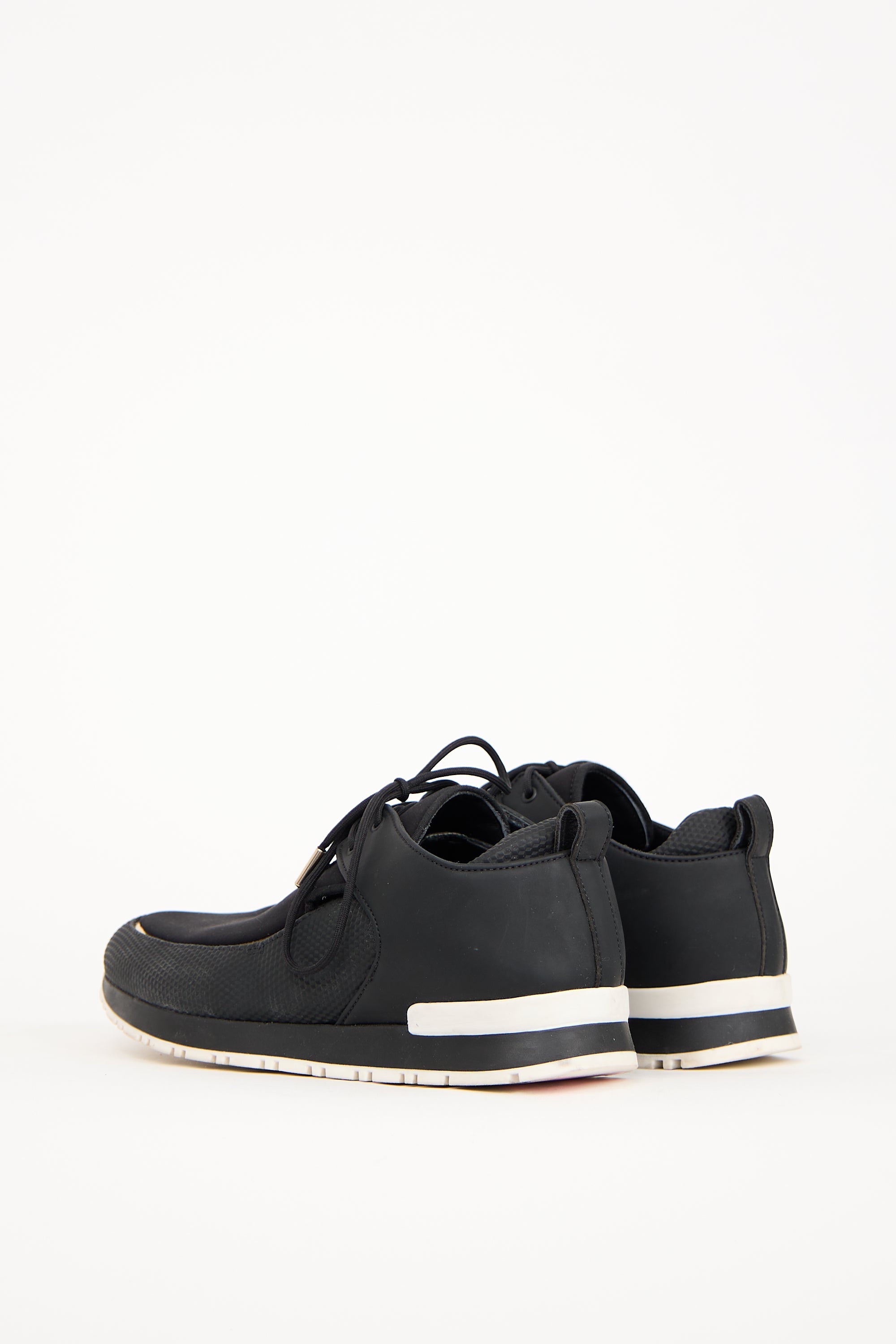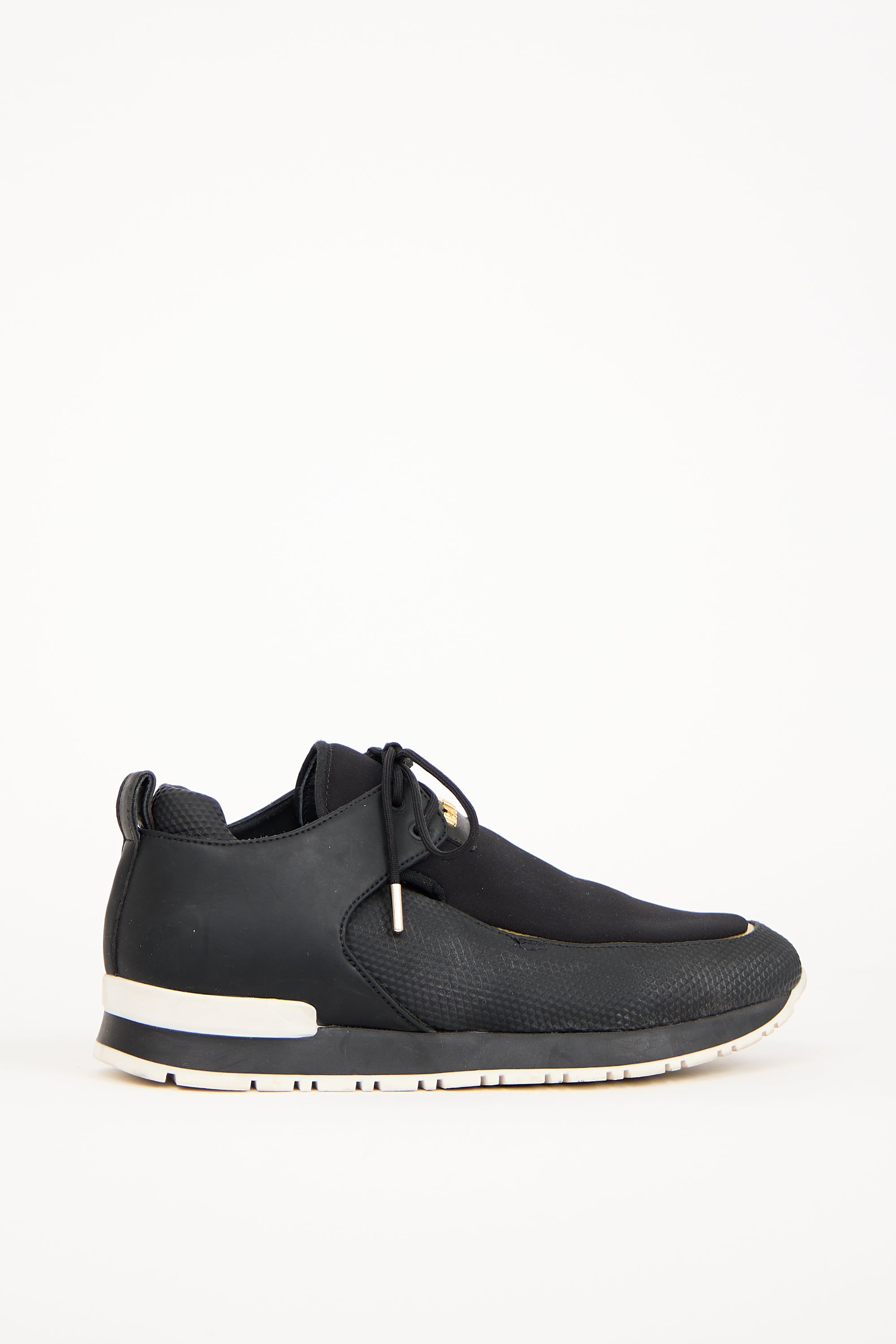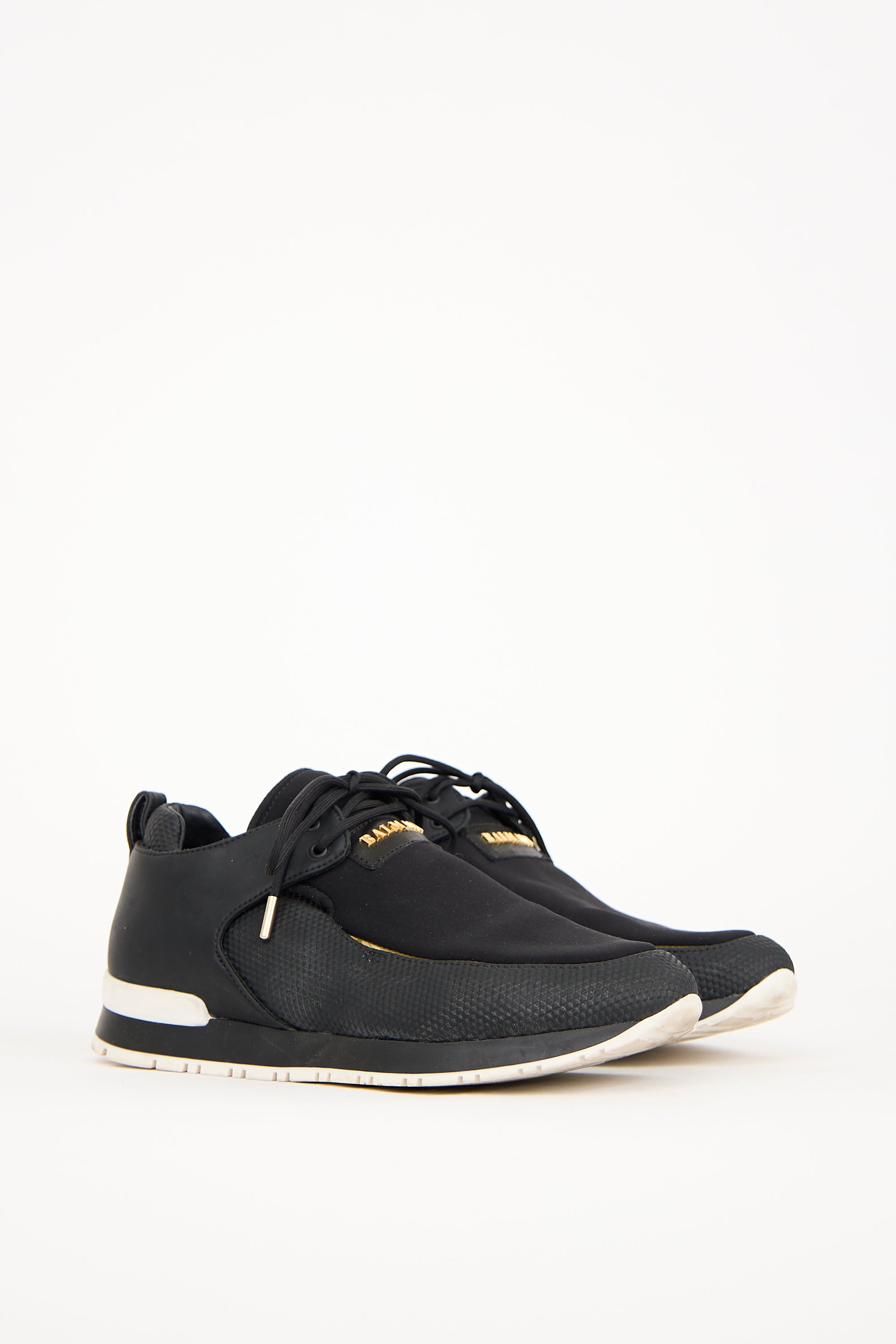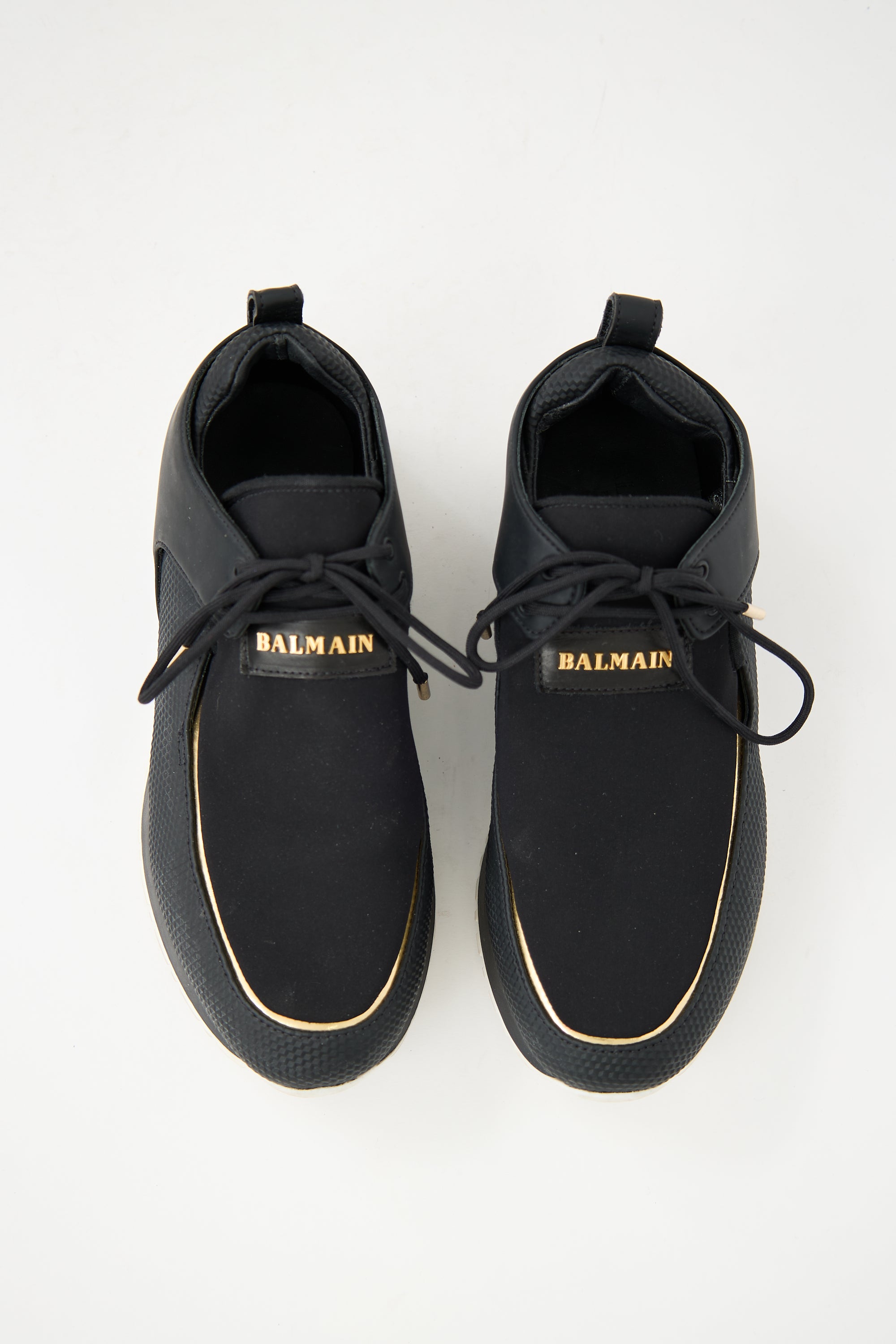 Pre-owned Balmain black leather Doda sneakers featuring an almond toe, neoprene upper with gold trim, gold tone logo at tongue, and lace up closure with gold tone lace aglets.