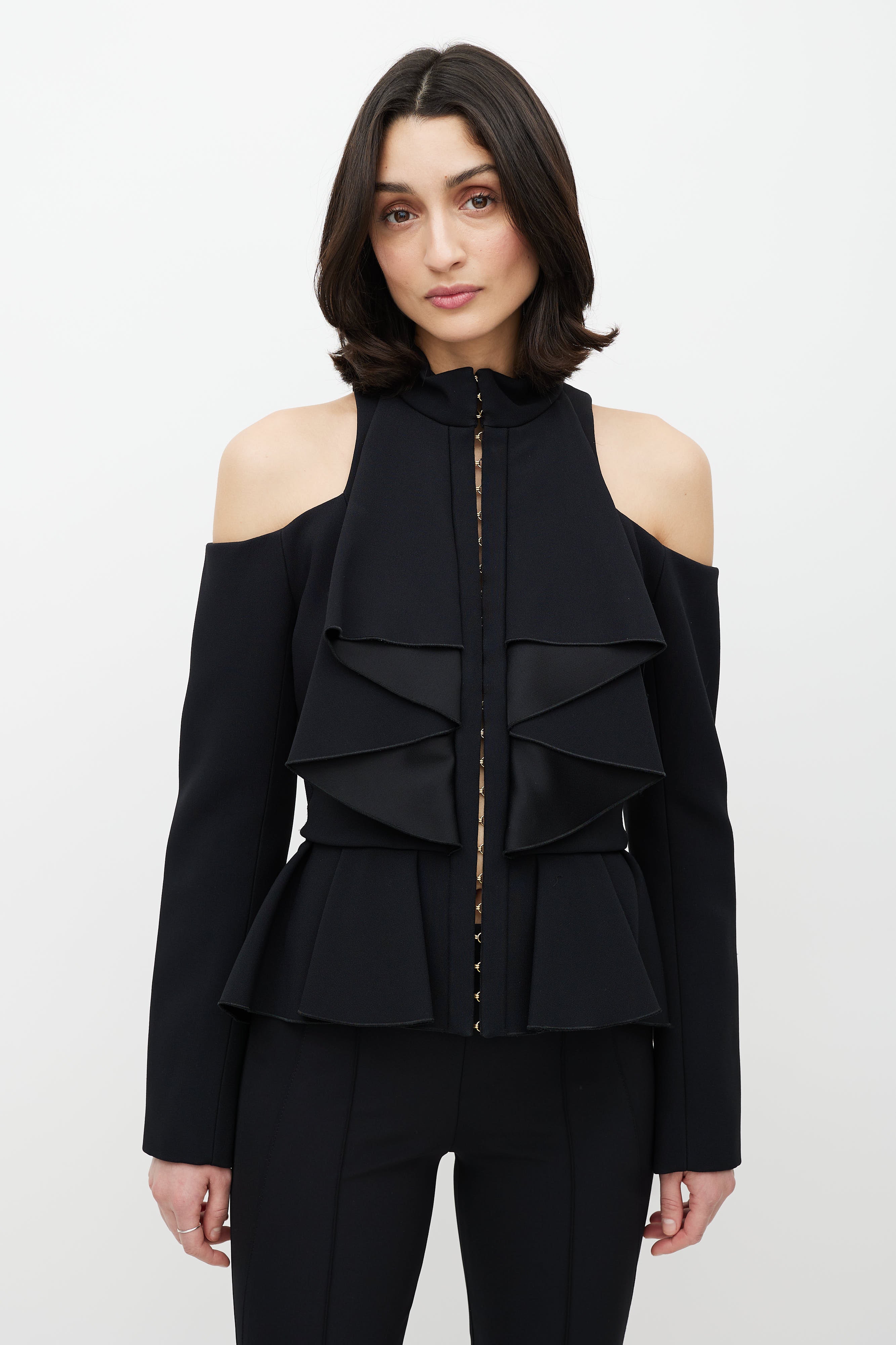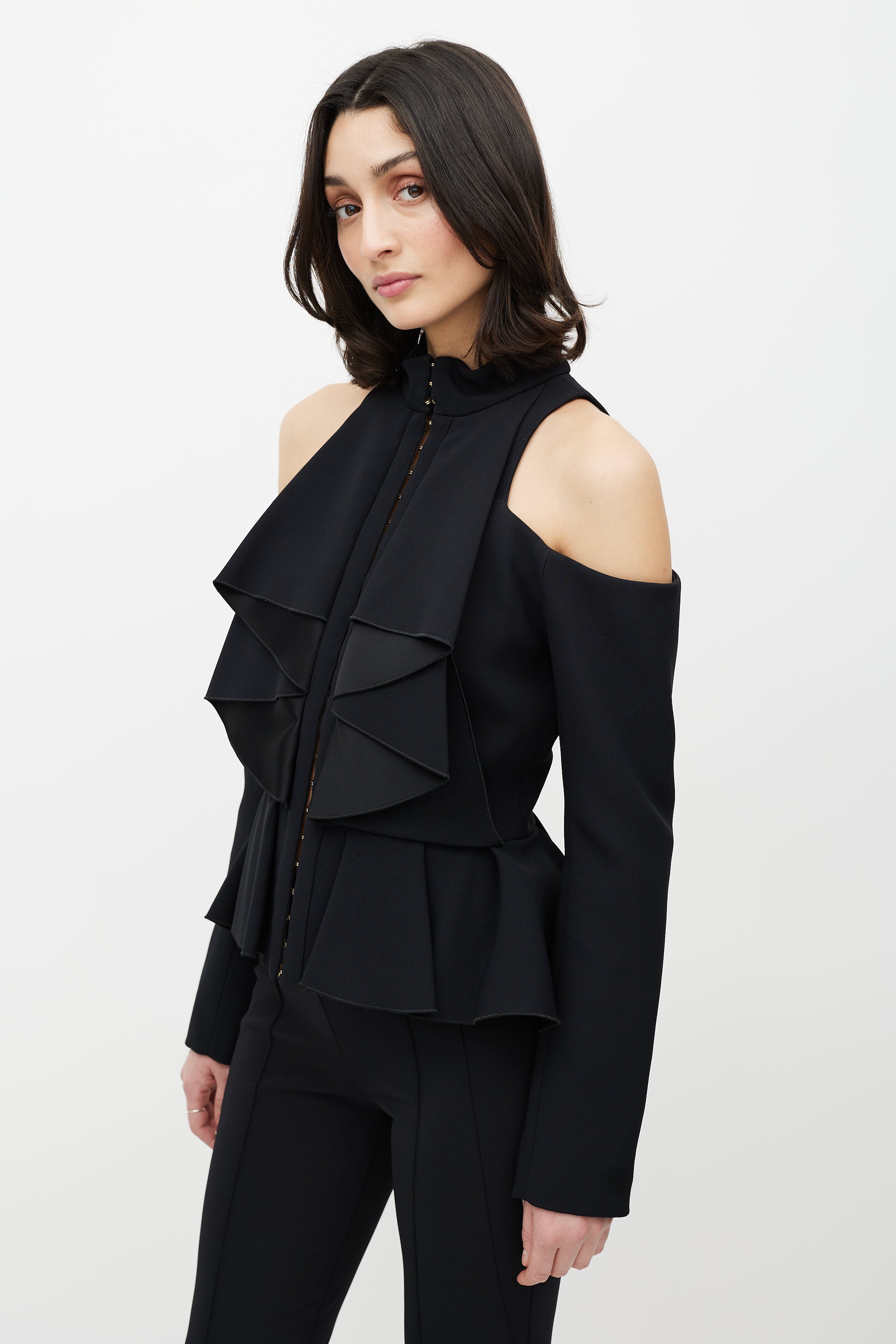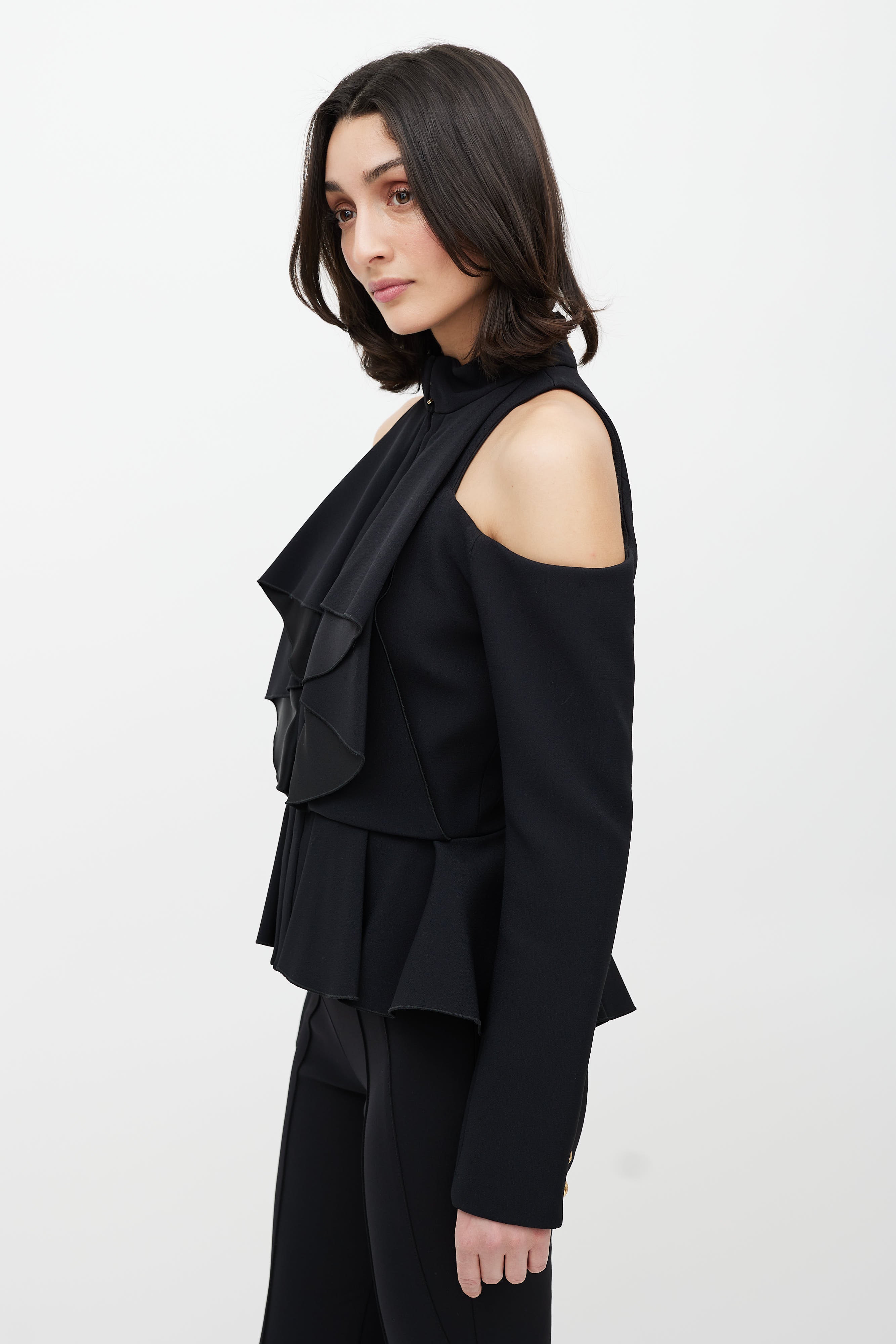 Pre-owned Balmain black top featuring a mock neck collar, off the shoulder styling, ruffled detail at front, ruffled hem, zip at back, and front hook and eye closure. Lined.