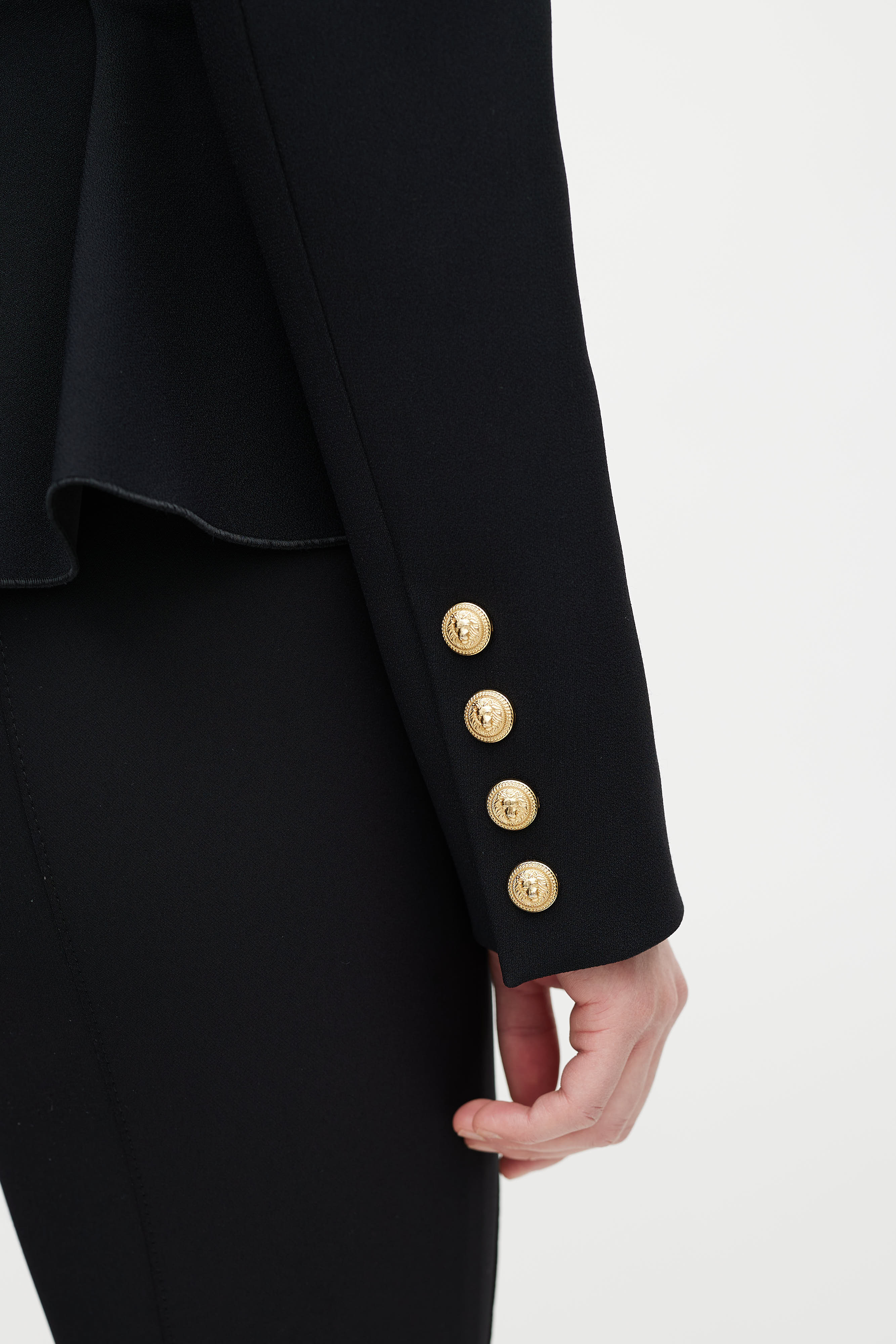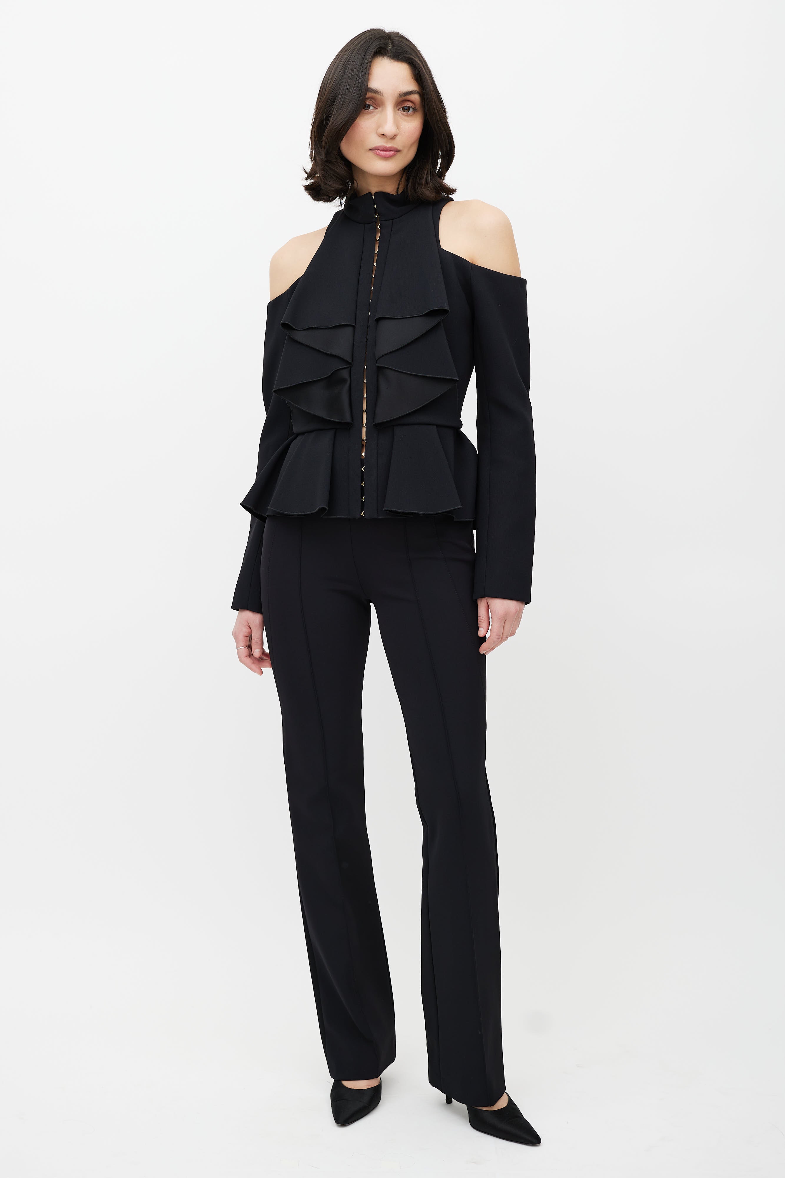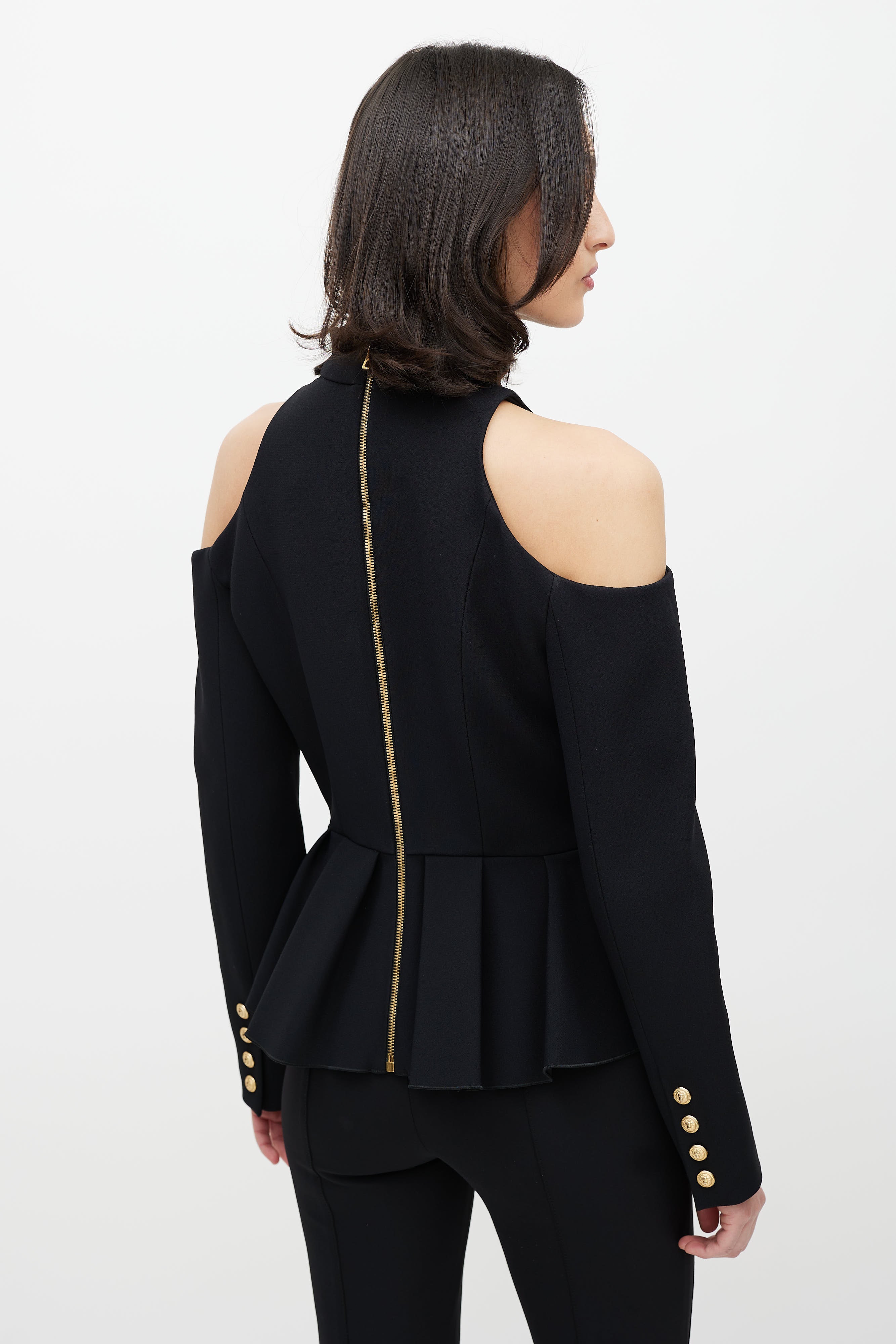 Pre-owned Balmain black top featuring a mock neck collar, off the shoulder styling, ruffled detail at front, ruffled hem, zip at back, and front hook and eye closure. Lined.