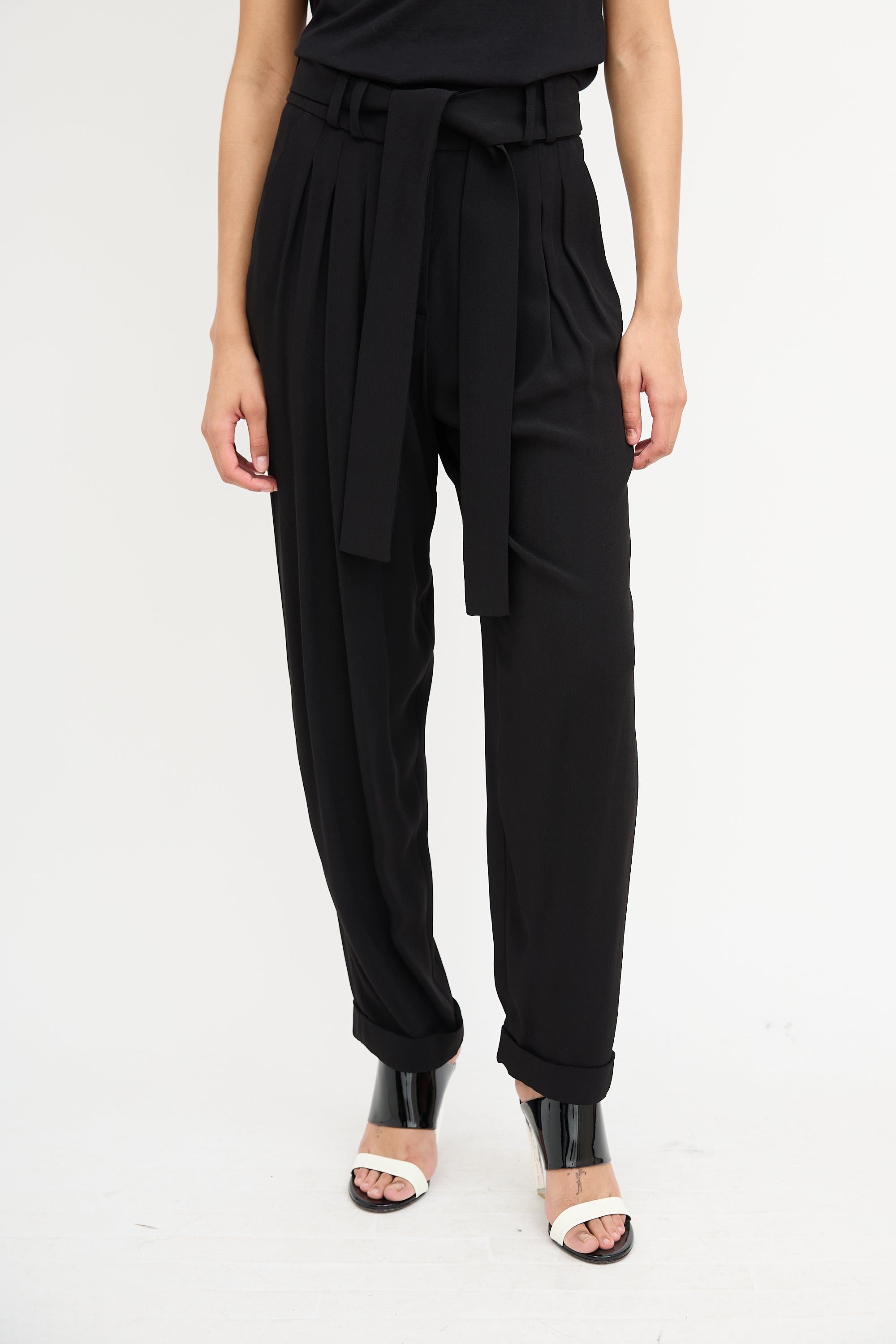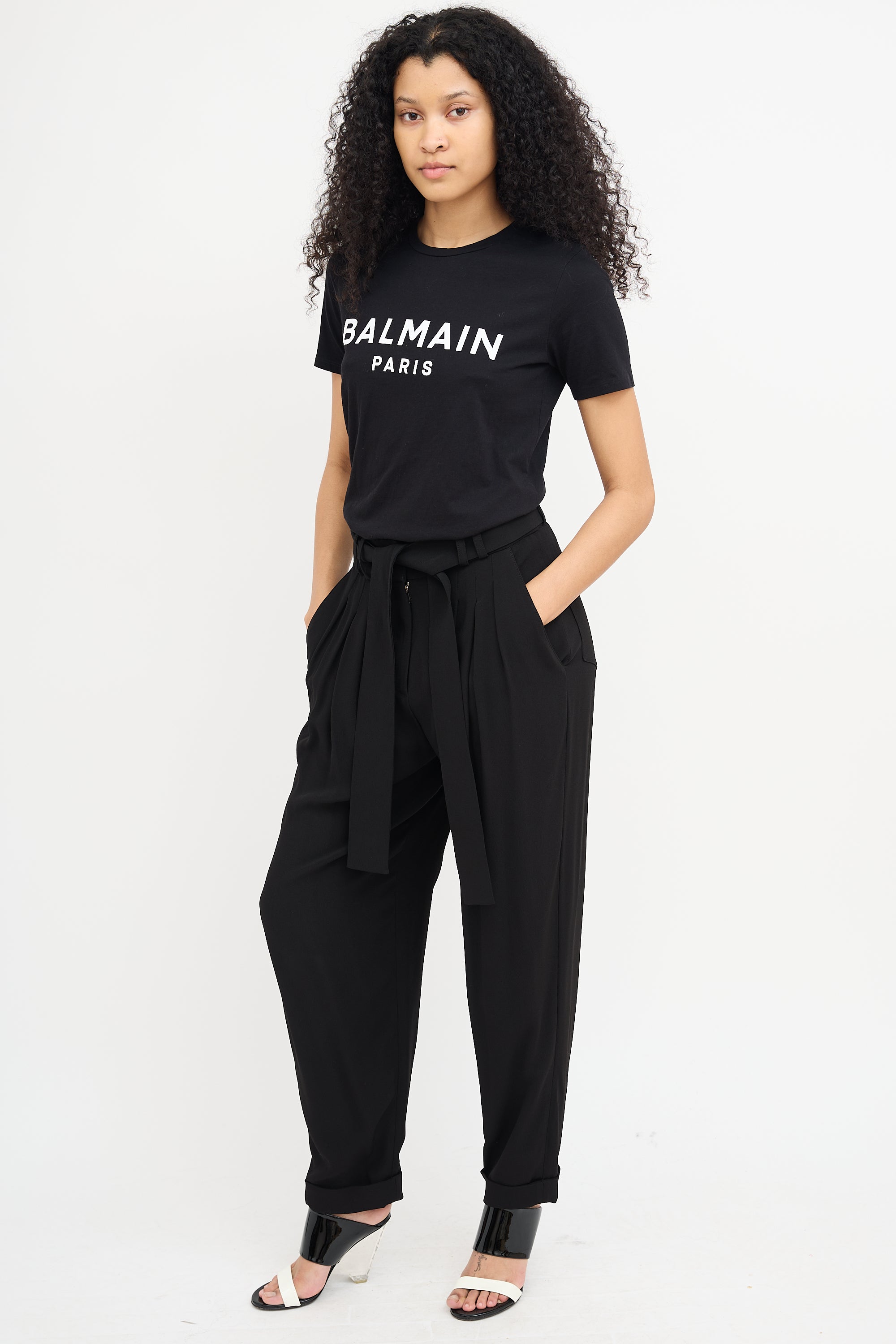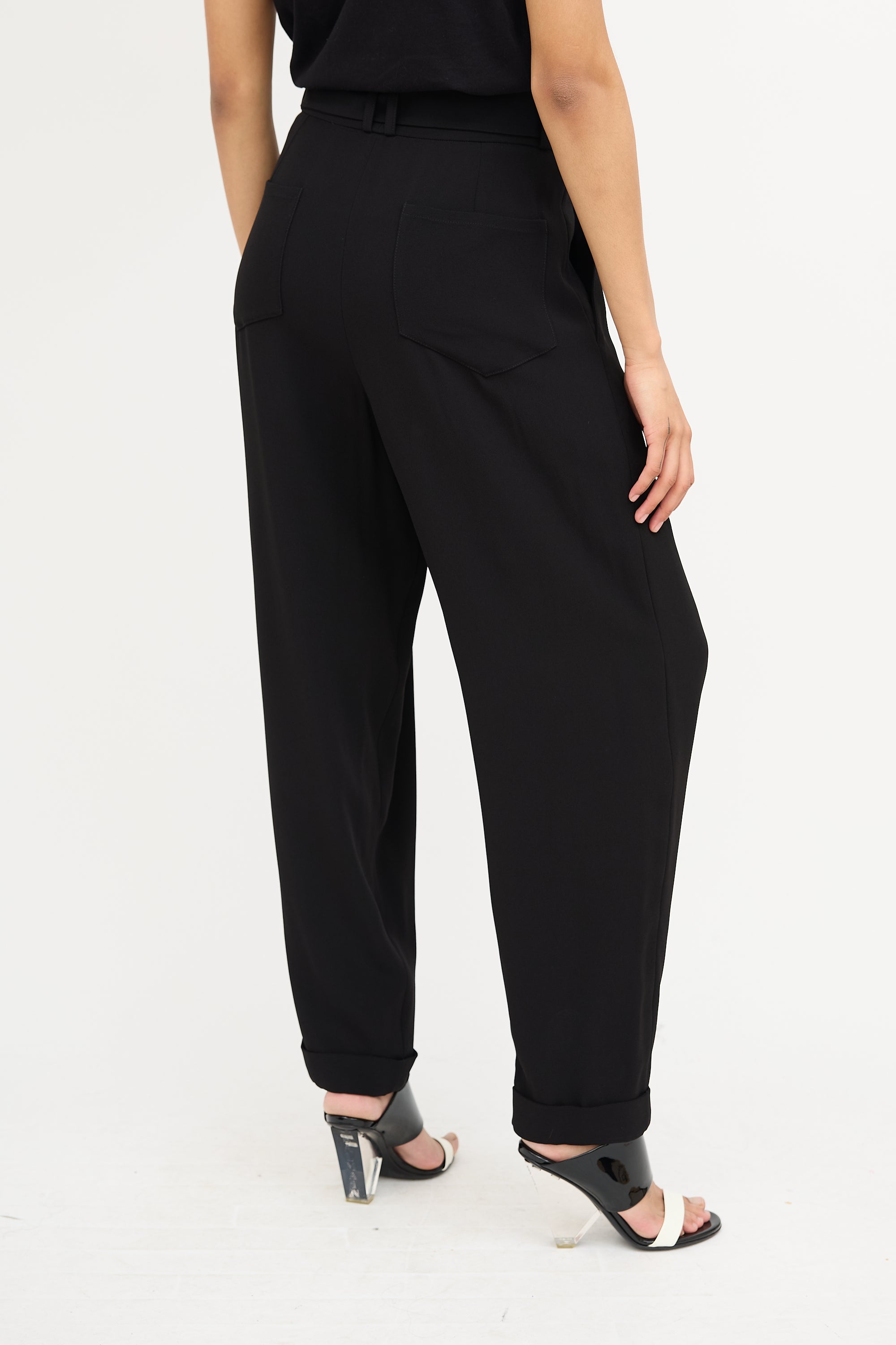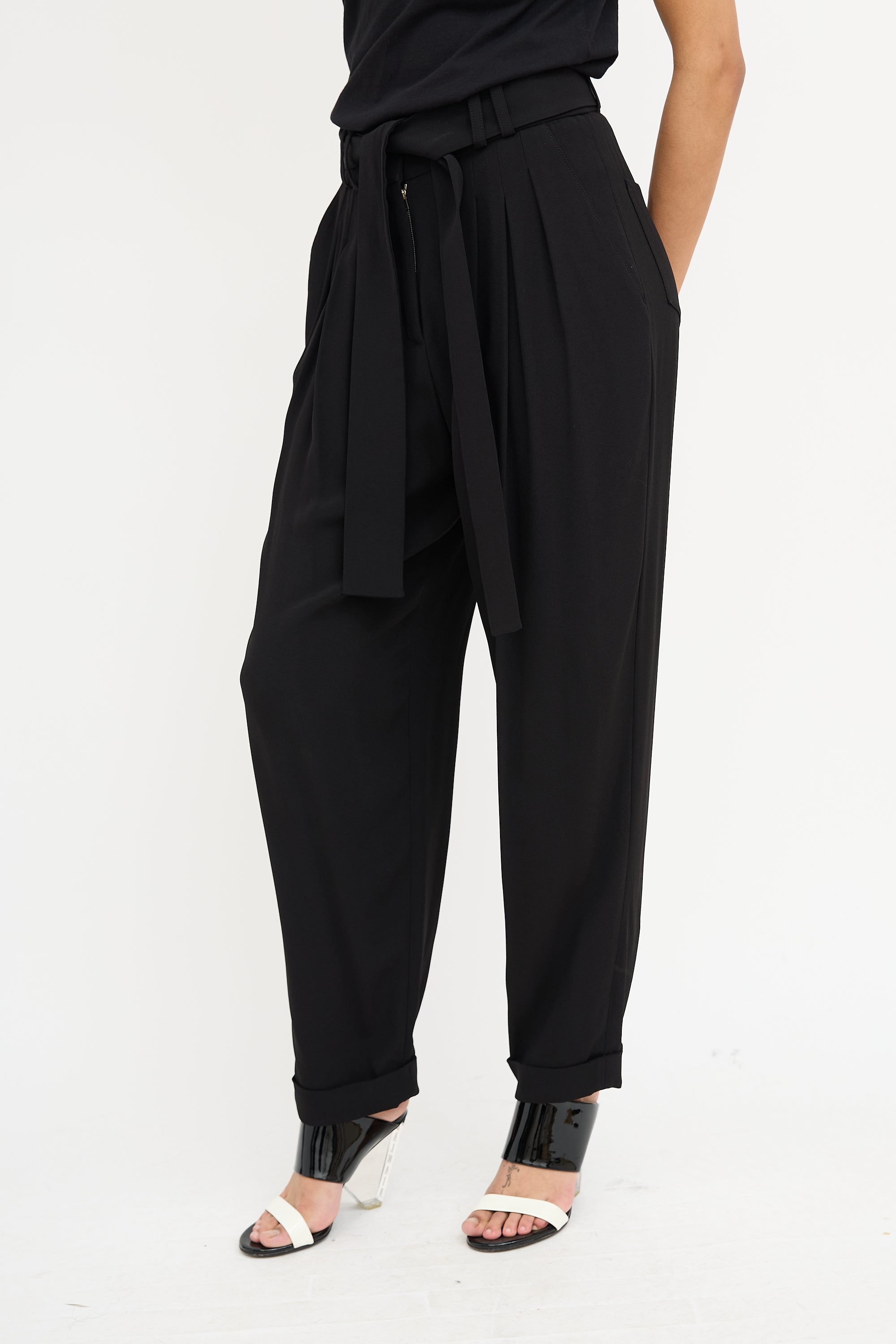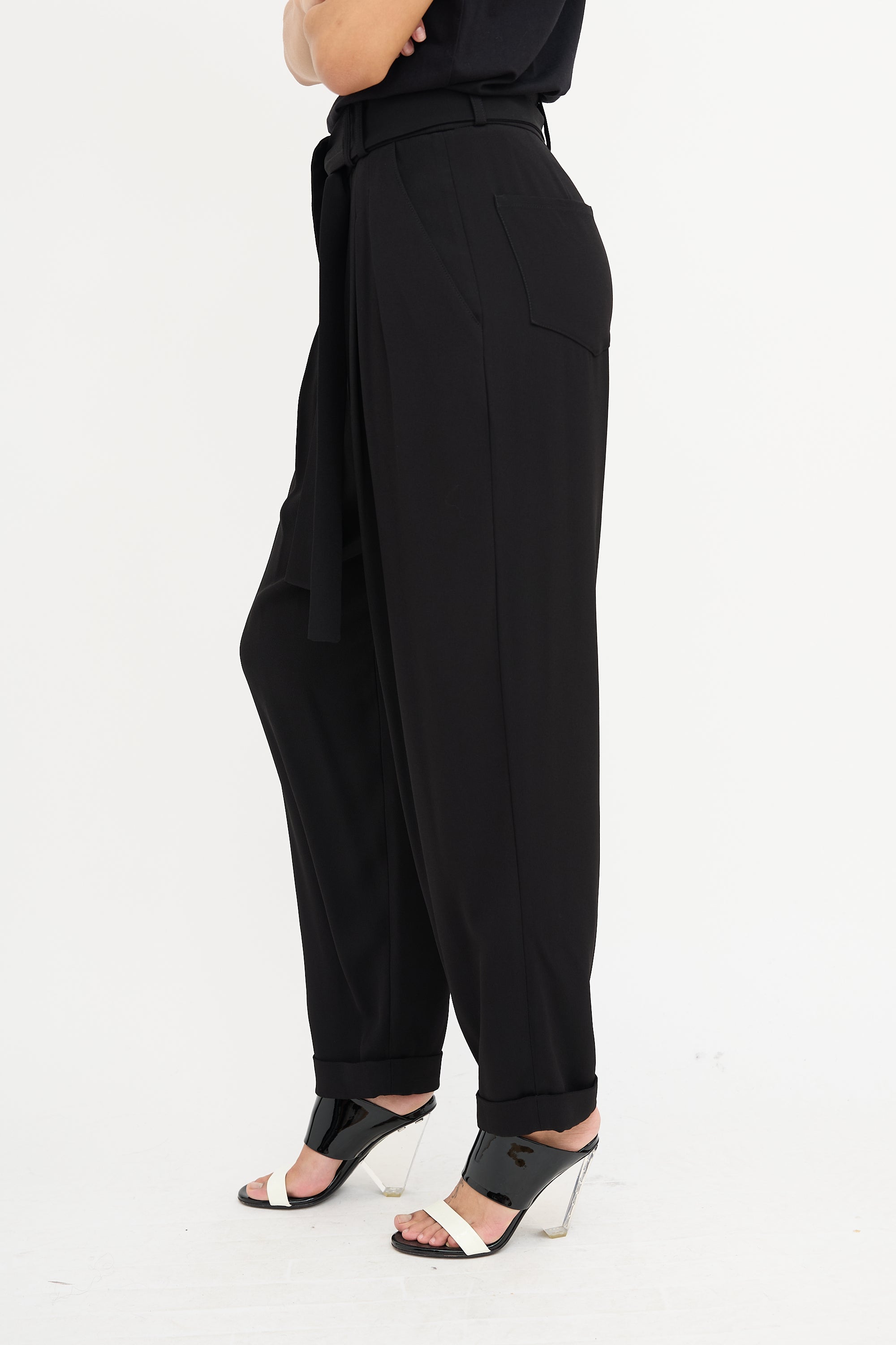 Pre-owned Balmain black trouser featuring belt loops with detachable belt tie, zip fly with hook and eye fastening, two slash pockets at hips, two patch pockets at back, pleated waist, and tapered cuffed leg.