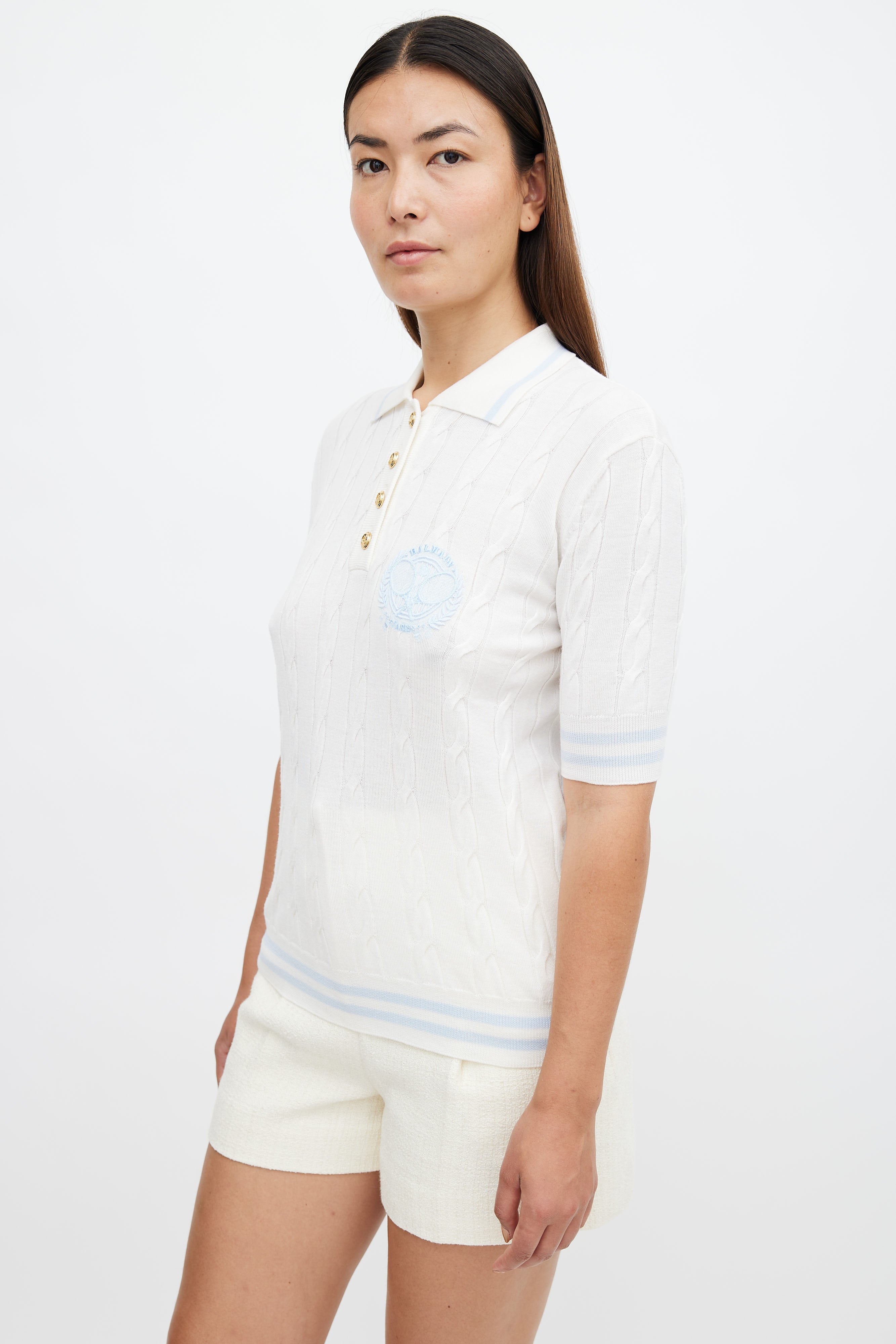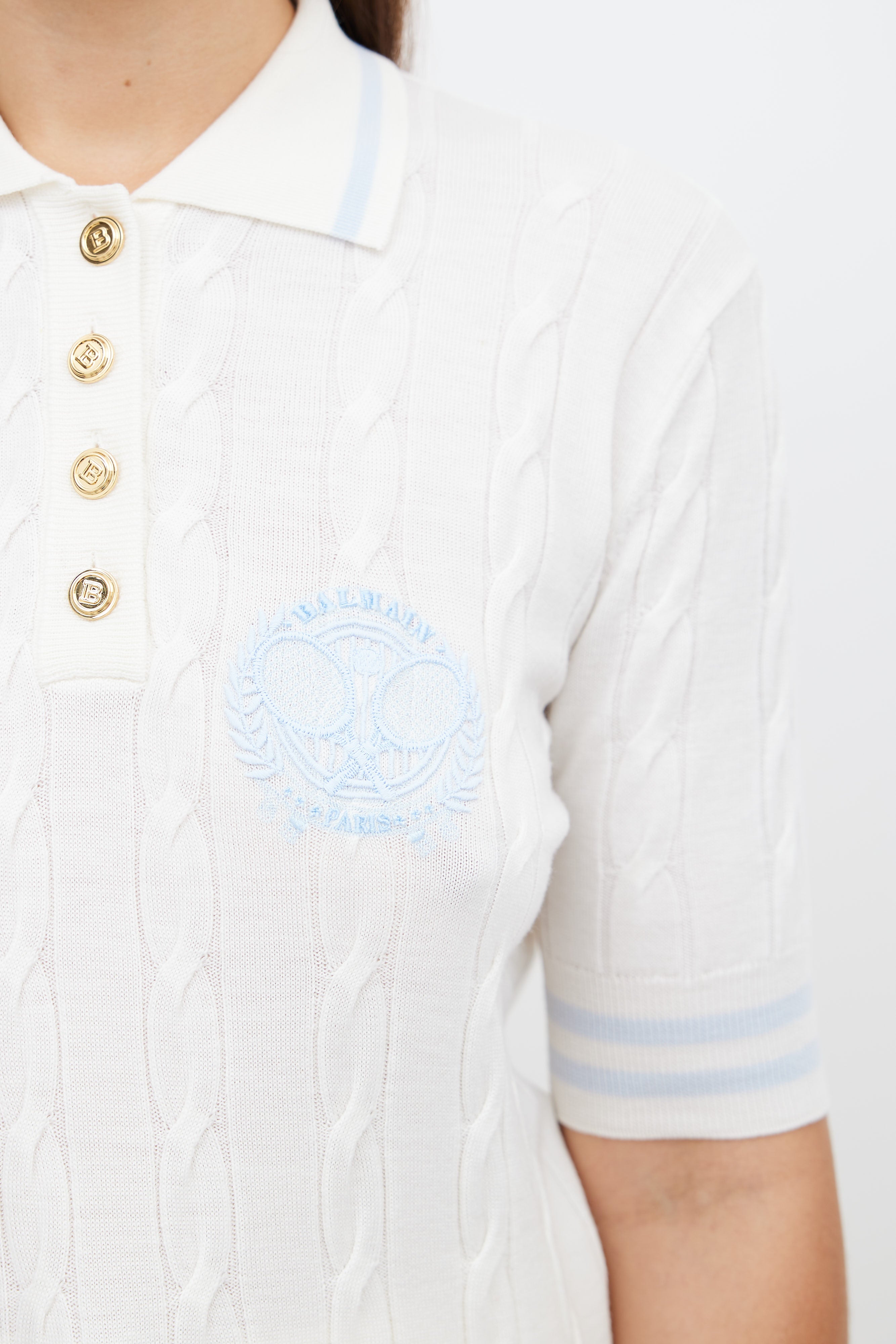 Pre-owned Balmain white oversized polo featuring classic collar, gold tone crest buttons closure, white and blue stripes ribbed knit, cable knit, and embroidered chest logo.