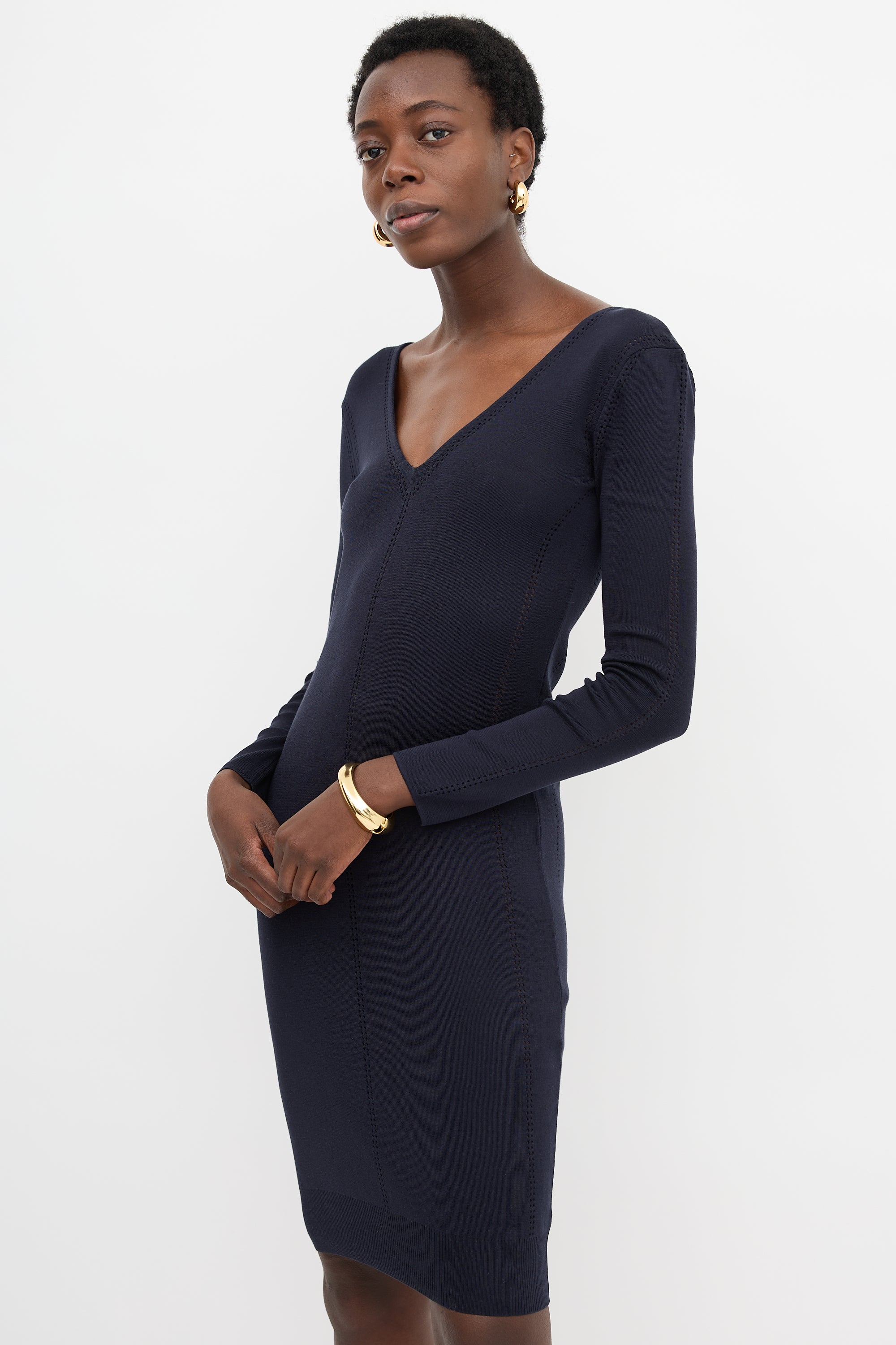 Pre-owned Bottega Veneta navy jersey midi dress featuring deep V-neckline and back, eyelet detail, and ribbed hem.
