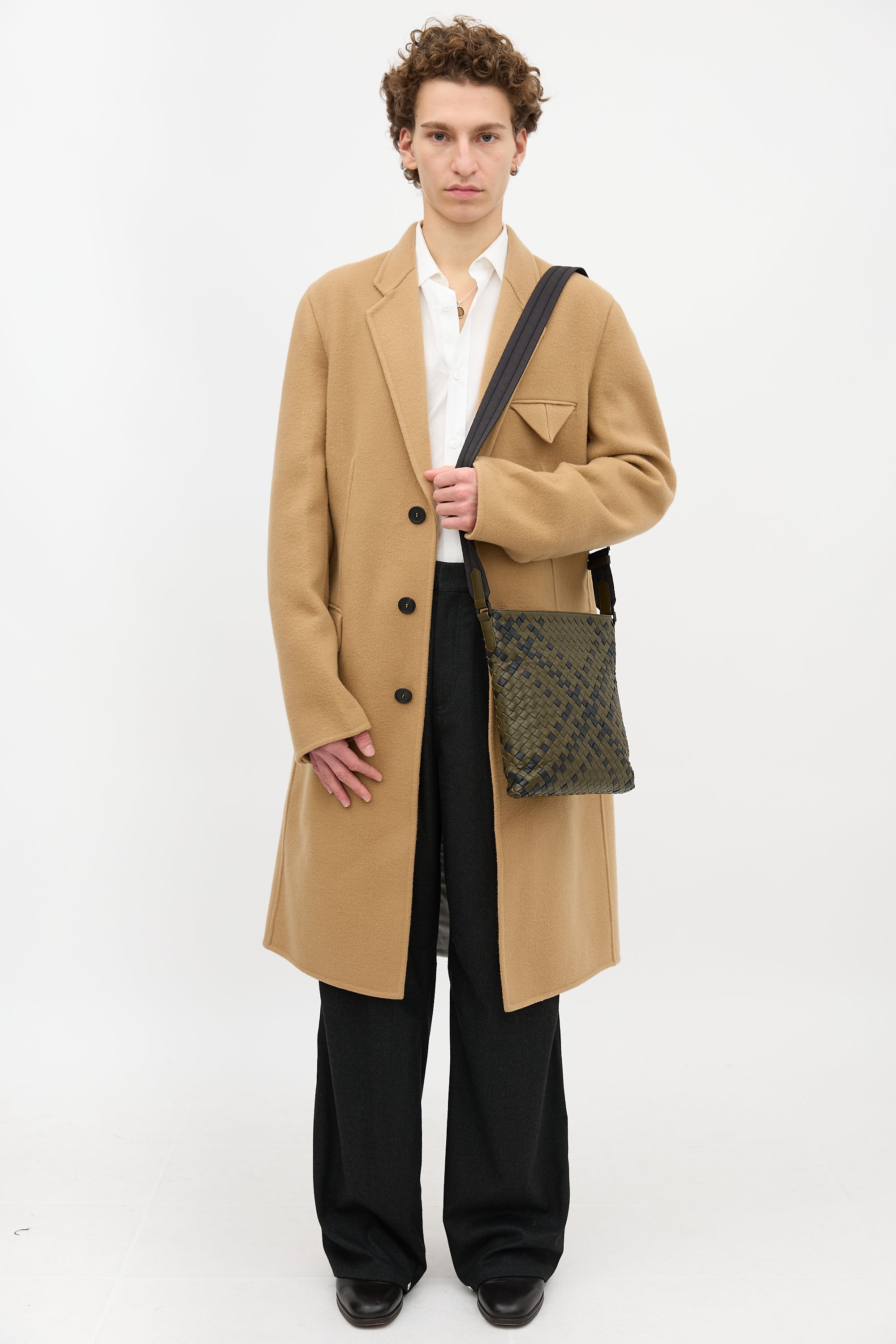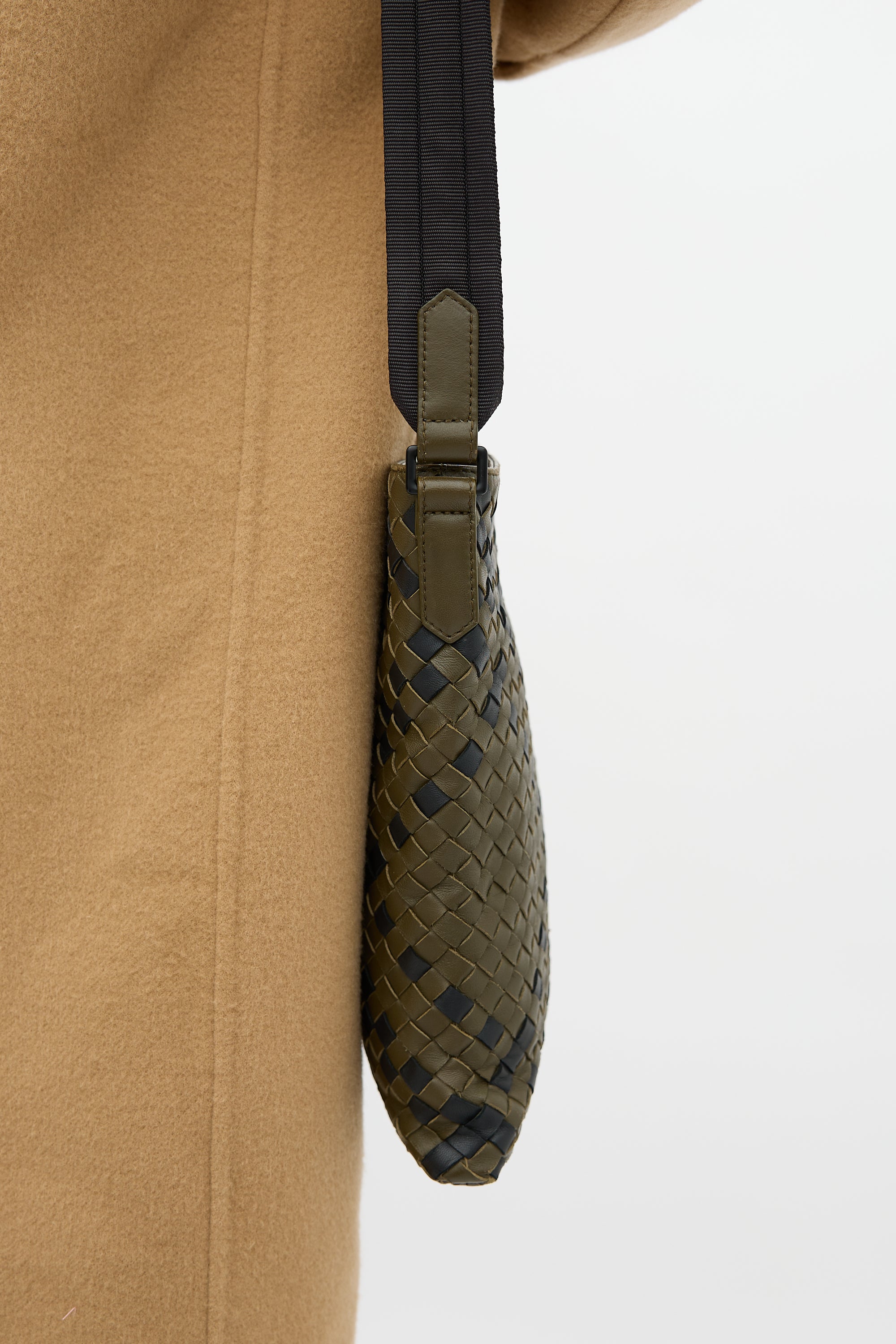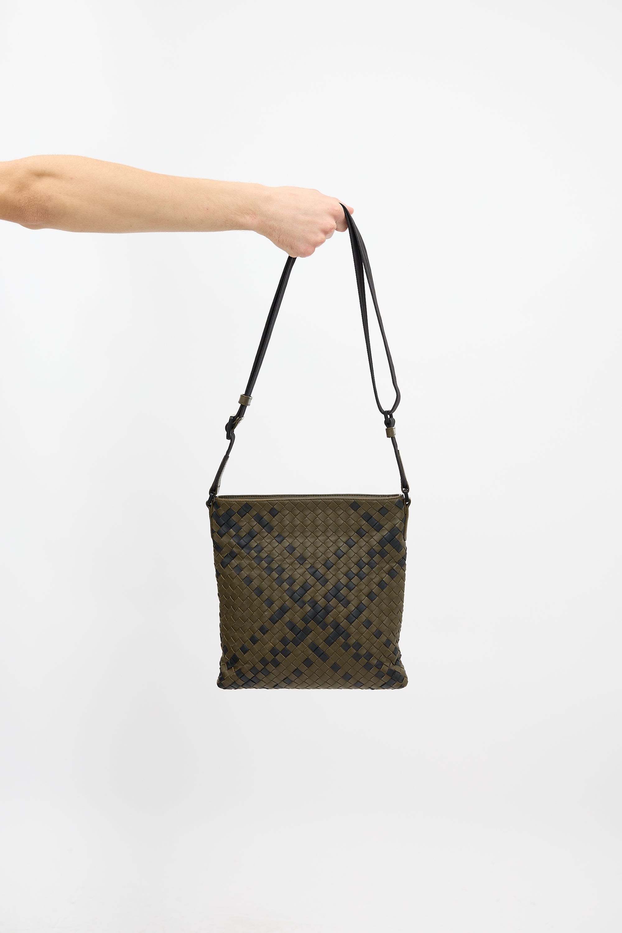 Pre-owned Bottega Veneta green and black Intrecciato leather messenger bag featuring an adjustable grosgrain shoulder strap, top zip closure, one main compartment, and two interior slip pockets.