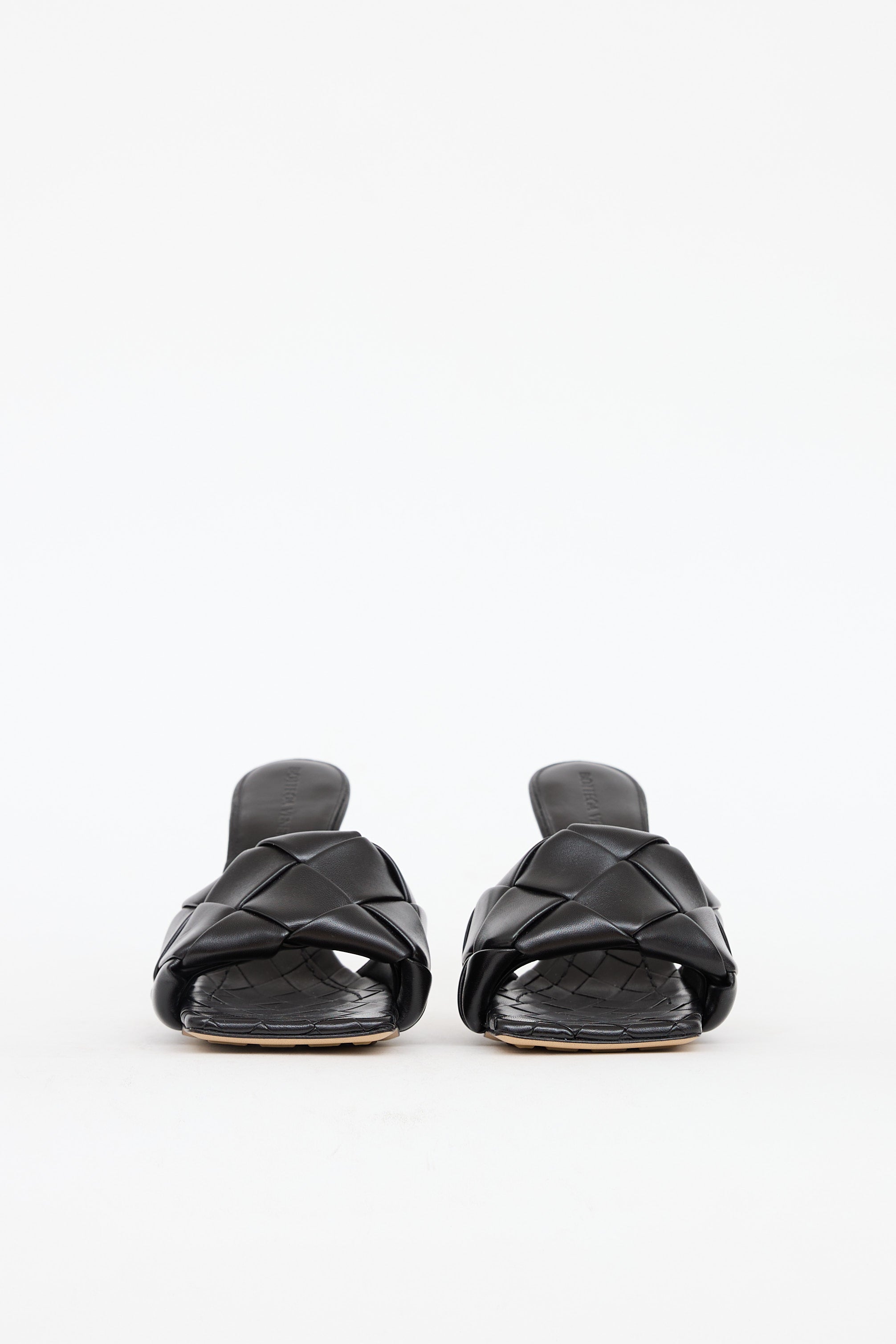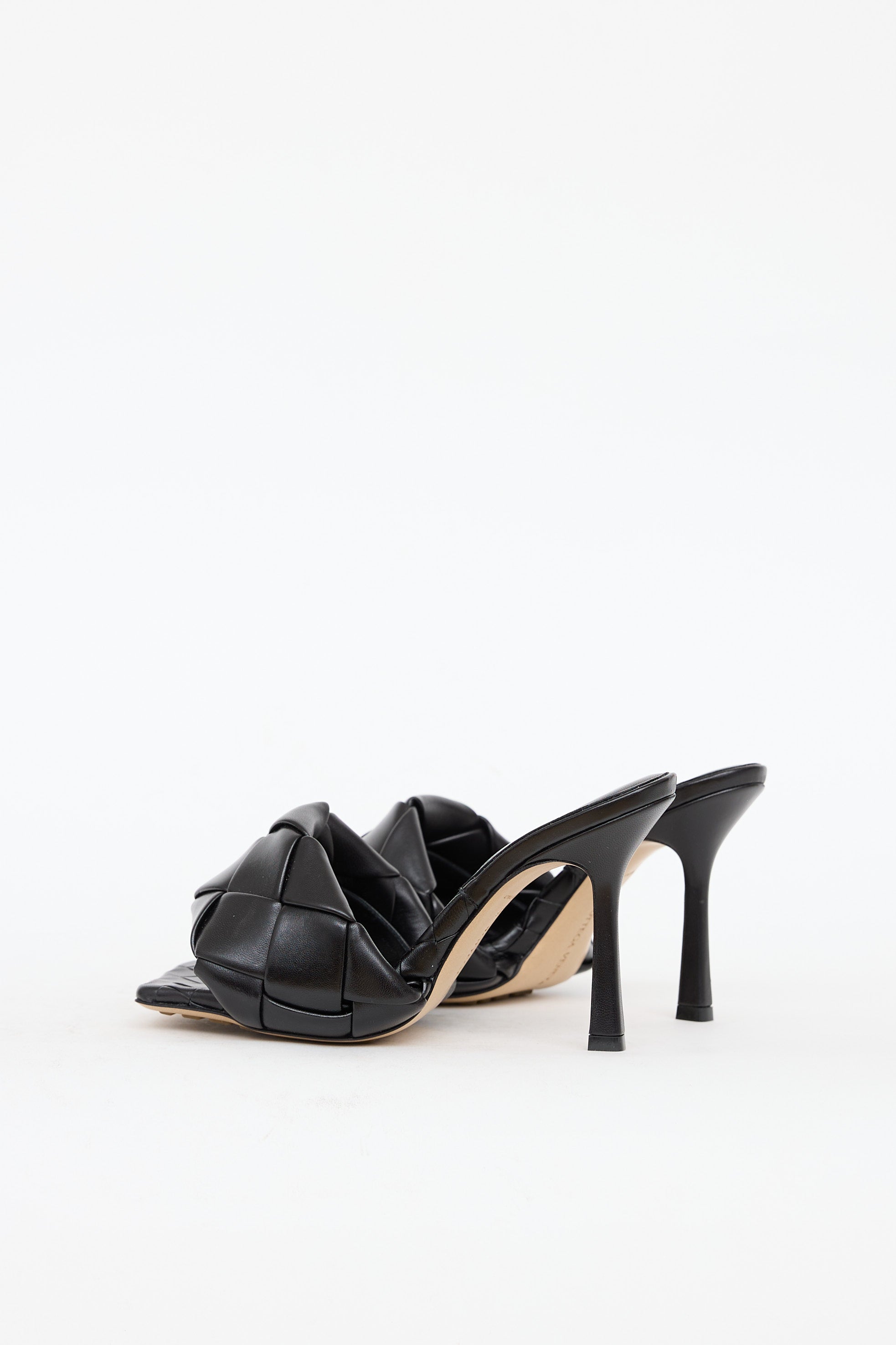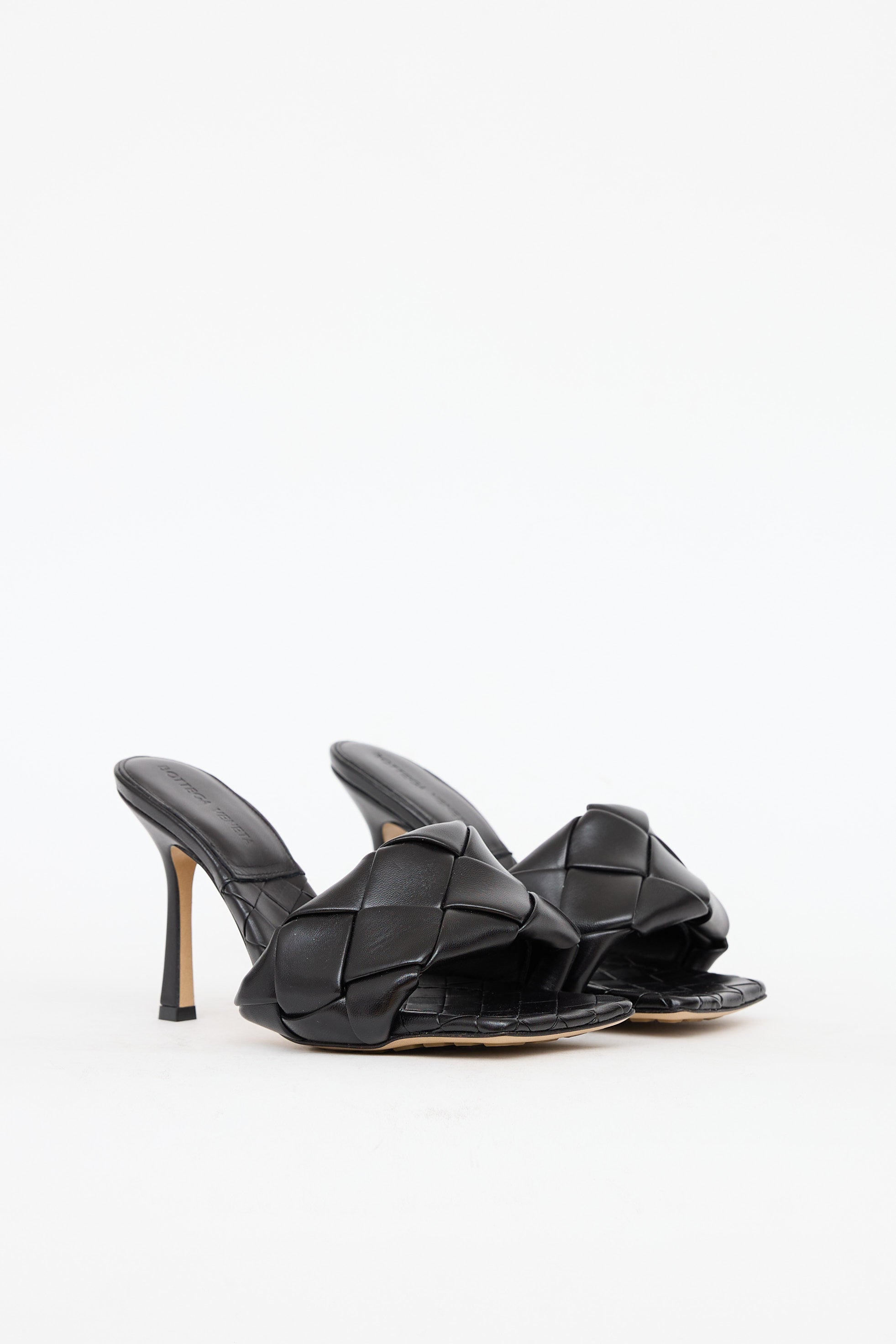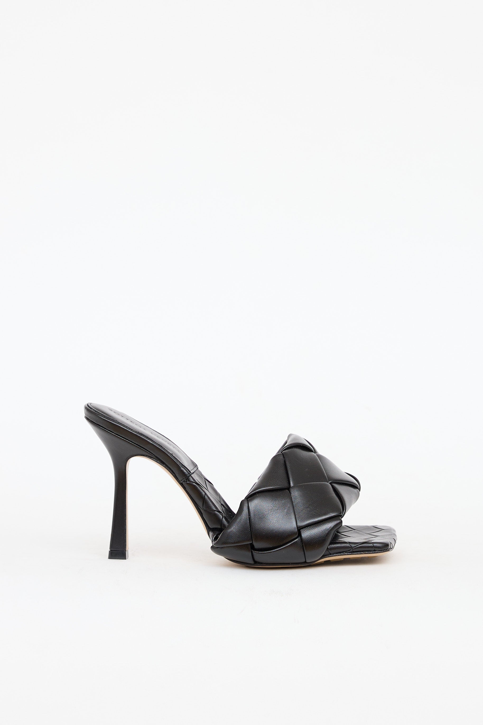 Pre-owned Bottega Veneta black woven Lido mules featuring a square toe, padded strap at vamp, and wrapped stiletto heel.
