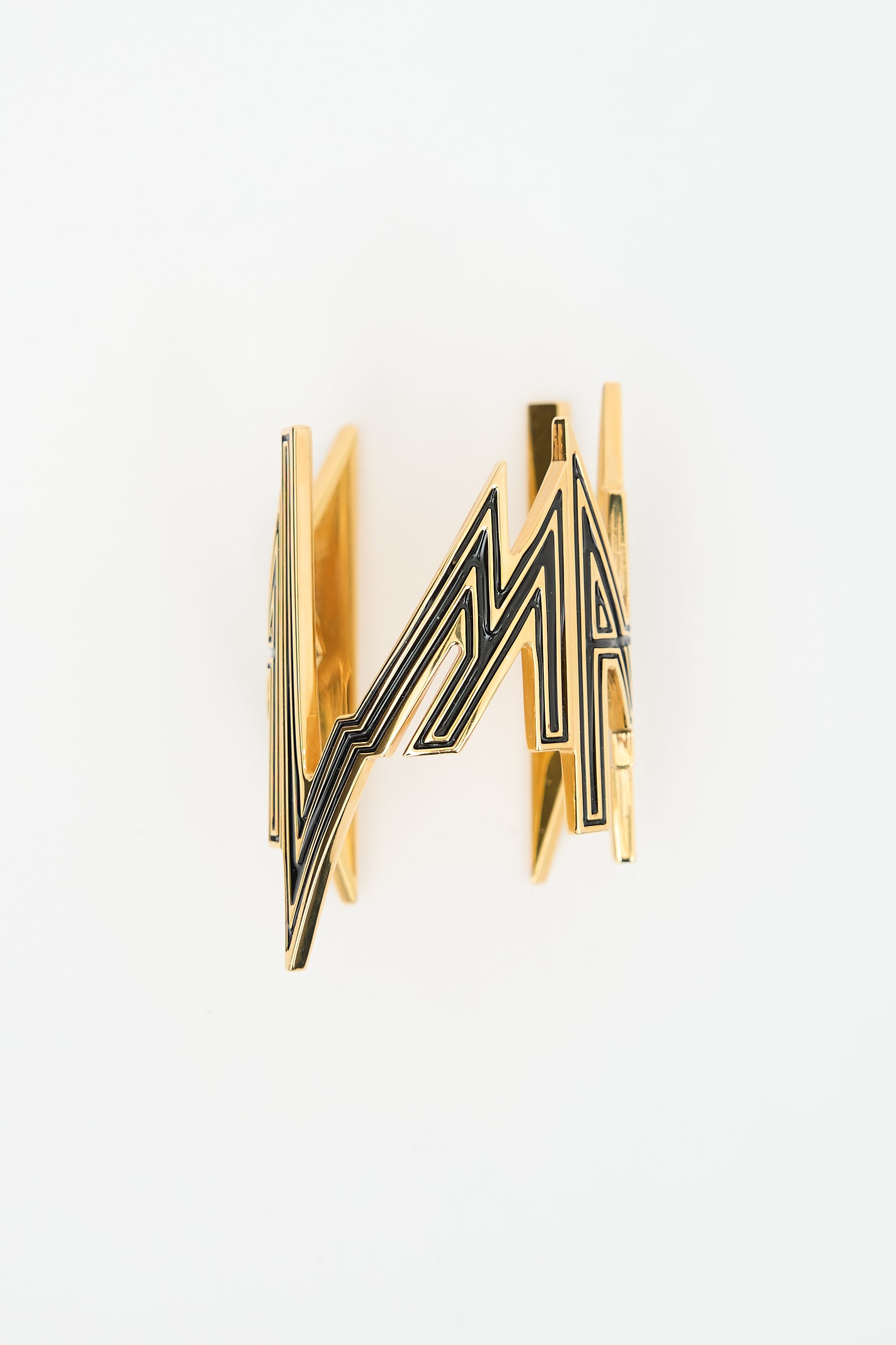Pre-owned Balmain gold tone cuff bracelet featuring black enamel inlay and logo motif. Comes with original dust bag.