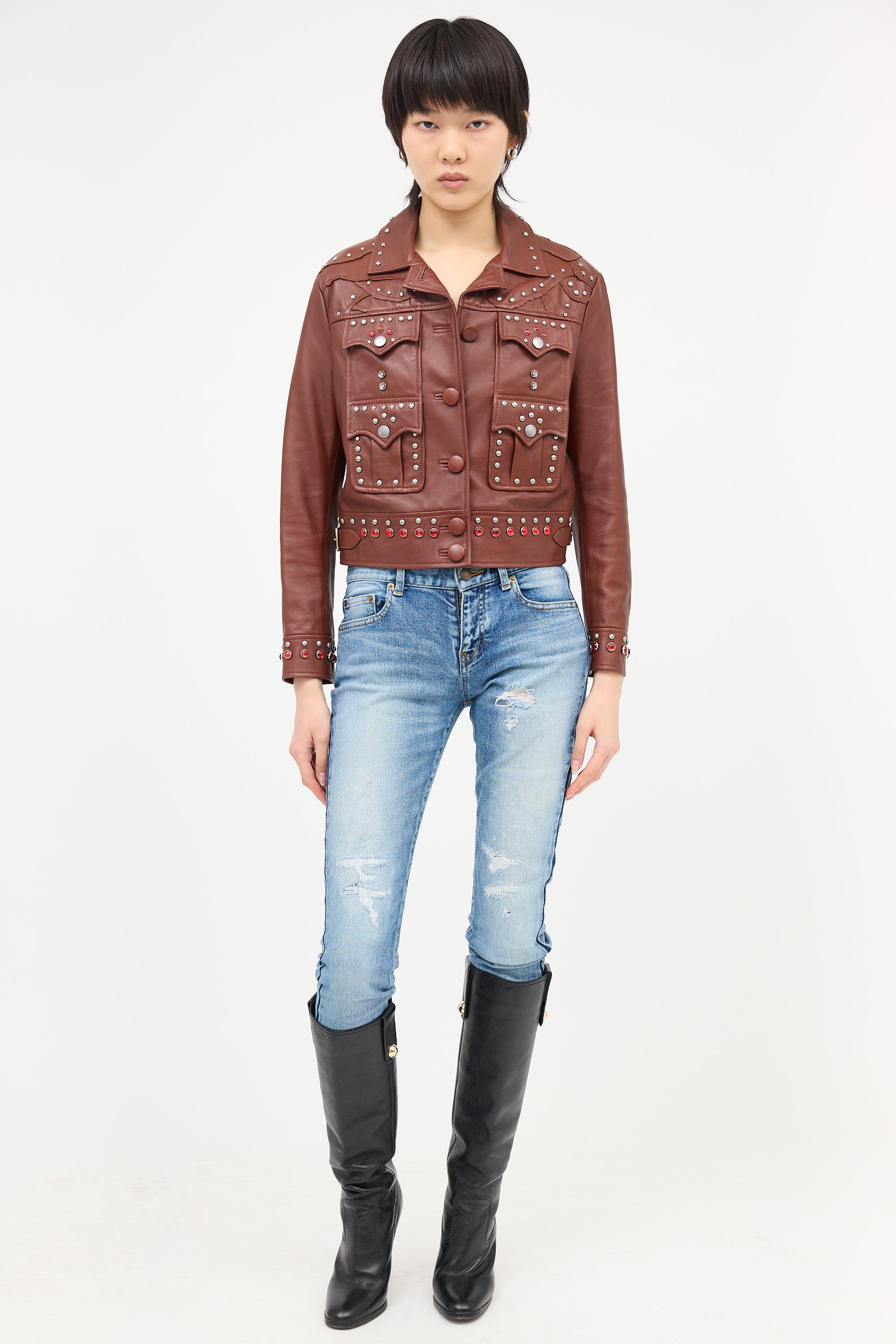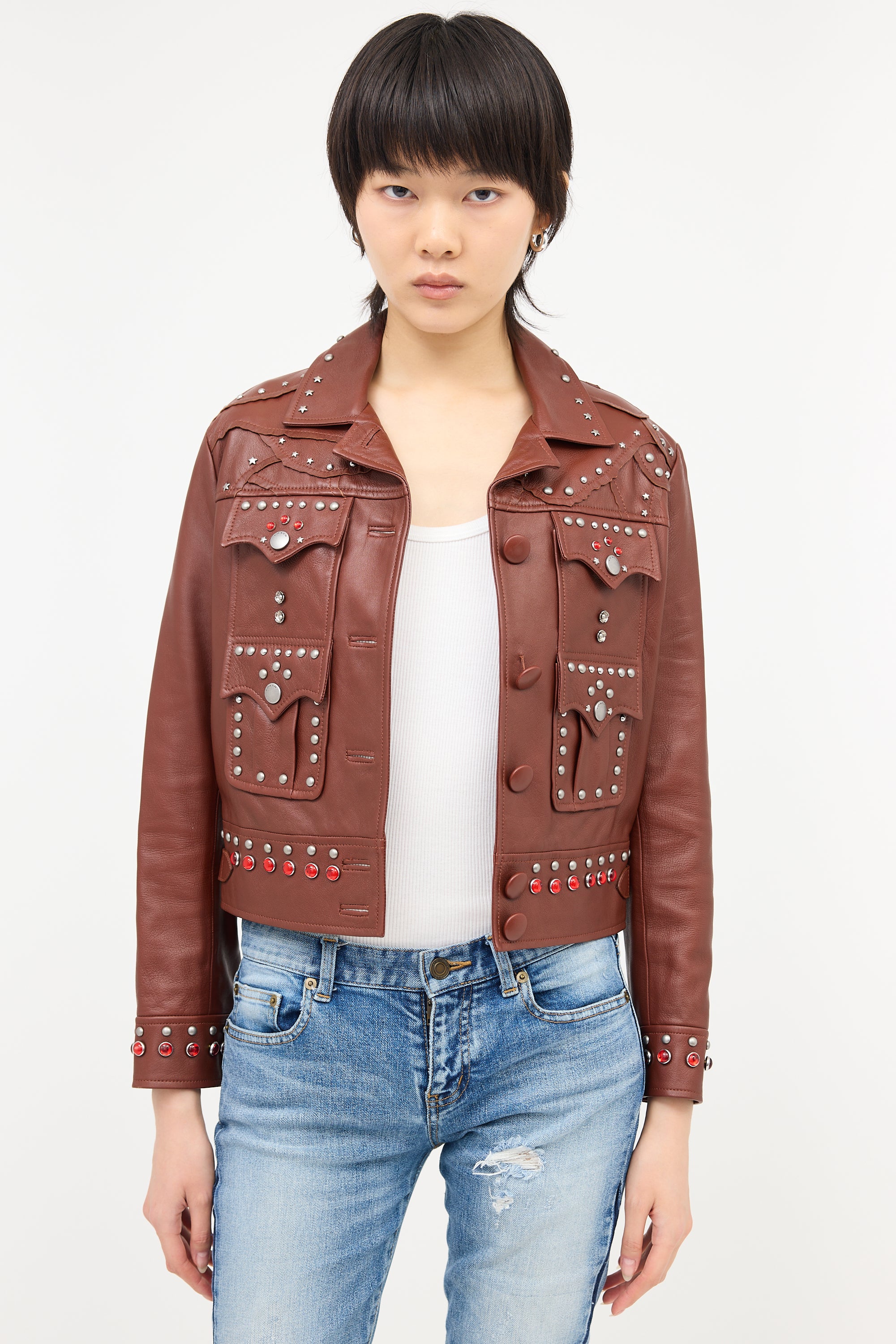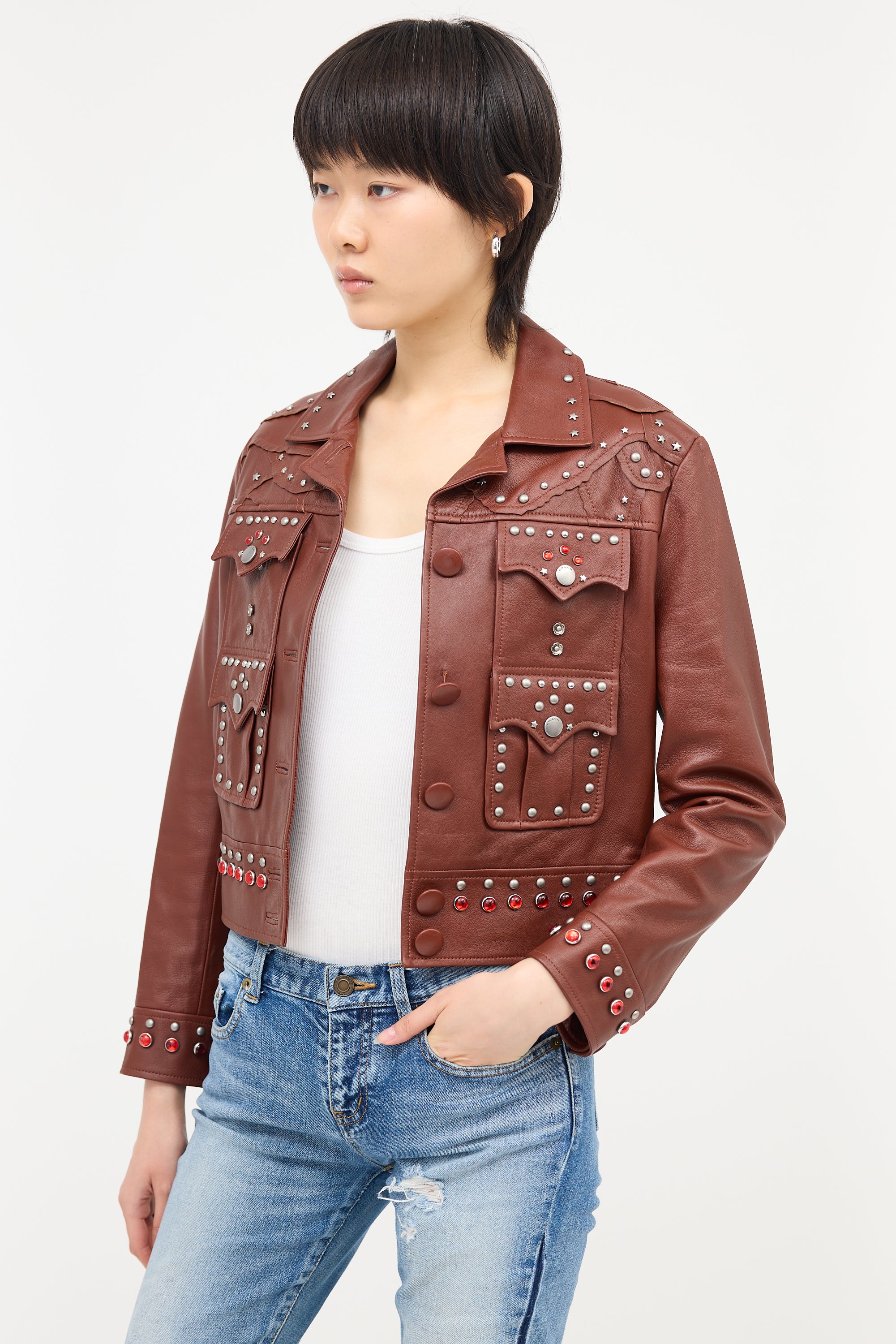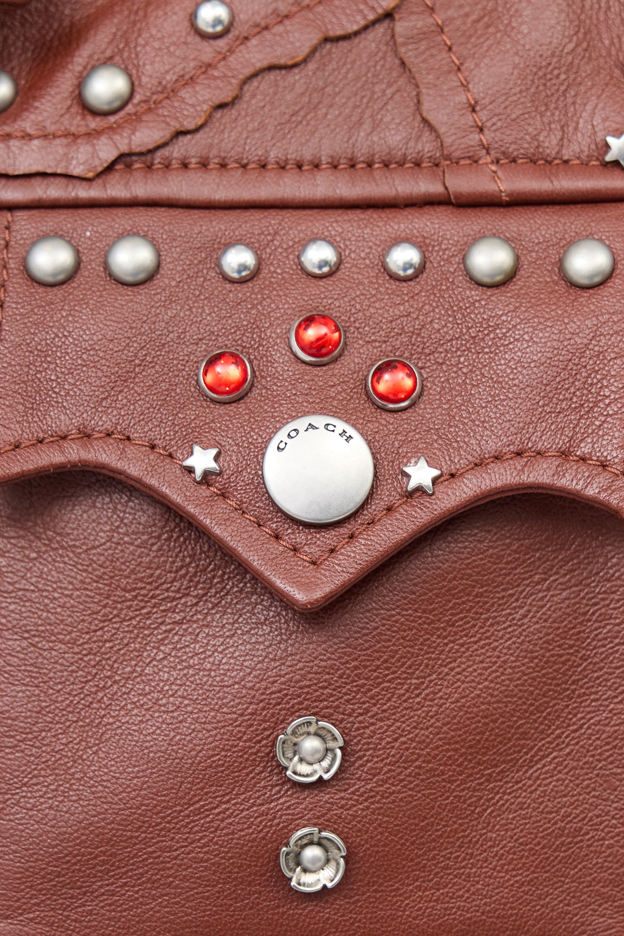 Pre-owned Coach Fall 2017 brown leather jacket featuring a point collar, silver tone and red accent studs throughout, button front, four buttoned flap pockets at front, adjustable buckle waist, two slip pockets, and buttoned cuffs. Lined.