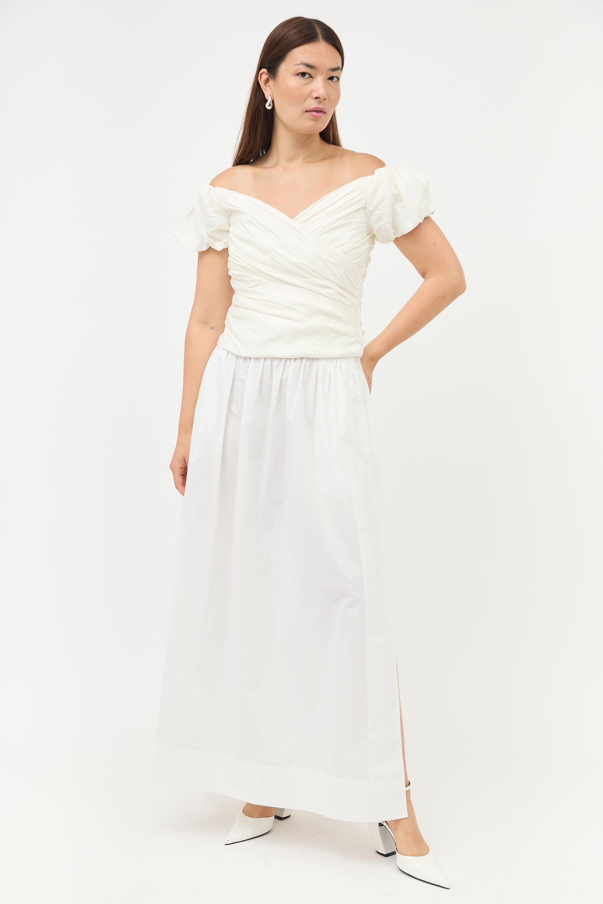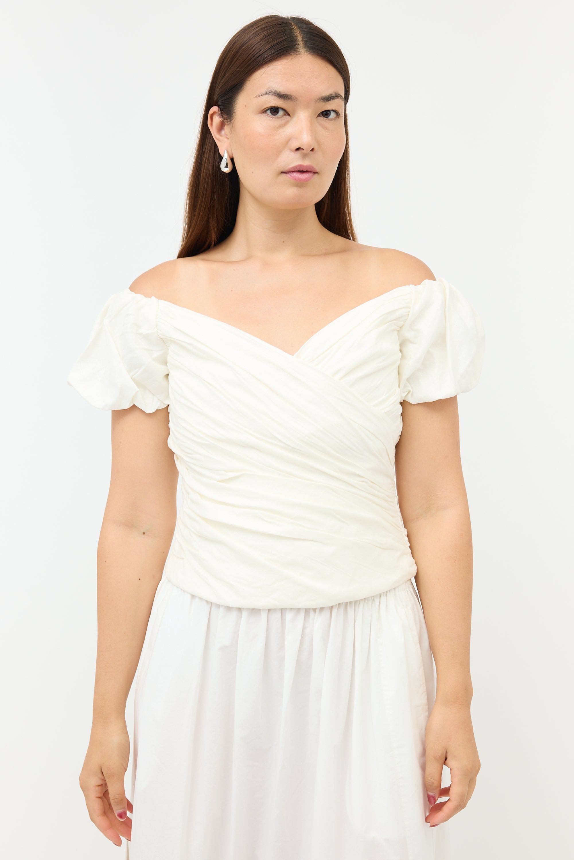 Cult Gaia cream linen blend Helene top featuring a sweetheart neckline, short puff sleeves, wrap front styling, ruched gathered throughout, back zip closure, and interior boning. Lined.