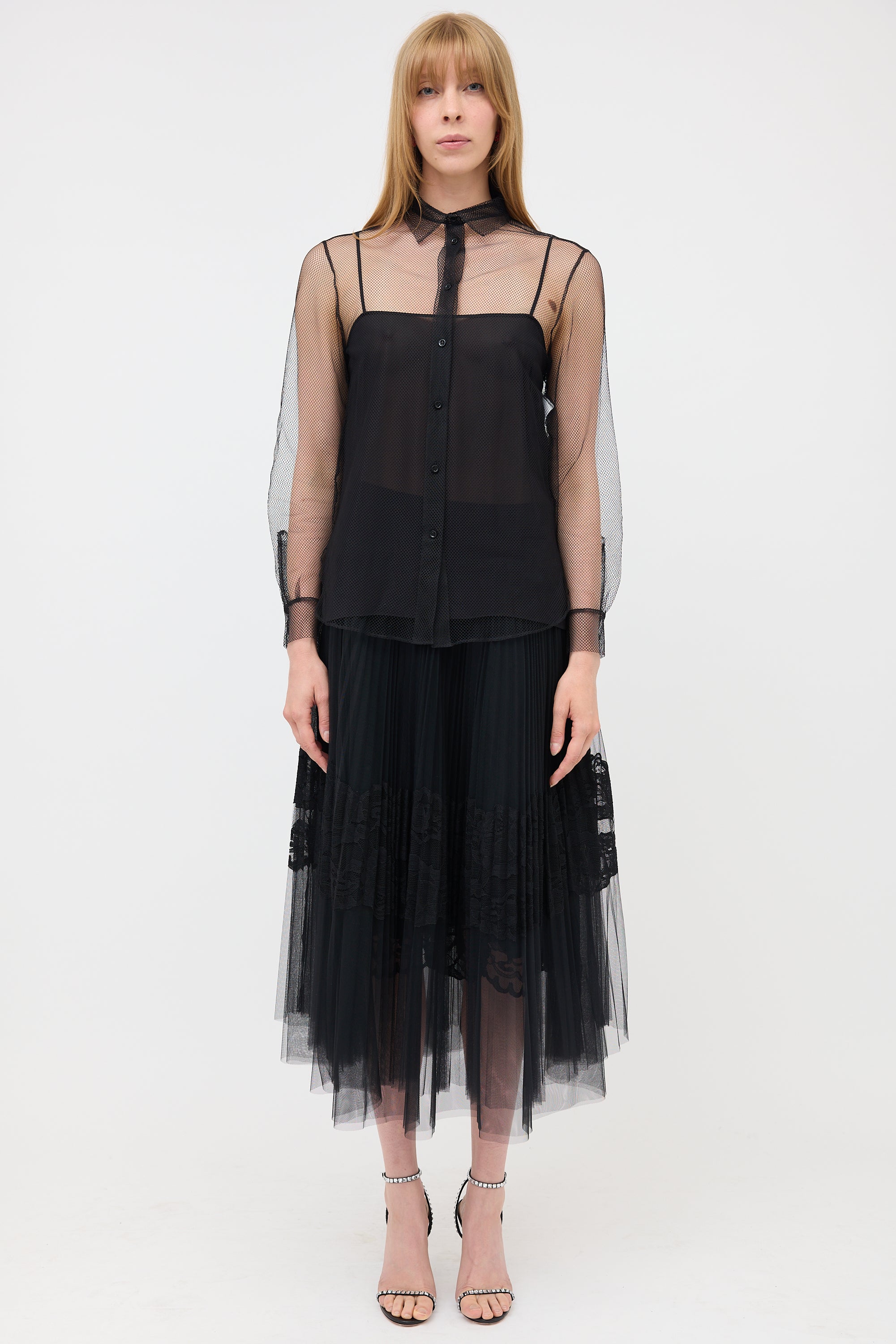 Pre-owned Christian Dior Fall 2020 black mesh shirt featuring spread collar, button front, and tonal silk slip. Comes with original box.