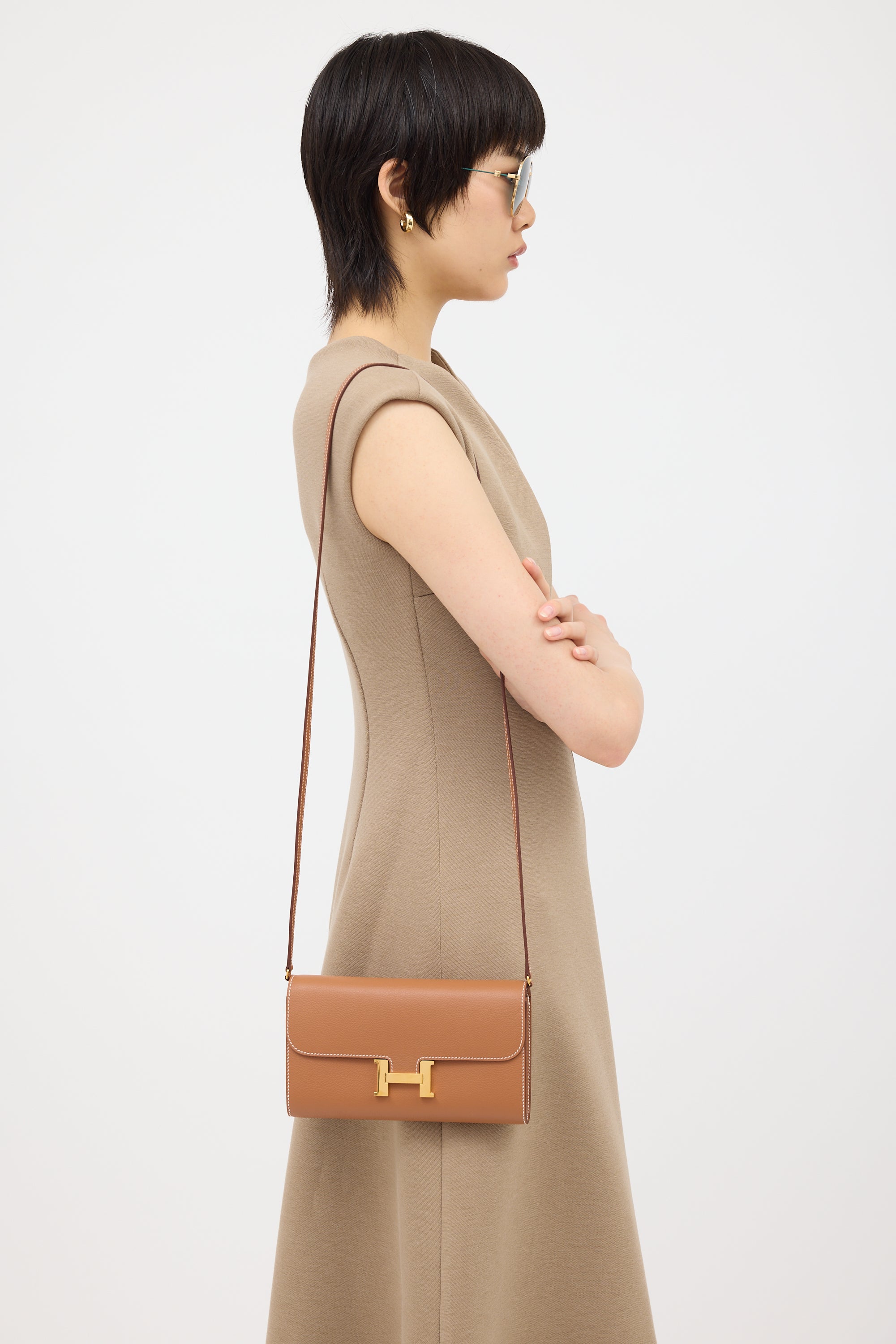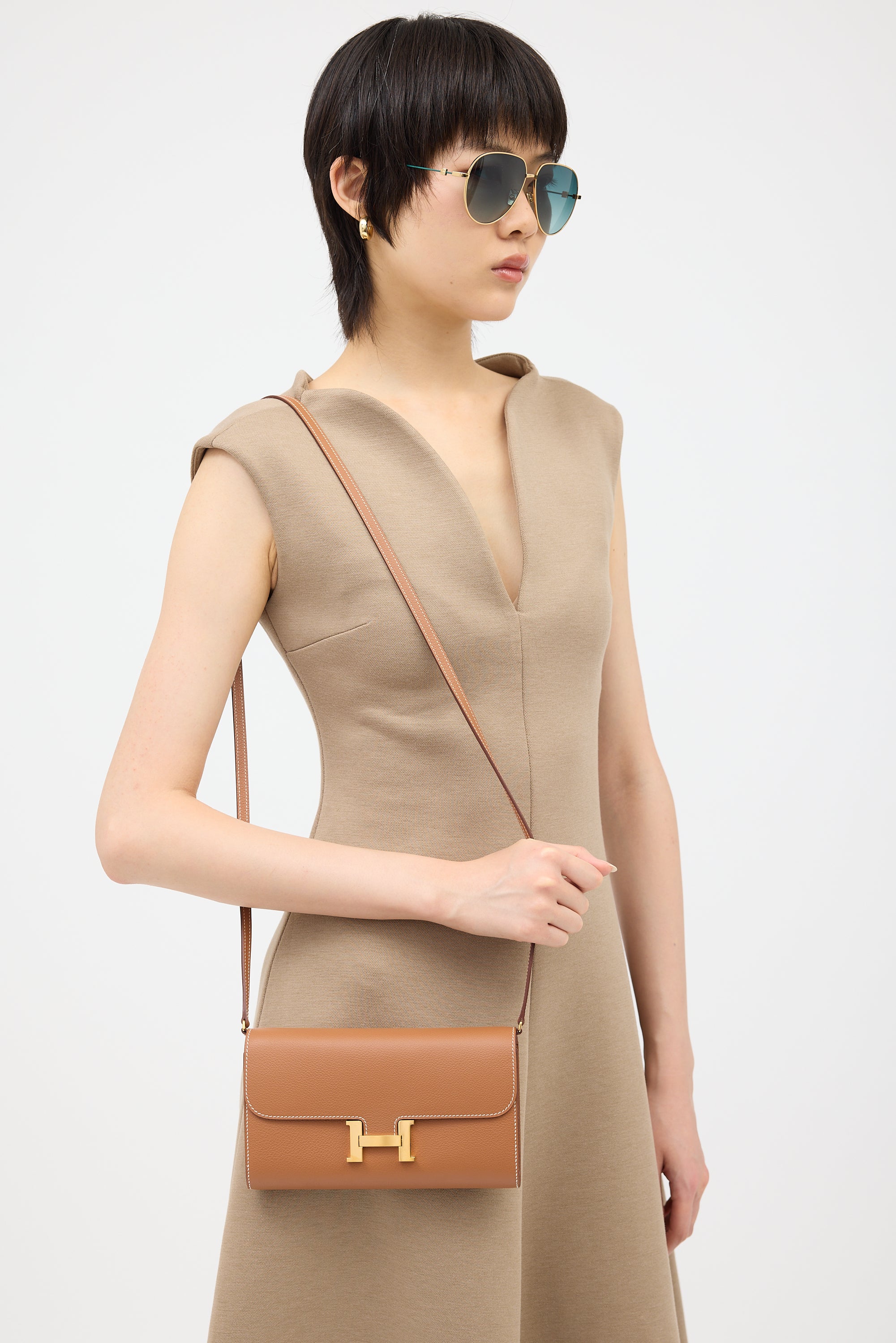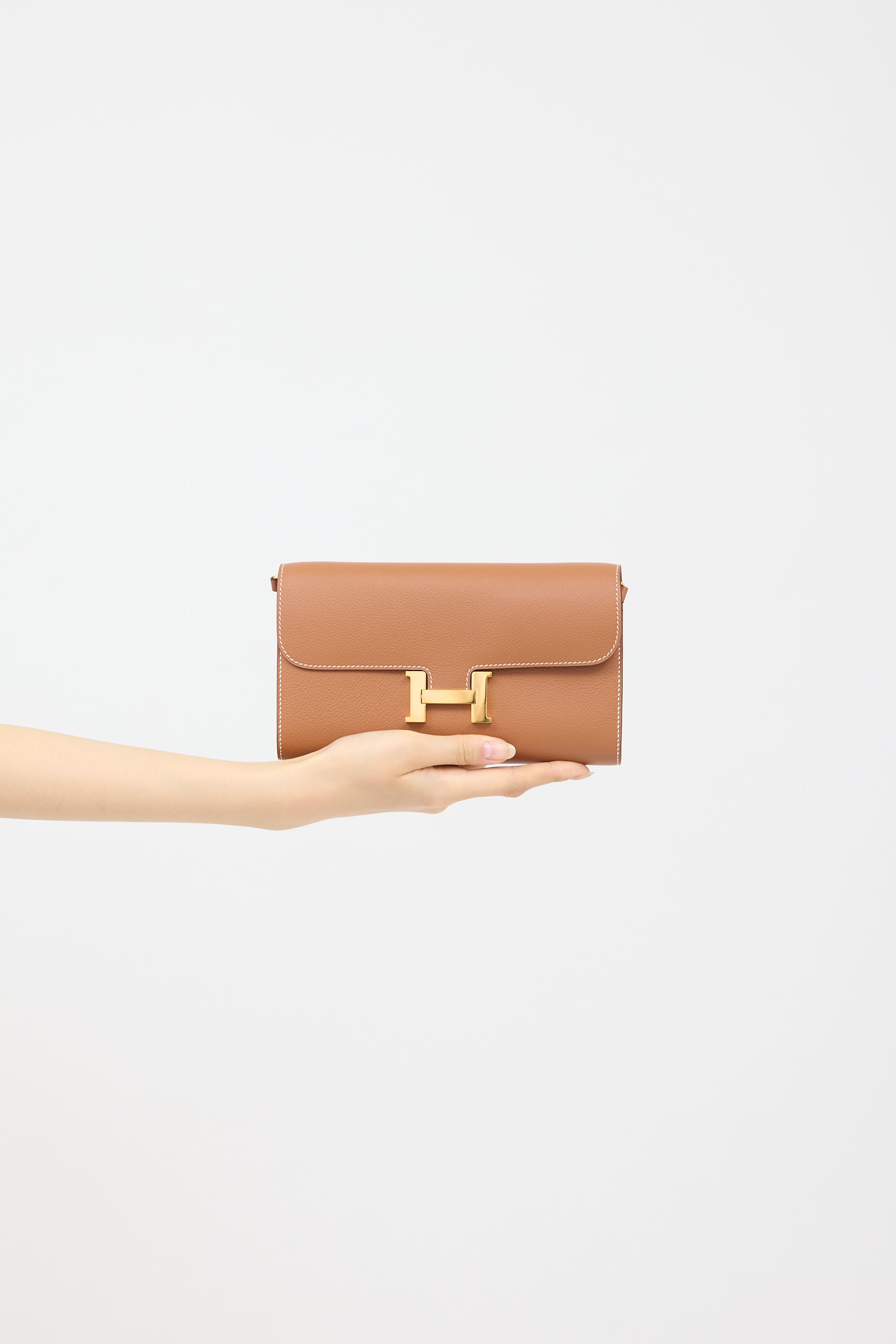Pre-owned Hermès 2024 Gold Epsom leather Constance To Go wallet featuring front flap with gold tone palladium "H" snap closure, detachable shoulder strap, front and back slip pockets, and two main compartments with one zip pocket, two bill slots, and six card slots. Come with original box and dust bag.