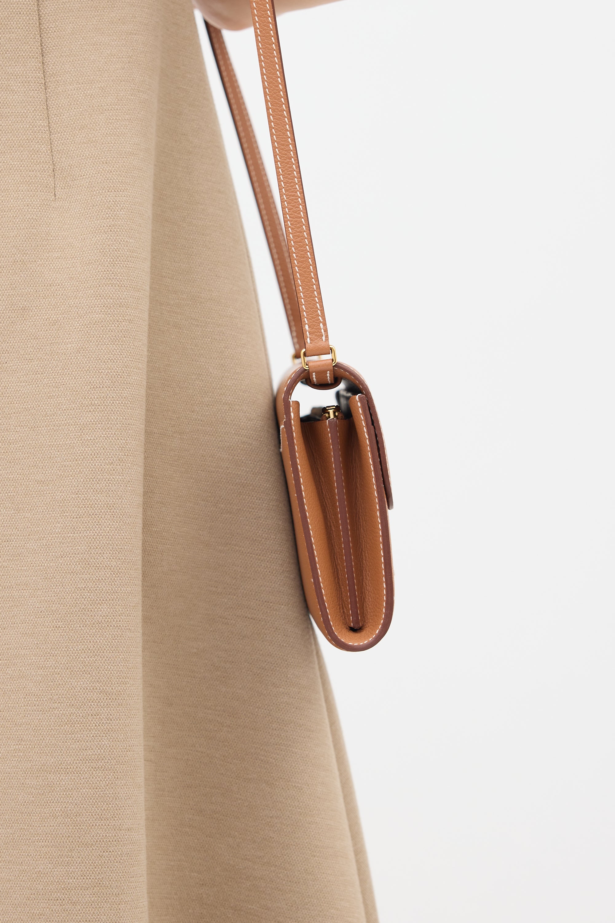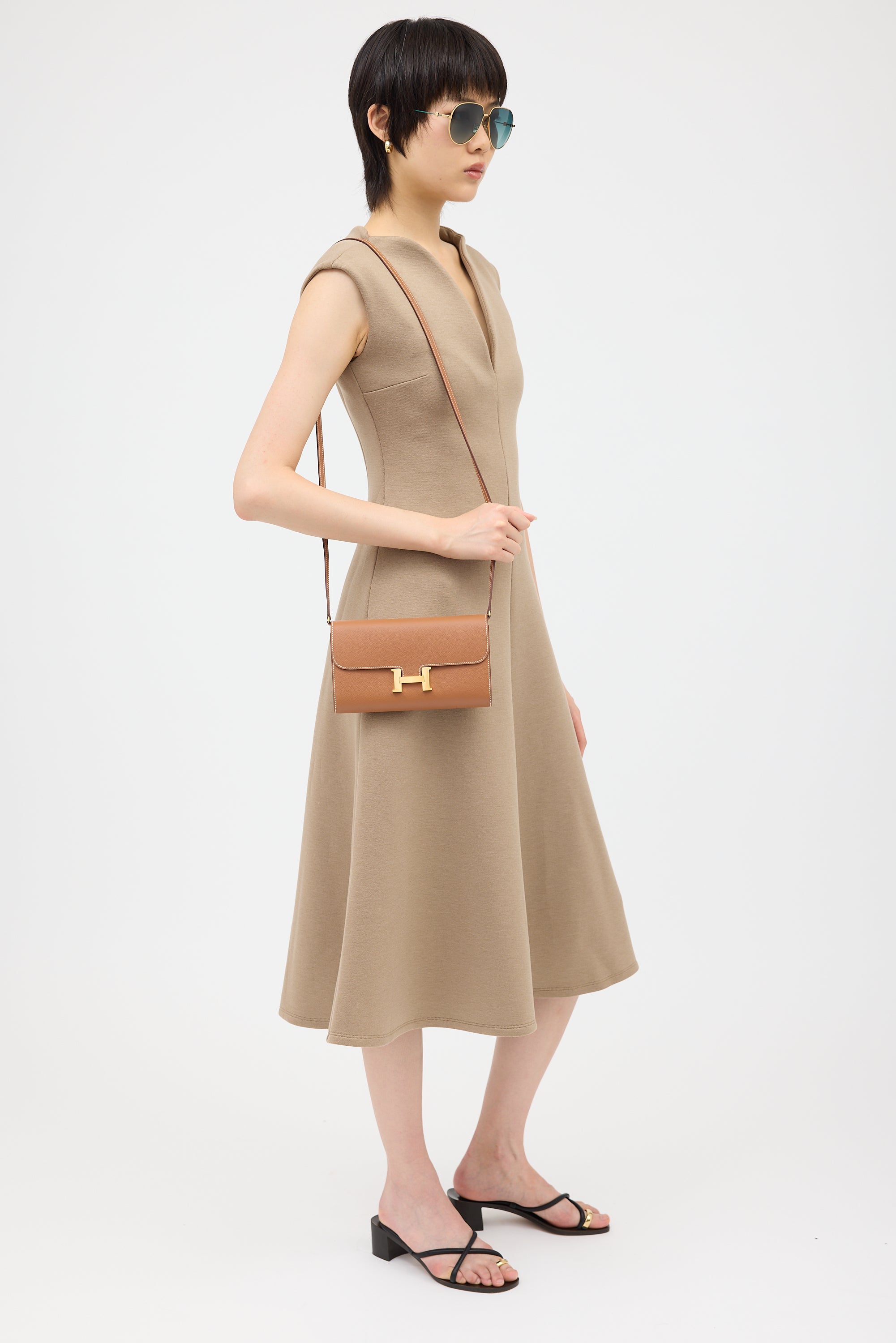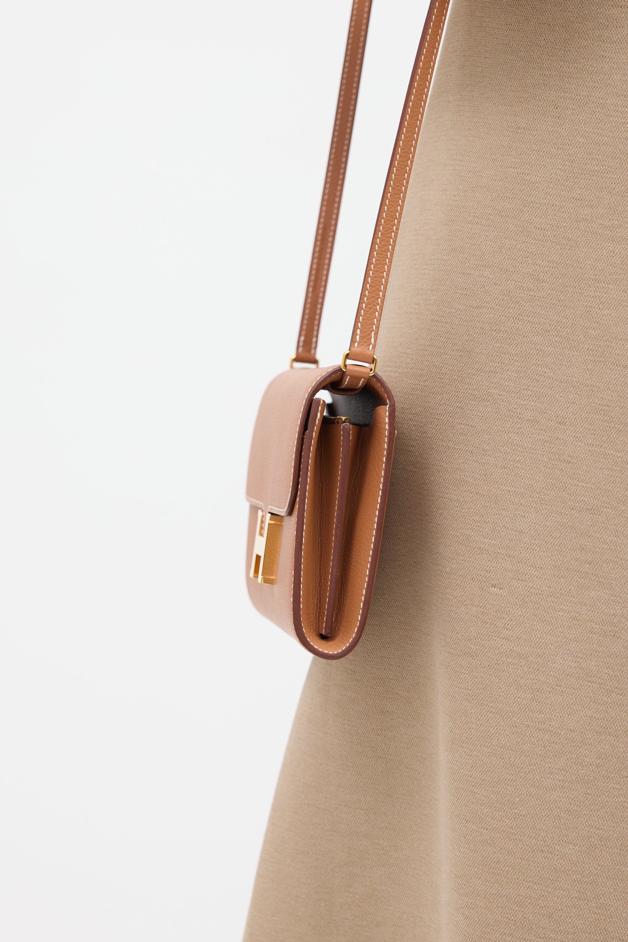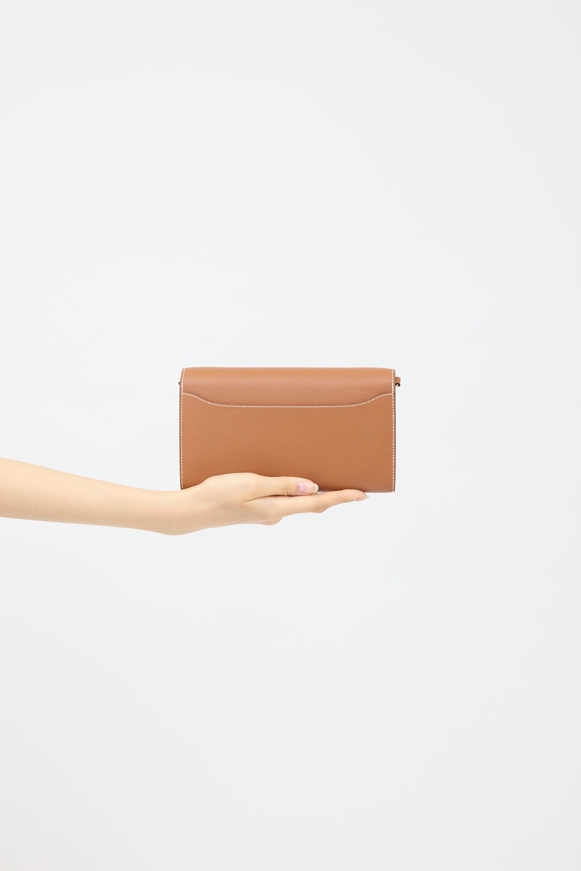 Pre-owned Hermès 2024 Gold Epsom leather Constance To Go wallet featuring front flap with gold tone palladium "H" snap closure, detachable shoulder strap, front and back slip pockets, and two main compartments with one zip pocket, two bill slots, and six card slots. Come with original box and dust bag.