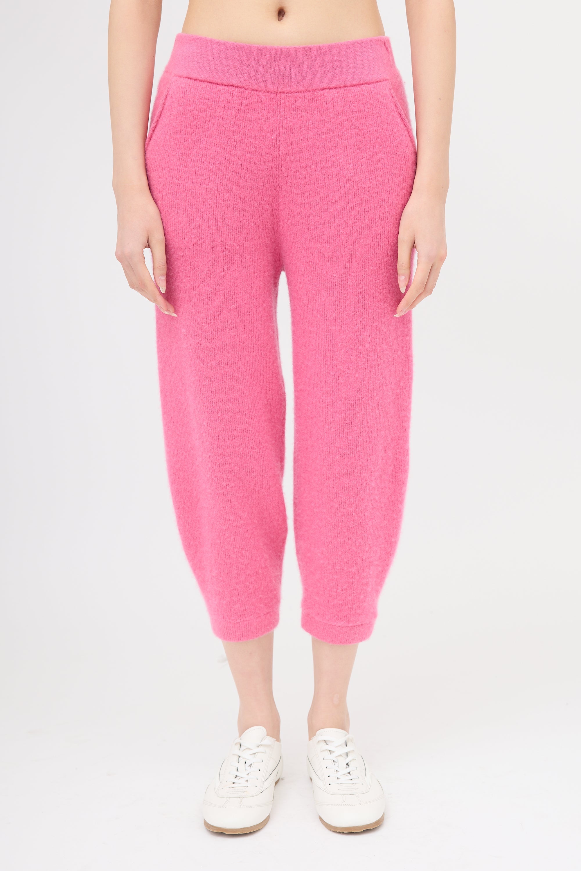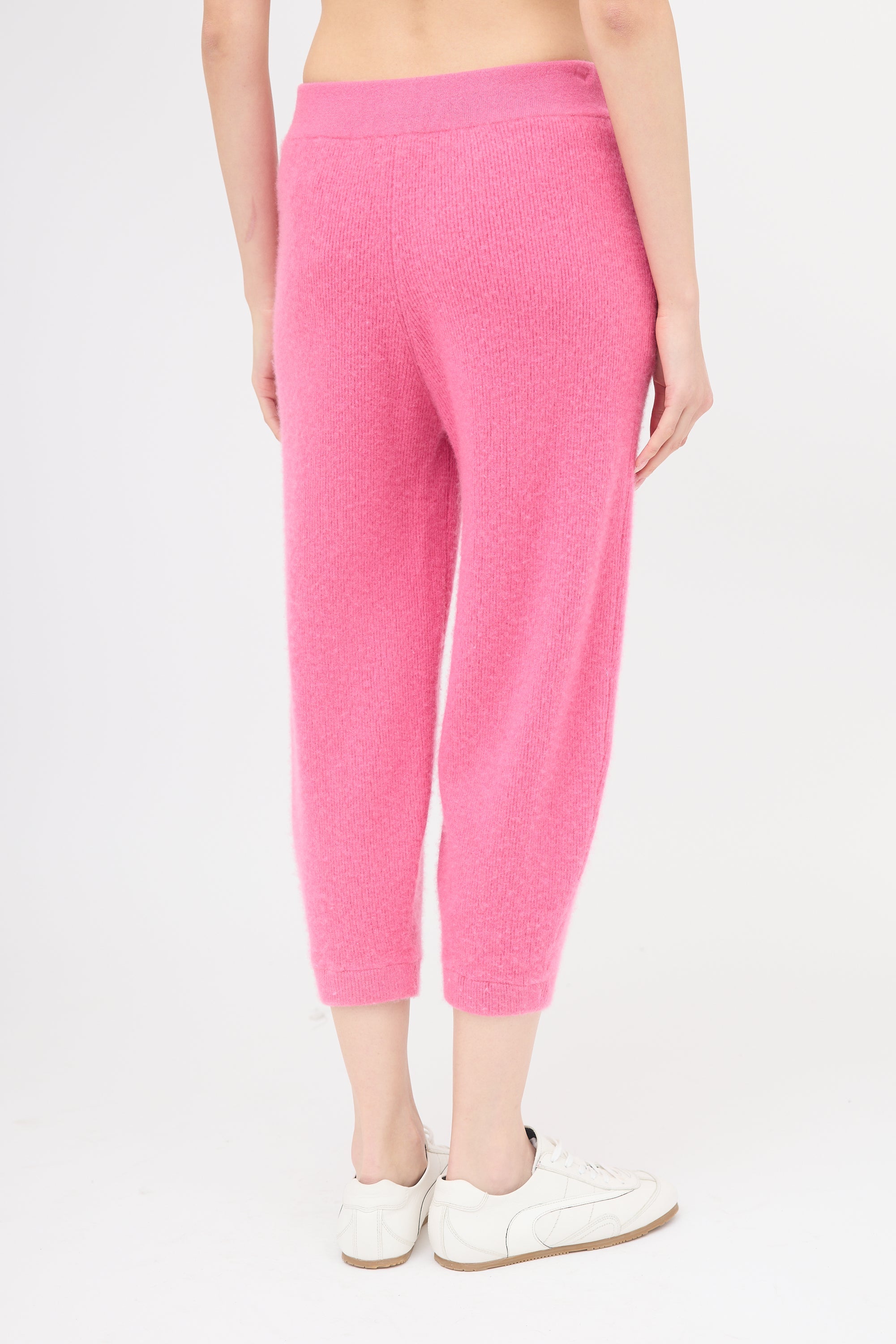 Pre-owned LAPOINTE pink cashmere cropped jogger pants featuring an elasticized waistband, two hip pockets, vertical ribbing, and elasticized cuffs.