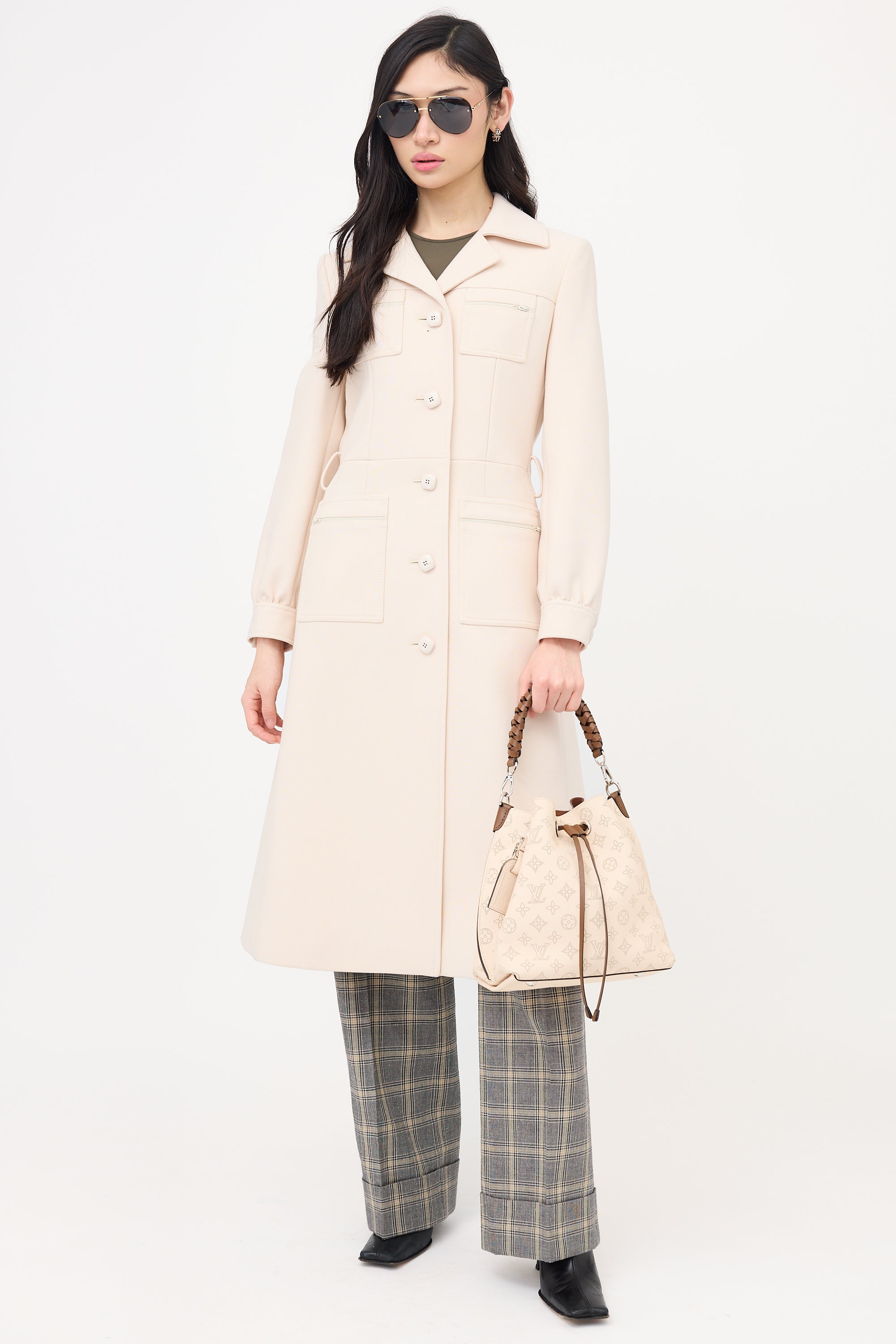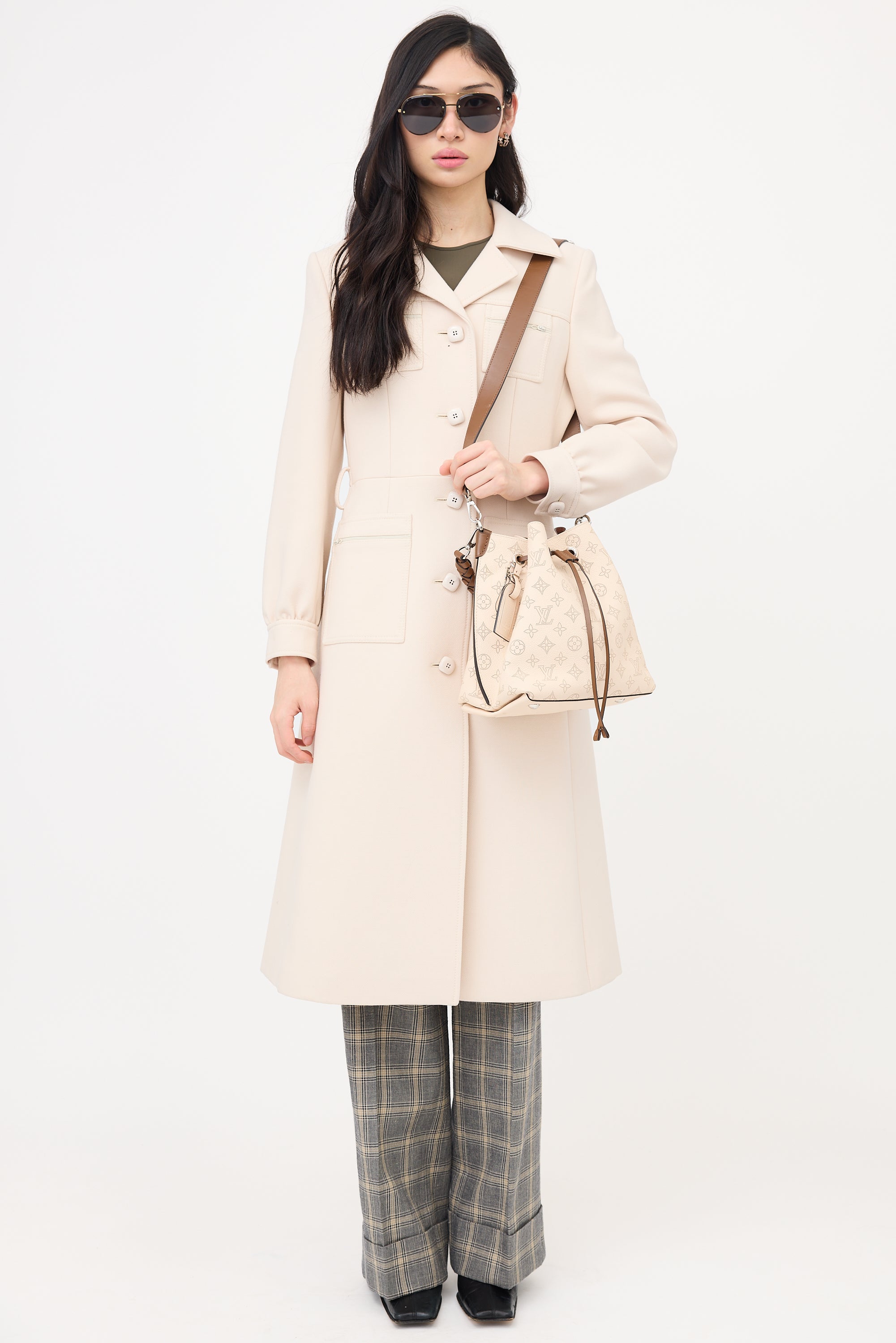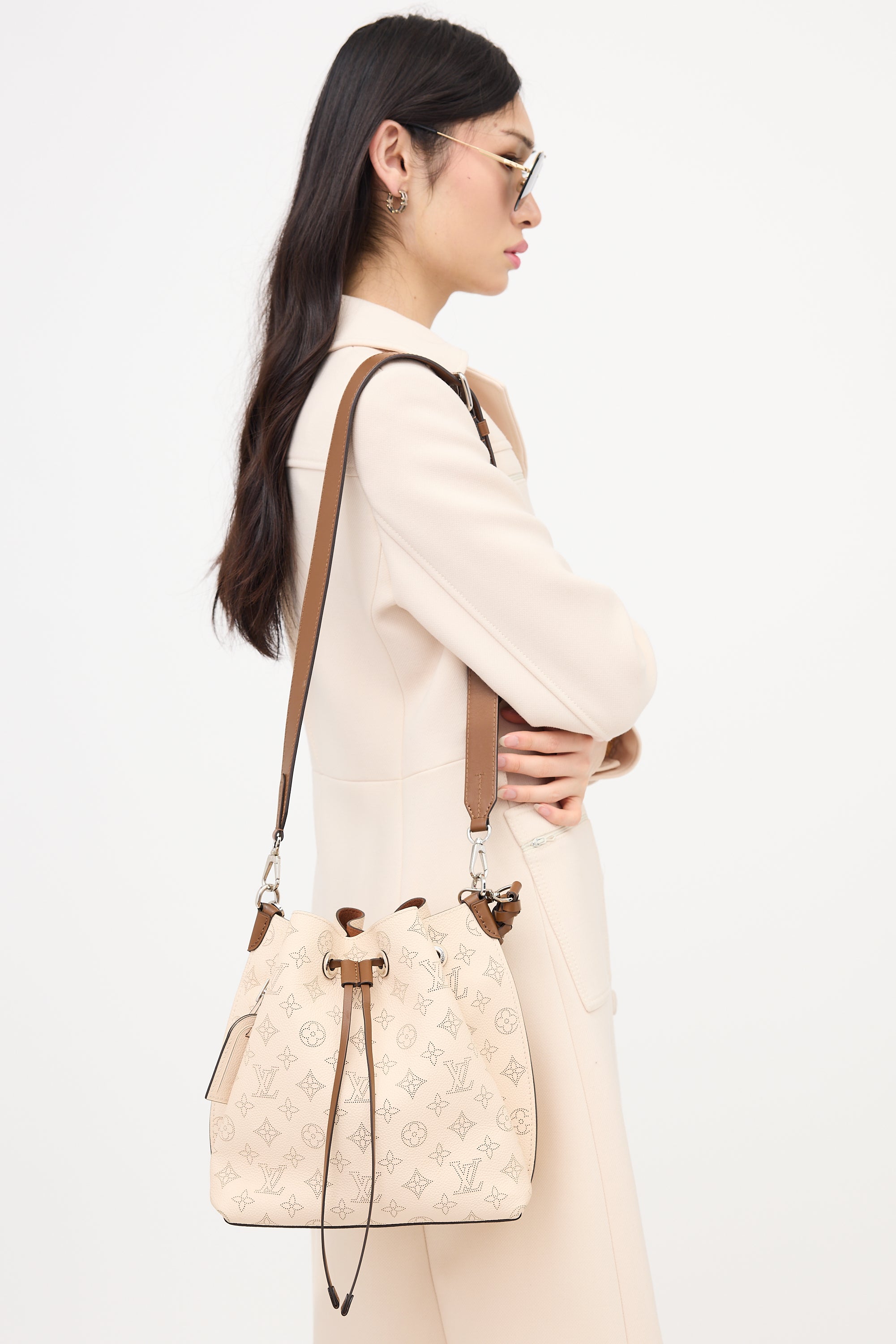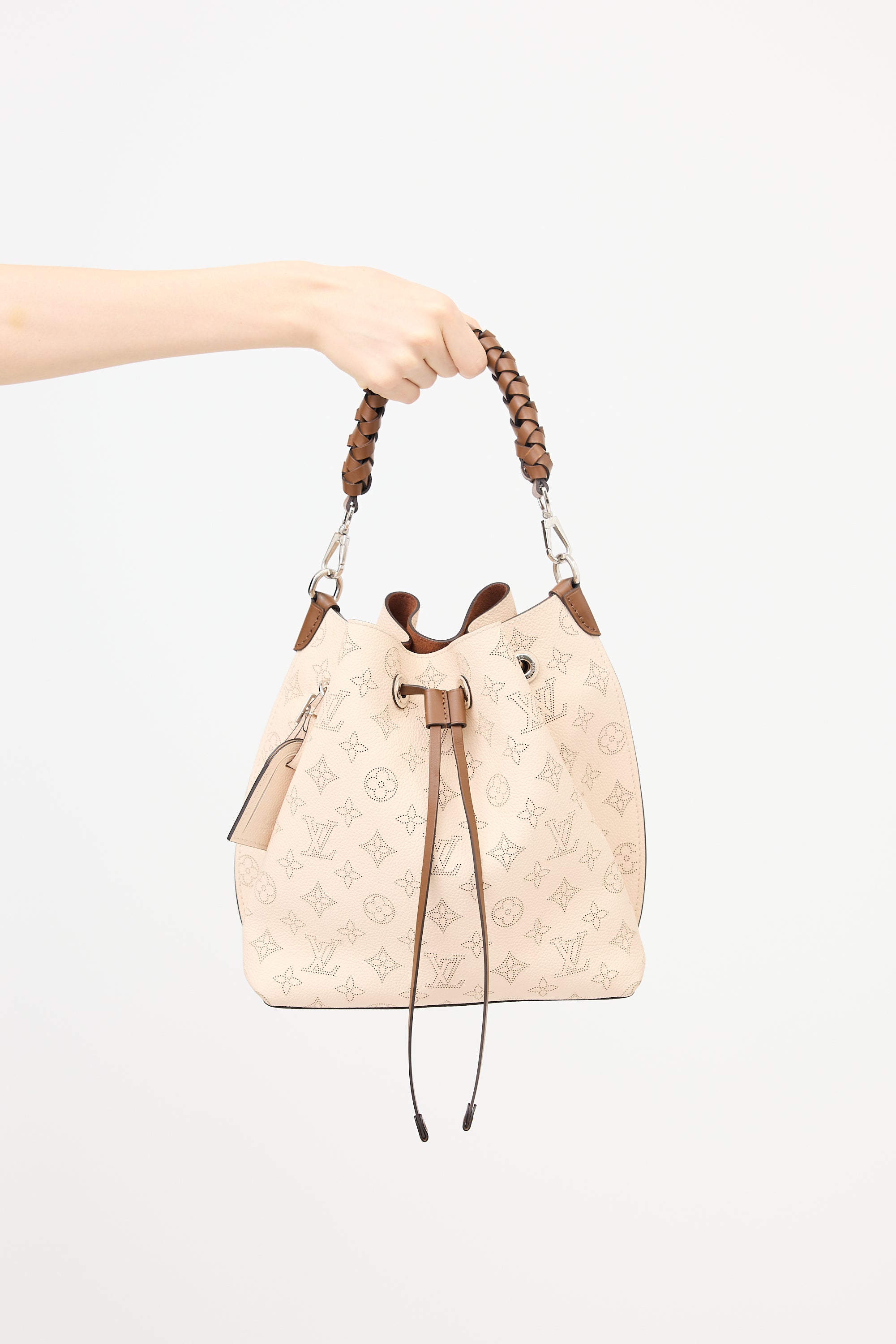 Pre-owned Louis Vuitton cream Mahina leather Muria bucket bag featuring perforated signature monogram pattern throughout, silver tone hardware, brown leather trim, braided leather top handle, detachable and adjustable shoulder strap, detachable luggage tag at side, protective feet at base, open top with drawstring closure, and two main compartments with one zip pocket divider. Comes with original dust bag.